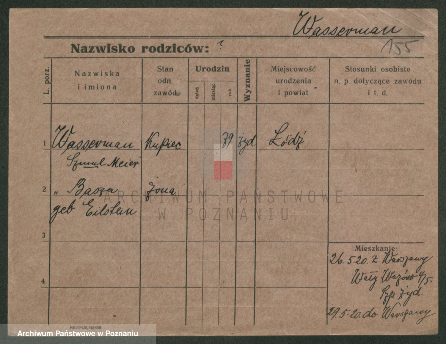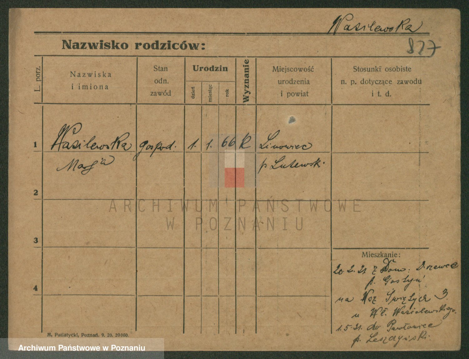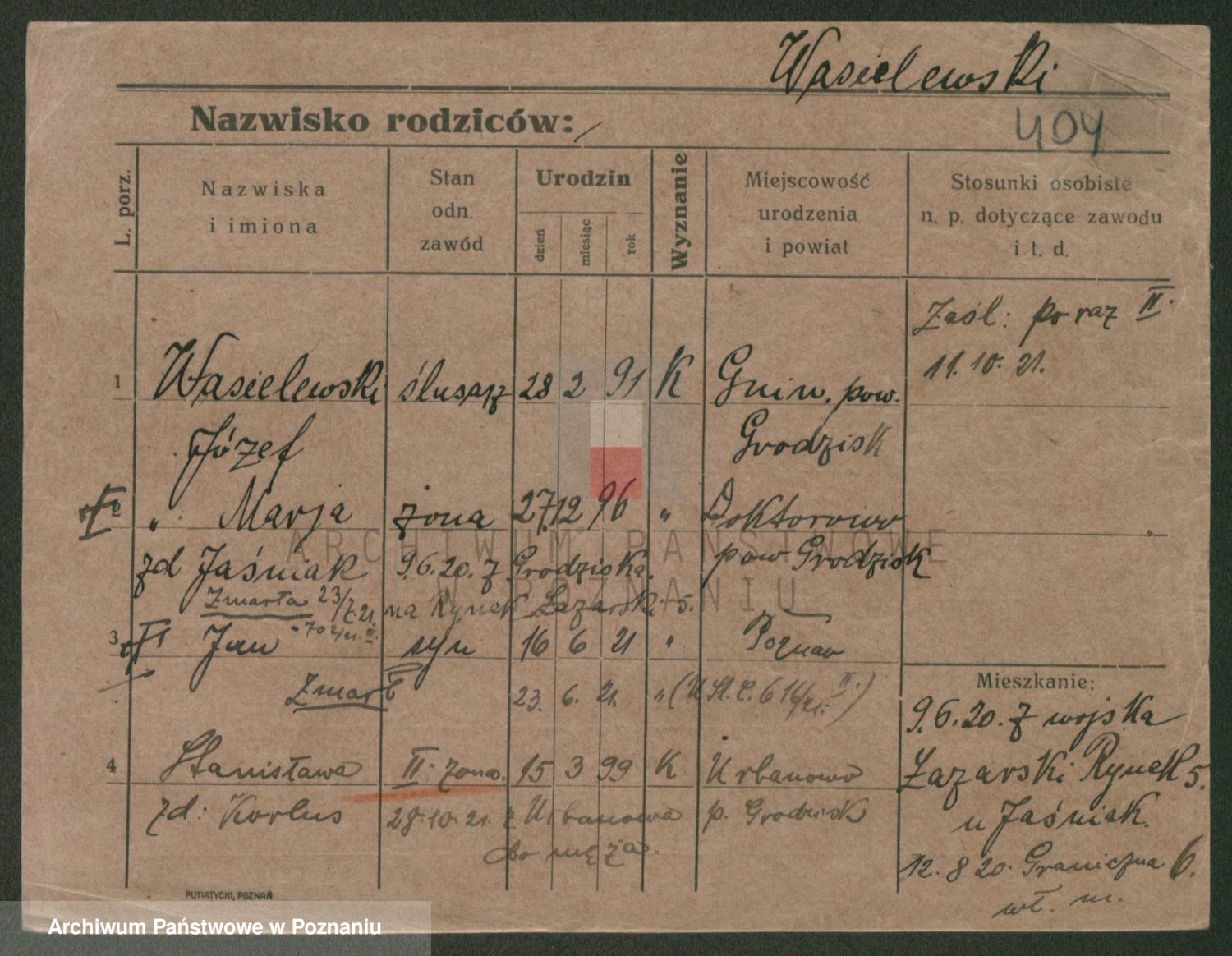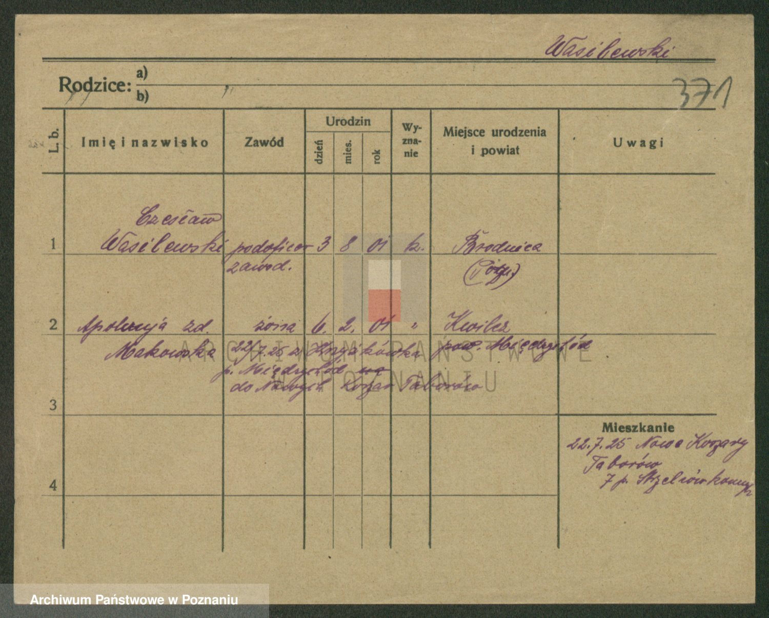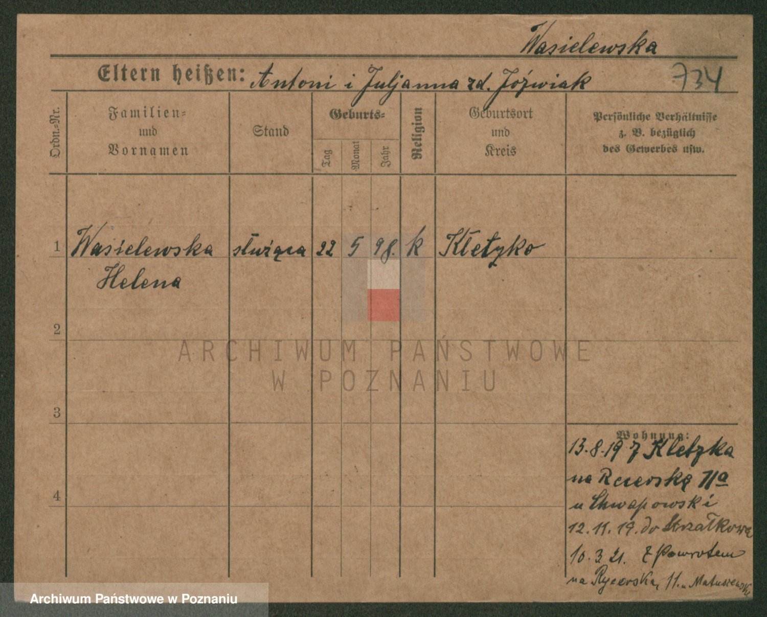 Podgląd karty osobowej dostępny jest po kliknięciu na nazwisko lub ikonkę karty. Można dokonywać powiększenia (ikony na górze) lub przechodzić między kolejnymi skanami (strzałki po bokach).