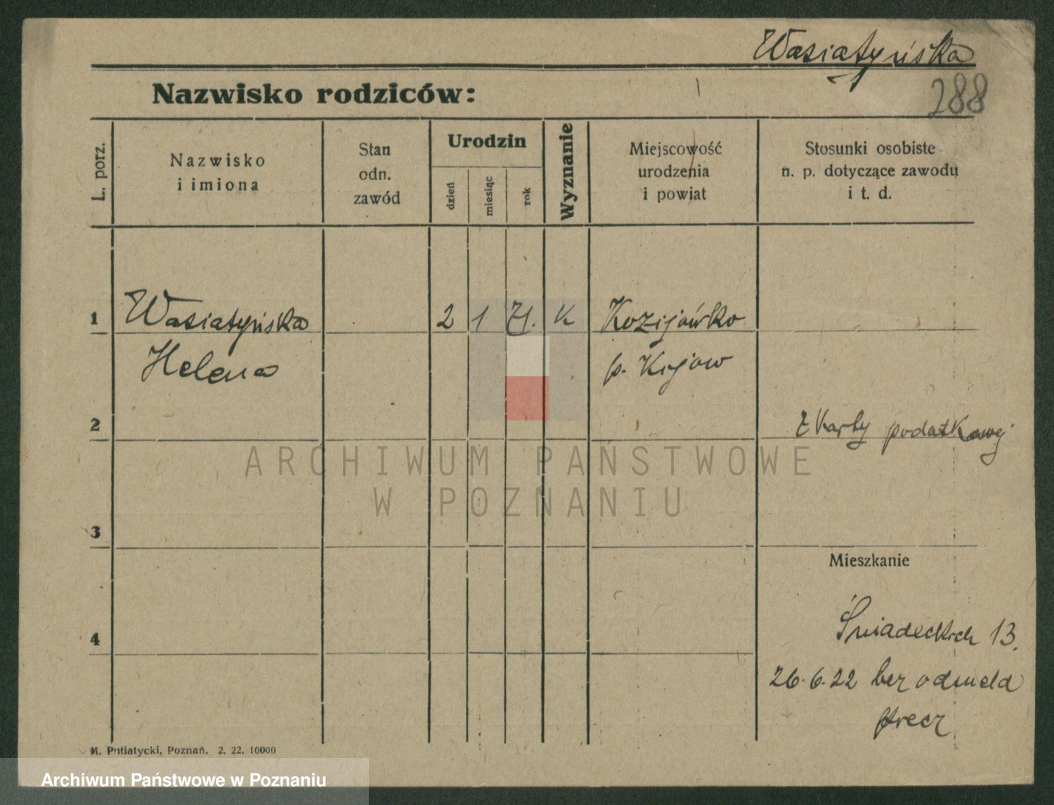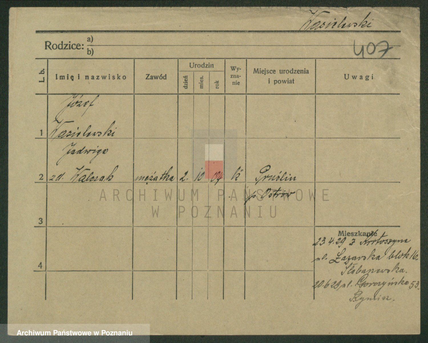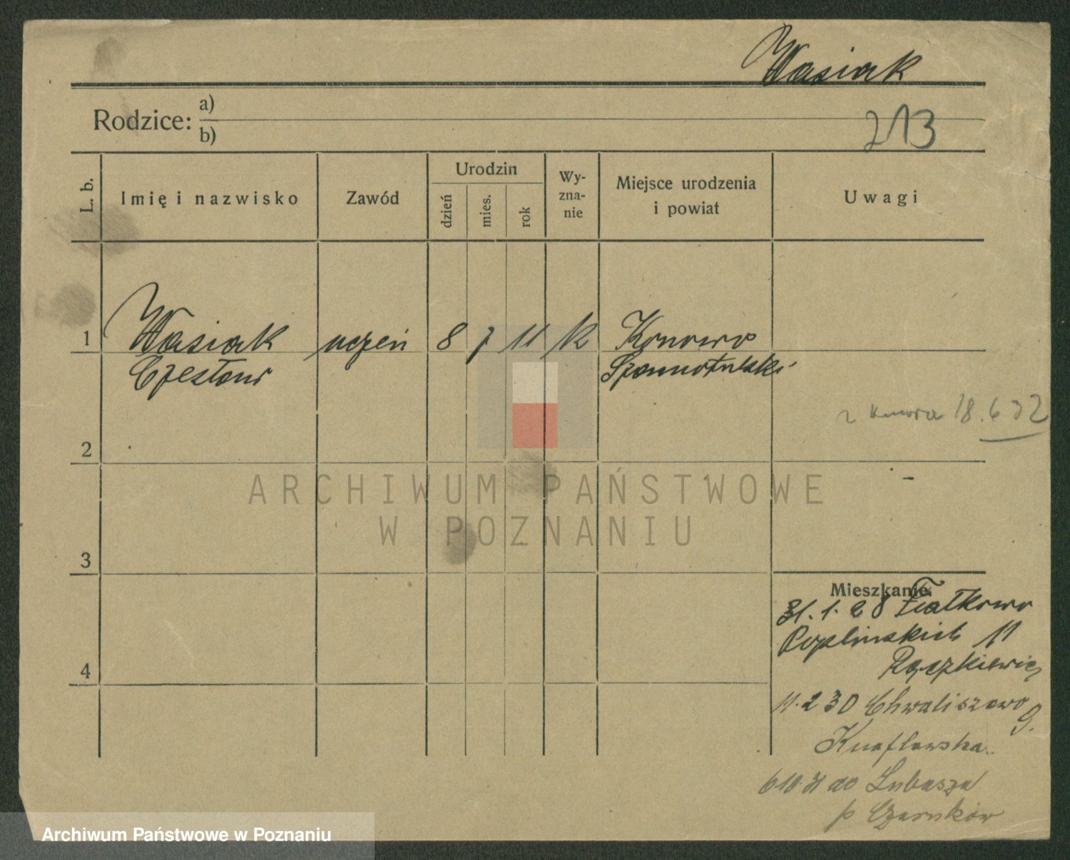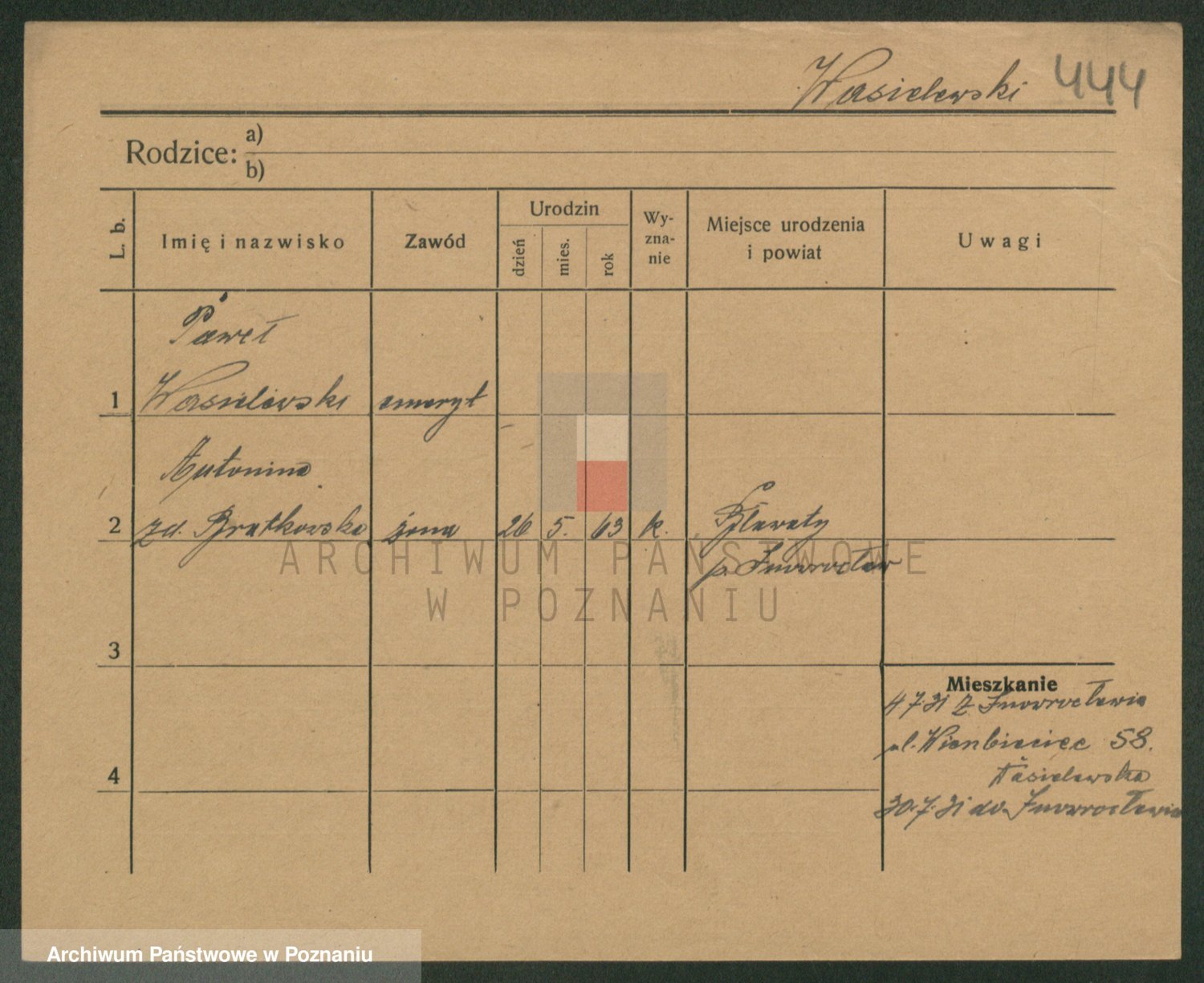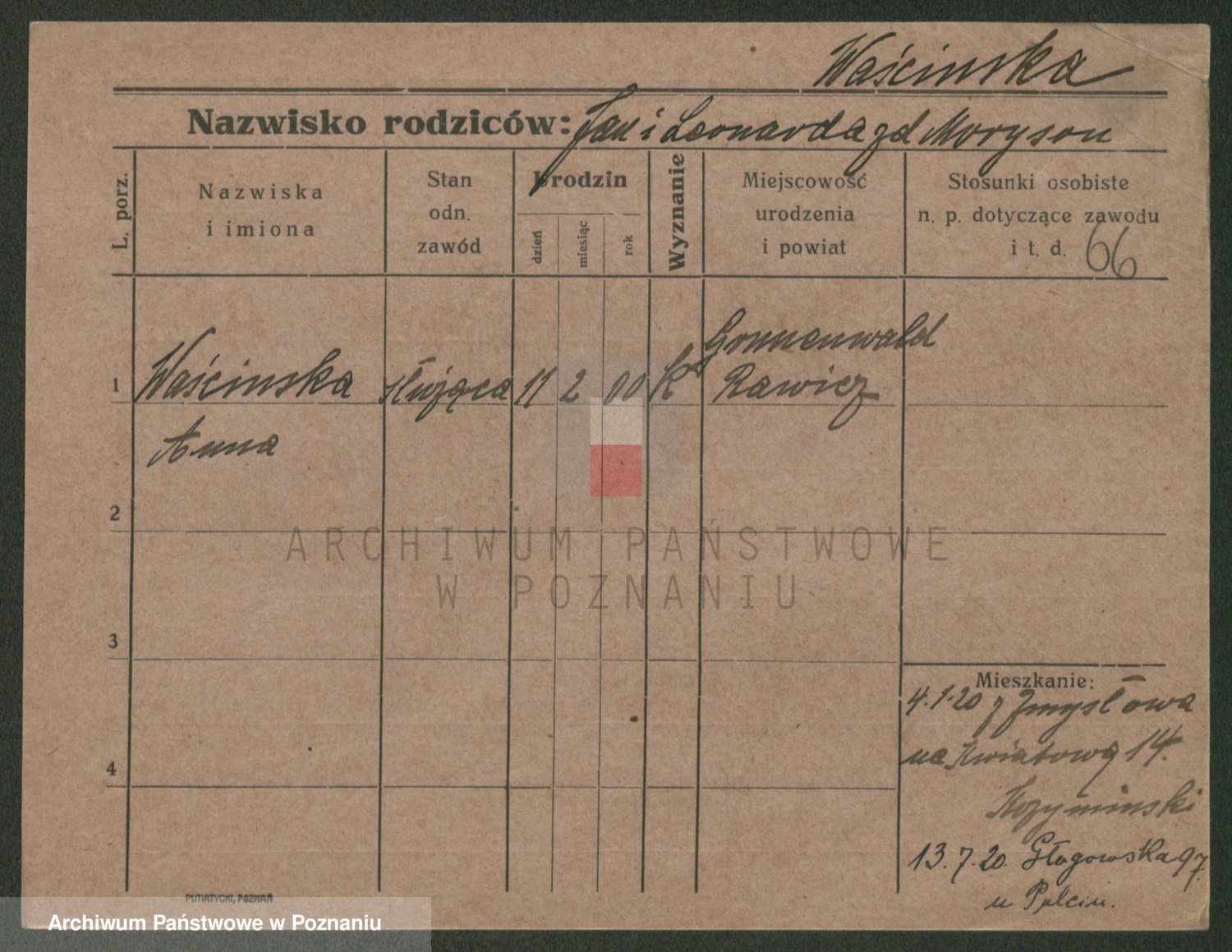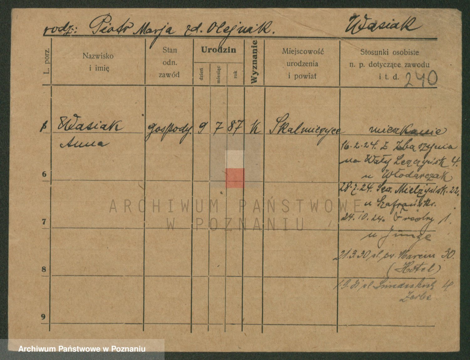 Podgląd karty osobowej dostępny jest po kliknięciu na nazwisko lub ikonkę karty. Można dokonywać powiększenia (ikony na górze) lub przechodzić między kolejnymi skanami (strzałki po bokach).