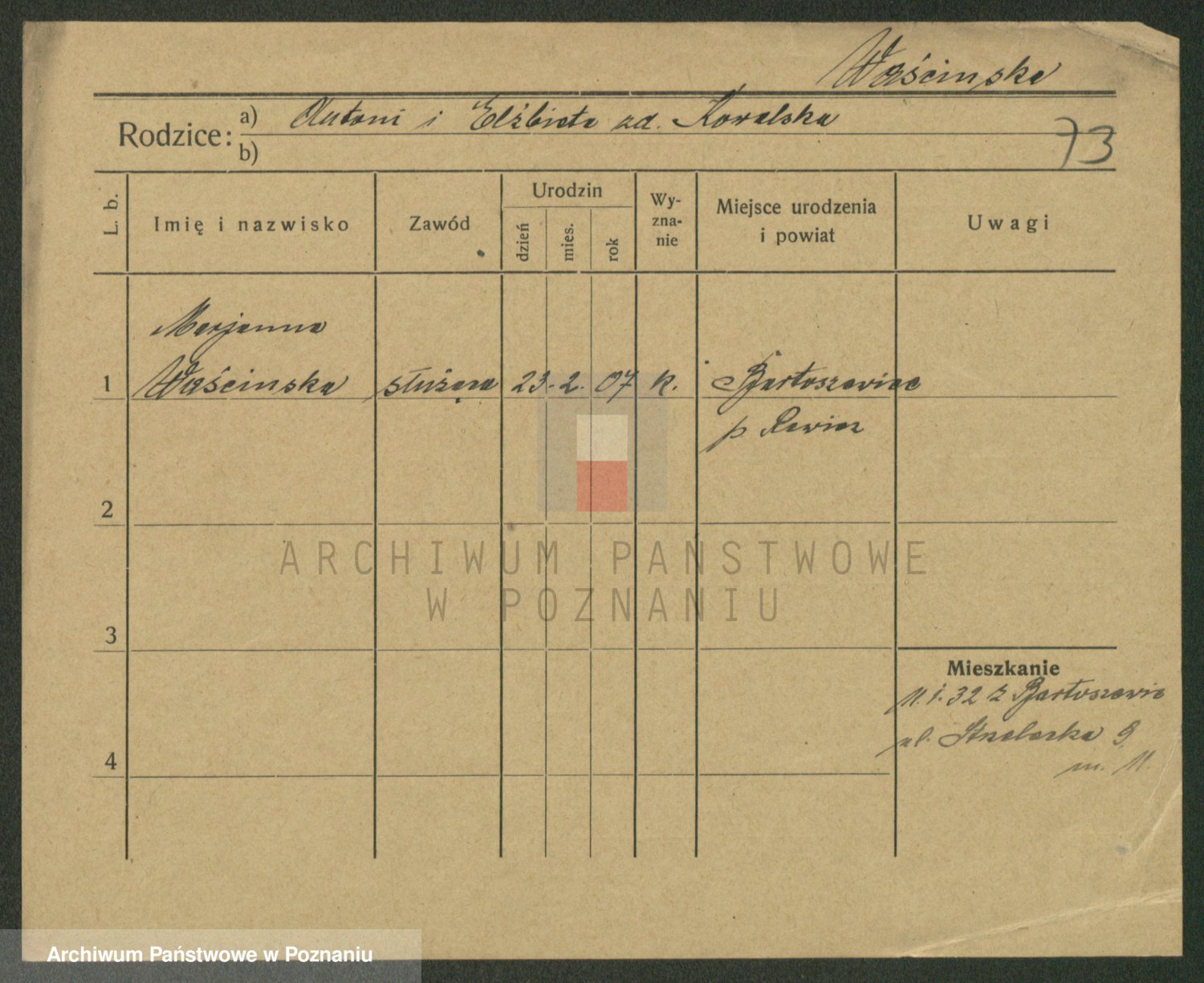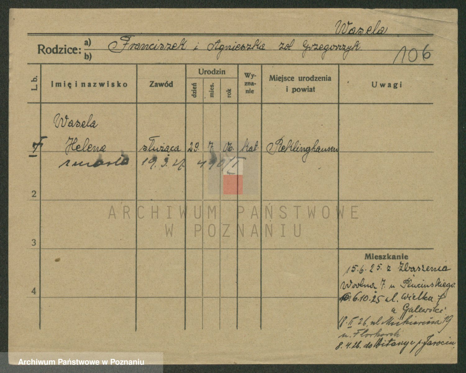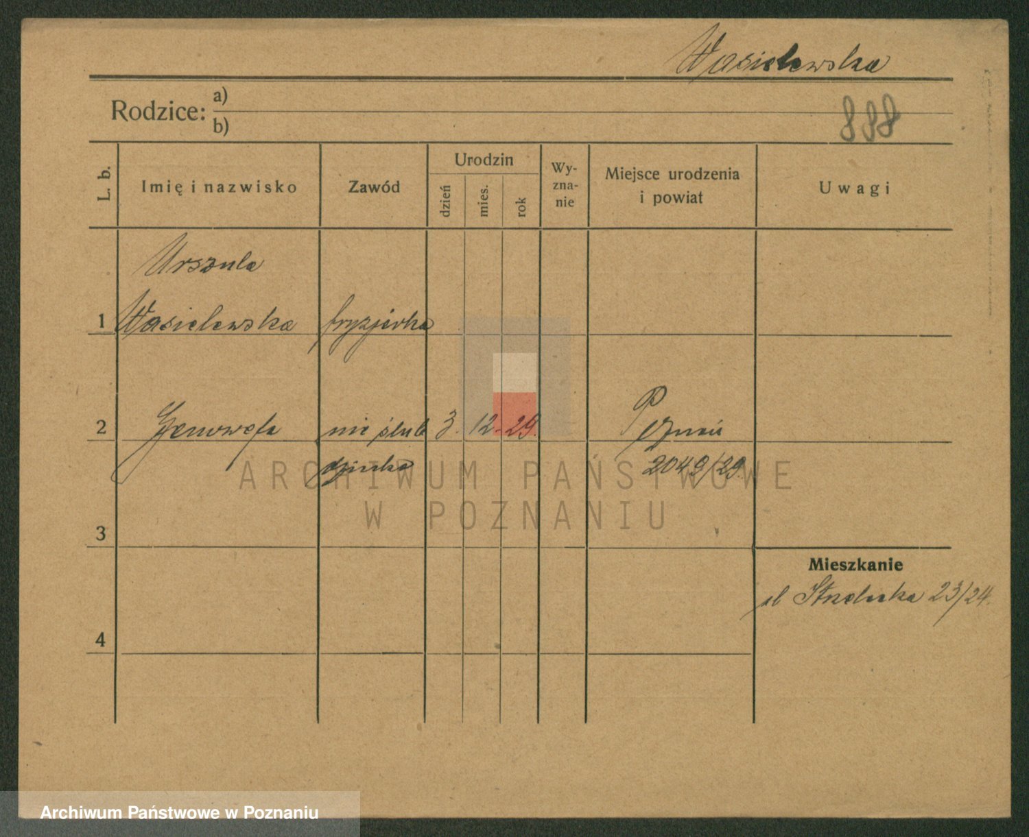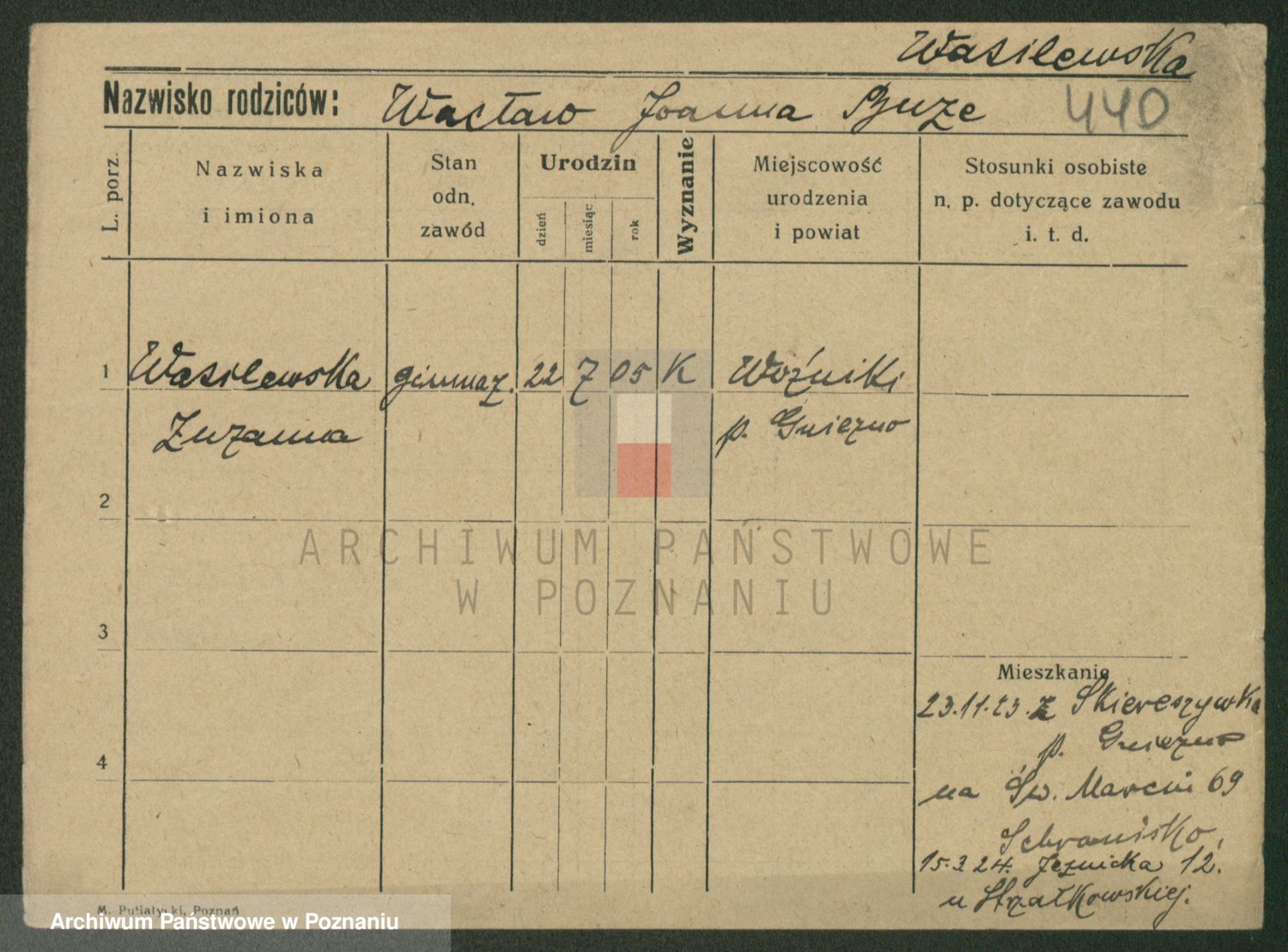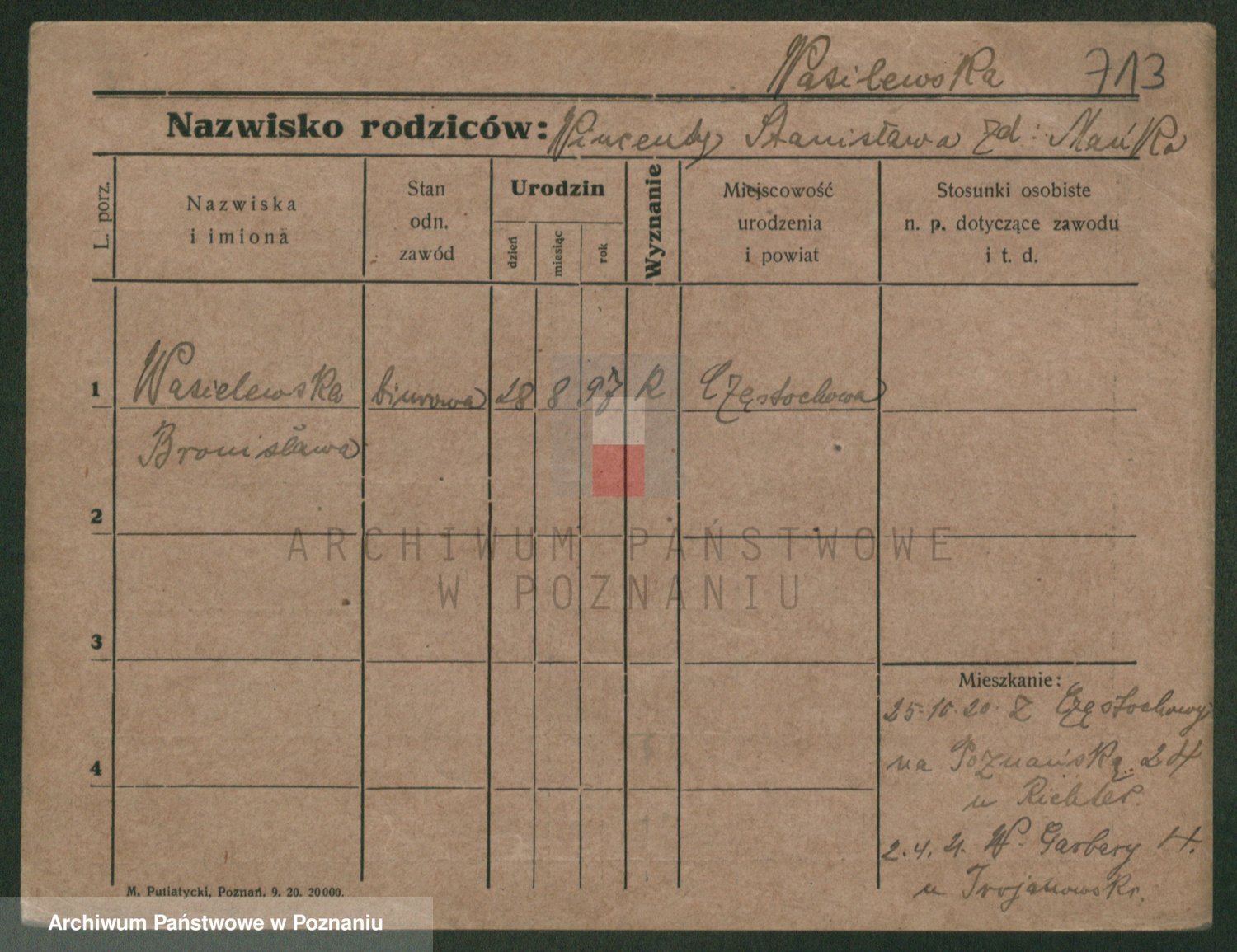 Podgląd karty osobowej dostępny jest po kliknięciu na nazwisko lub ikonkę karty. Można dokonywać powiększenia (ikony na górze) lub przechodzić między kolejnymi skanami (strzałki po bokach).