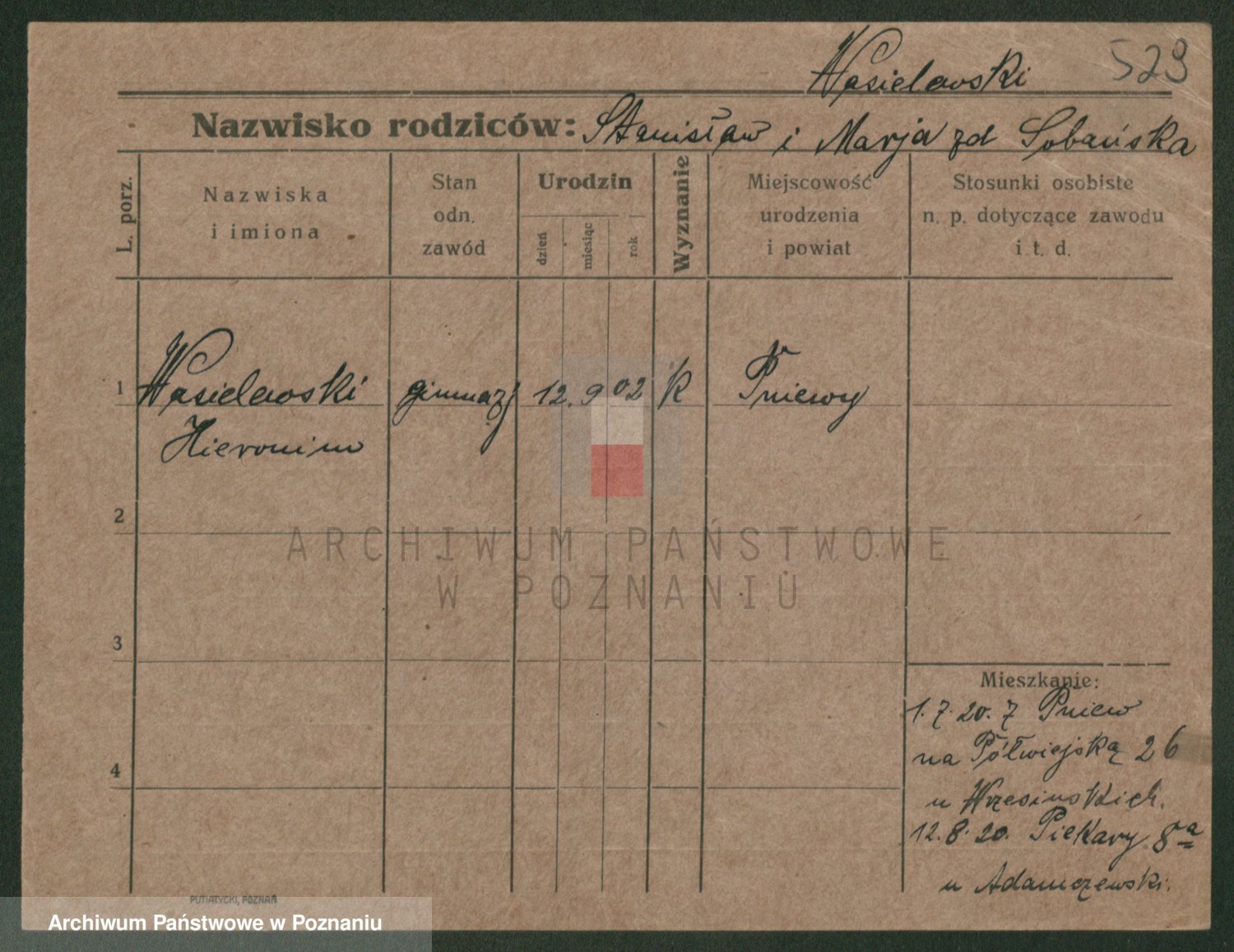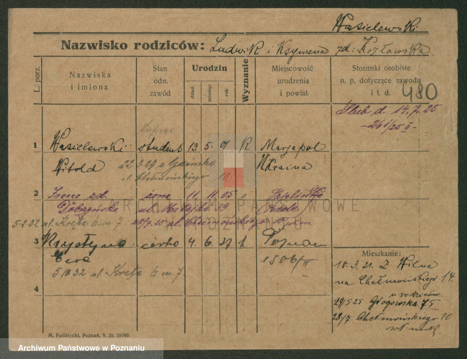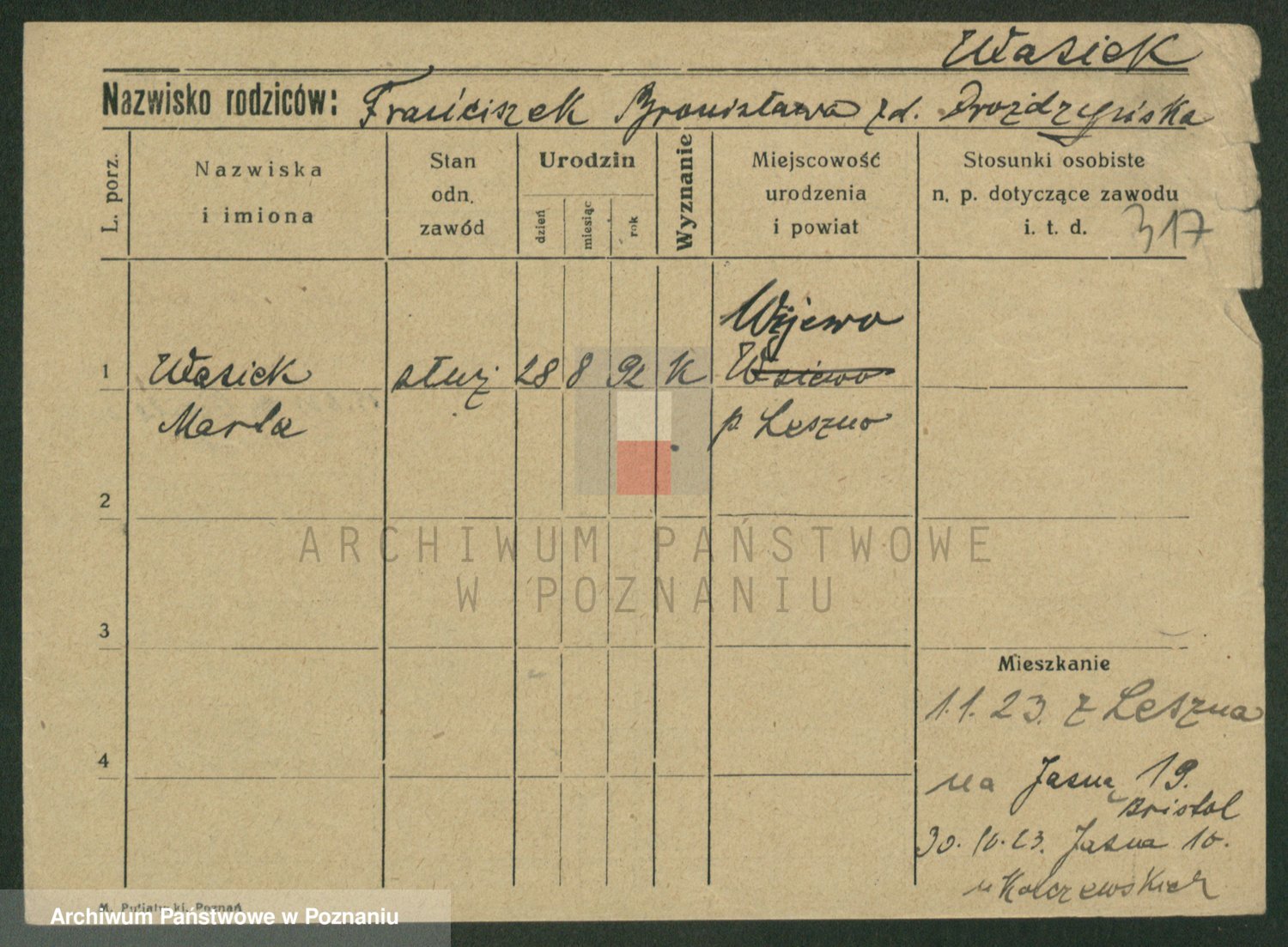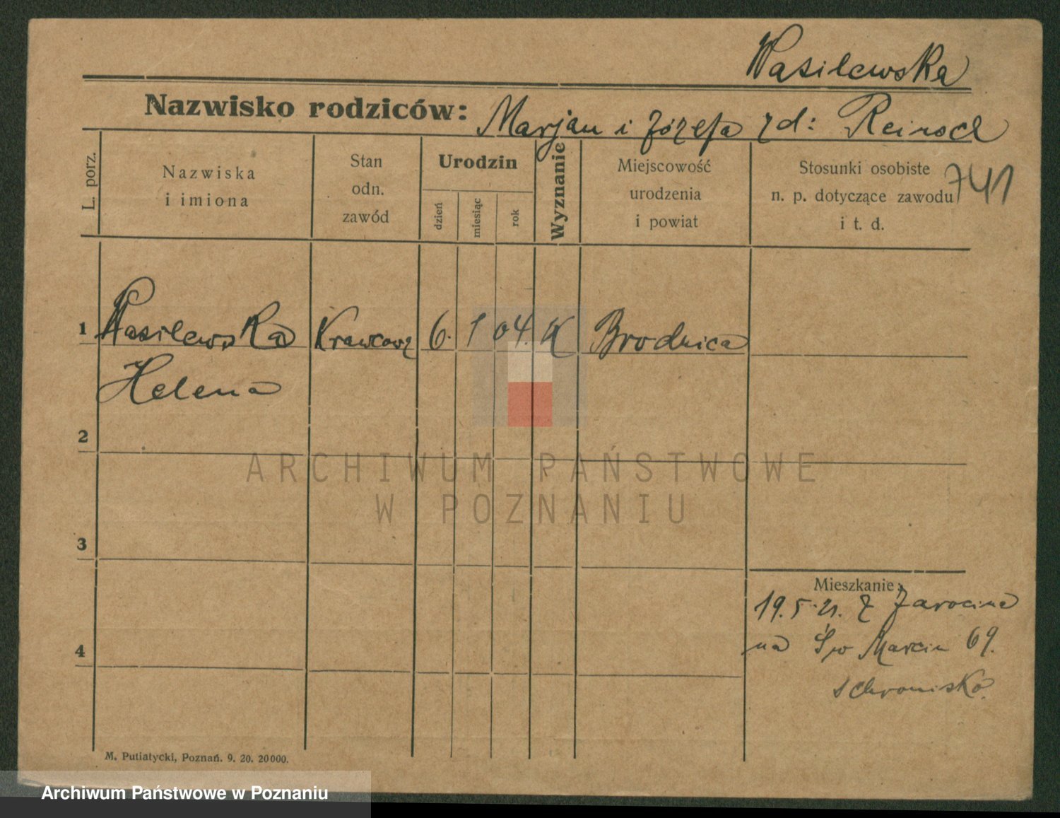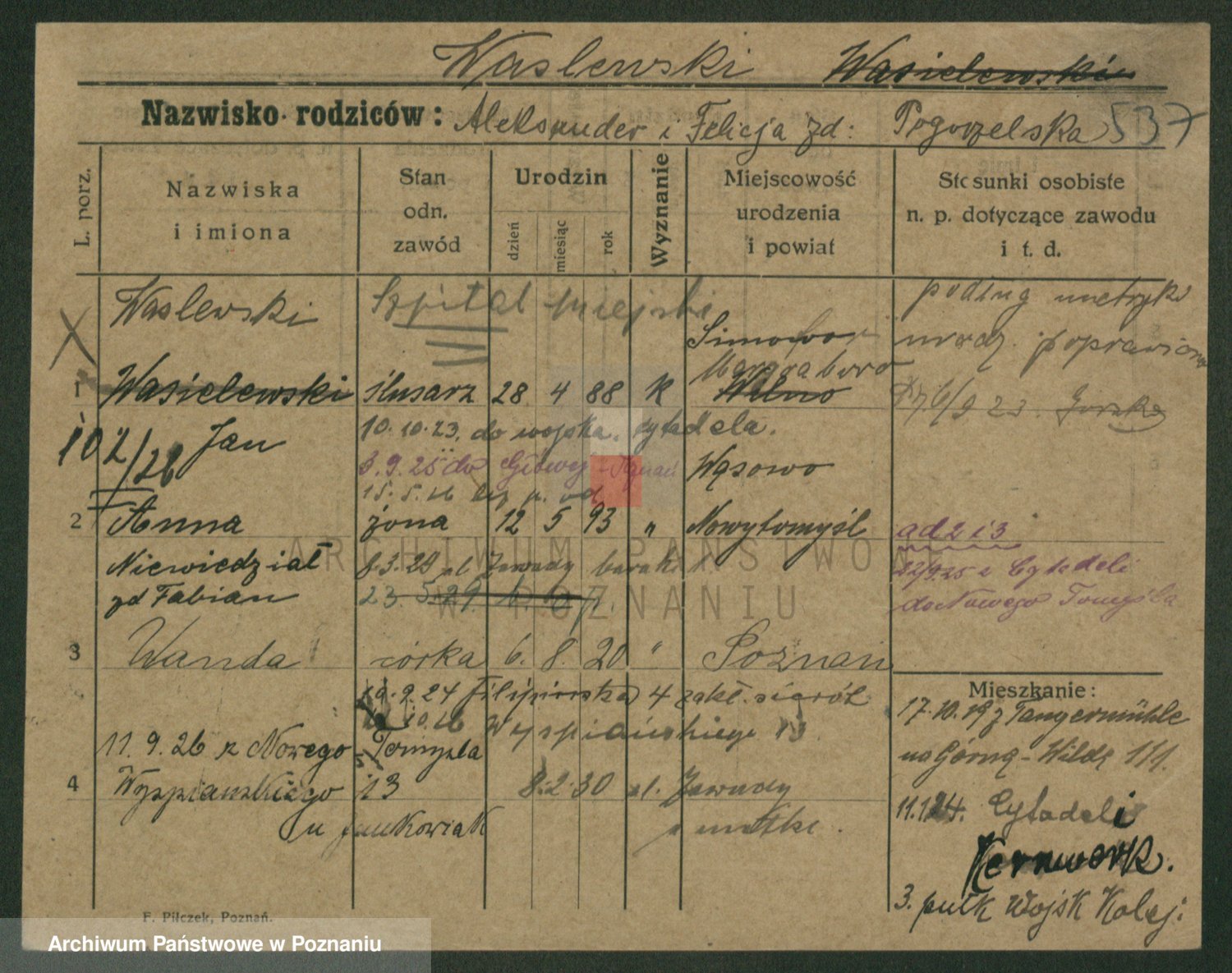 Podgląd karty osobowej dostępny jest po kliknięciu na nazwisko lub ikonkę karty. Można dokonywać powiększenia (ikony na górze) lub przechodzić między kolejnymi skanami (strzałki po bokach).