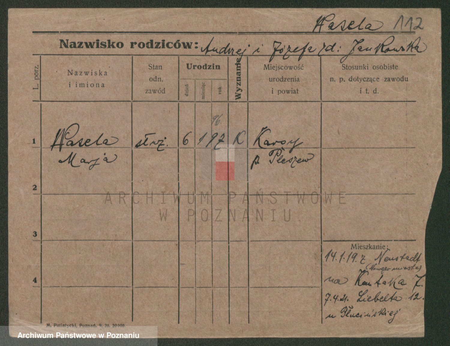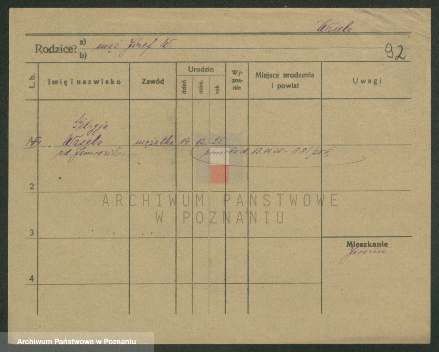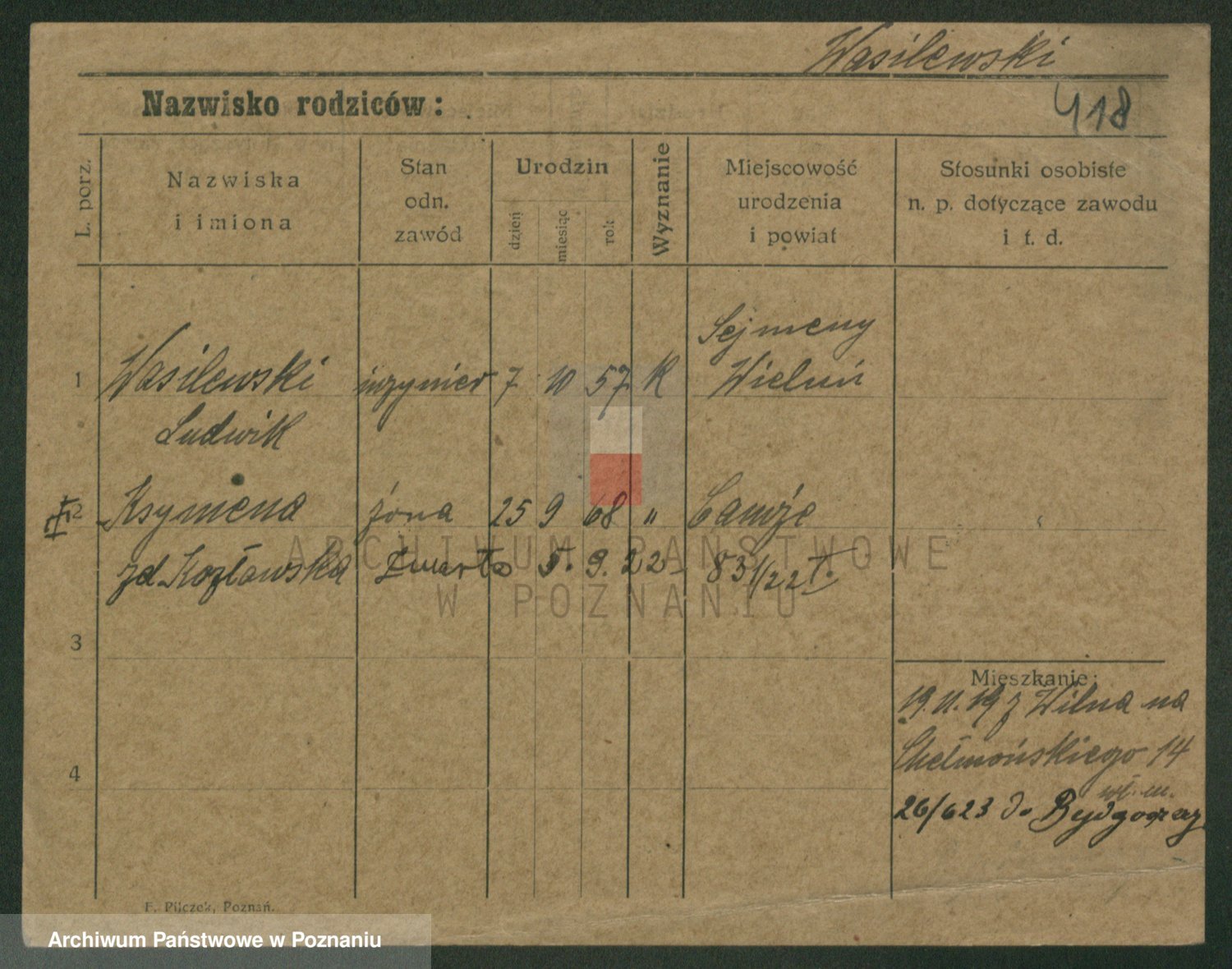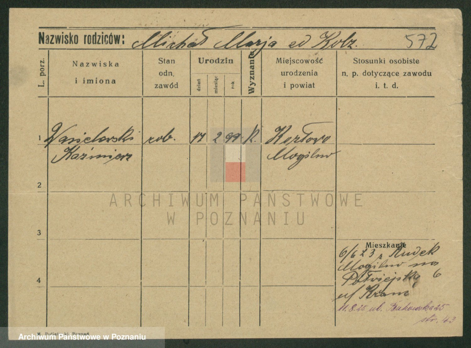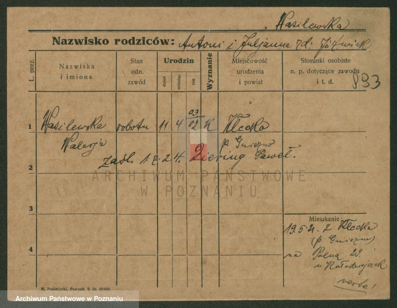 Podgląd karty osobowej dostępny jest po kliknięciu na nazwisko lub ikonkę karty. Można dokonywać powiększenia (ikony na górze) lub przechodzić między kolejnymi skanami (strzałki po bokach).