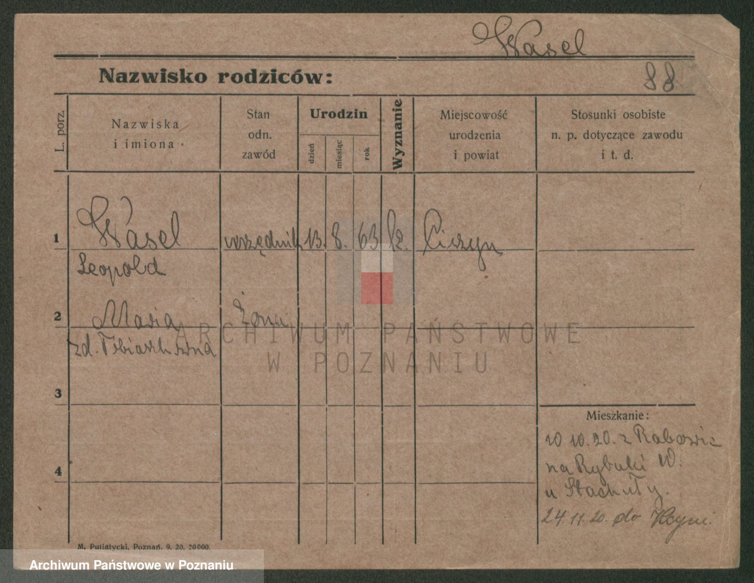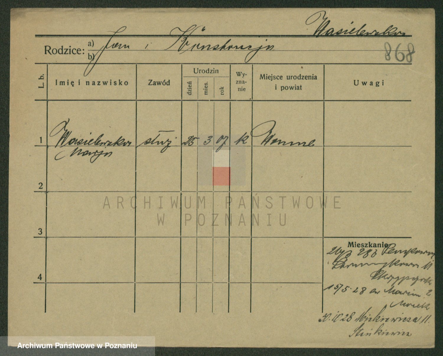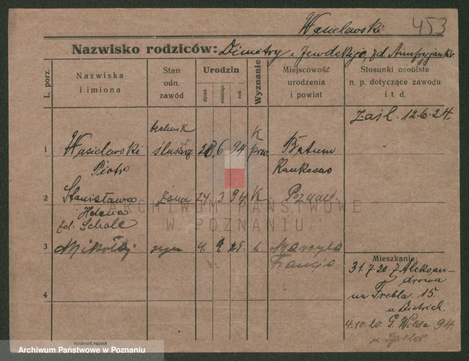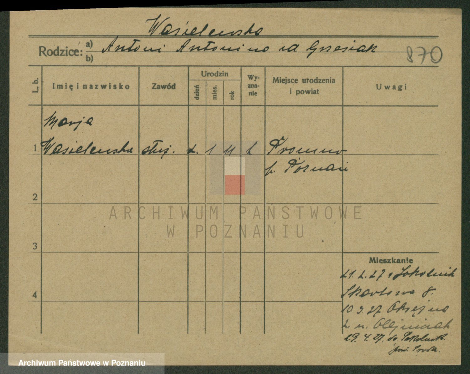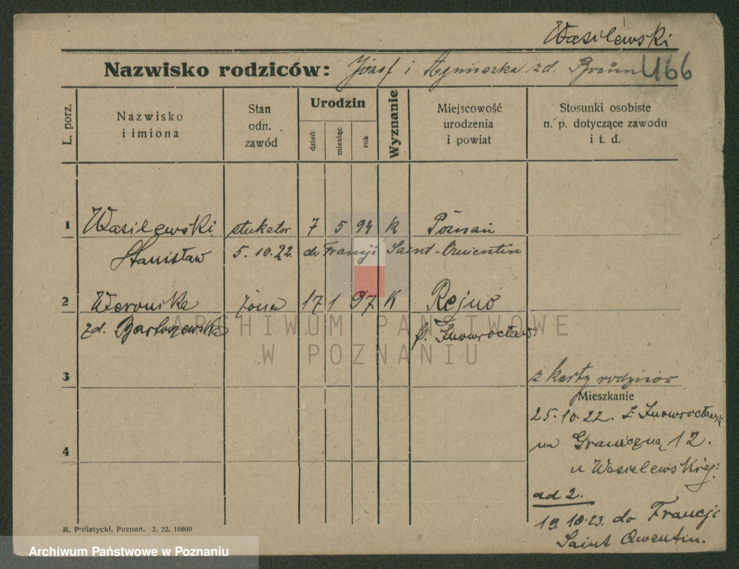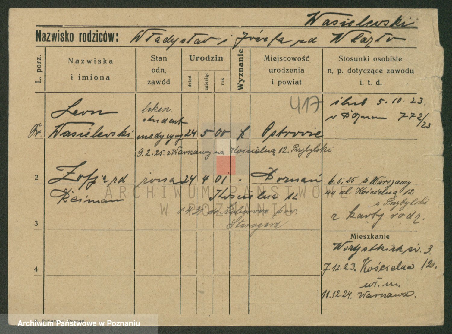 Podgląd karty osobowej dostępny jest po kliknięciu na nazwisko lub ikonkę karty. Można dokonywać powiększenia (ikony na górze) lub przechodzić między kolejnymi skanami (strzałki po bokach).