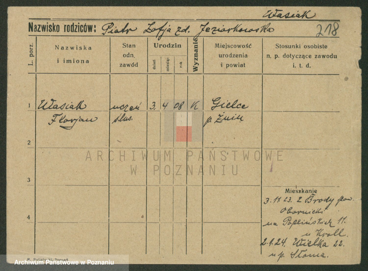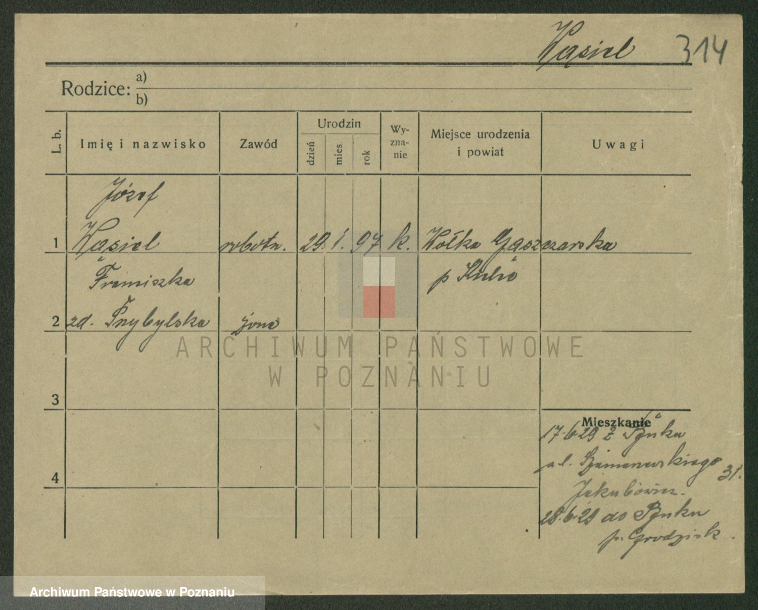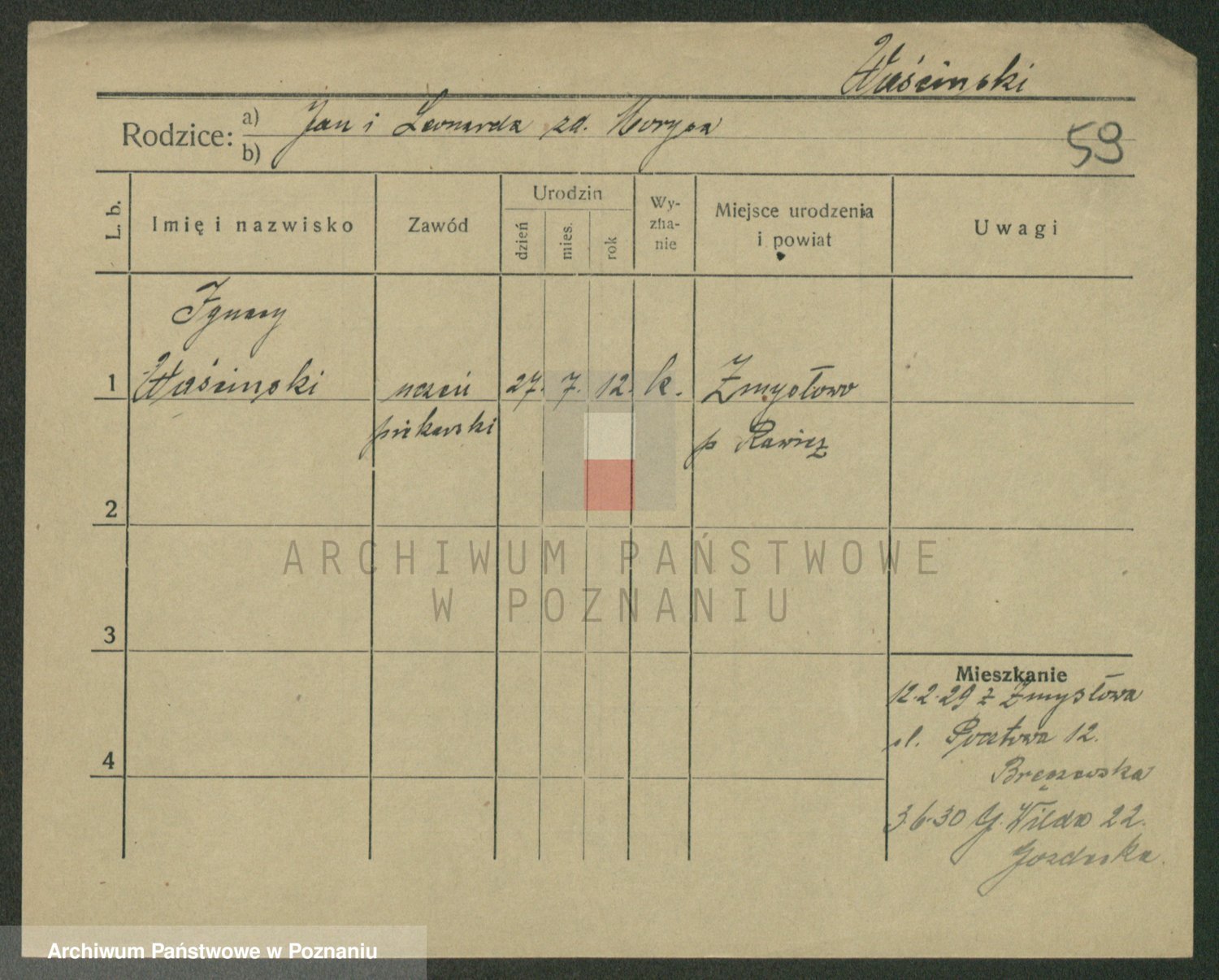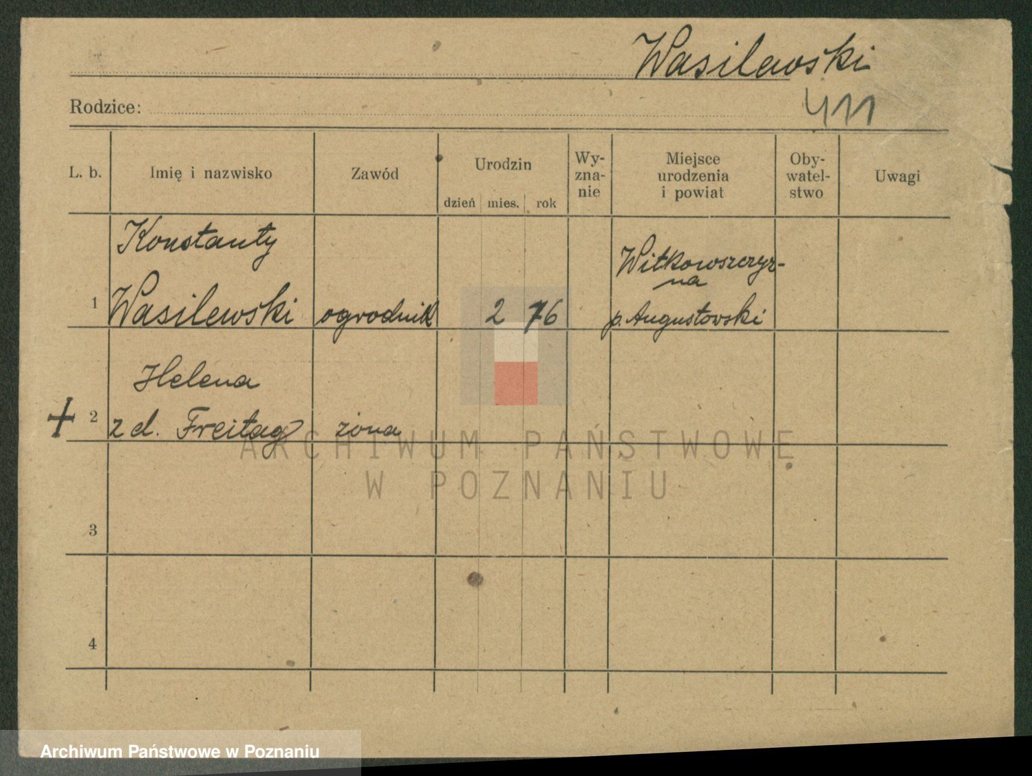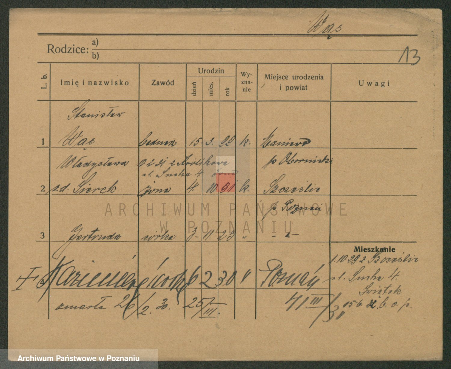 Podgląd karty osobowej dostępny jest po kliknięciu na nazwisko lub ikonkę karty. Można dokonywać powiększenia (ikony na górze) lub przechodzić między kolejnymi skanami (strzałki po bokach).