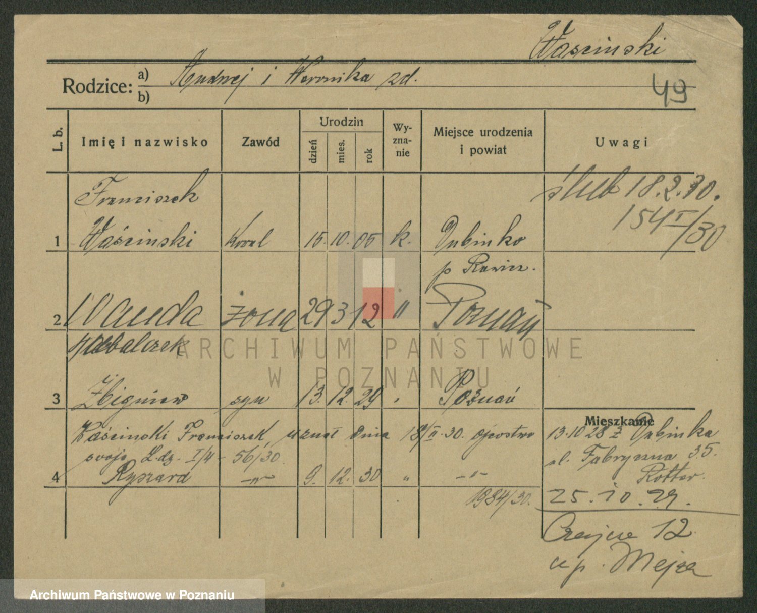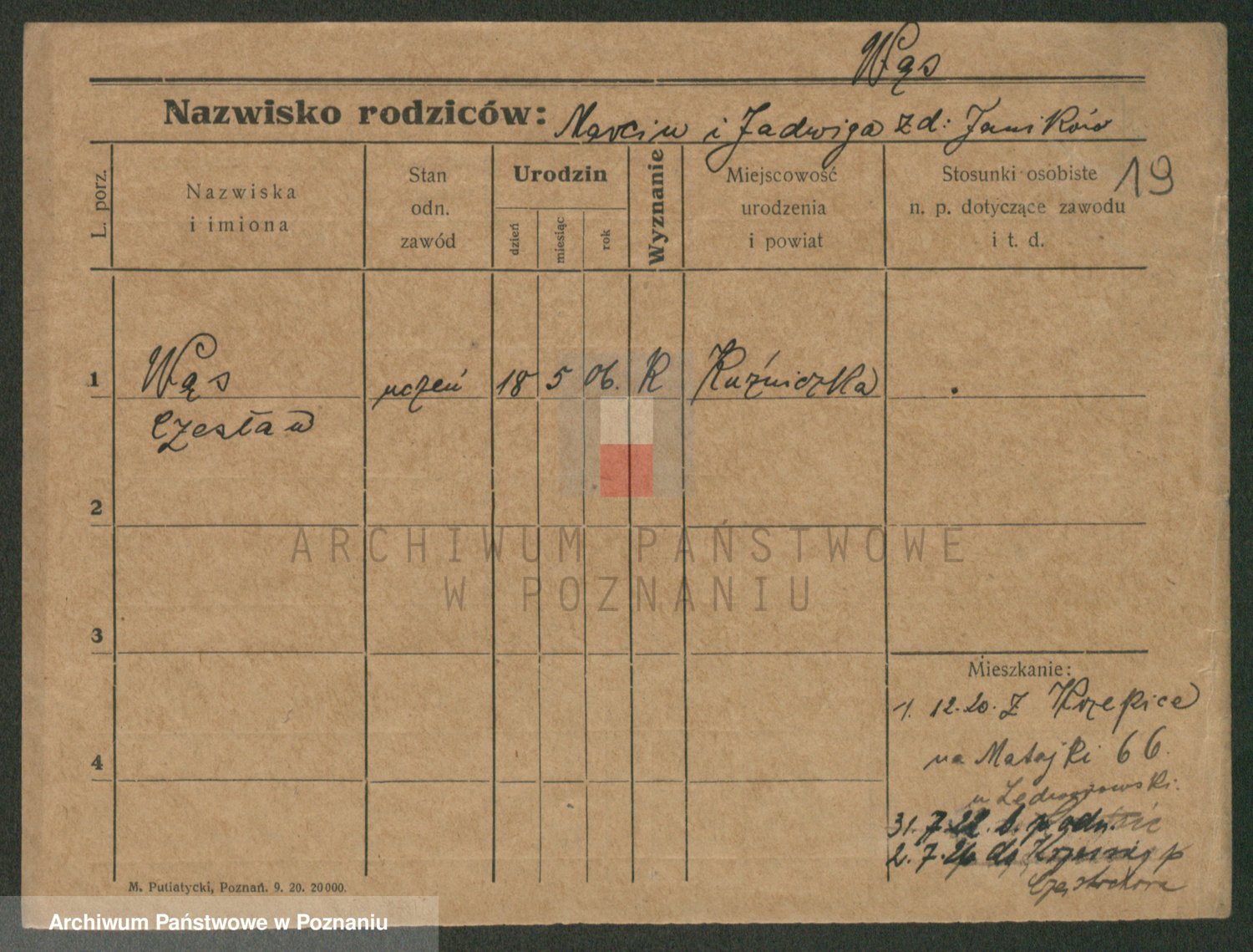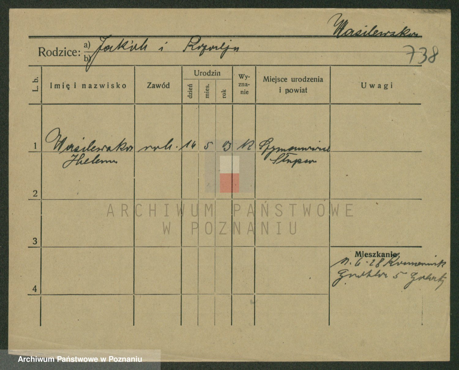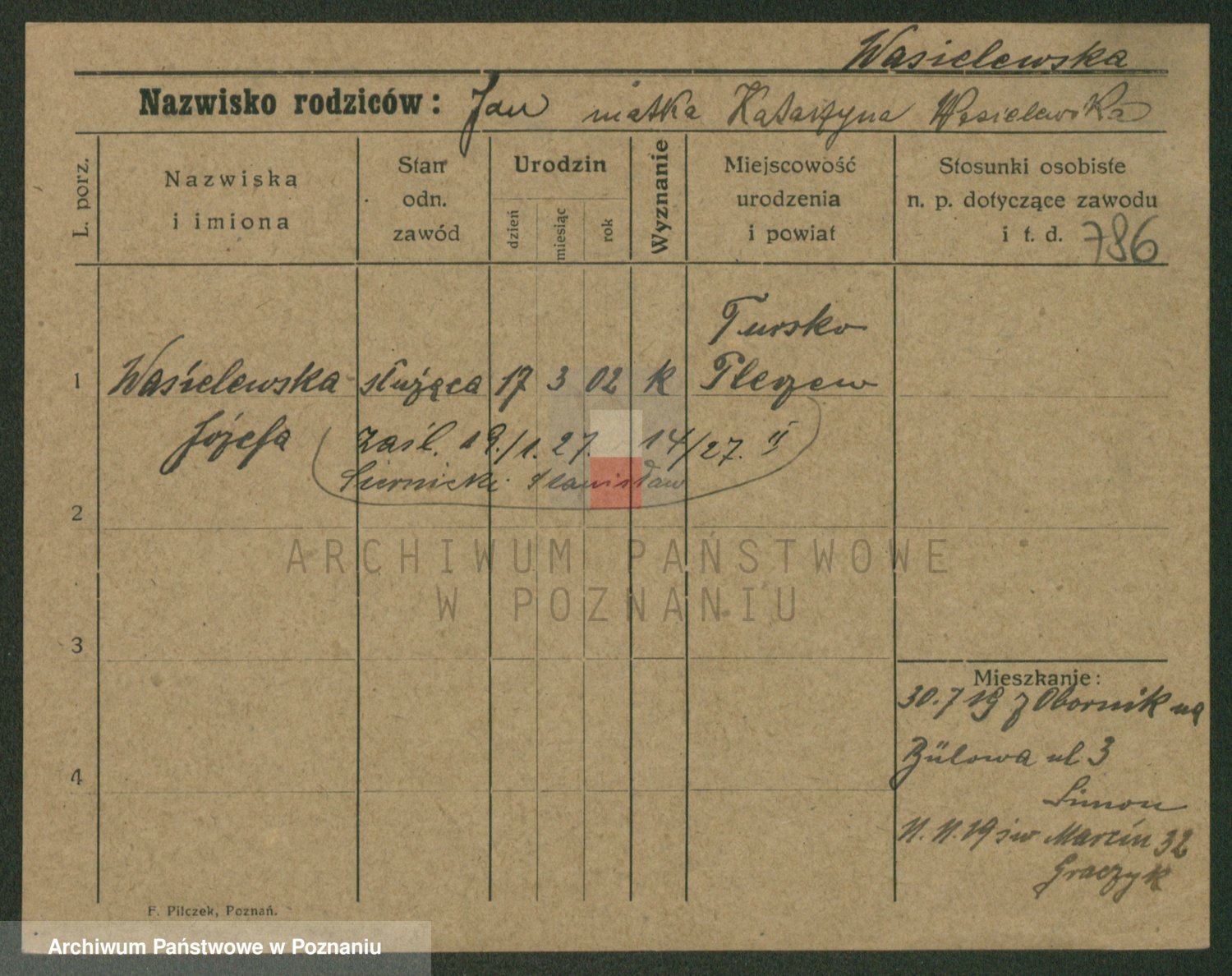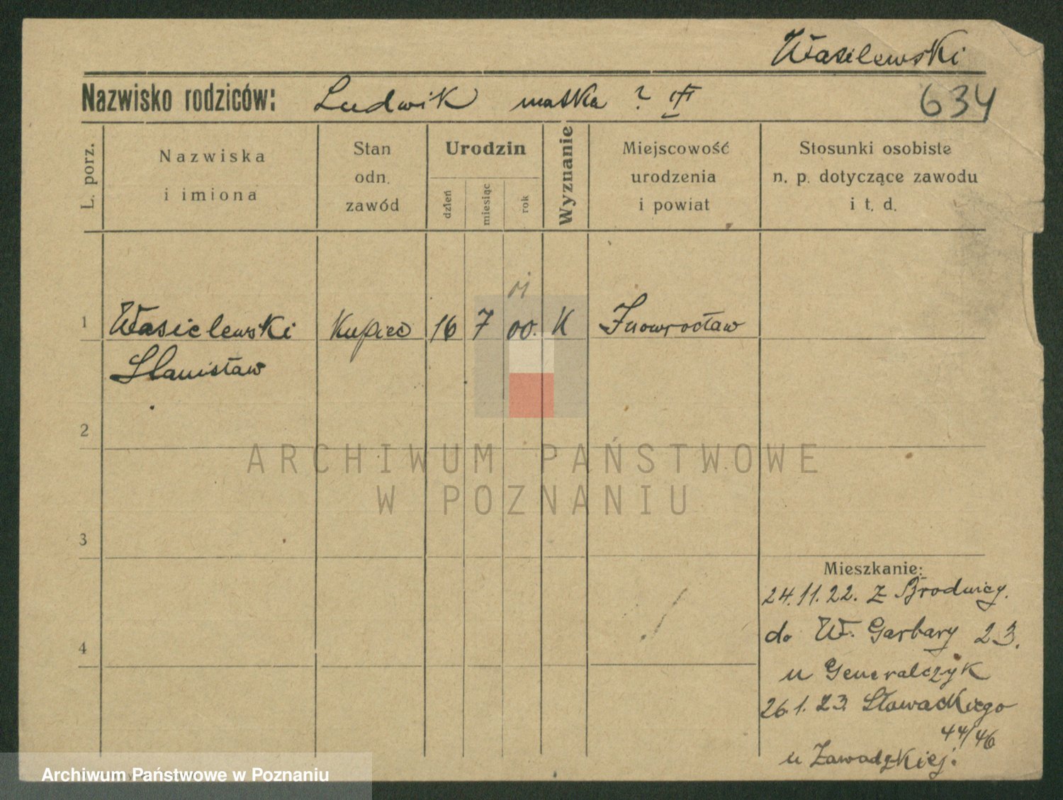 Podgląd karty osobowej dostępny jest po kliknięciu na nazwisko lub ikonkę karty. Można dokonywać powiększenia (ikony na górze) lub przechodzić między kolejnymi skanami (strzałki po bokach).