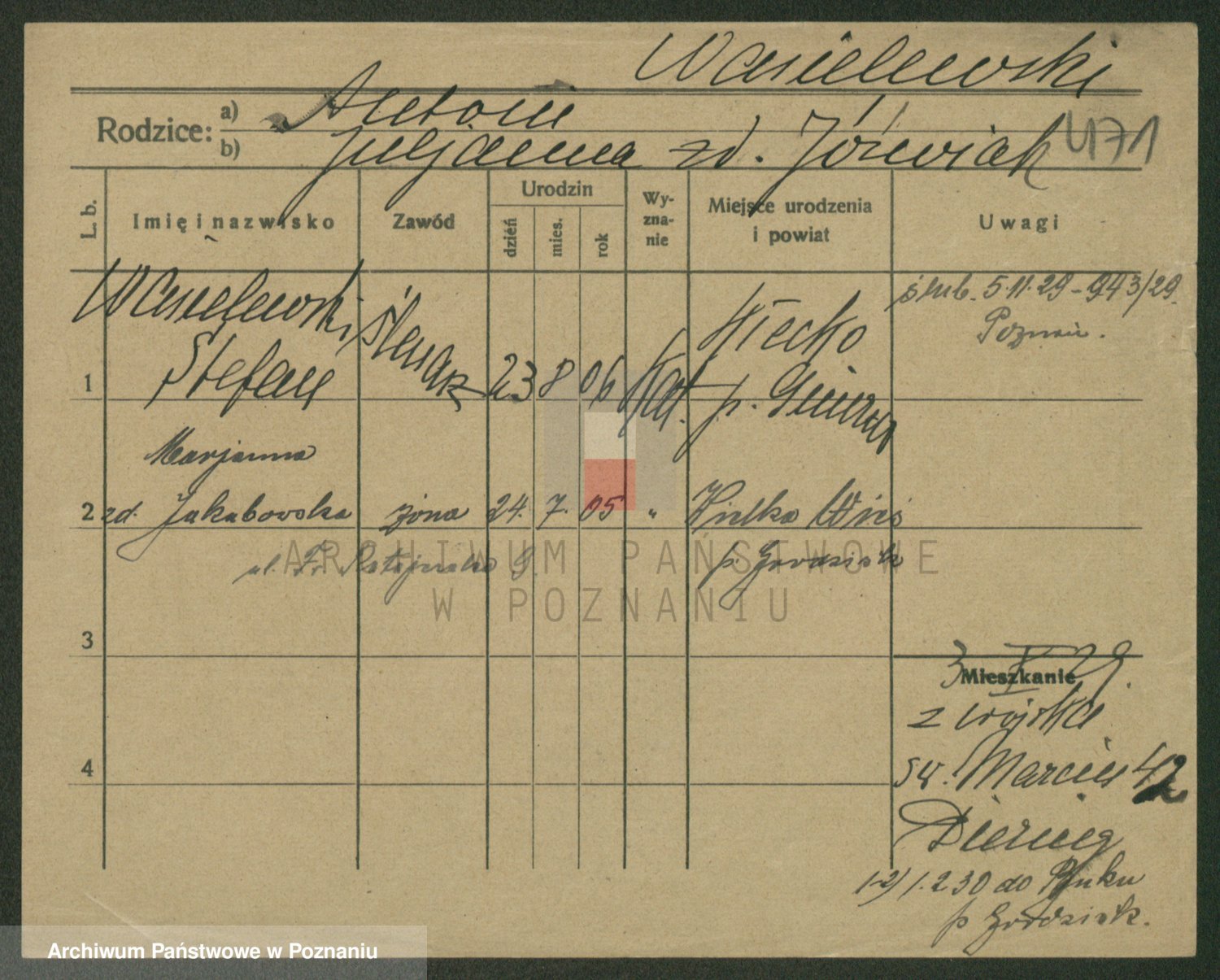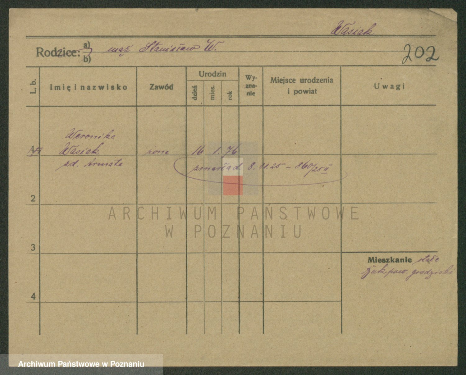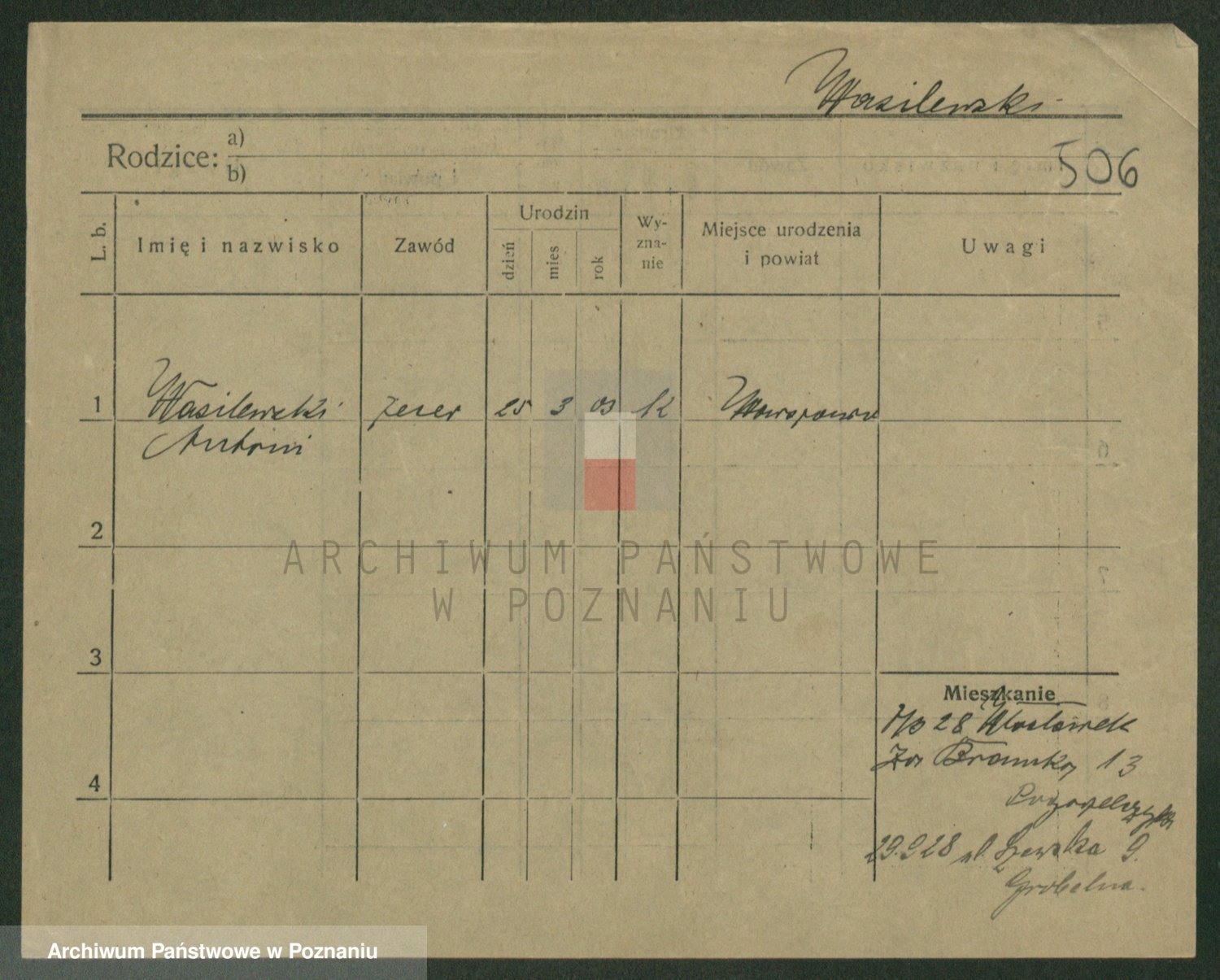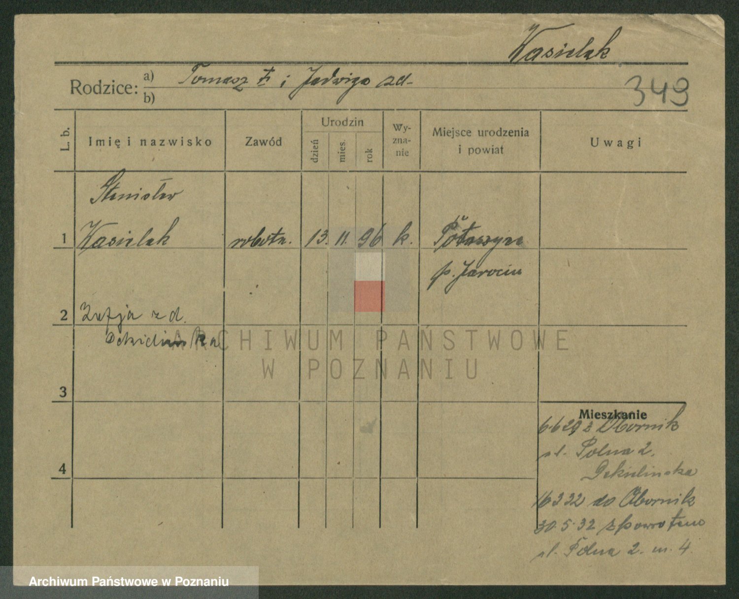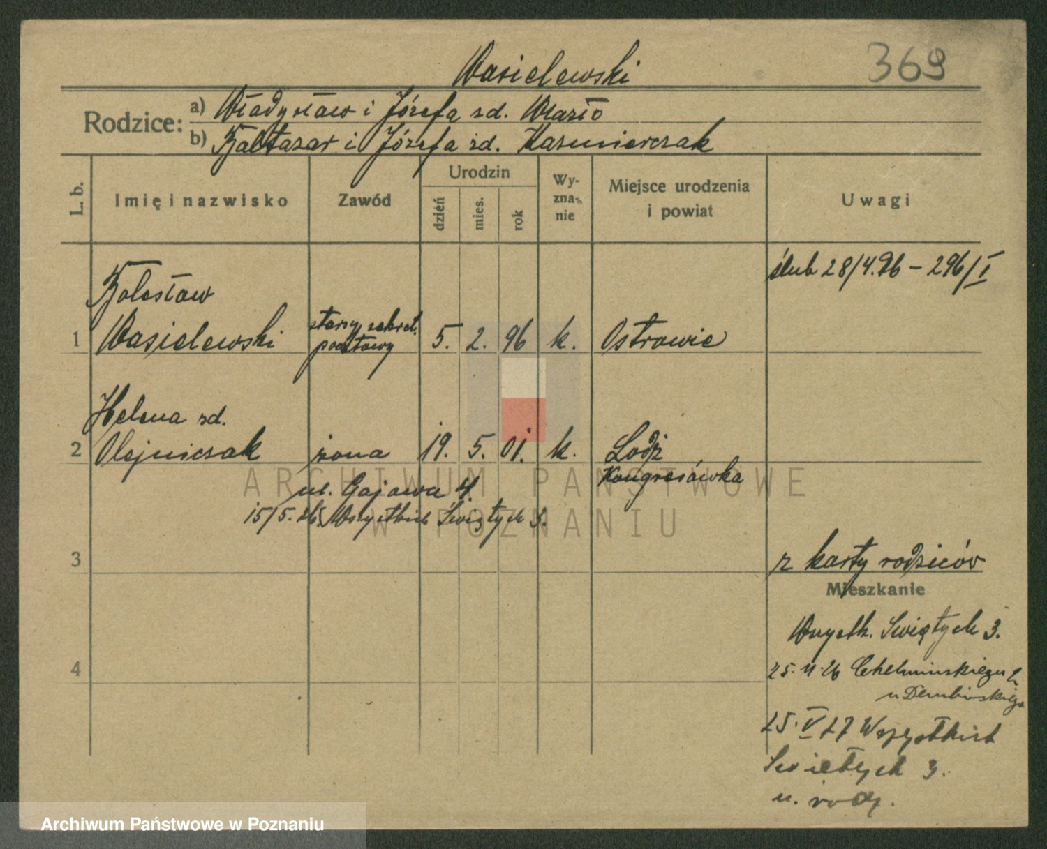 Podgląd karty osobowej dostępny jest po kliknięciu na nazwisko lub ikonkę karty. Można dokonywać powiększenia (ikony na górze) lub przechodzić między kolejnymi skanami (strzałki po bokach).
