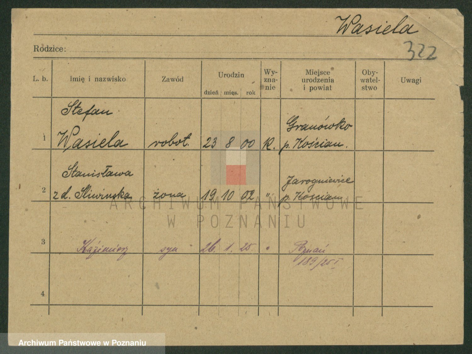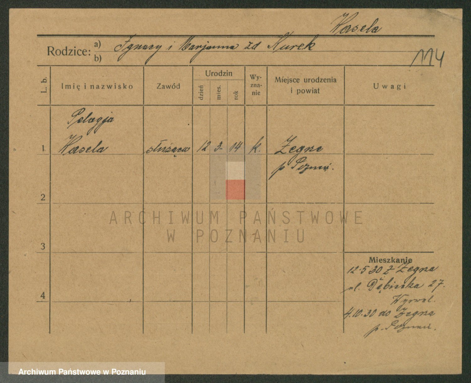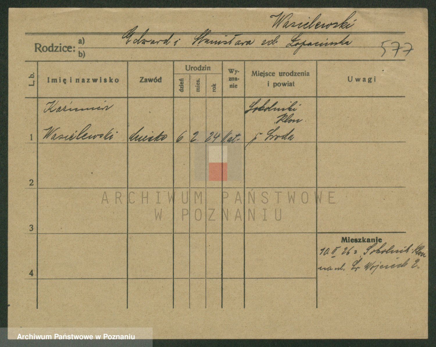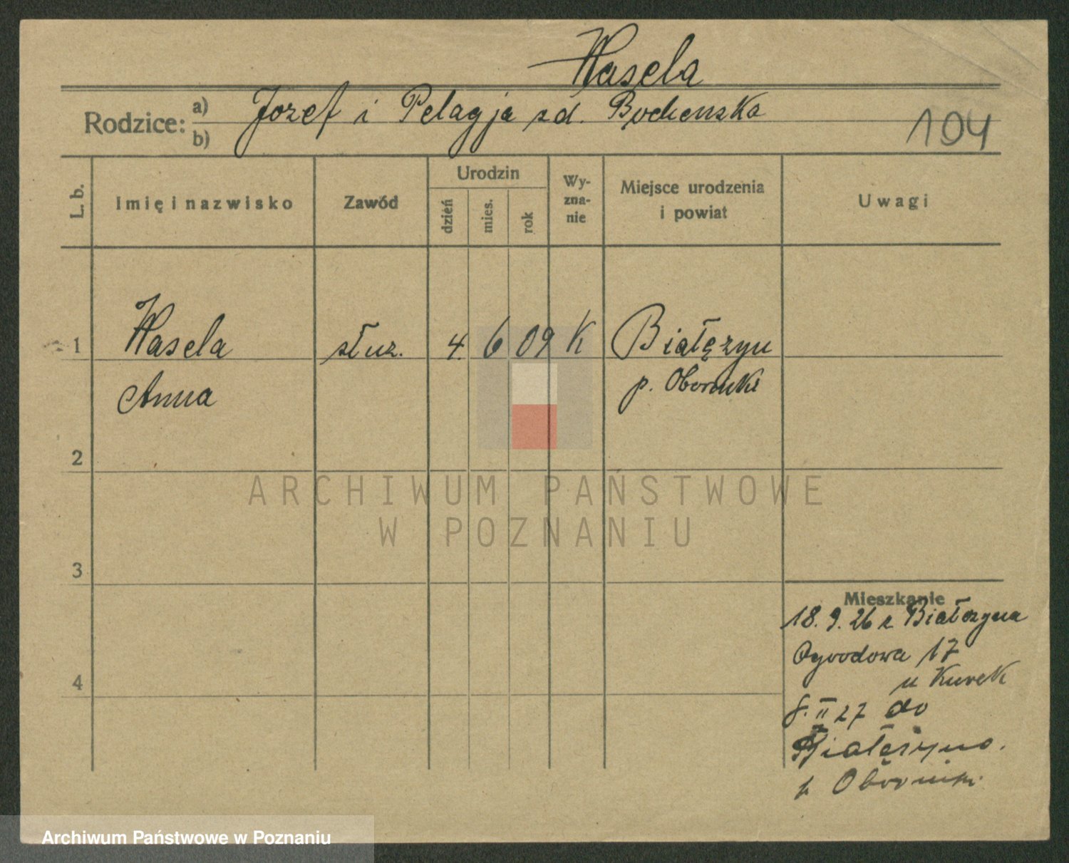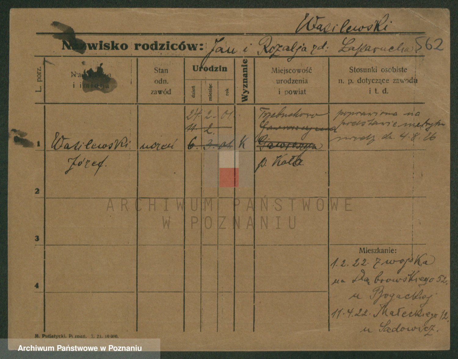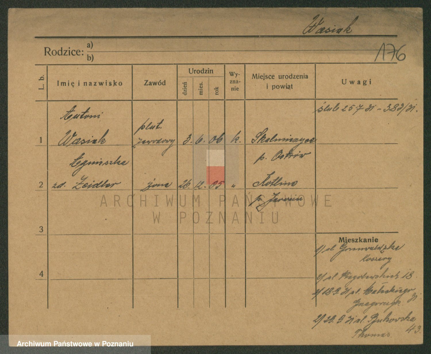 Podgląd karty osobowej dostępny jest po kliknięciu na nazwisko lub ikonkę karty. Można dokonywać powiększenia (ikony na górze) lub przechodzić między kolejnymi skanami (strzałki po bokach).