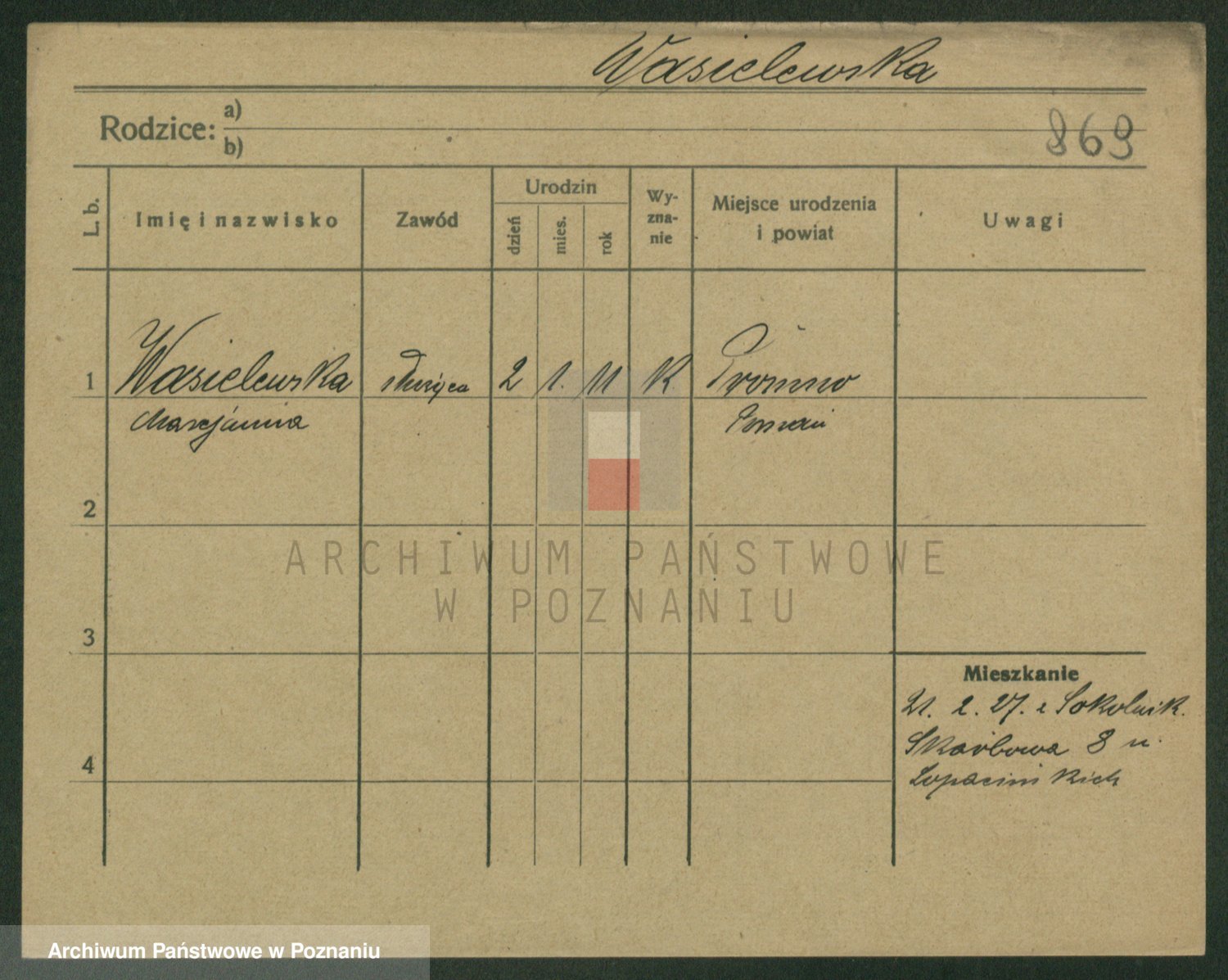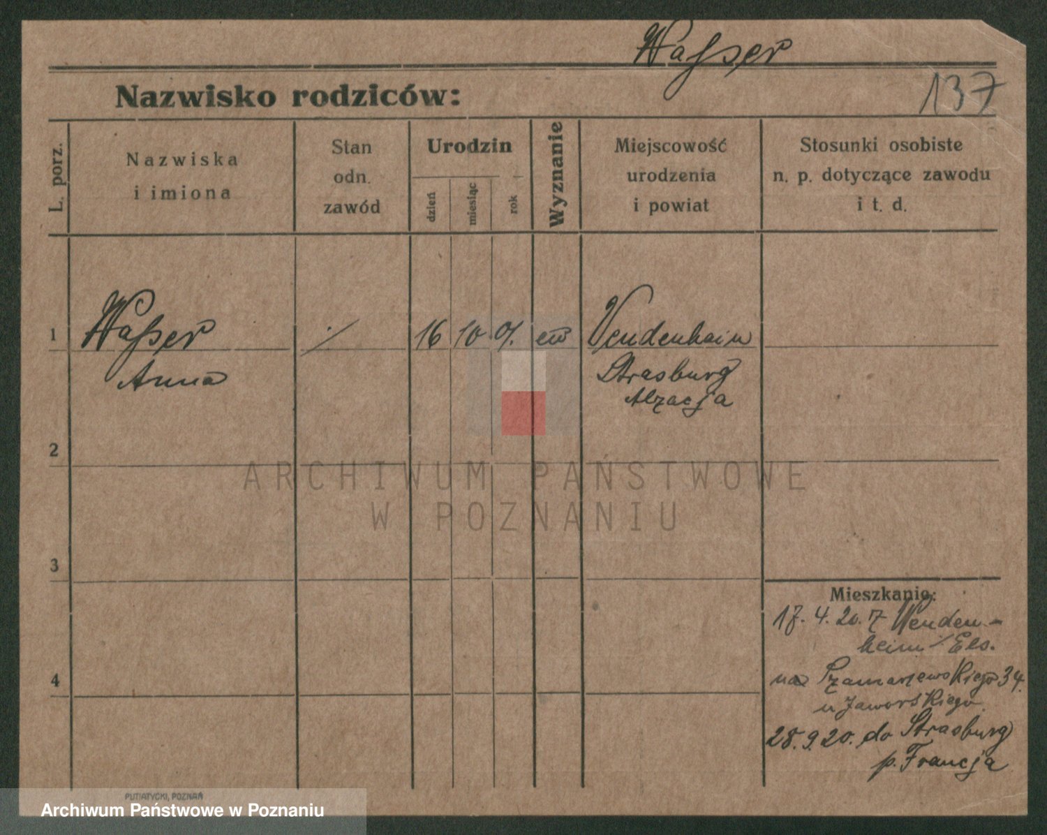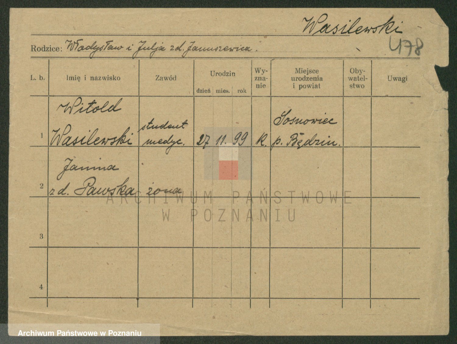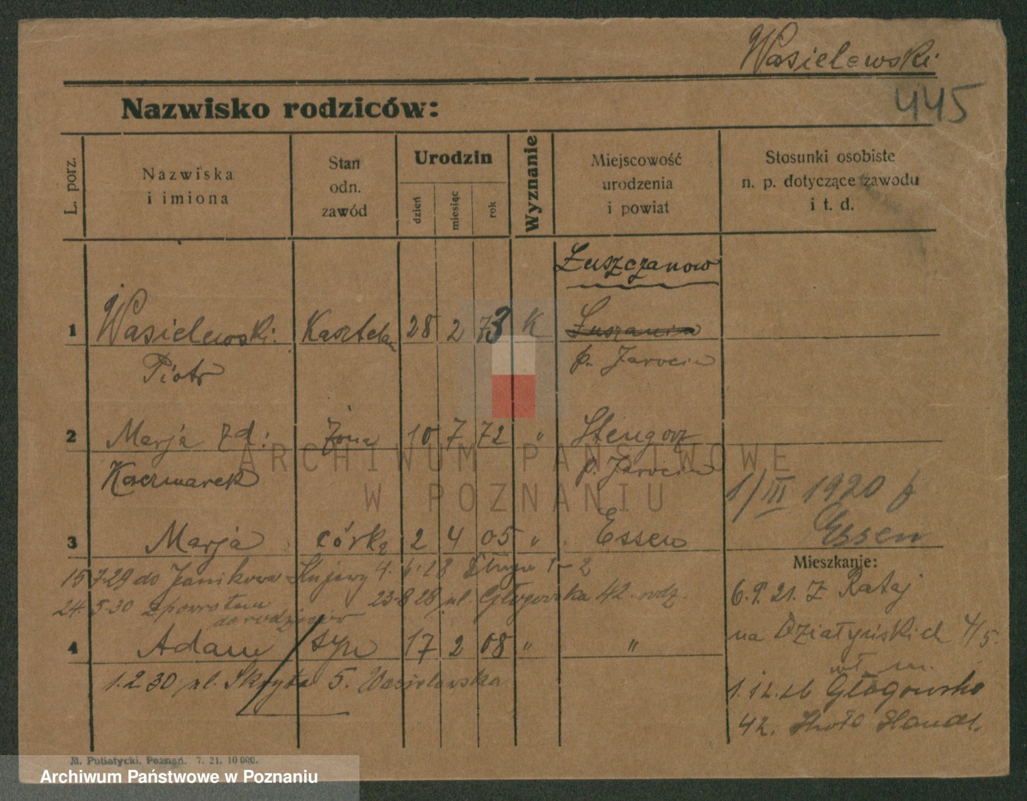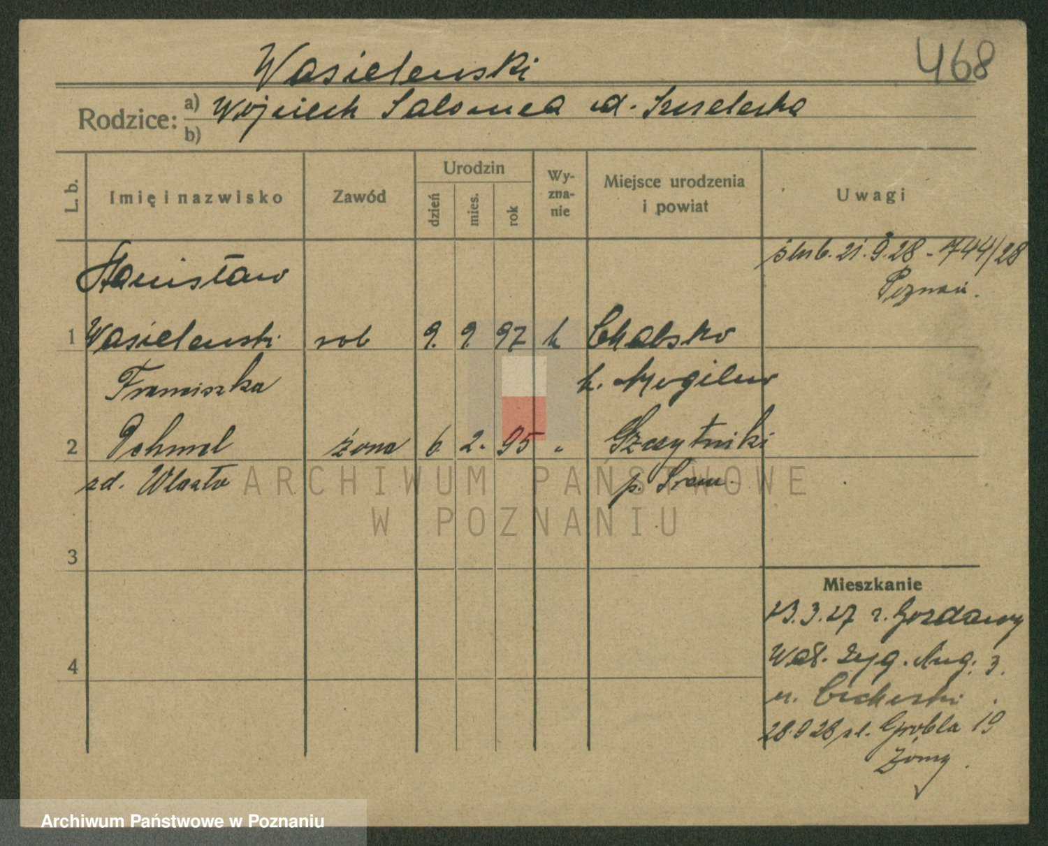 Podgląd karty osobowej dostępny jest po kliknięciu na nazwisko lub ikonkę karty. Można dokonywać powiększenia (ikony na górze) lub przechodzić między kolejnymi skanami (strzałki po bokach).