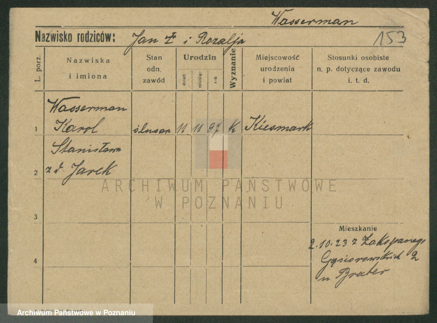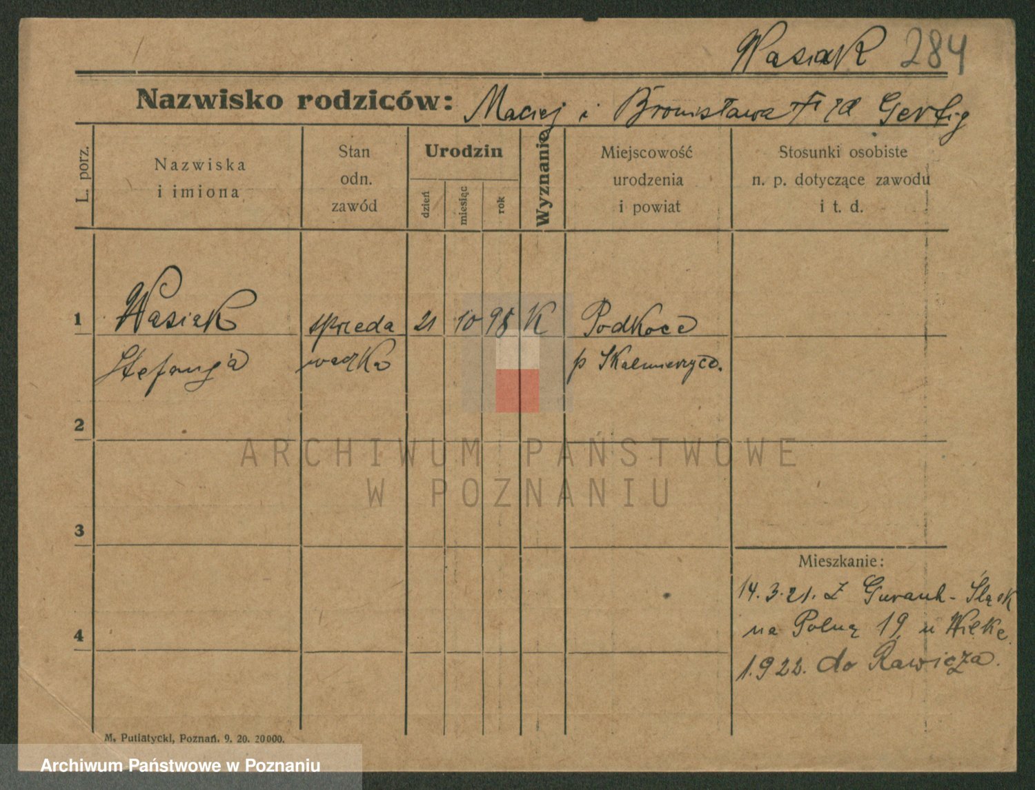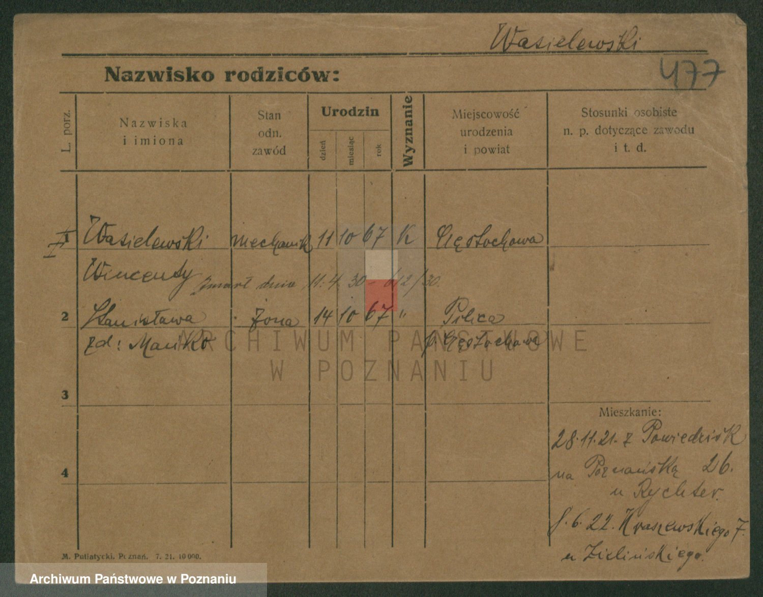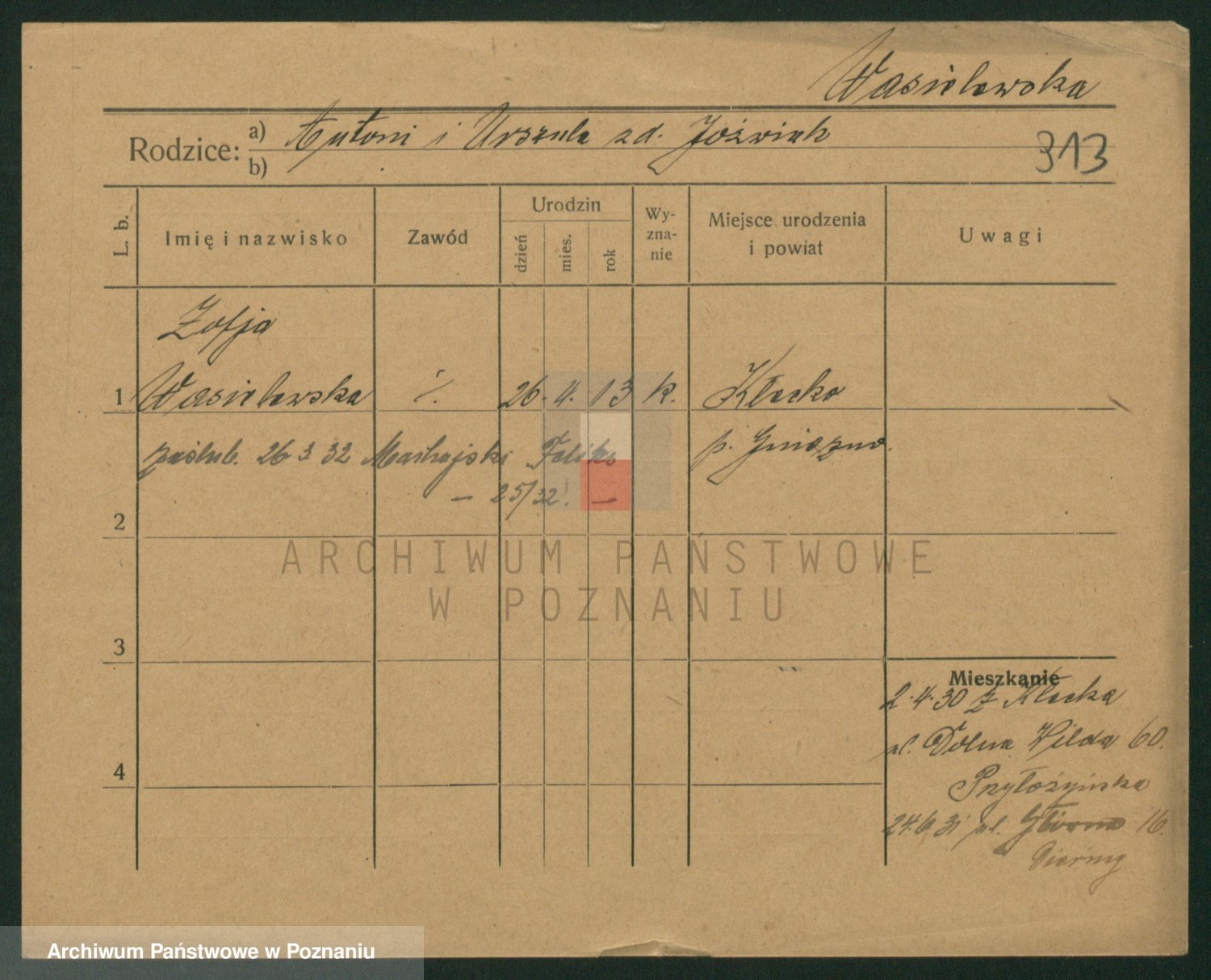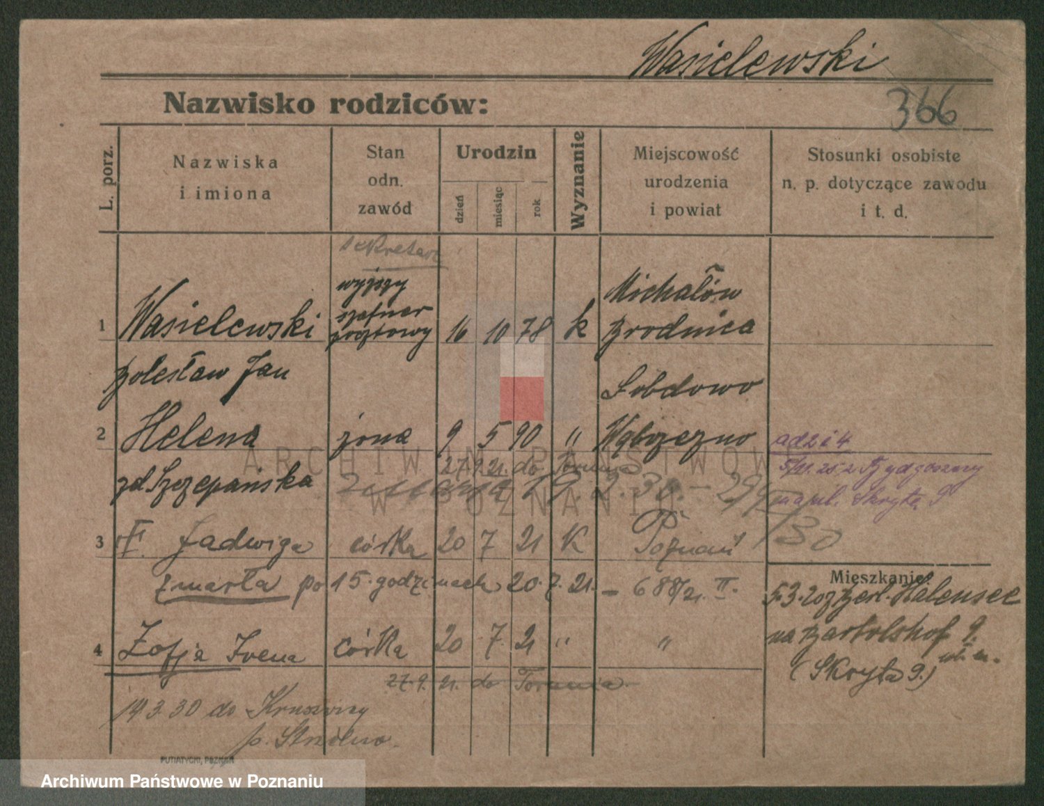Podgląd karty osobowej dostępny jest po kliknięciu na nazwisko lub ikonkę karty. Można dokonywać powiększenia (ikony na górze) lub przechodzić między kolejnymi skanami (strzałki po bokach).