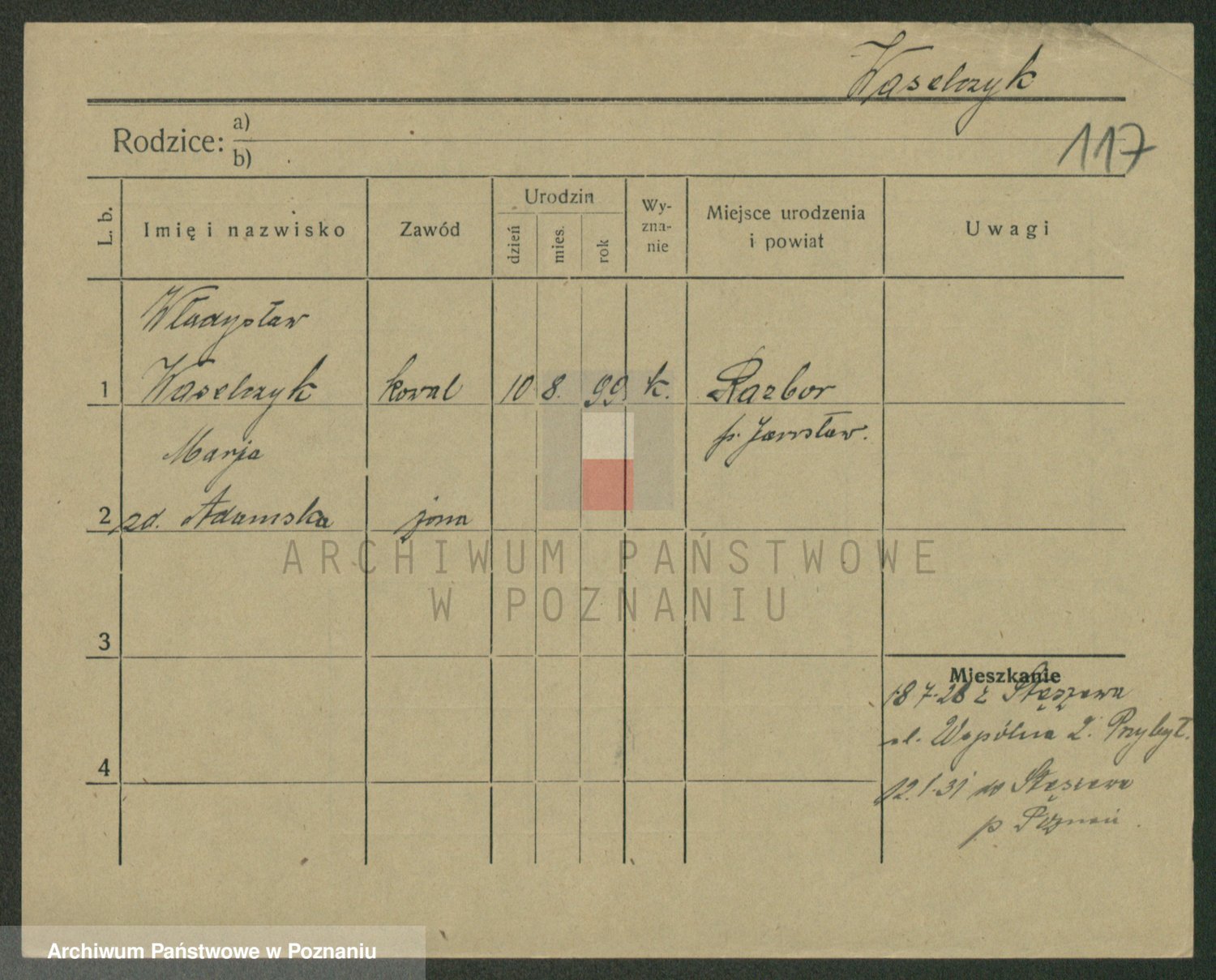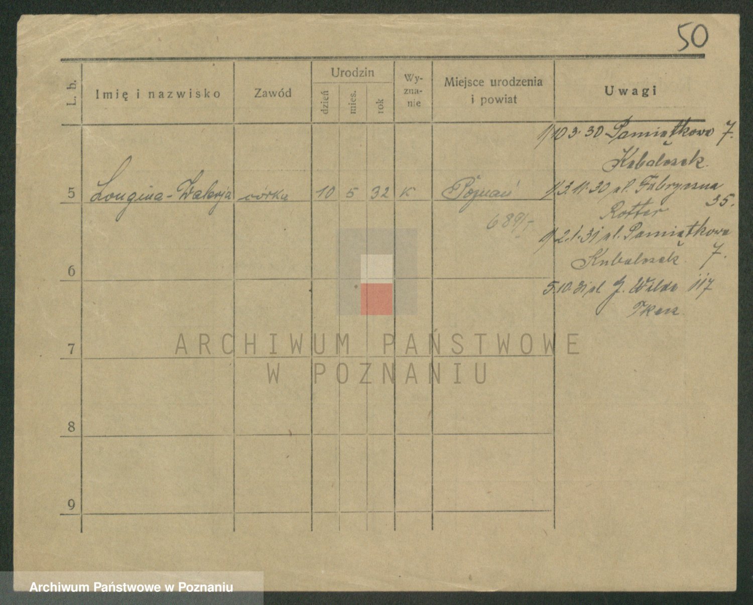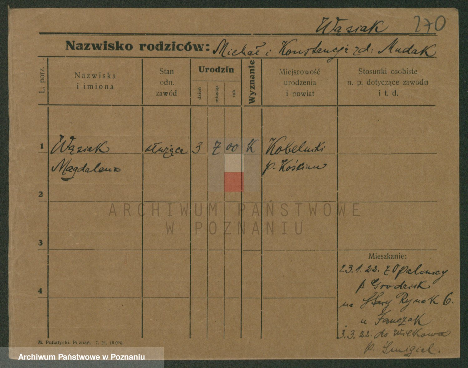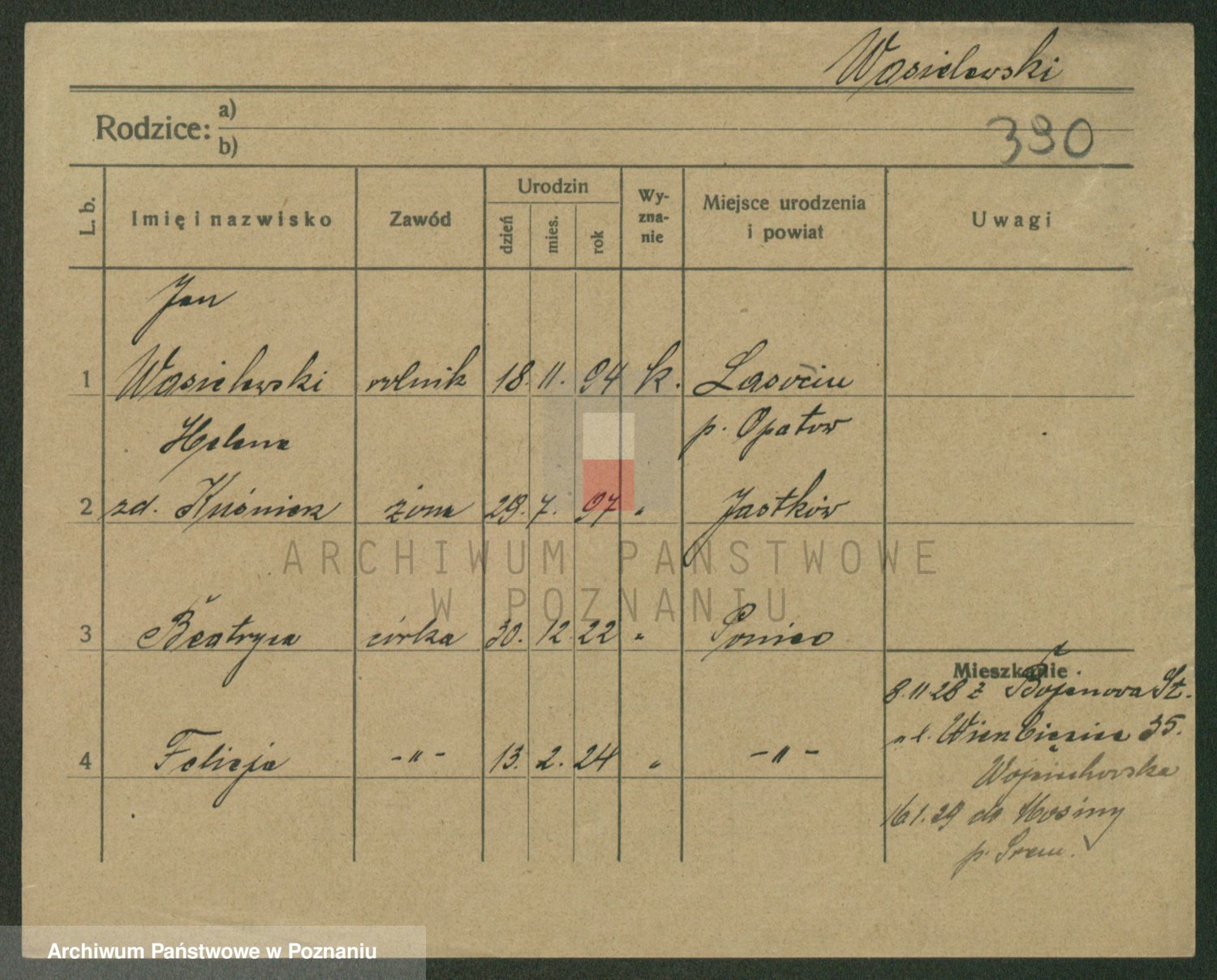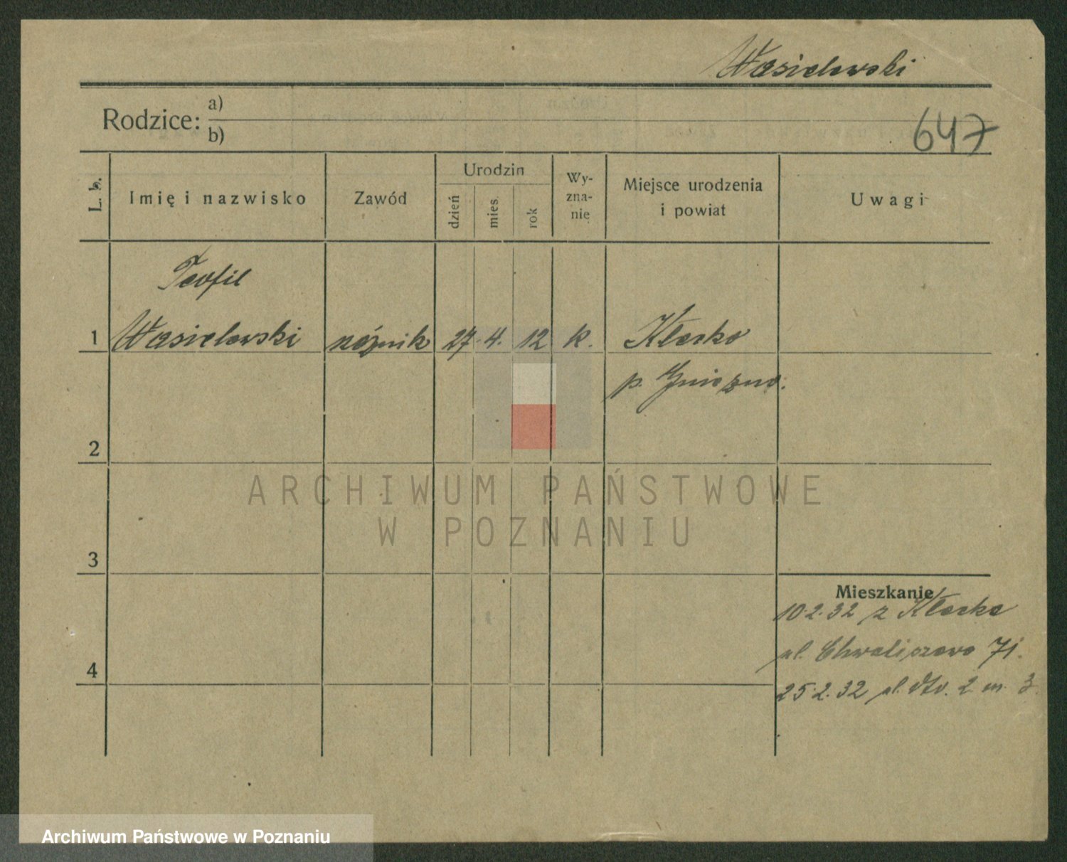 Podgląd karty osobowej dostępny jest po kliknięciu na nazwisko lub ikonkę karty. Można dokonywać powiększenia (ikony na górze) lub przechodzić między kolejnymi skanami (strzałki po bokach).