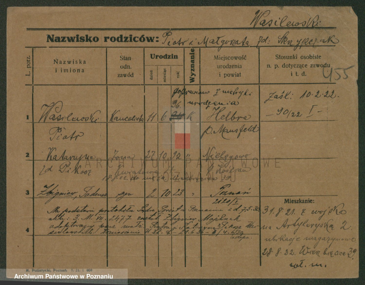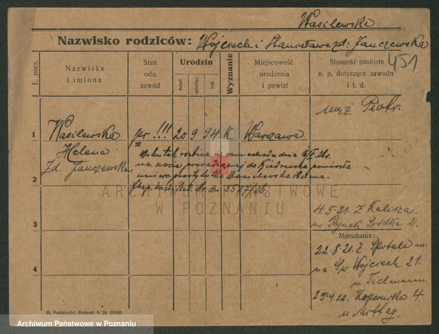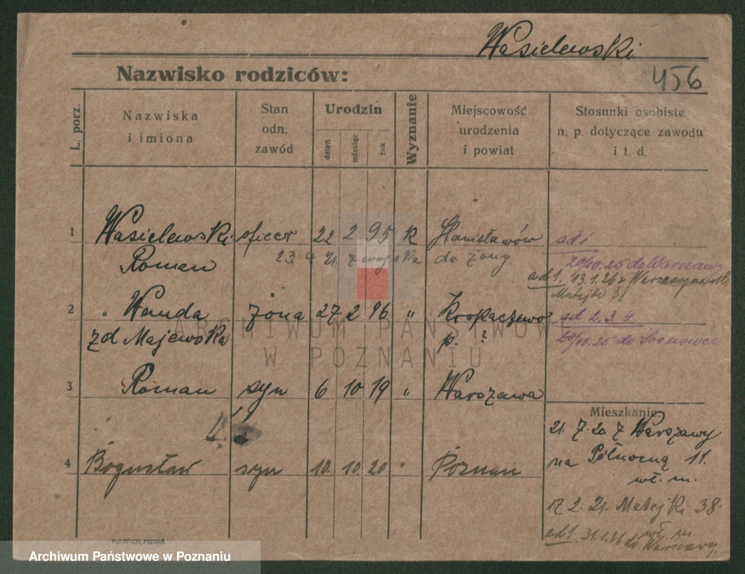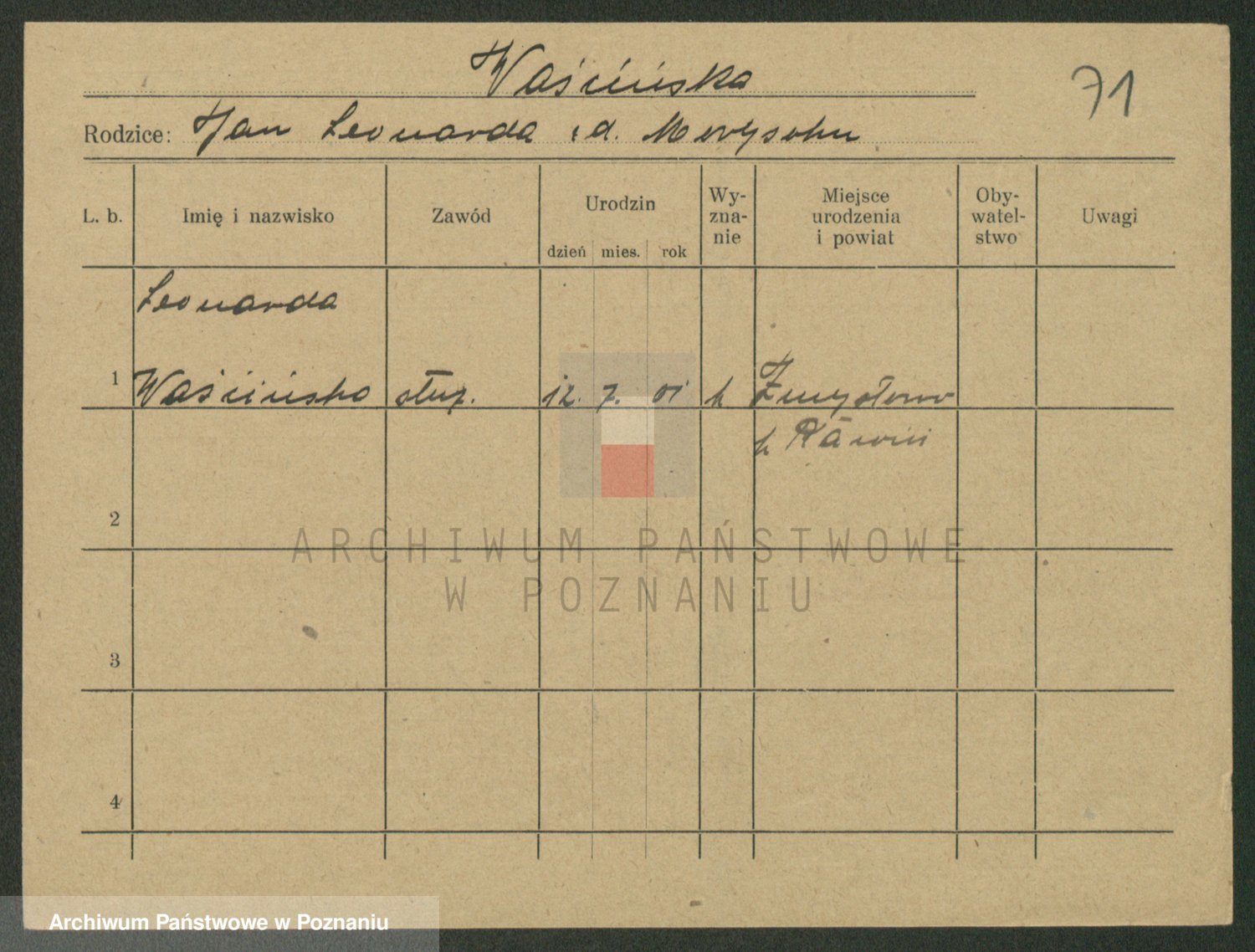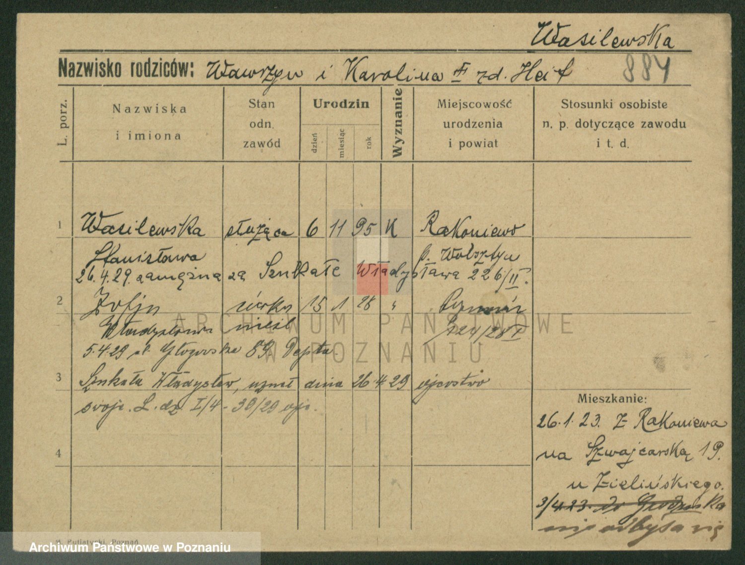 Podgląd karty osobowej dostępny jest po kliknięciu na nazwisko lub ikonkę karty. Można dokonywać powiększenia (ikony na górze) lub przechodzić między kolejnymi skanami (strzałki po bokach).