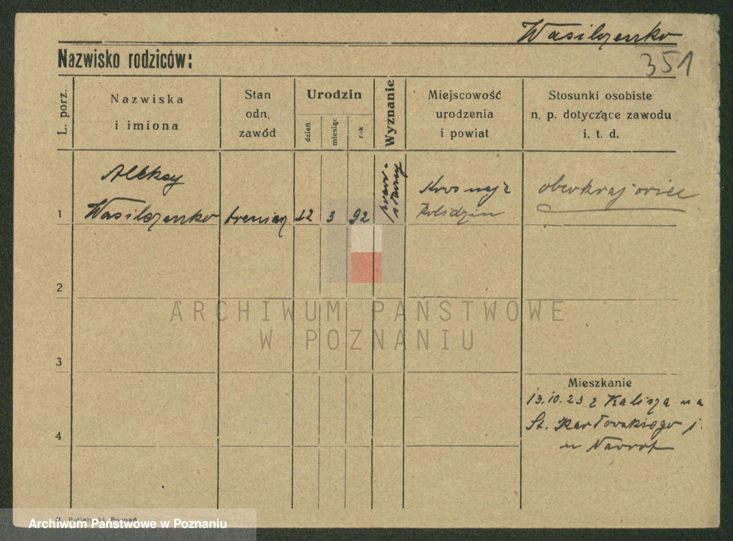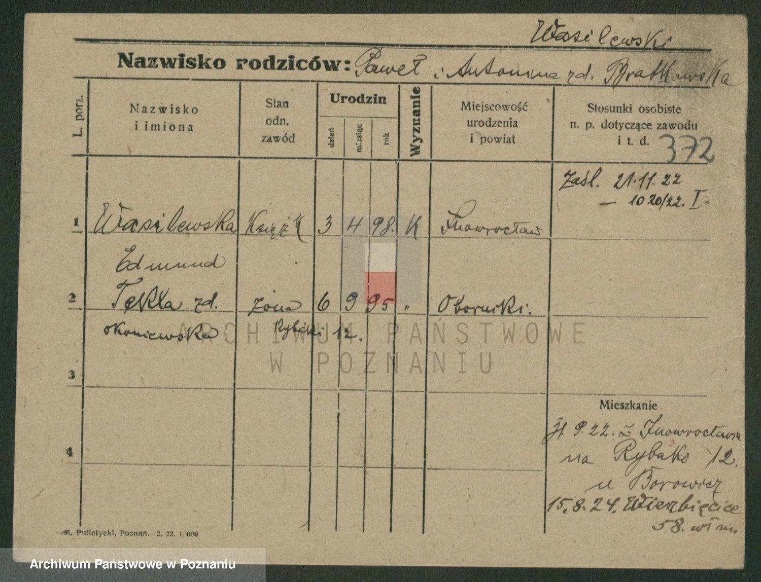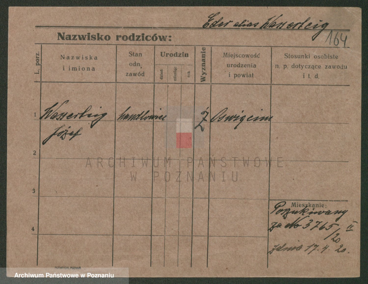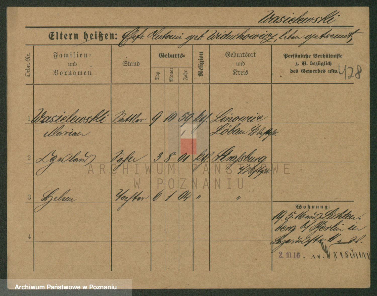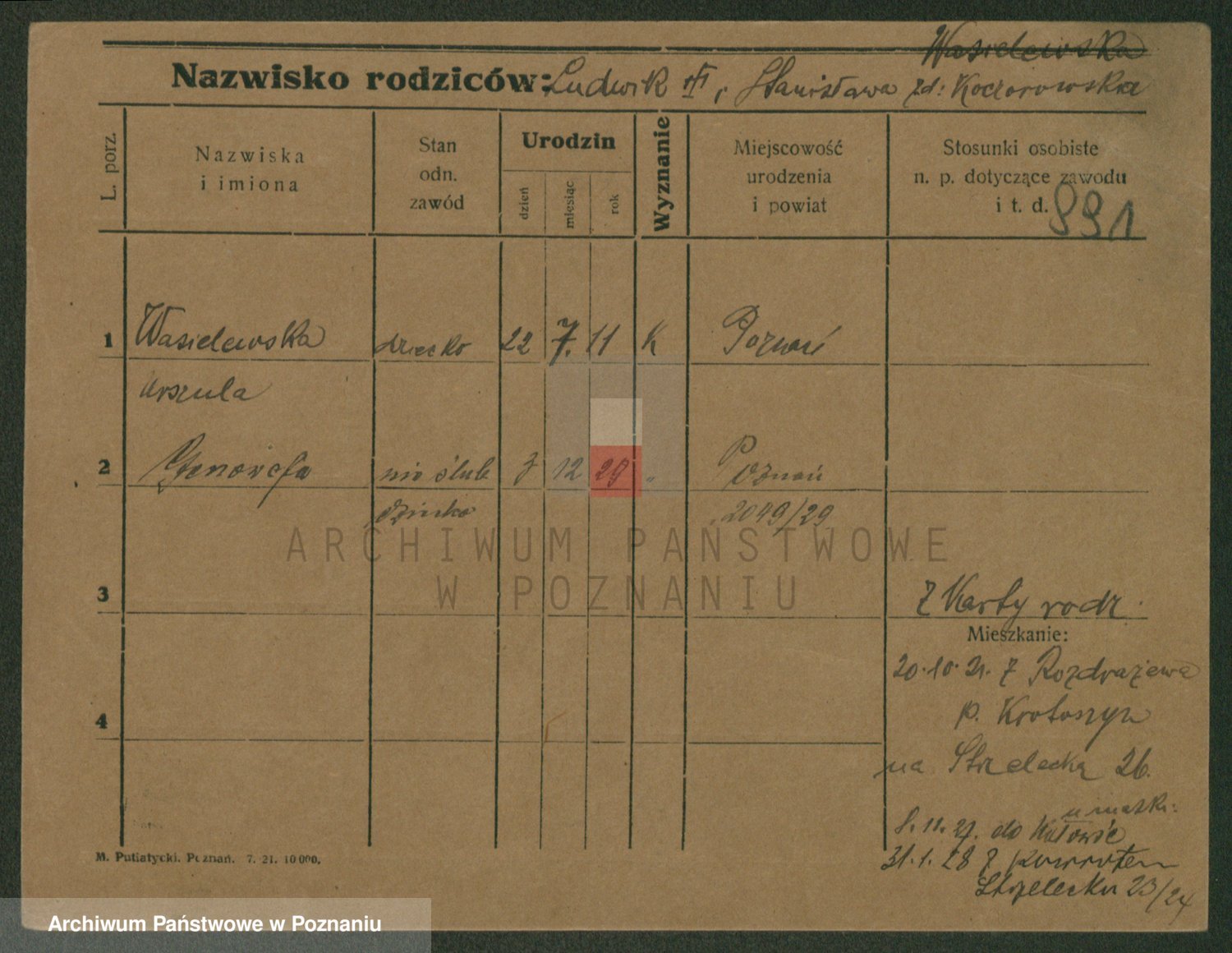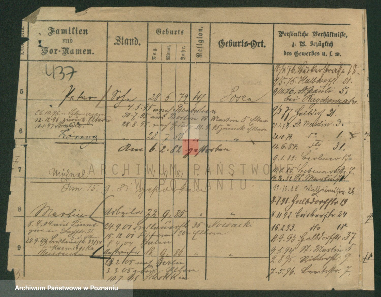 Podgląd karty osobowej dostępny jest po kliknięciu na nazwisko lub ikonkę karty. Można dokonywać powiększenia (ikony na górze) lub przechodzić między kolejnymi skanami (strzałki po bokach).