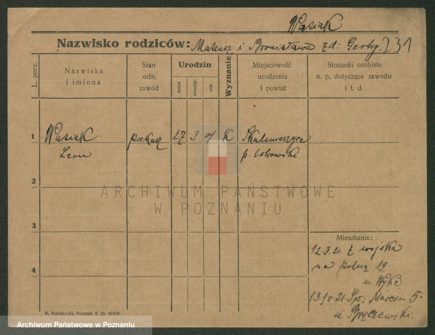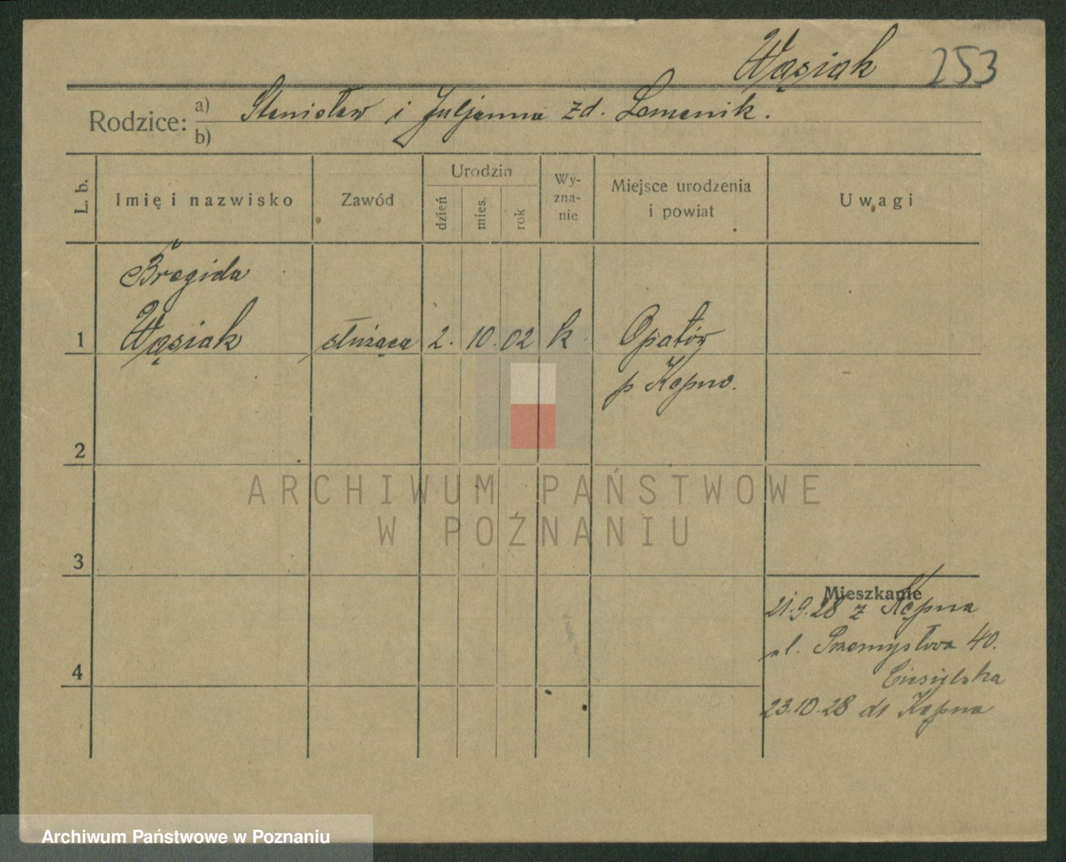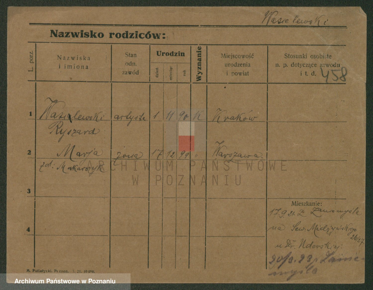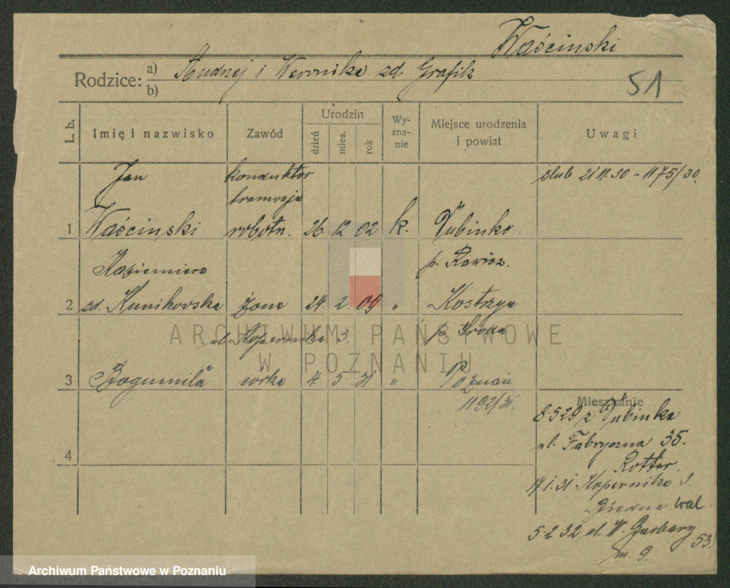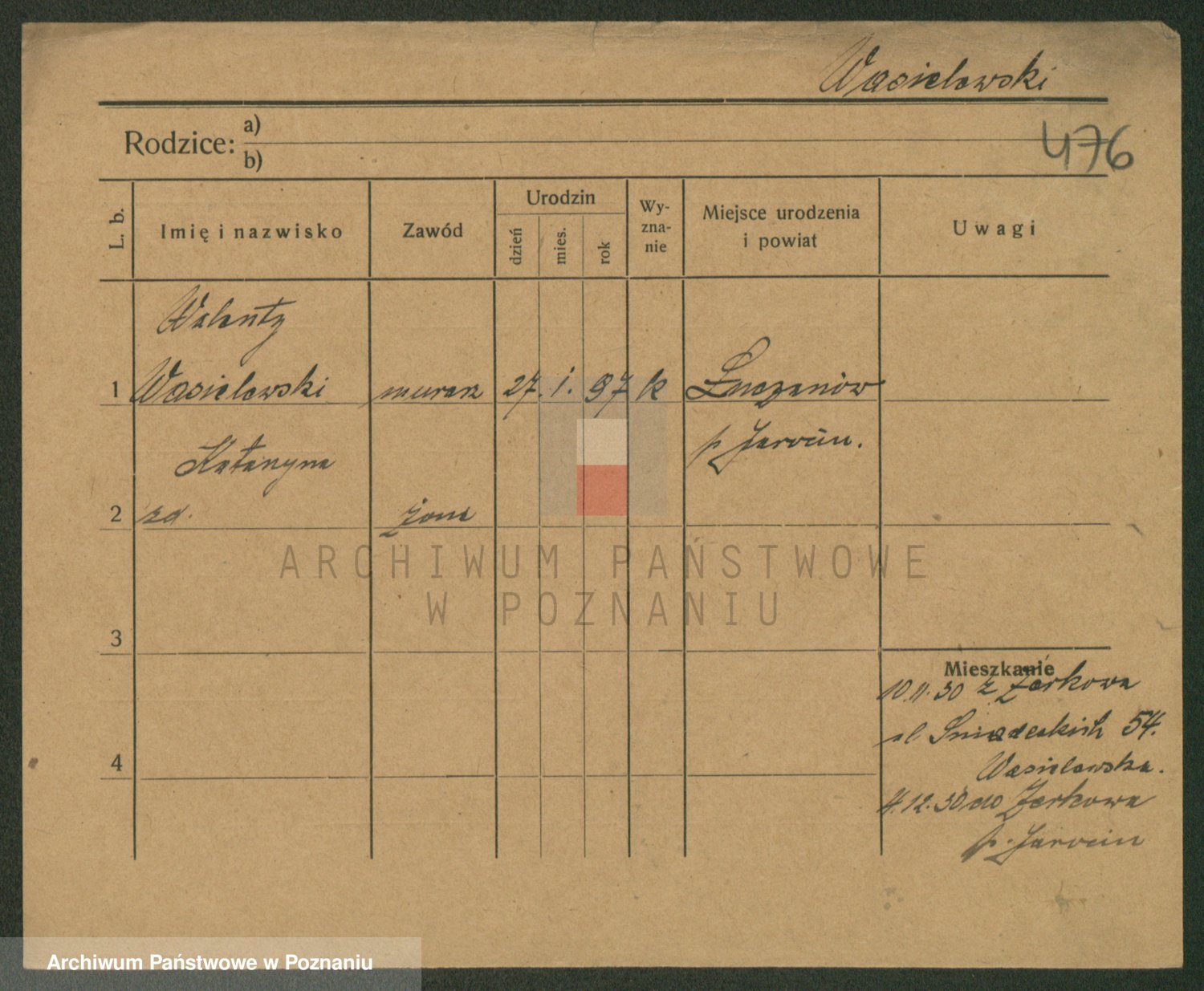 Podgląd karty osobowej dostępny jest po kliknięciu na nazwisko lub ikonkę karty. Można dokonywać powiększenia (ikony na górze) lub przechodzić między kolejnymi skanami (strzałki po bokach).