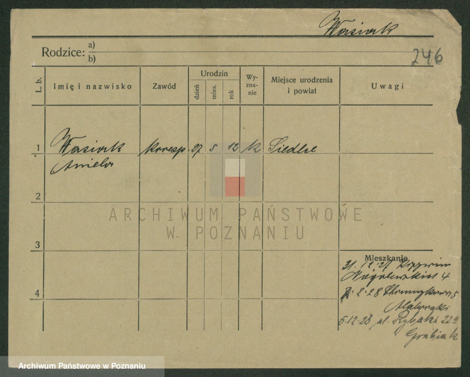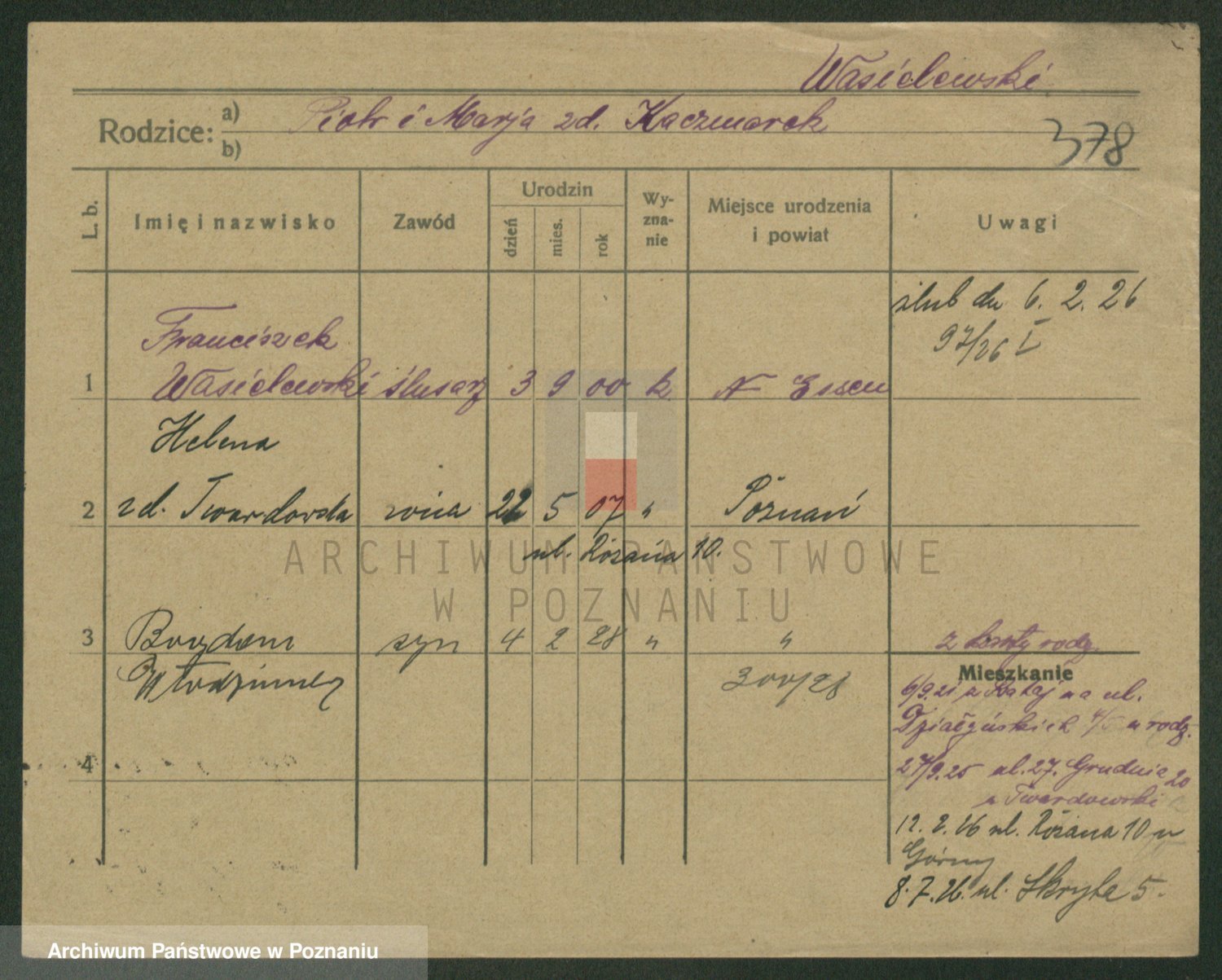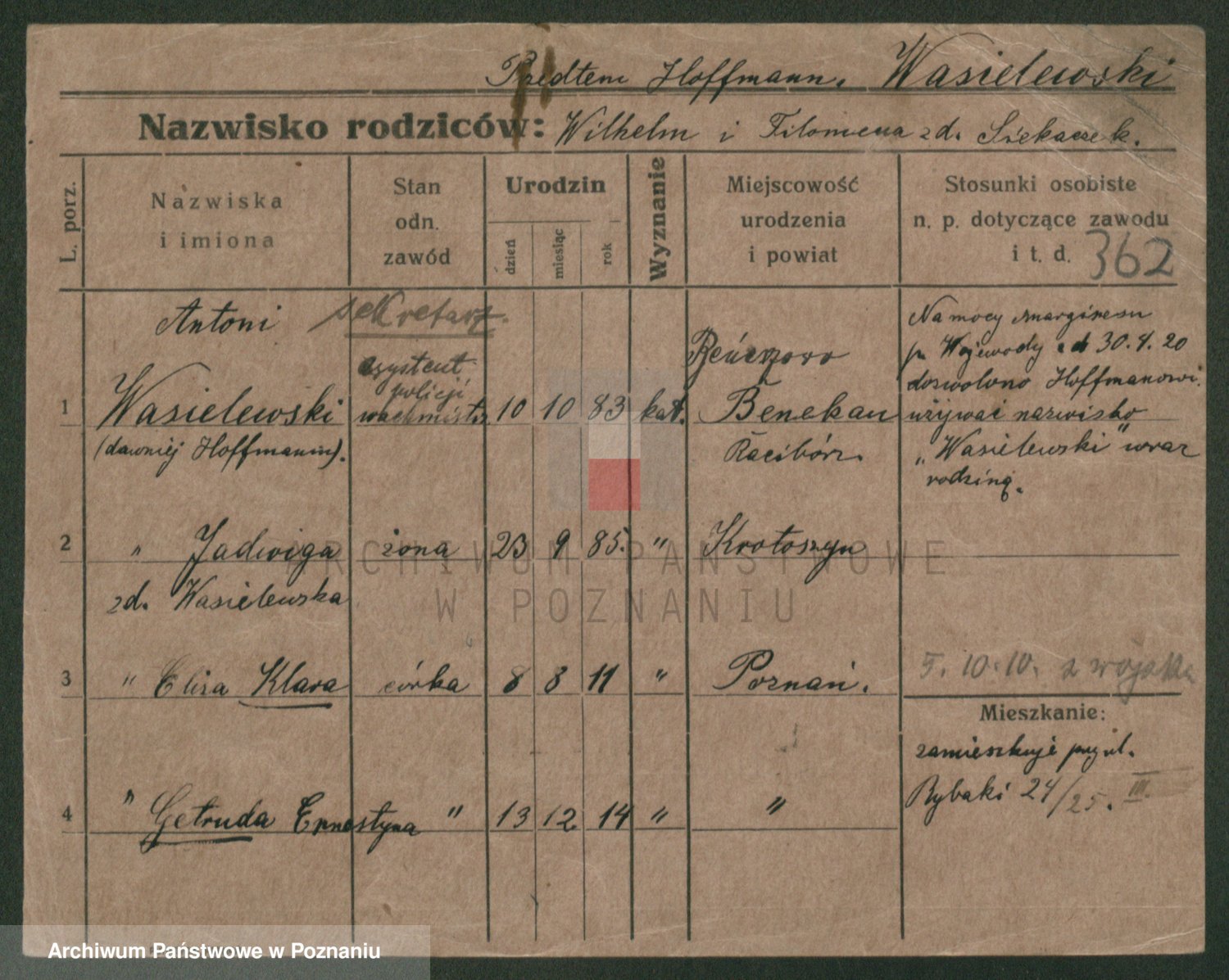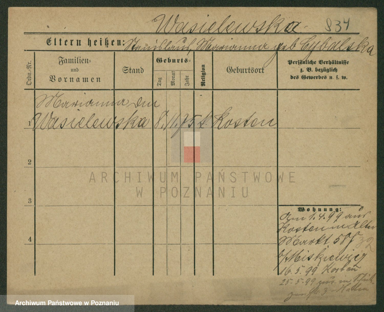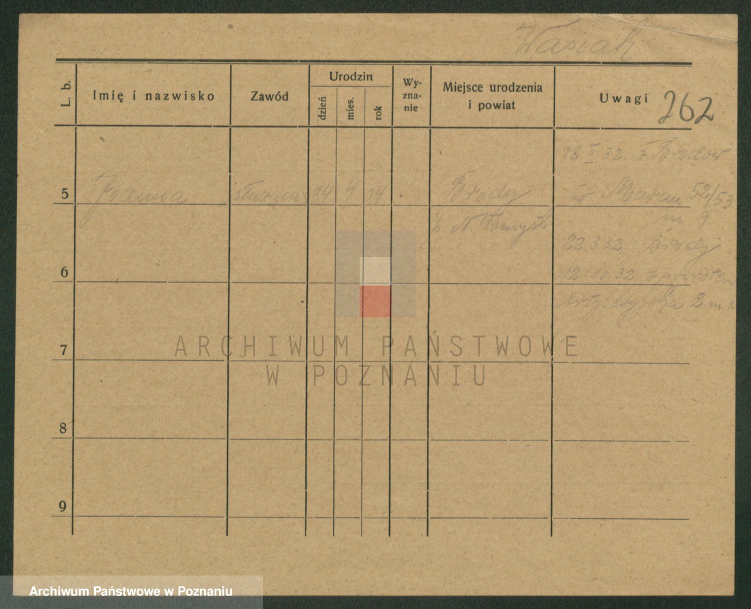 Podgląd karty osobowej dostępny jest po kliknięciu na nazwisko lub ikonkę karty. Można dokonywać powiększenia (ikony na górze) lub przechodzić między kolejnymi skanami (strzałki po bokach).