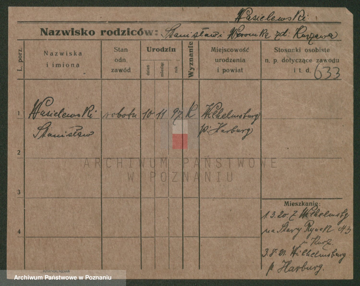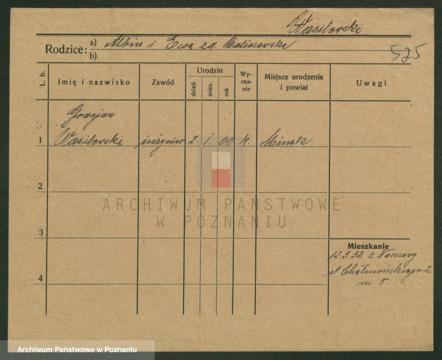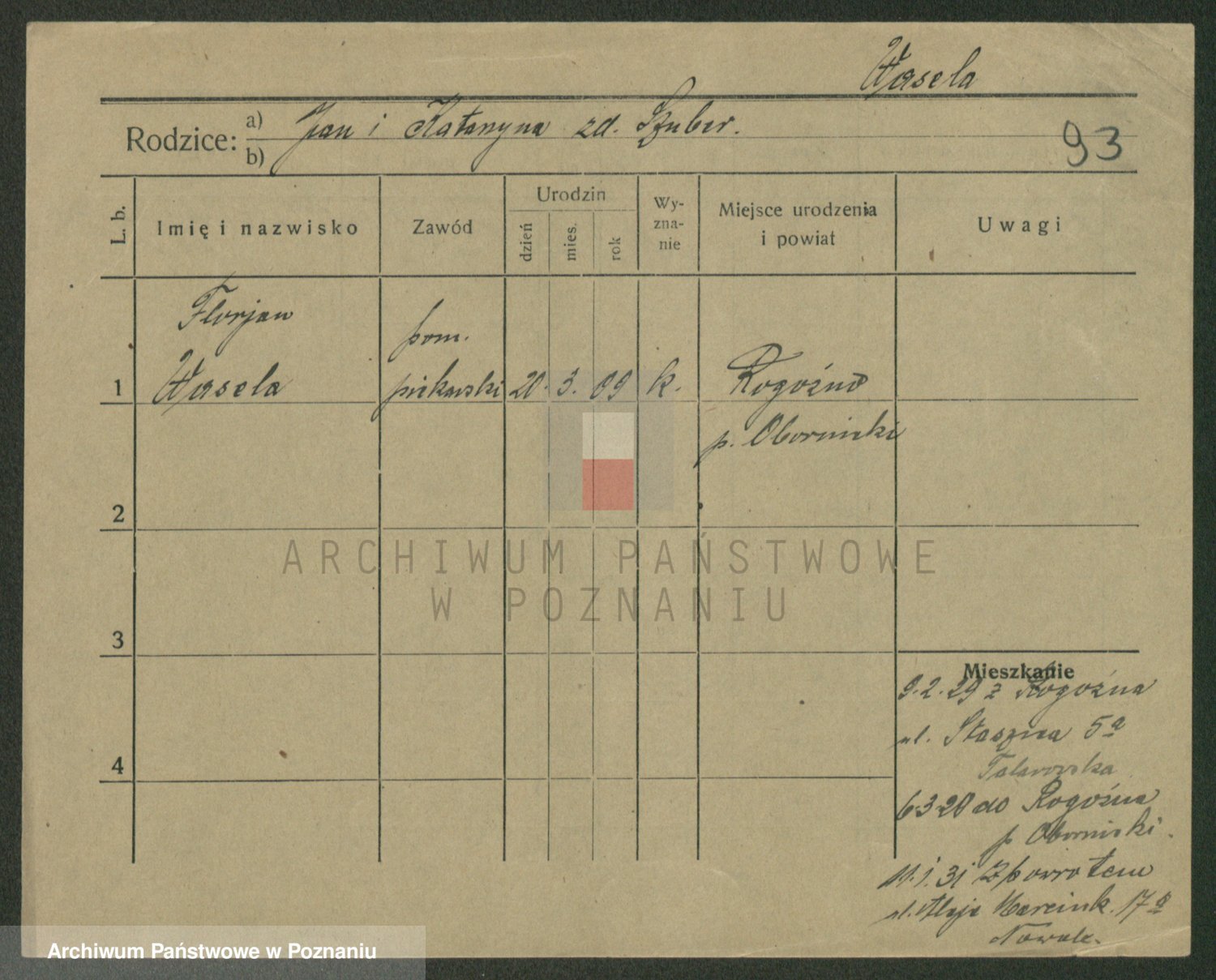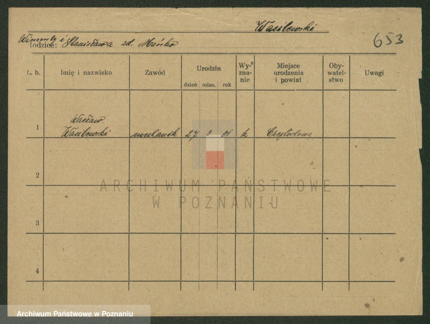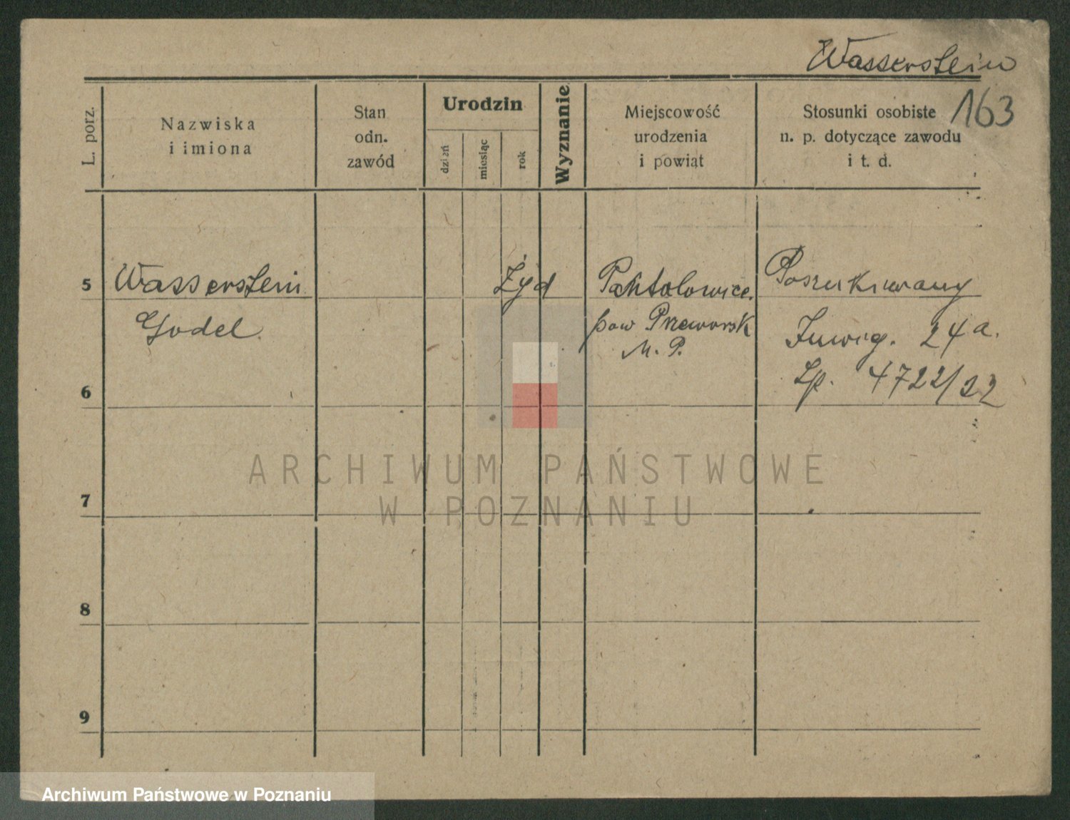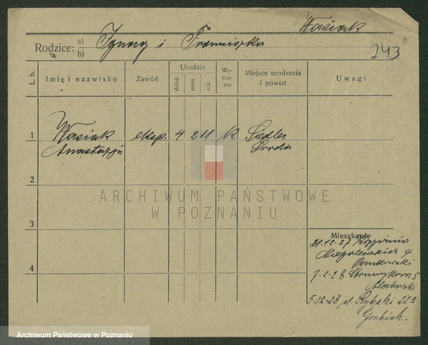 Podgląd karty osobowej dostępny jest po kliknięciu na nazwisko lub ikonkę karty. Można dokonywać powiększenia (ikony na górze) lub przechodzić między kolejnymi skanami (strzałki po bokach).