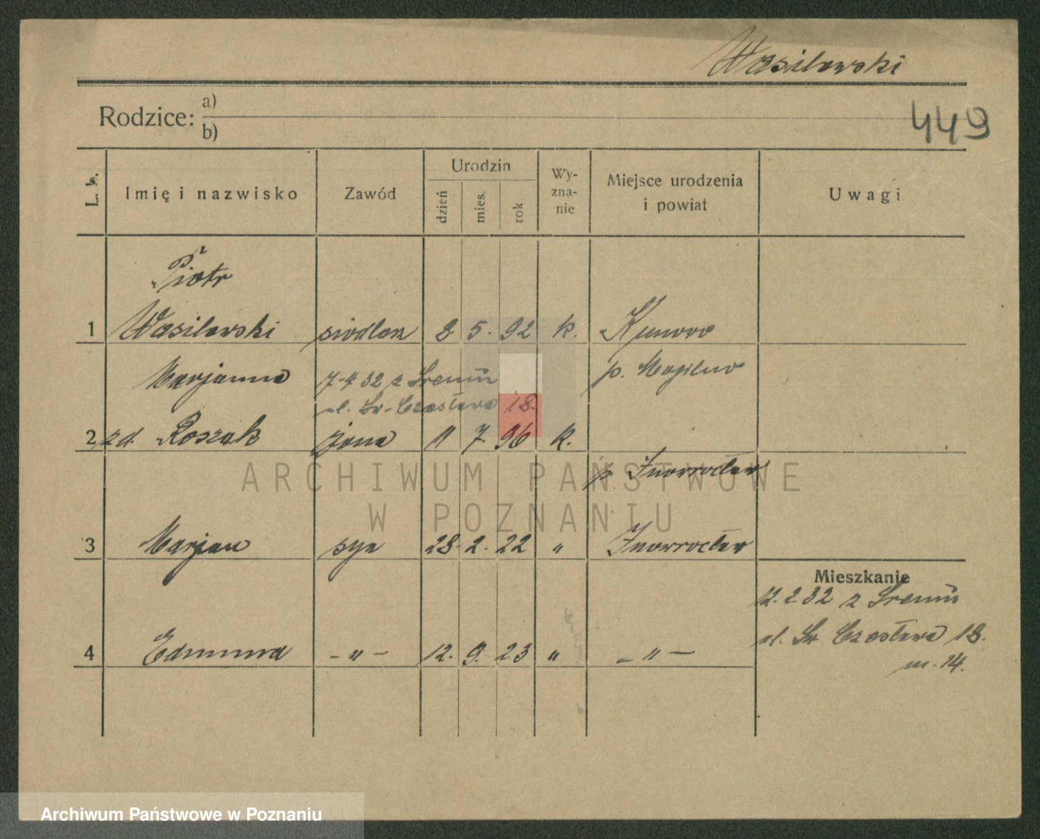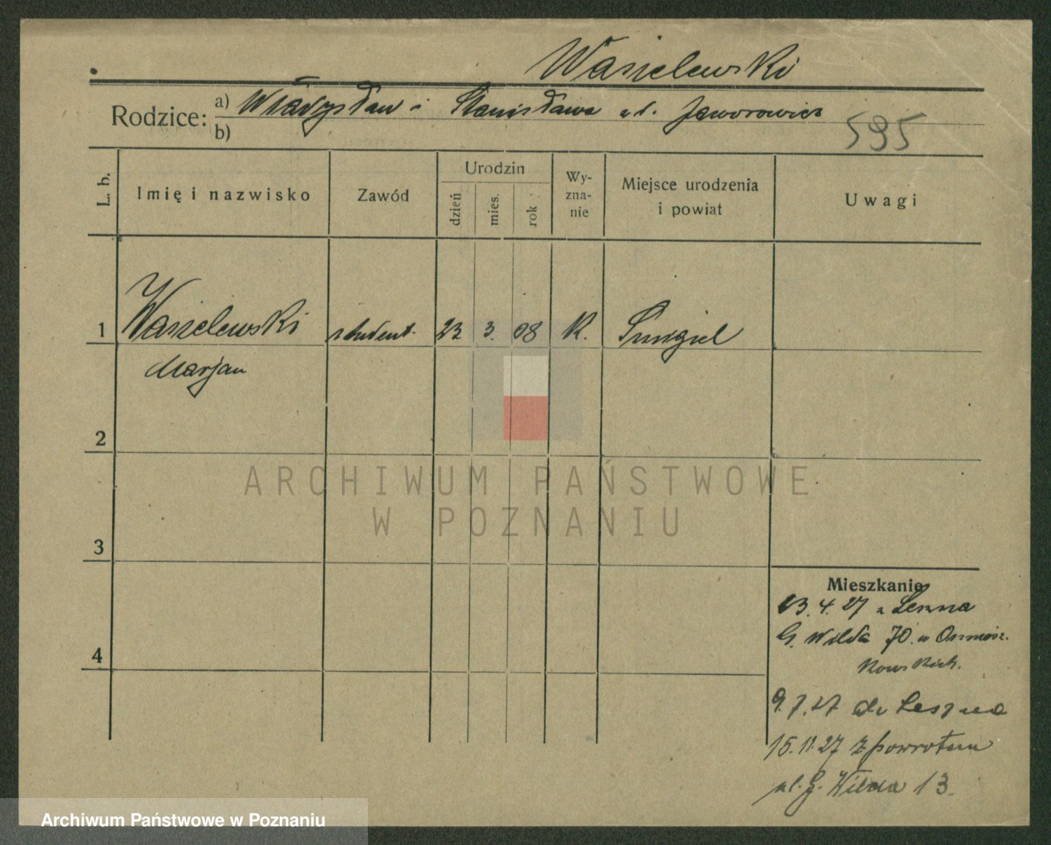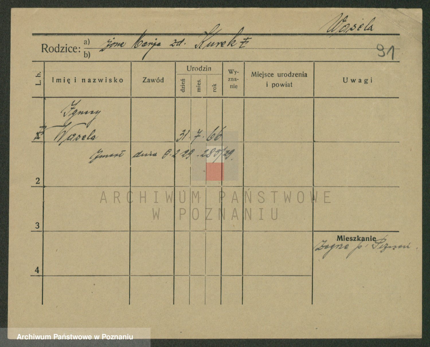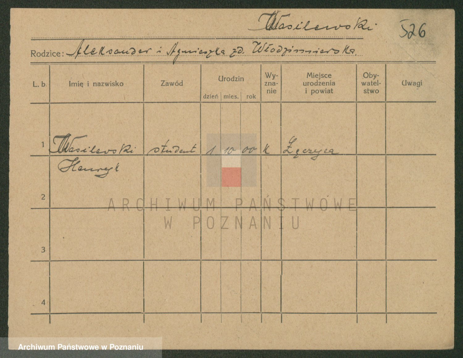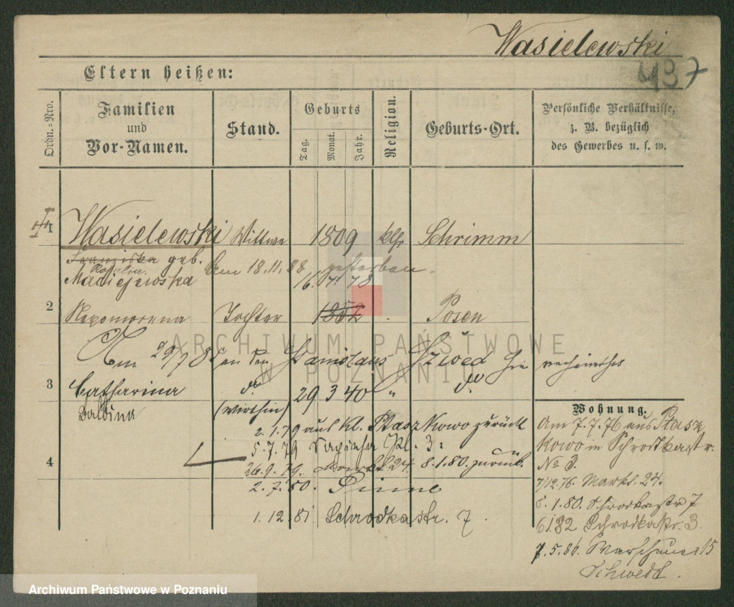 Podgląd karty osobowej dostępny jest po kliknięciu na nazwisko lub ikonkę karty. Można dokonywać powiększenia (ikony na górze) lub przechodzić między kolejnymi skanami (strzałki po bokach).
