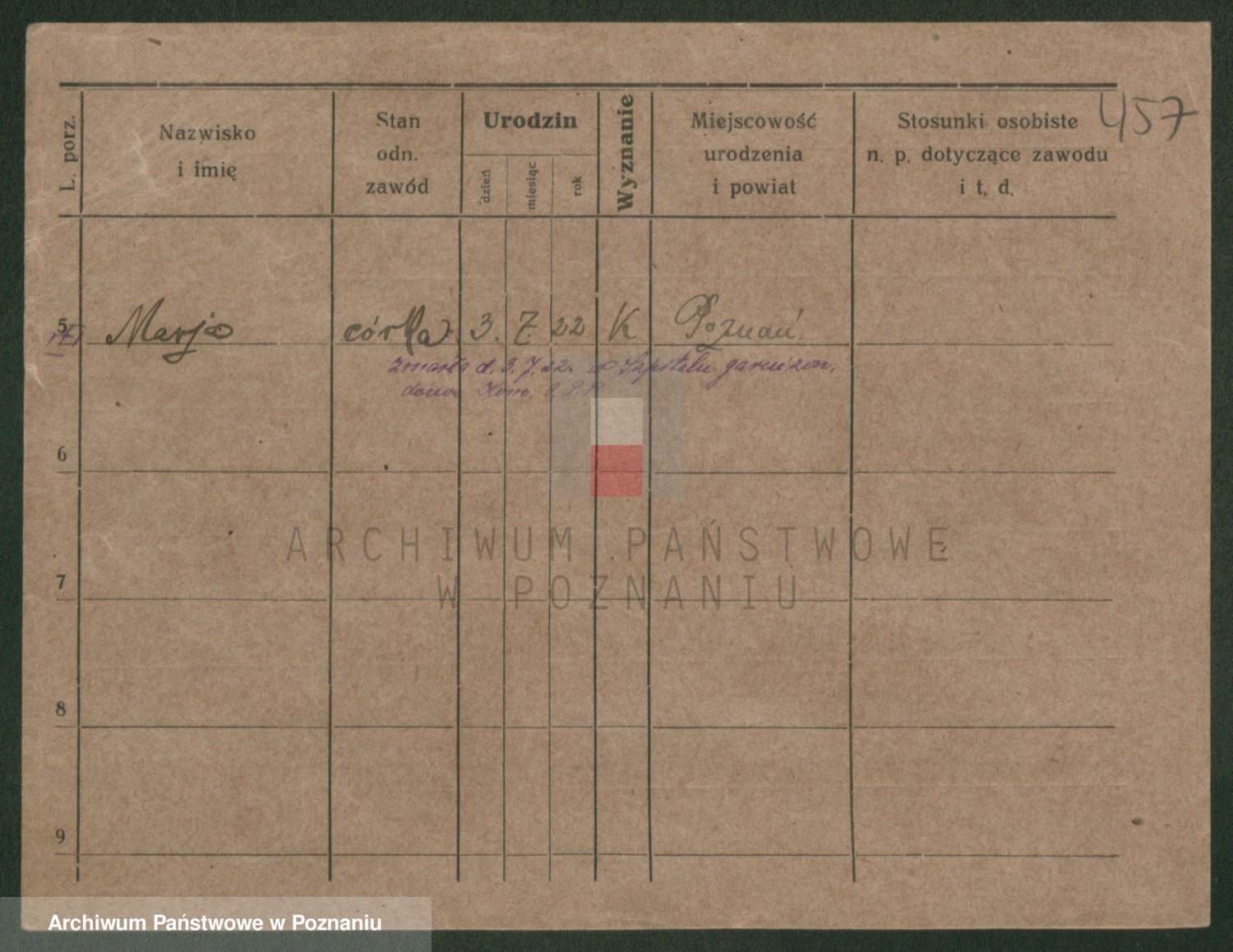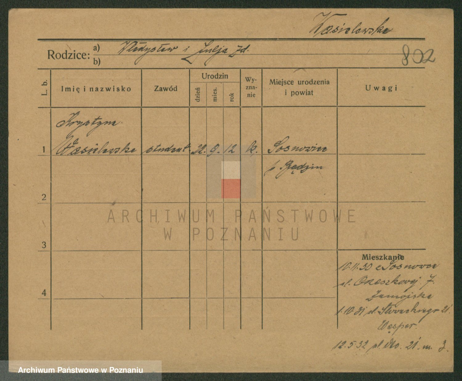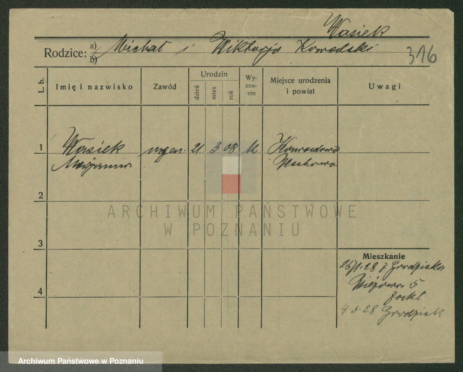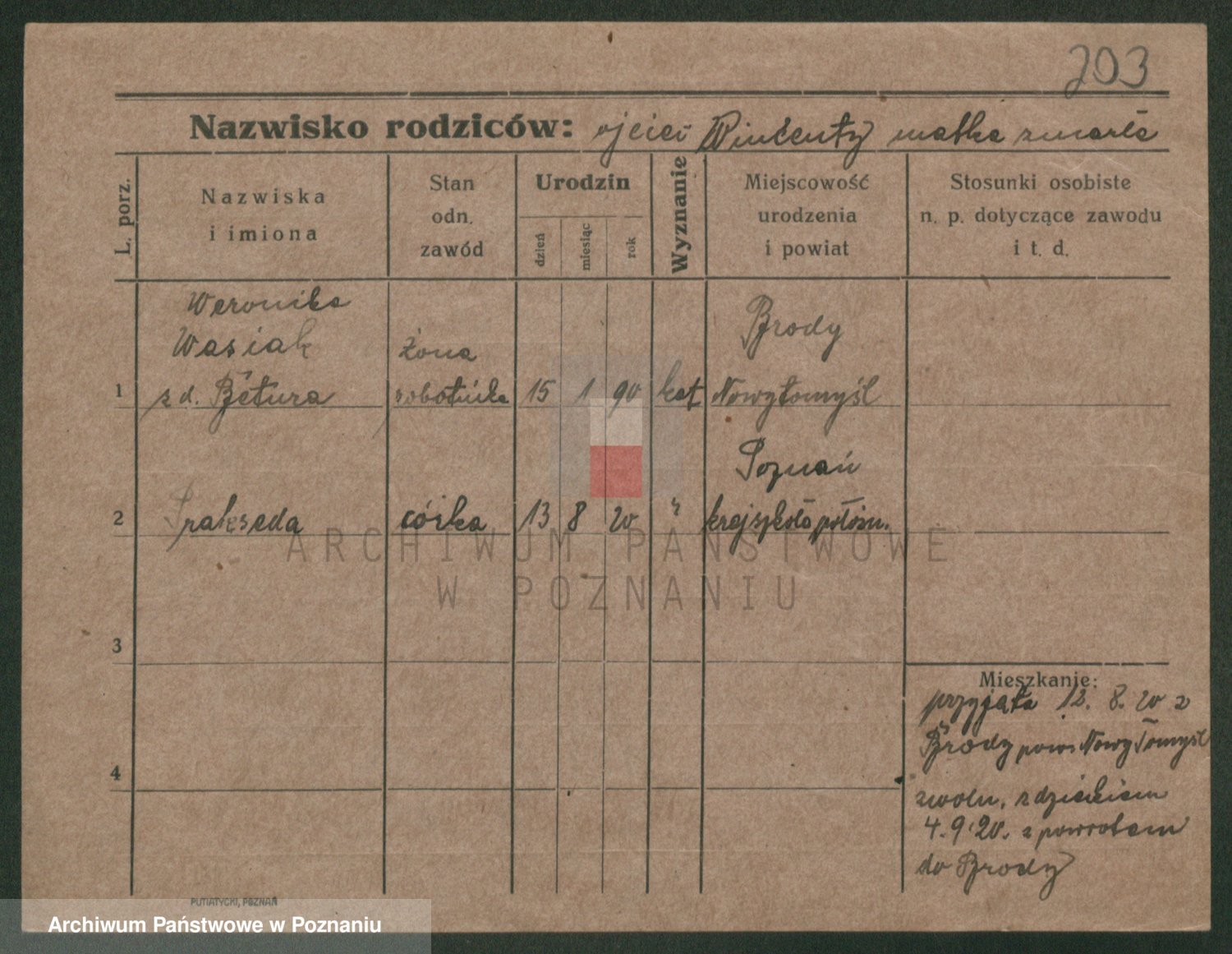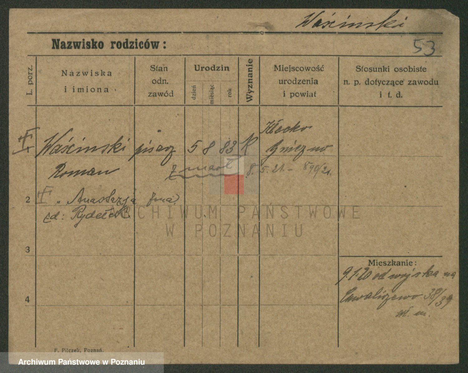 Podgląd karty osobowej dostępny jest po kliknięciu na nazwisko lub ikonkę karty. Można dokonywać powiększenia (ikony na górze) lub przechodzić między kolejnymi skanami (strzałki po bokach).