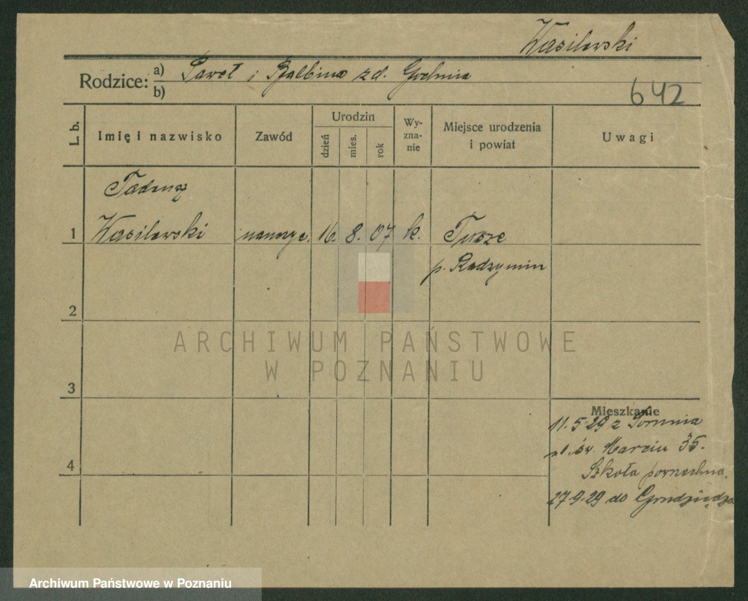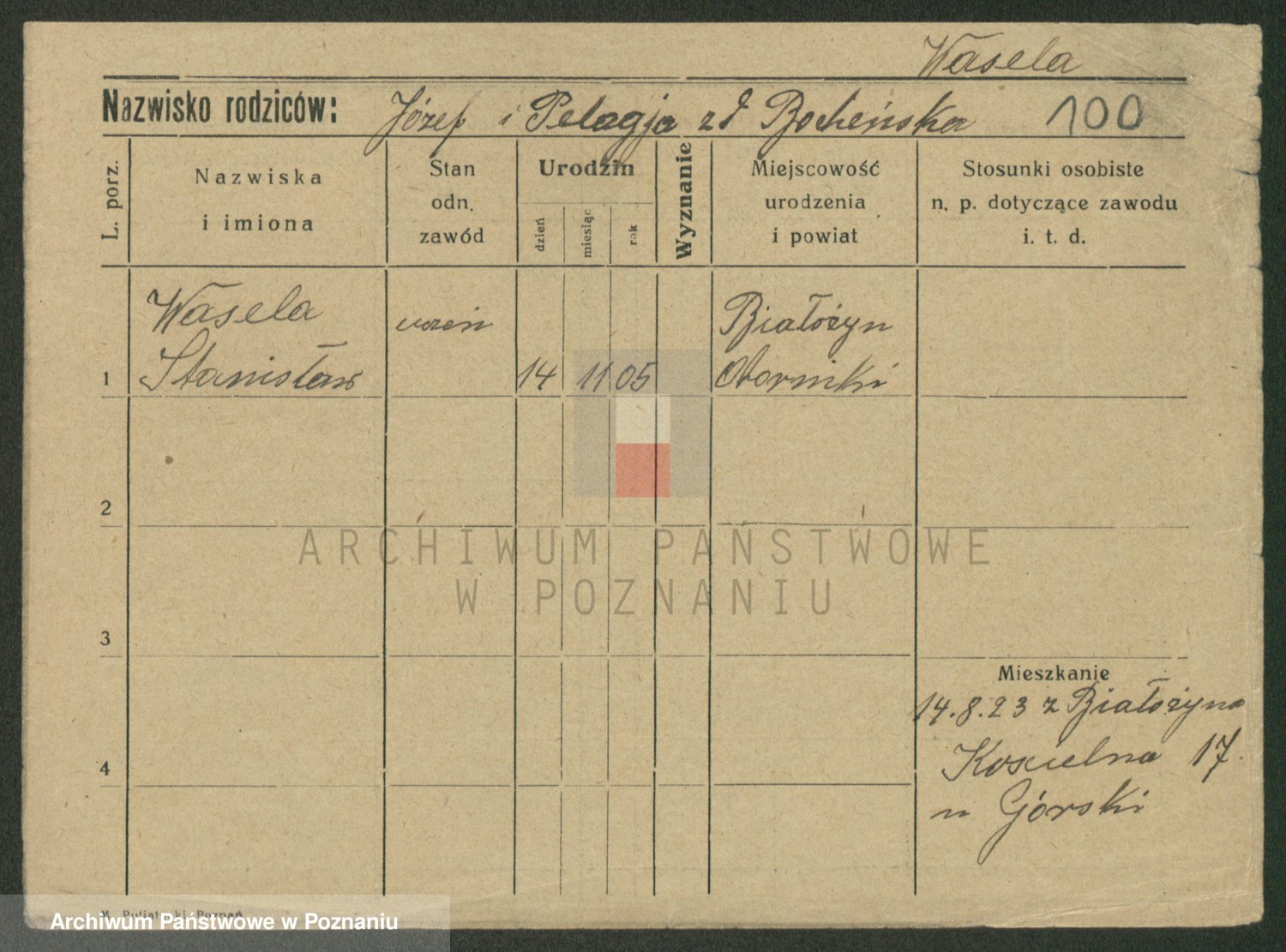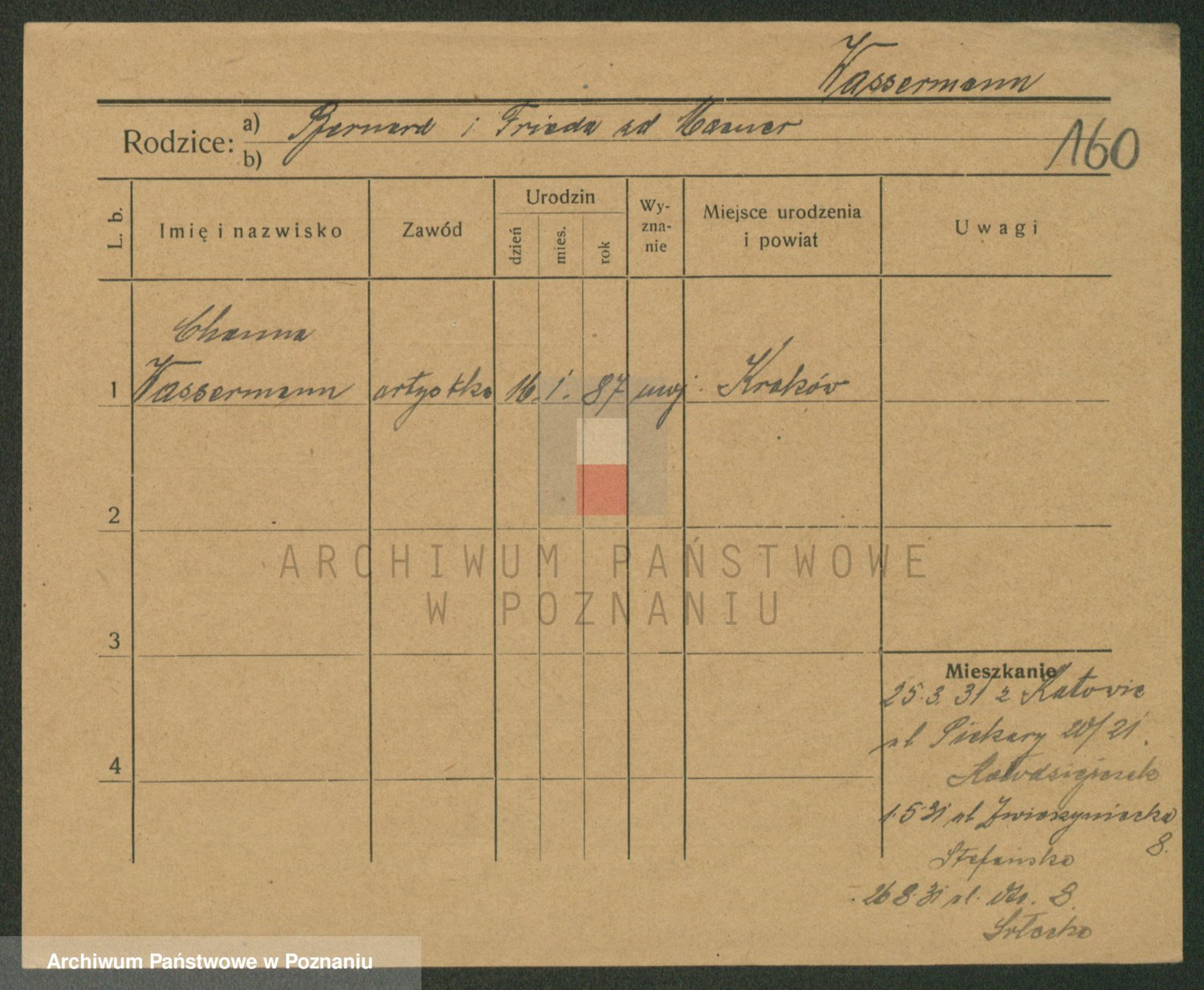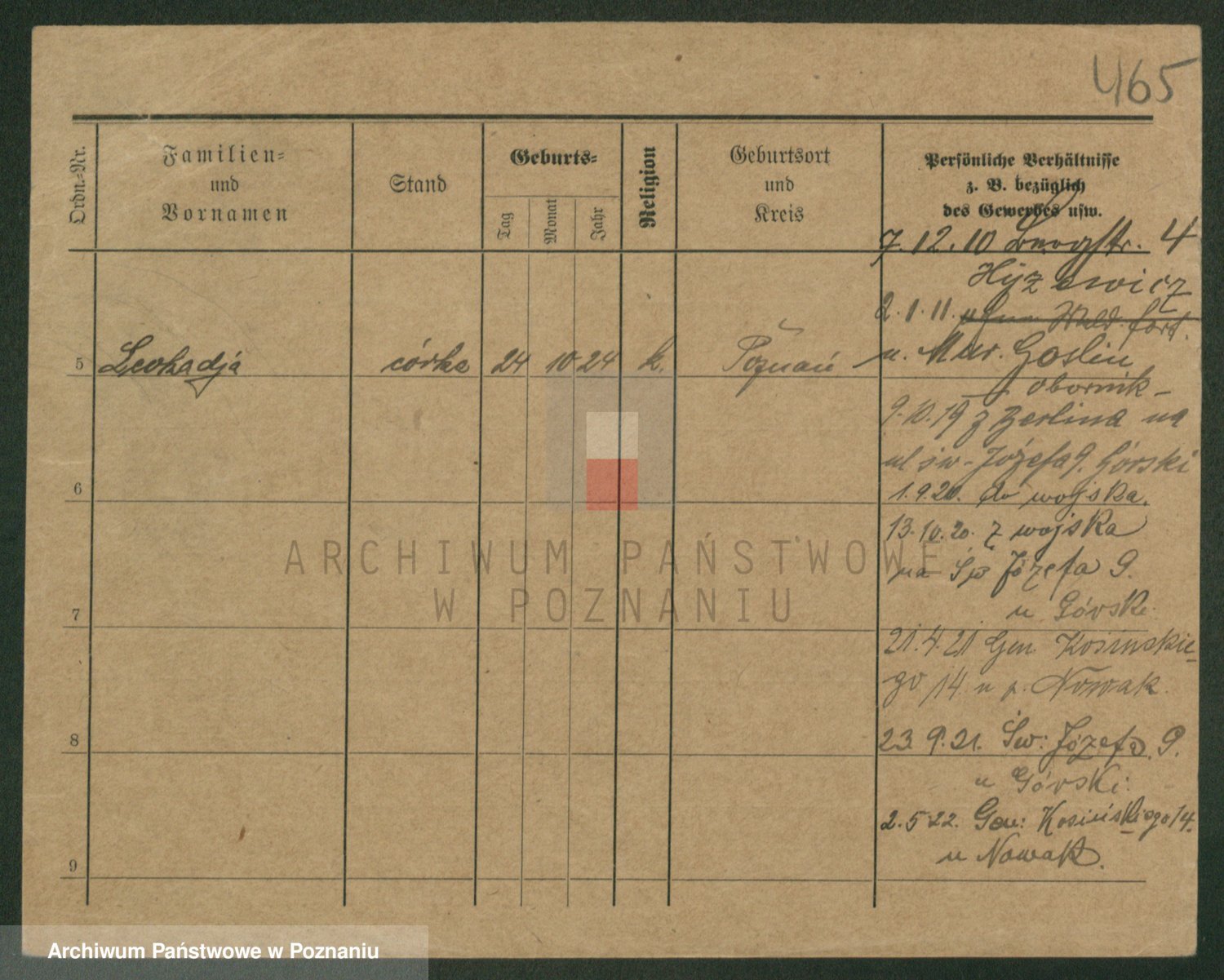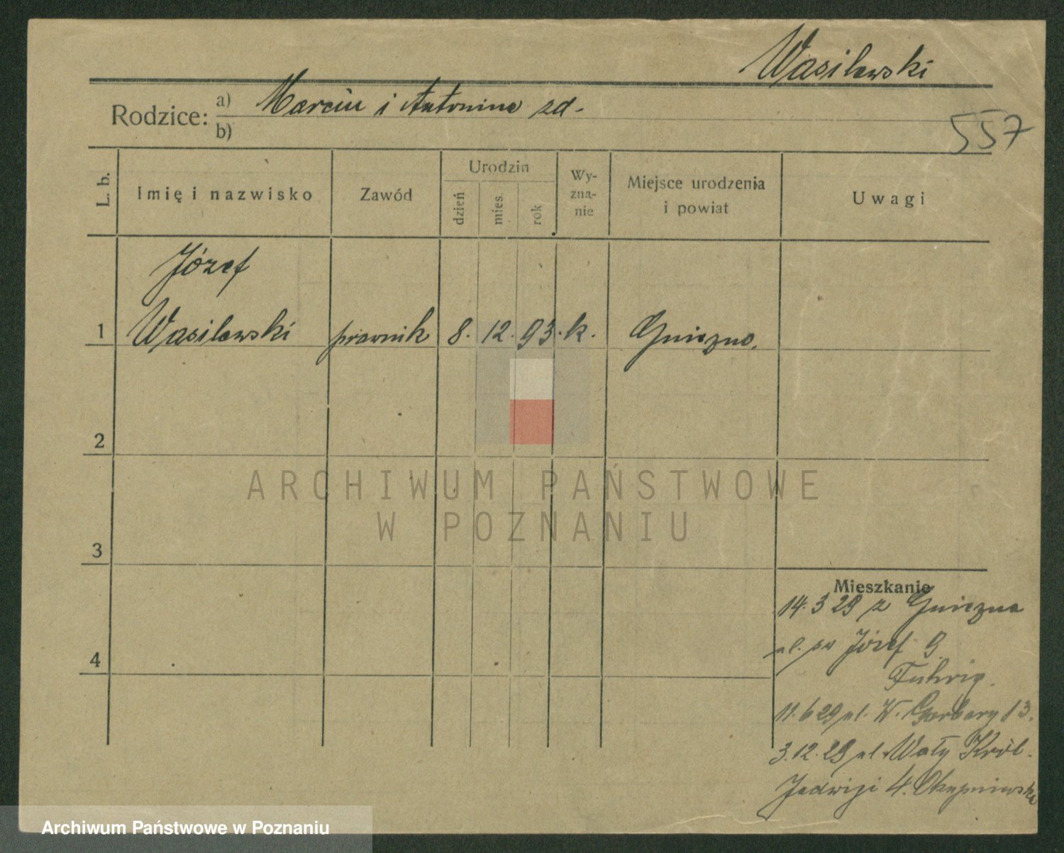 Podgląd karty osobowej dostępny jest po kliknięciu na nazwisko lub ikonkę karty. Można dokonywać powiększenia (ikony na górze) lub przechodzić między kolejnymi skanami (strzałki po bokach).
