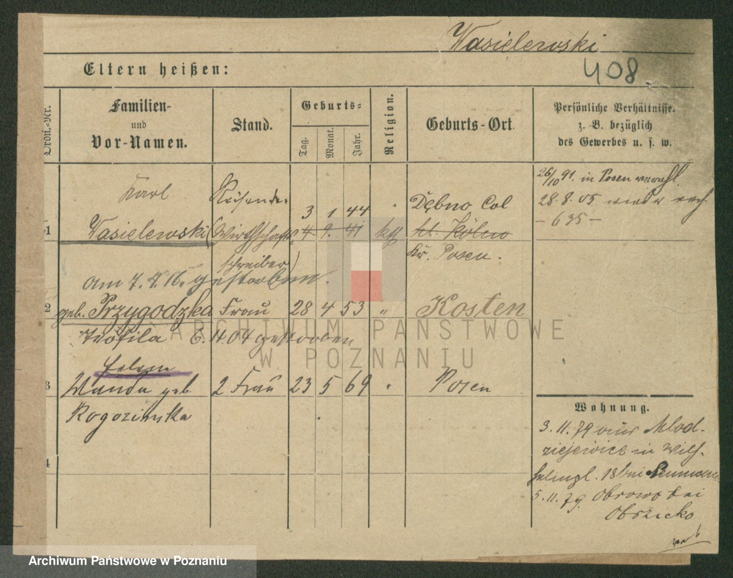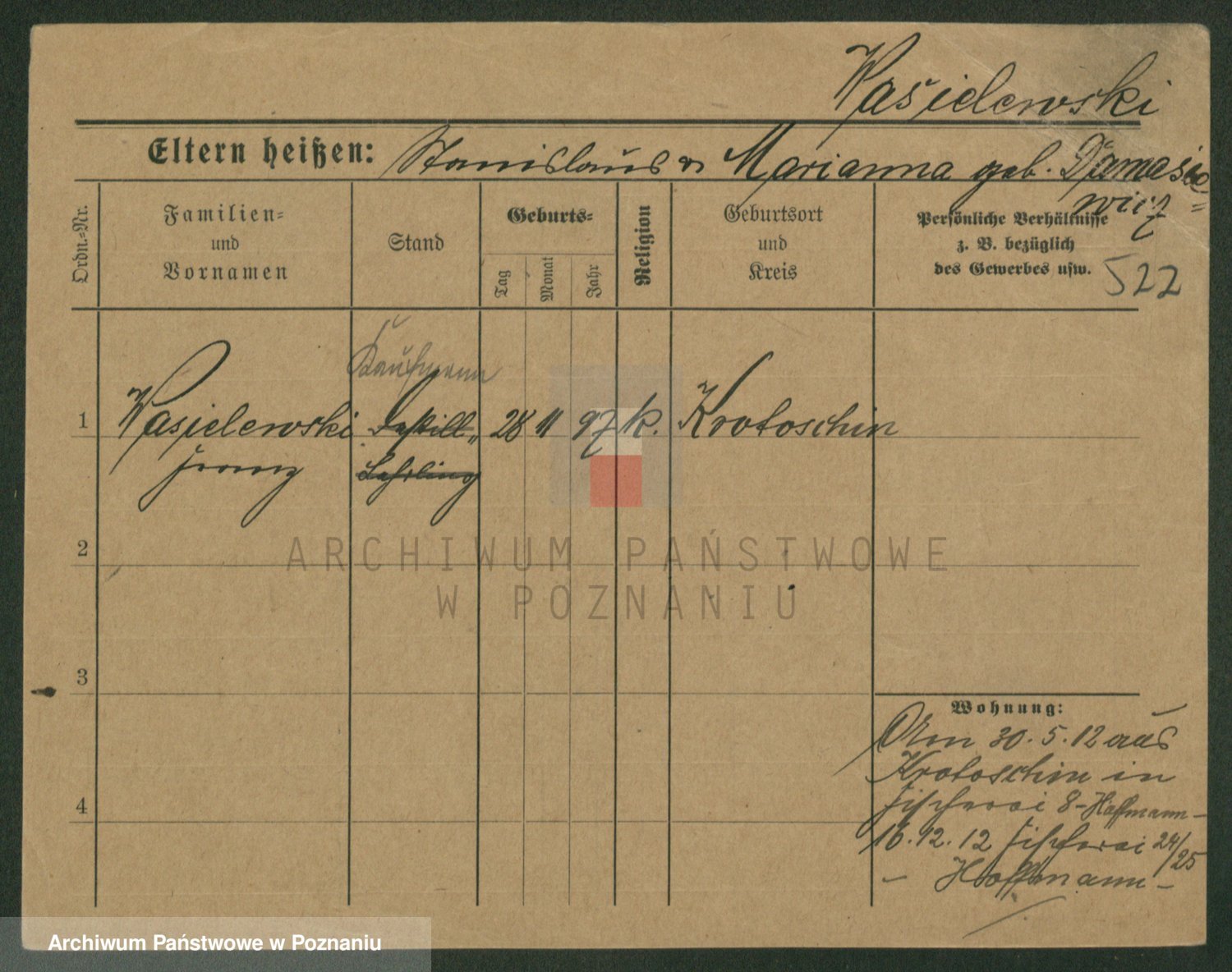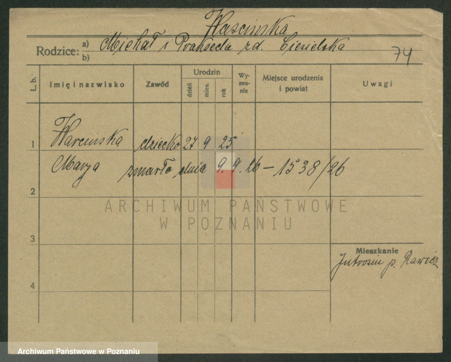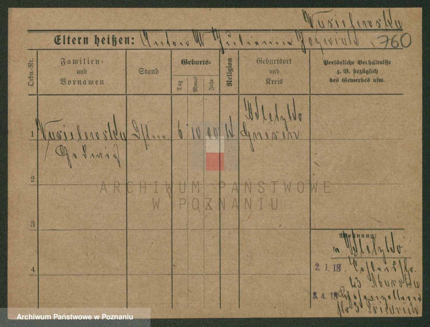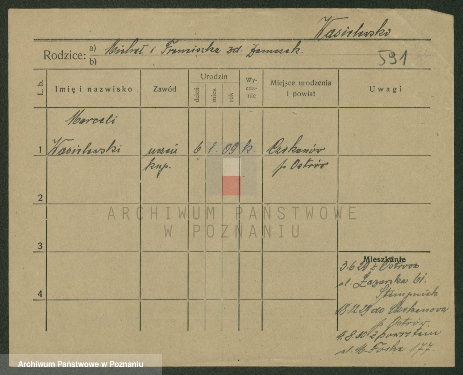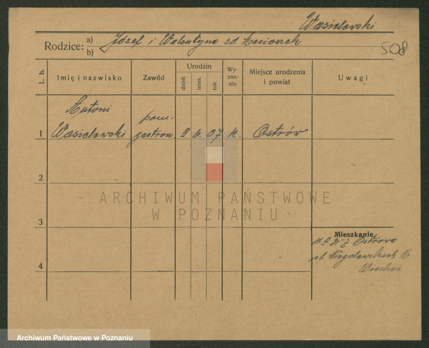 Podgląd karty osobowej dostępny jest po kliknięciu na nazwisko lub ikonkę karty. Można dokonywać powiększenia (ikony na górze) lub przechodzić między kolejnymi skanami (strzałki po bokach).