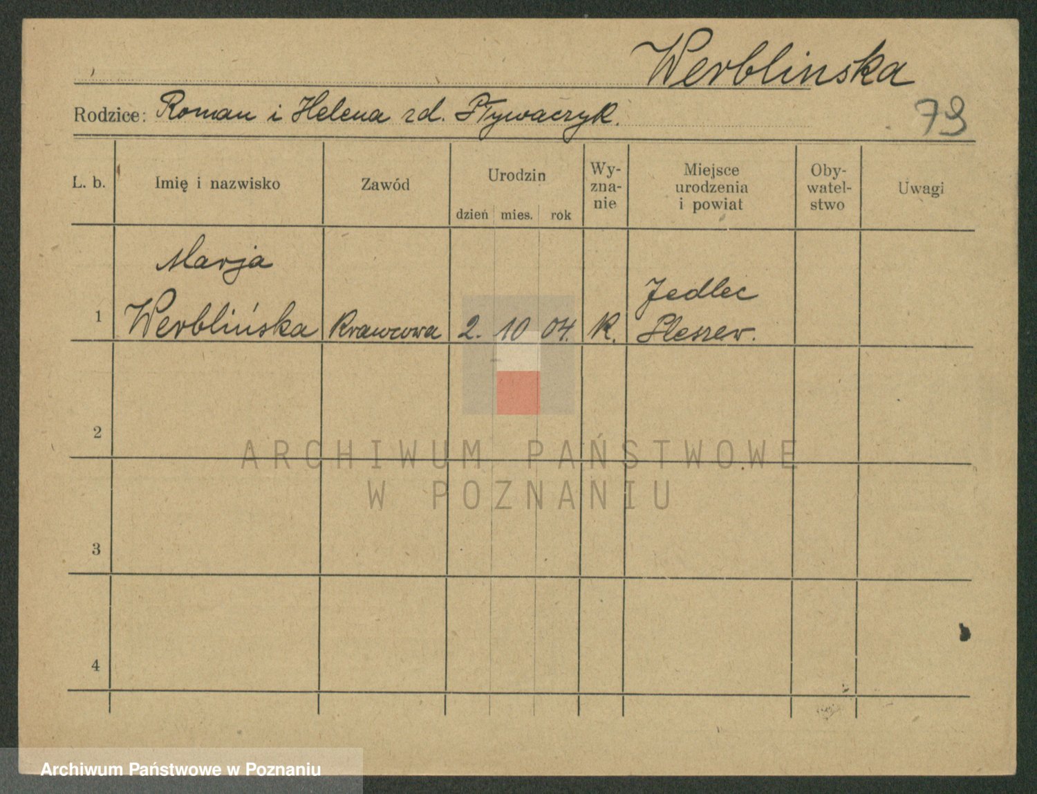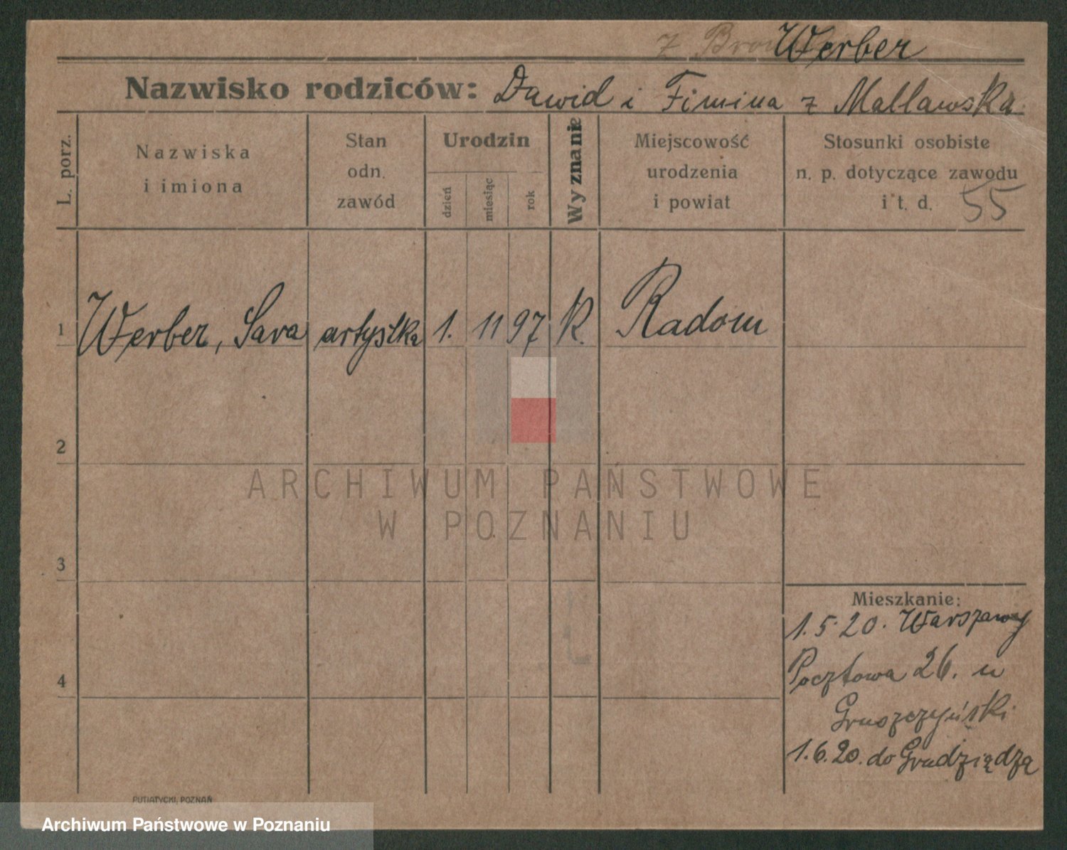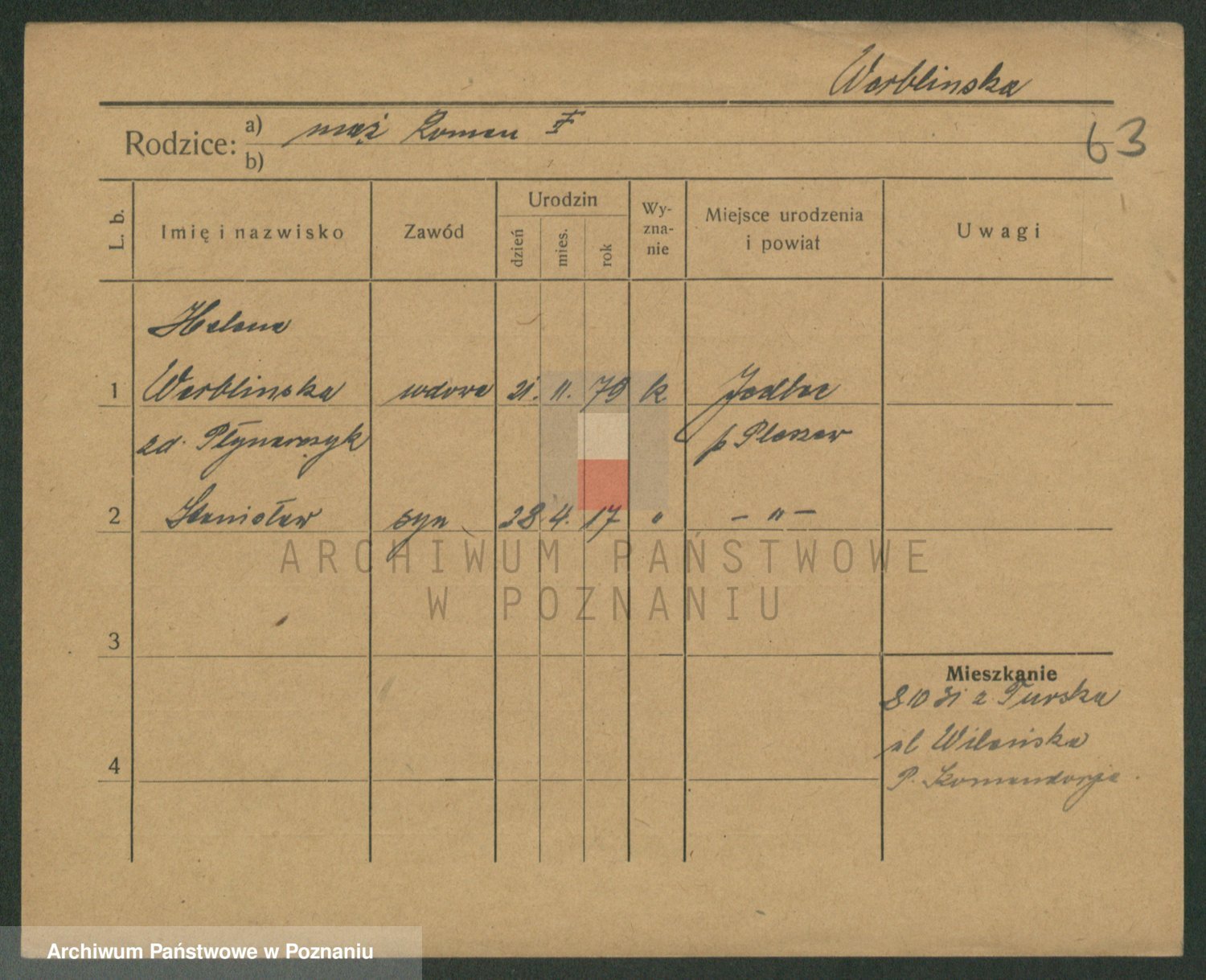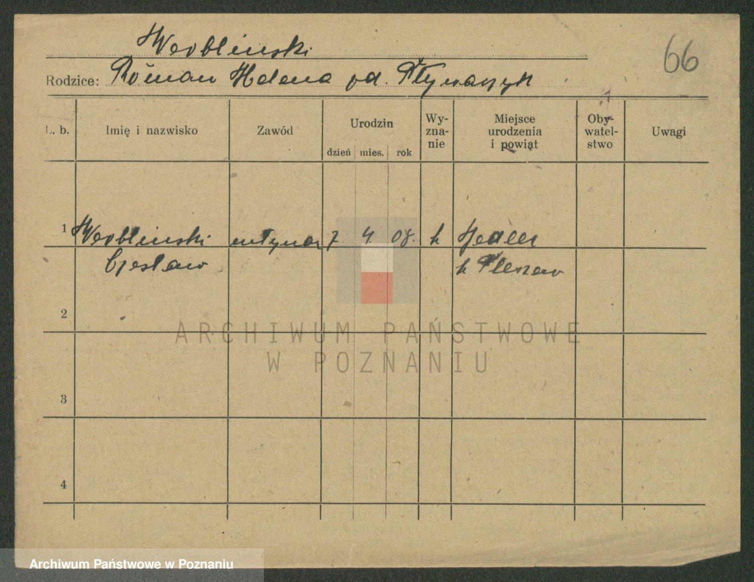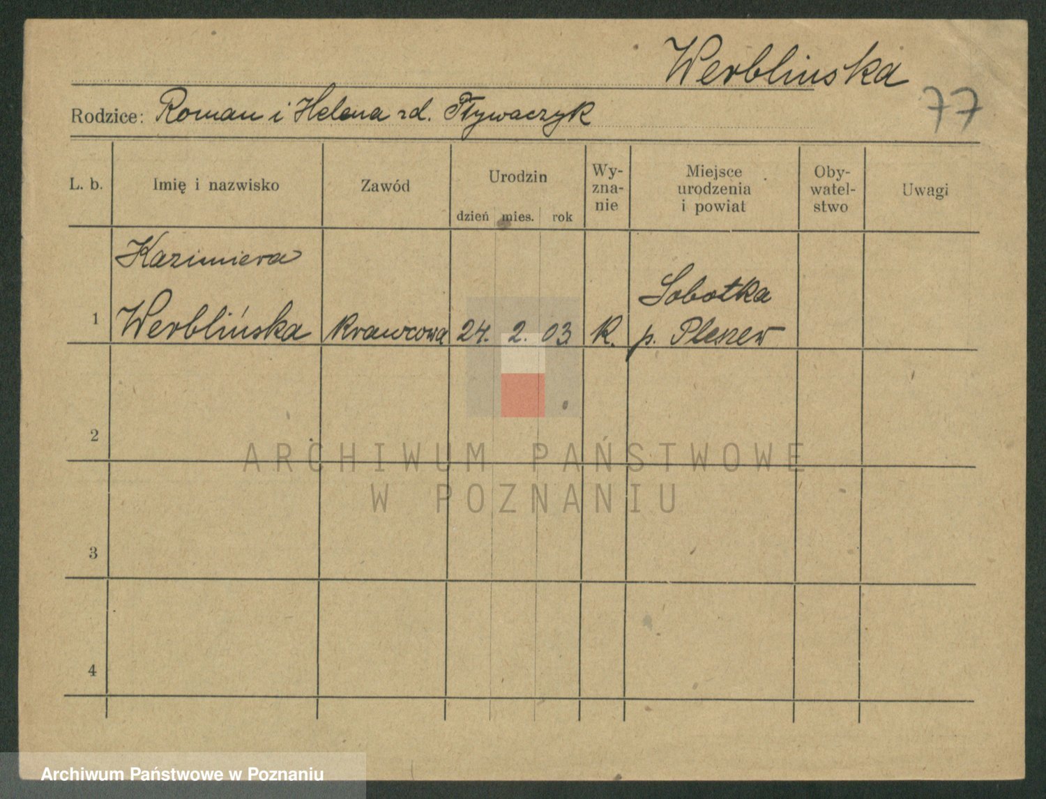 Podgląd karty osobowej dostępny jest po kliknięciu na nazwisko lub ikonkę karty. Można dokonywać powiększenia (ikony na górze) lub przechodzić między kolejnymi skanami (strzałki po bokach).