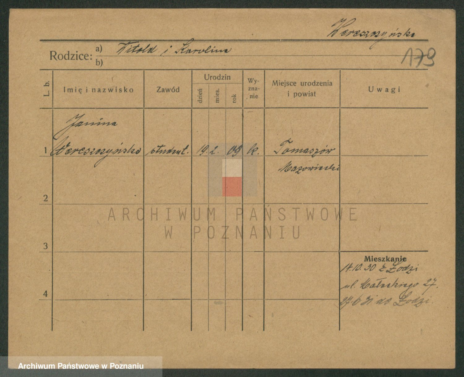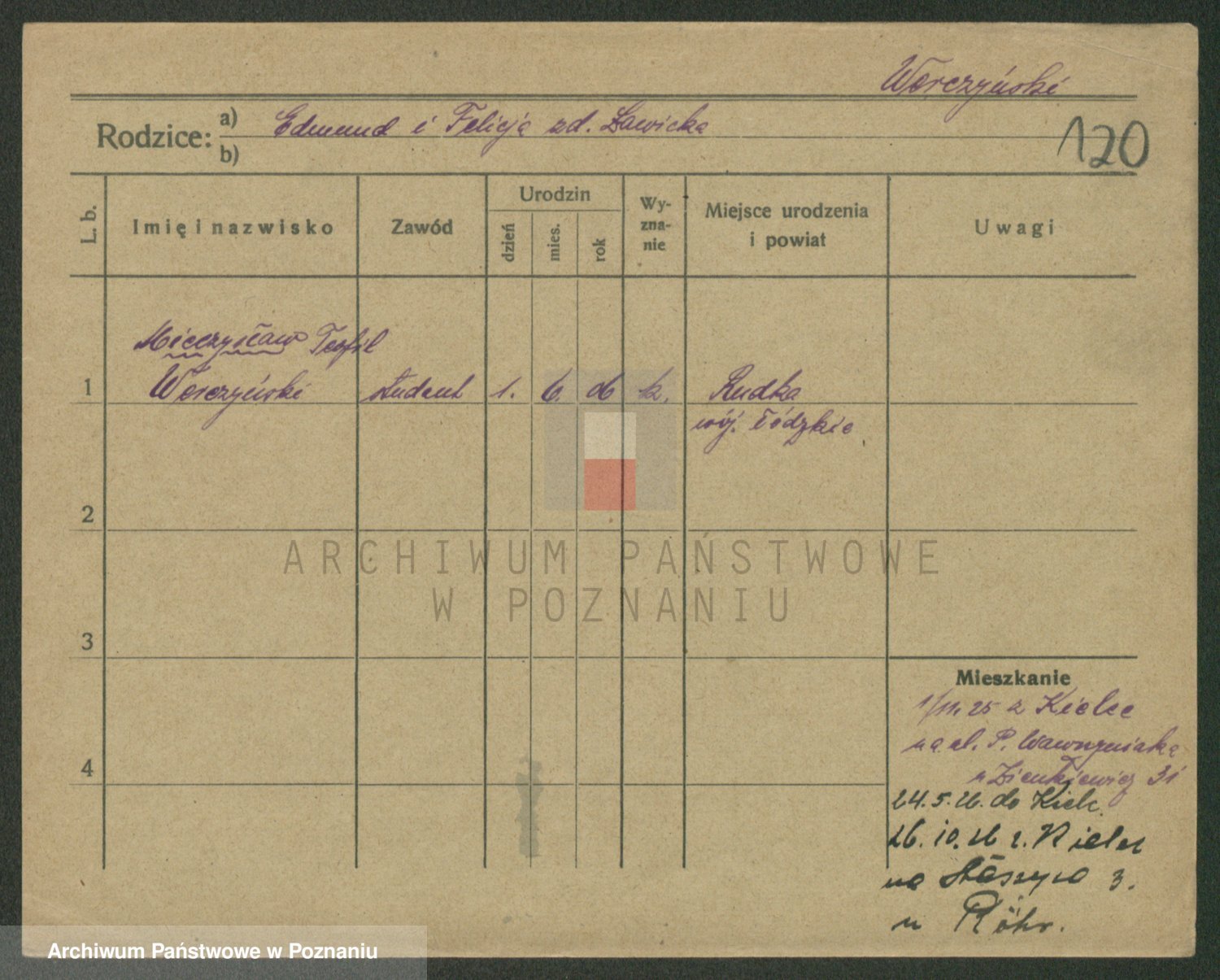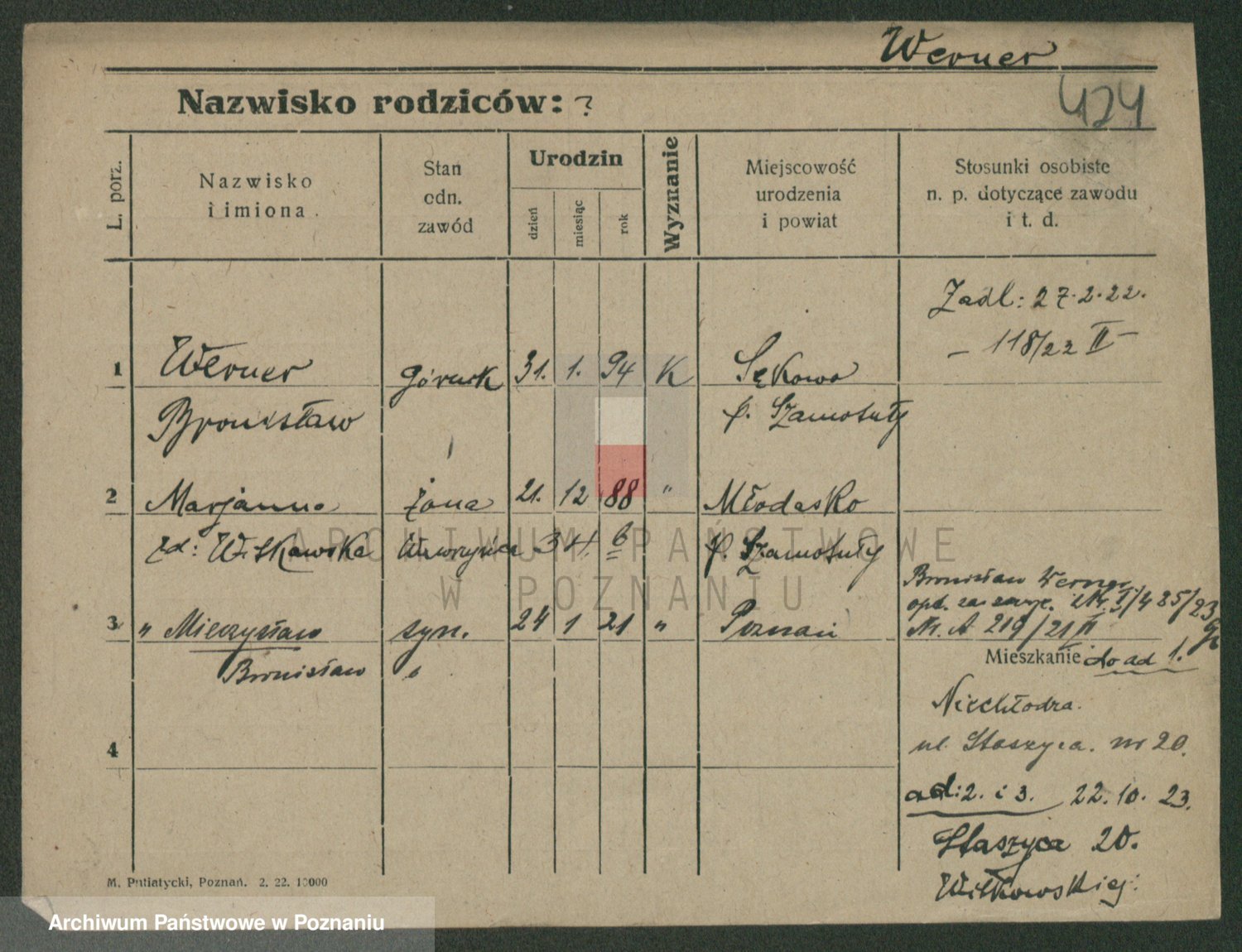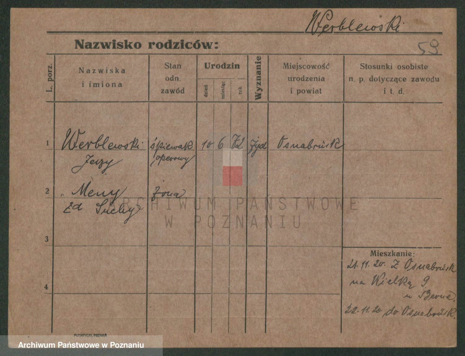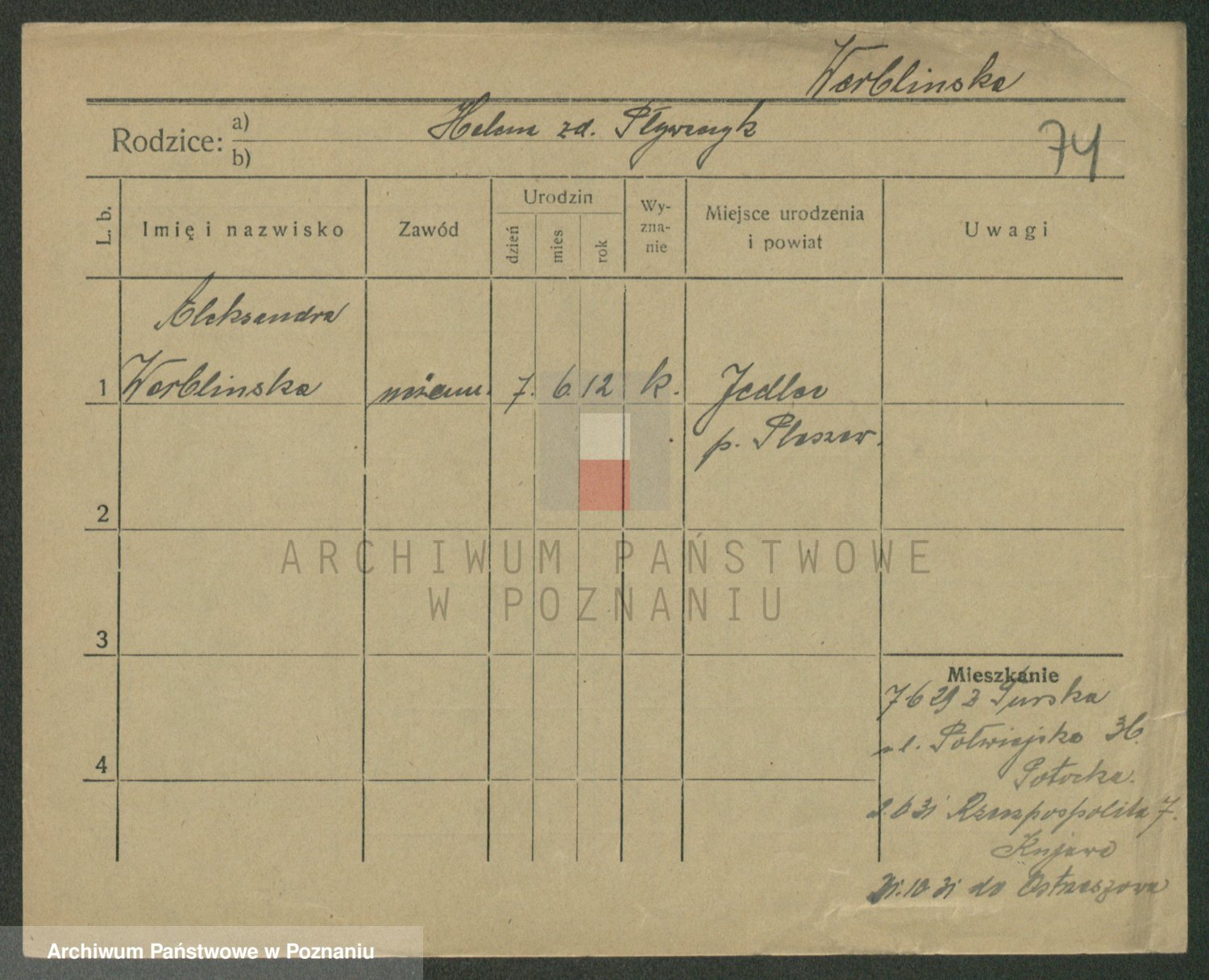 Podgląd karty osobowej dostępny jest po kliknięciu na nazwisko lub ikonkę karty. Można dokonywać powiększenia (ikony na górze) lub przechodzić między kolejnymi skanami (strzałki po bokach).