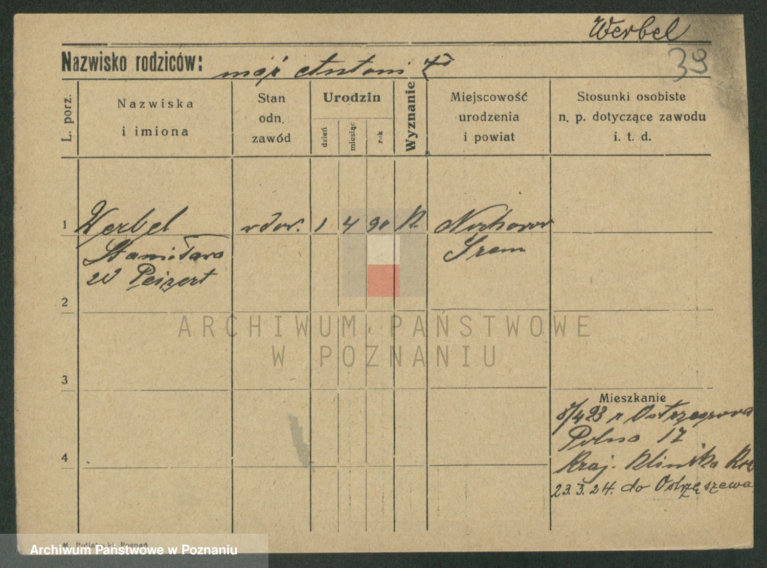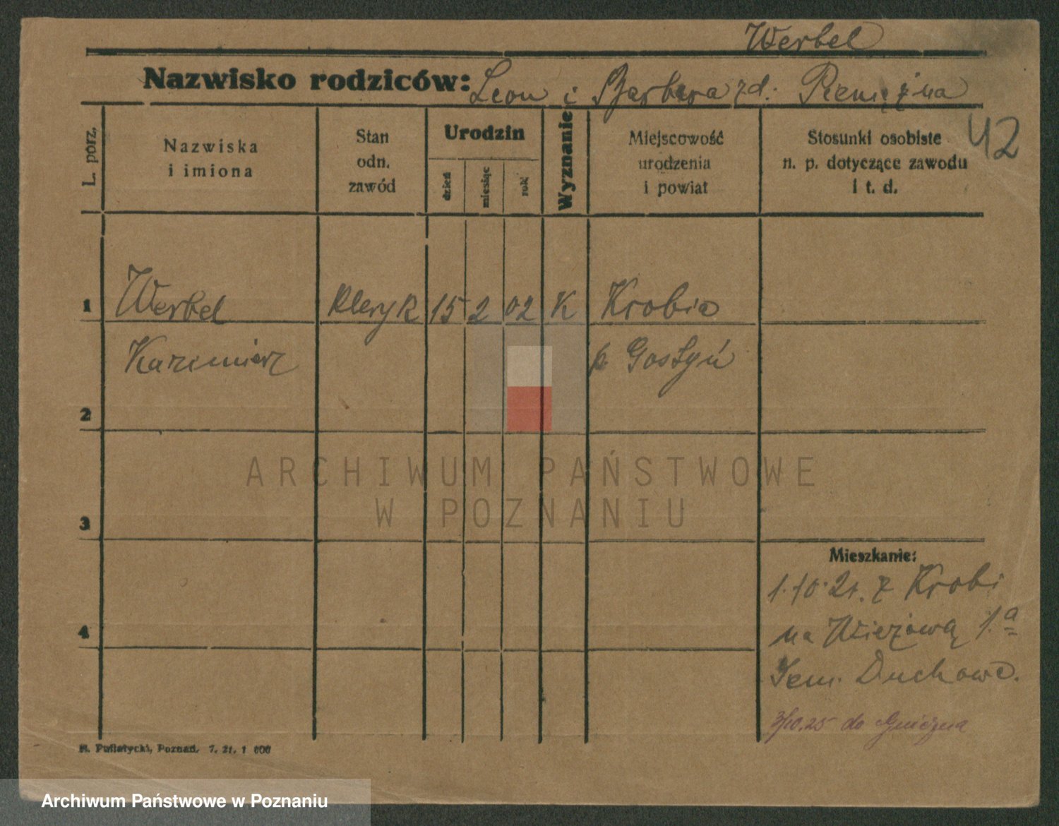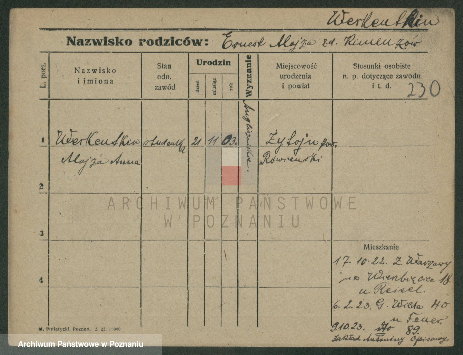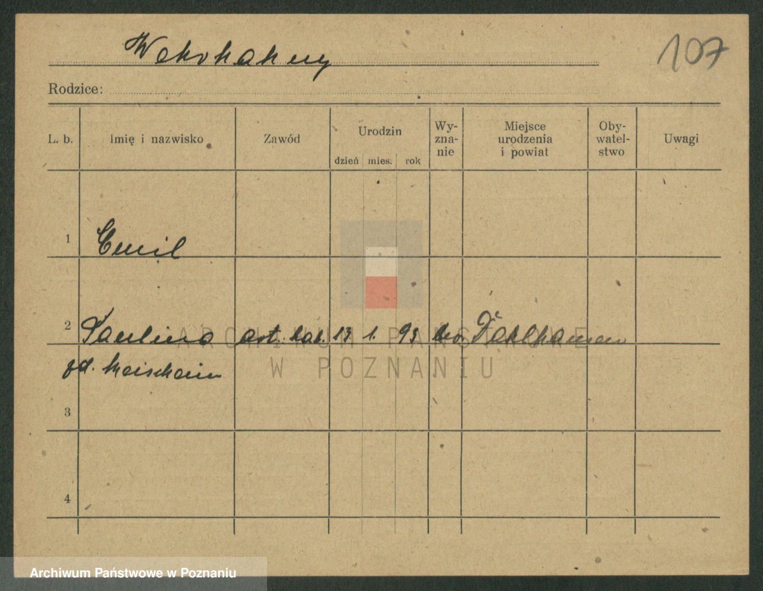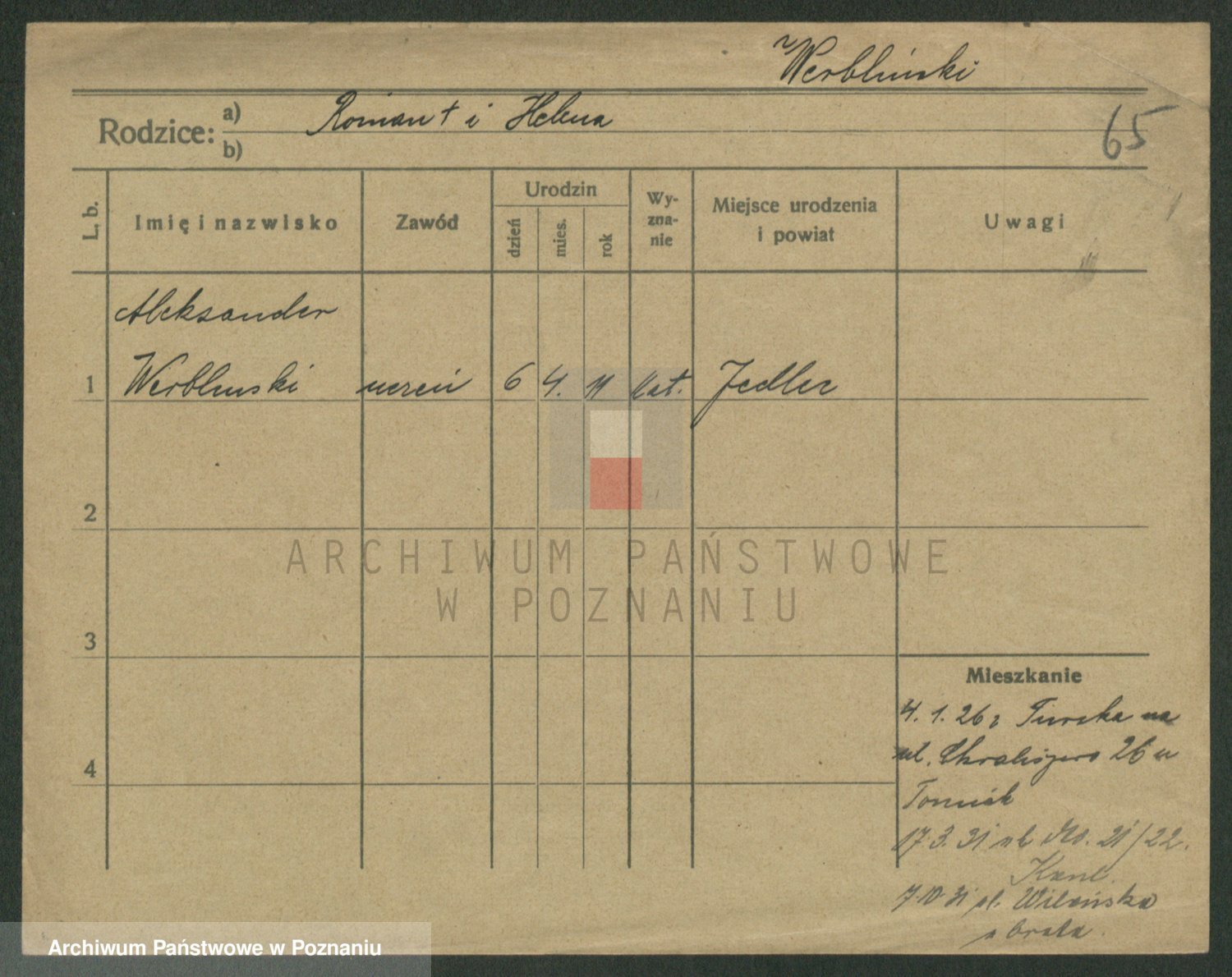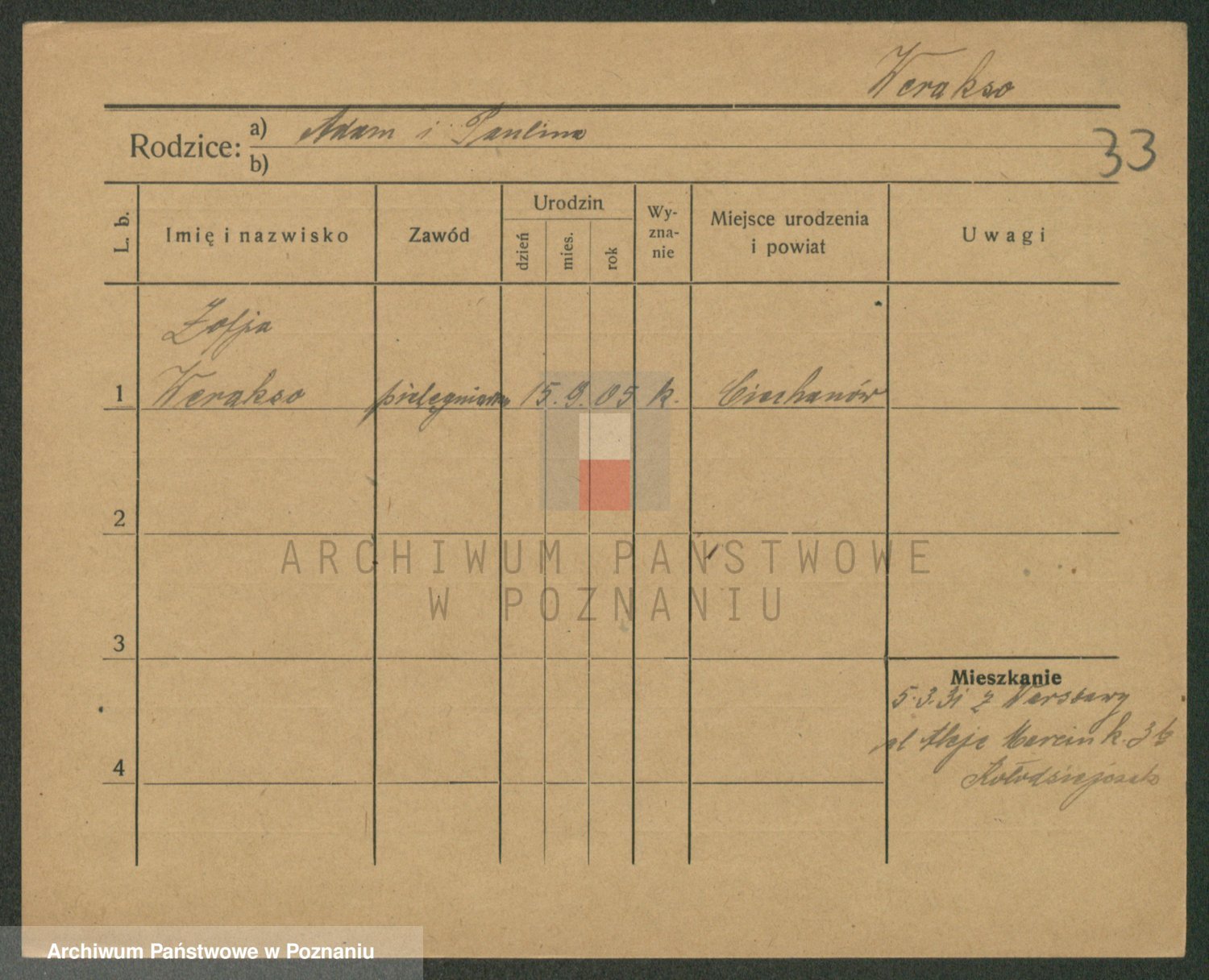 Podgląd karty osobowej dostępny jest po kliknięciu na nazwisko lub ikonkę karty. Można dokonywać powiększenia (ikony na górze) lub przechodzić między kolejnymi skanami (strzałki po bokach).