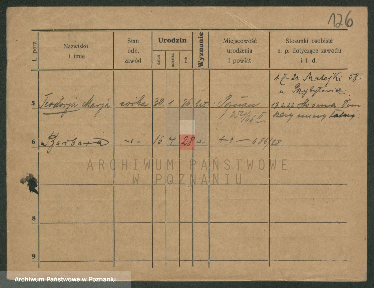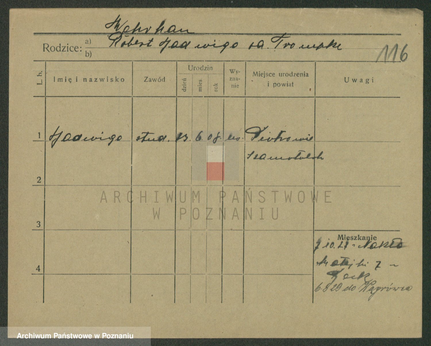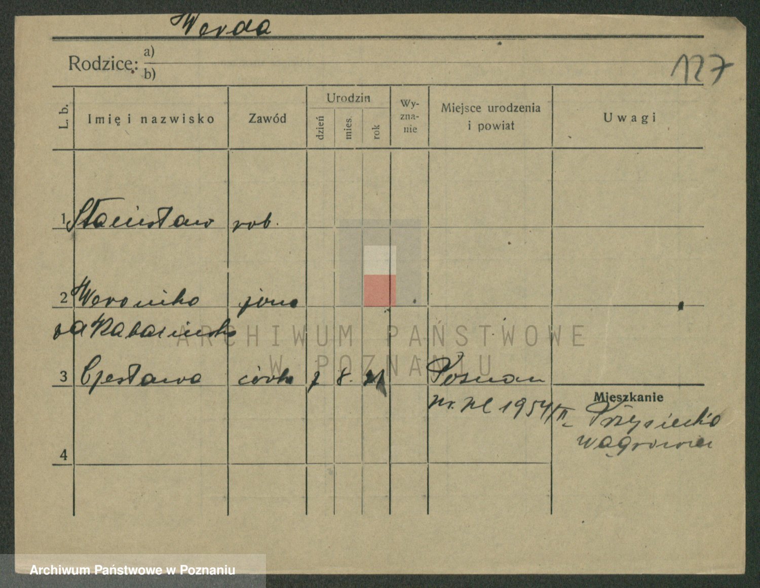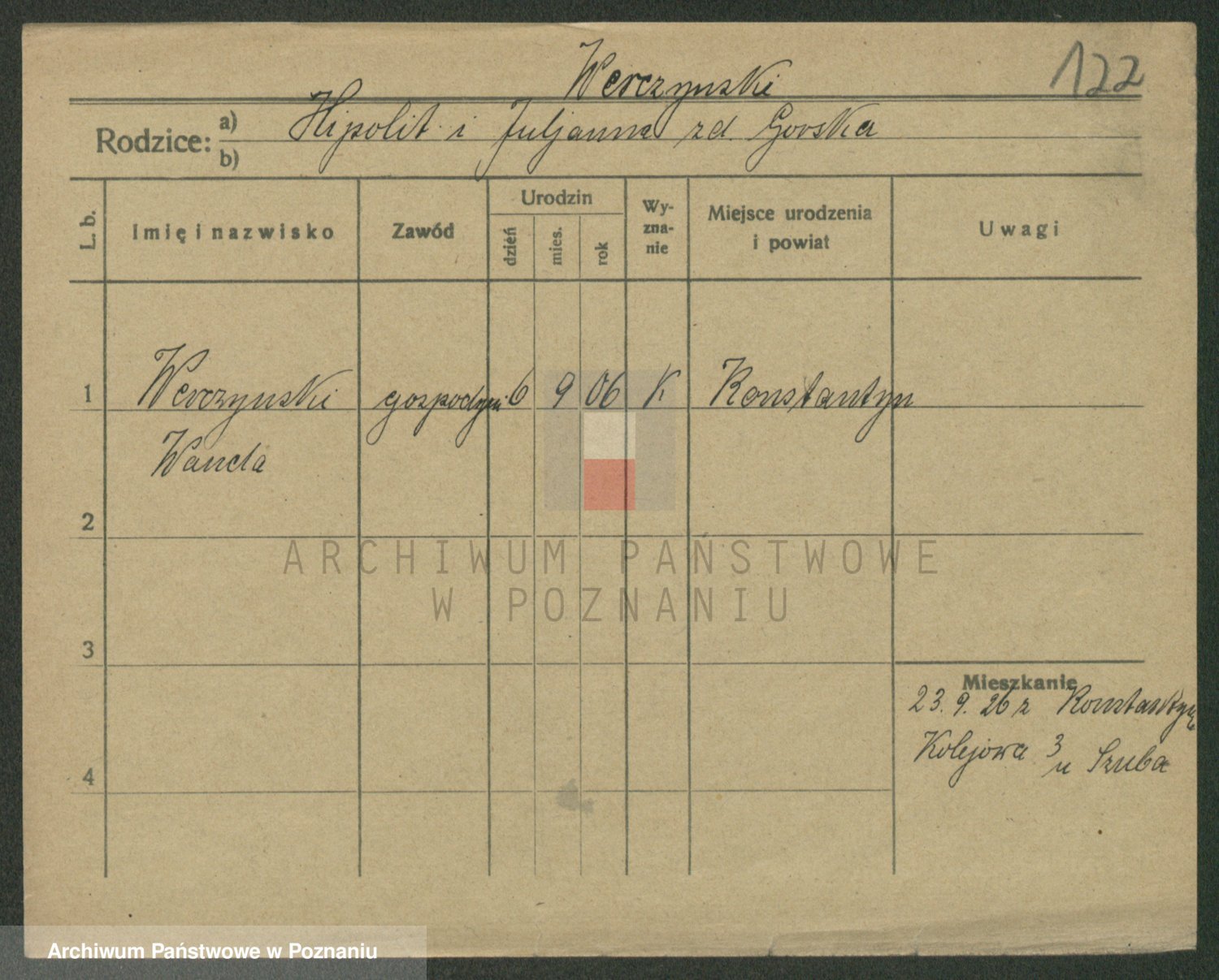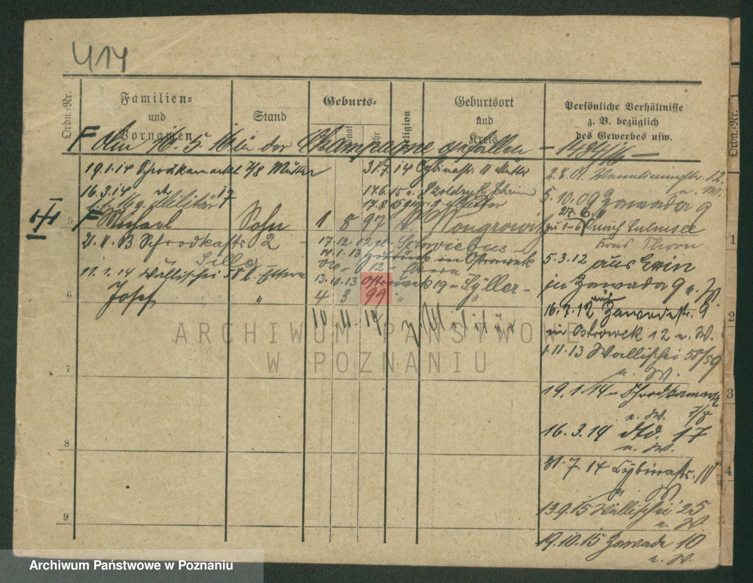 Podgląd karty osobowej dostępny jest po kliknięciu na nazwisko lub ikonkę karty. Można dokonywać powiększenia (ikony na górze) lub przechodzić między kolejnymi skanami (strzałki po bokach).
