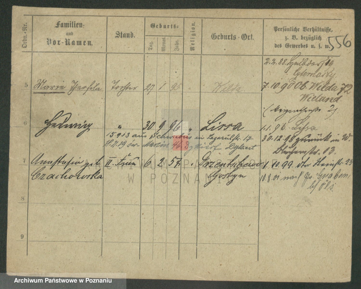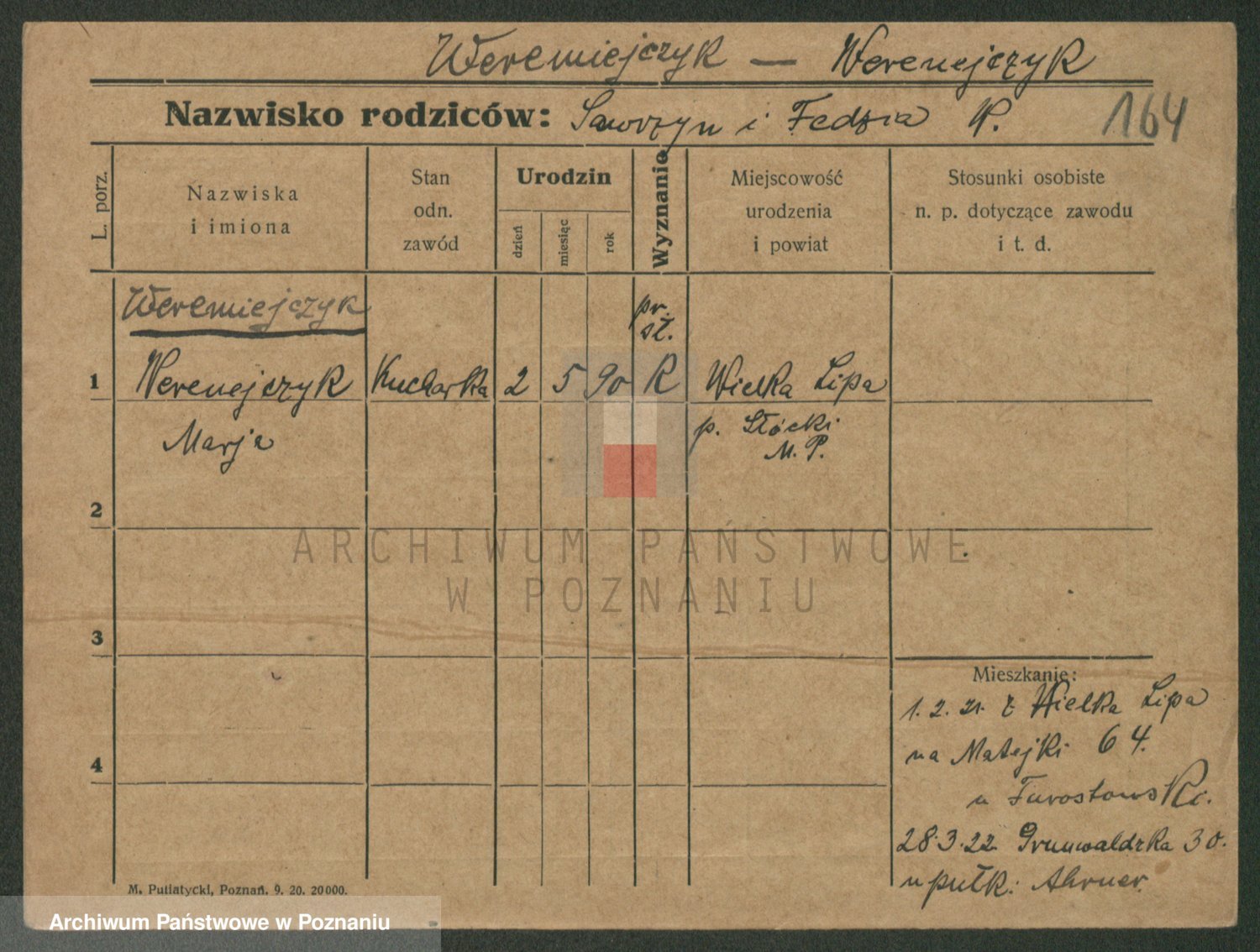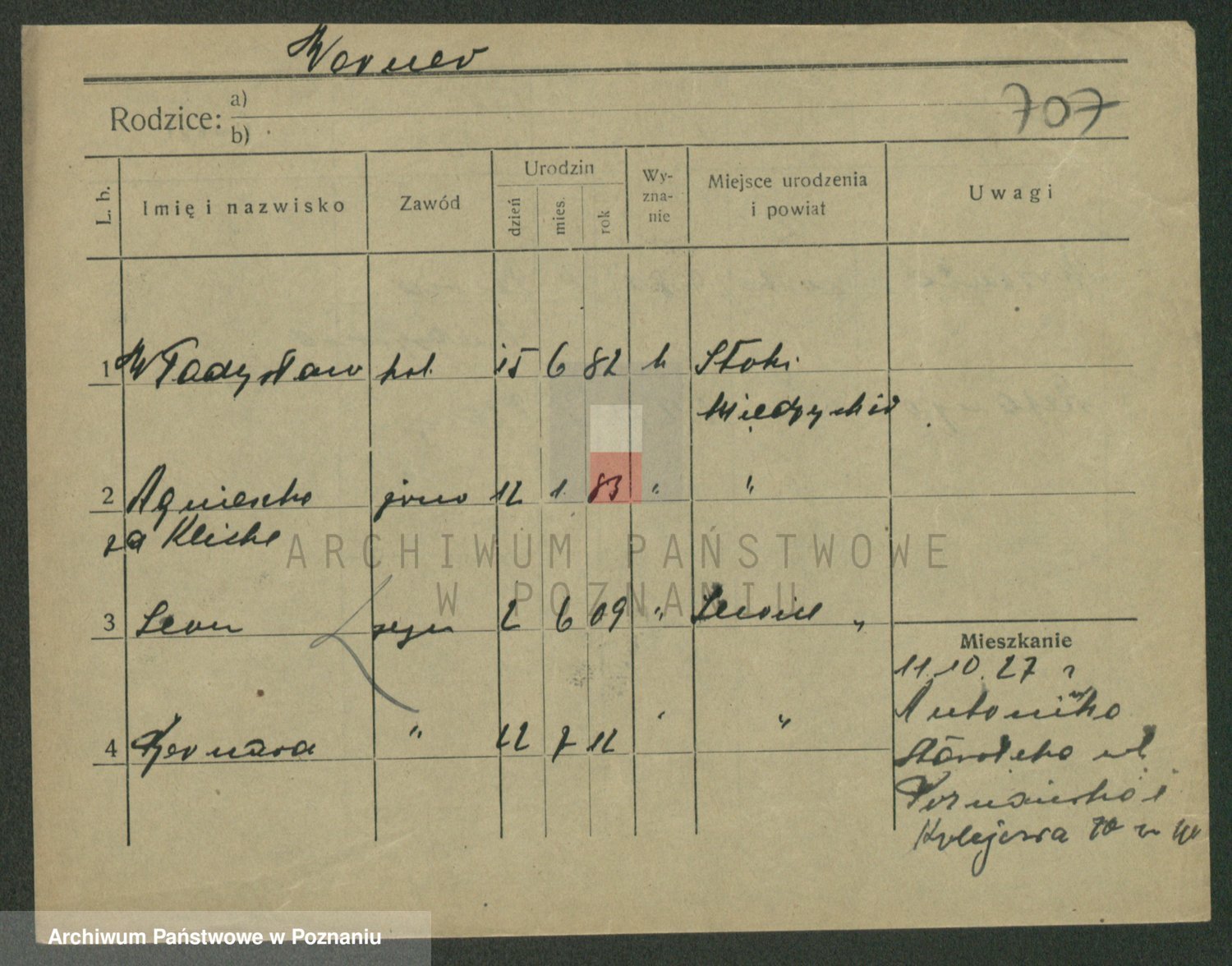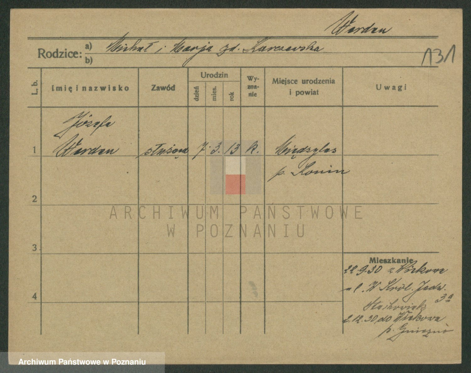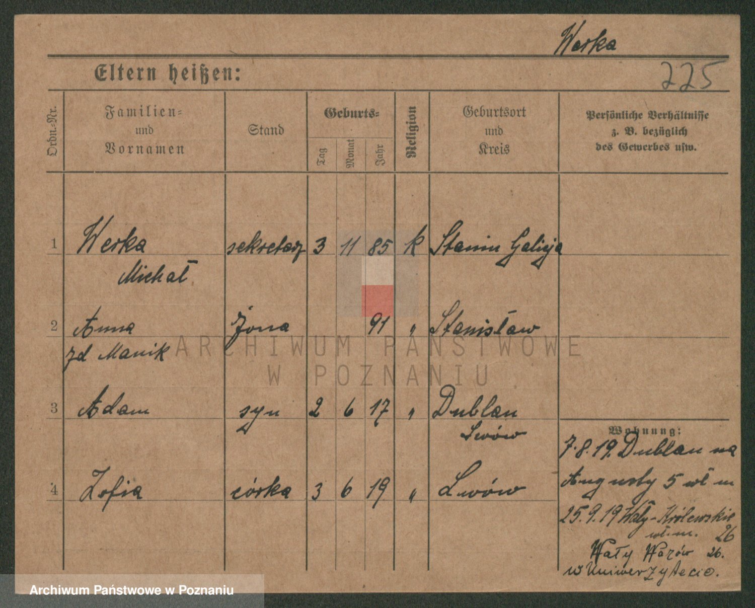 Podgląd karty osobowej dostępny jest po kliknięciu na nazwisko lub ikonkę karty. Można dokonywać powiększenia (ikony na górze) lub przechodzić między kolejnymi skanami (strzałki po bokach).