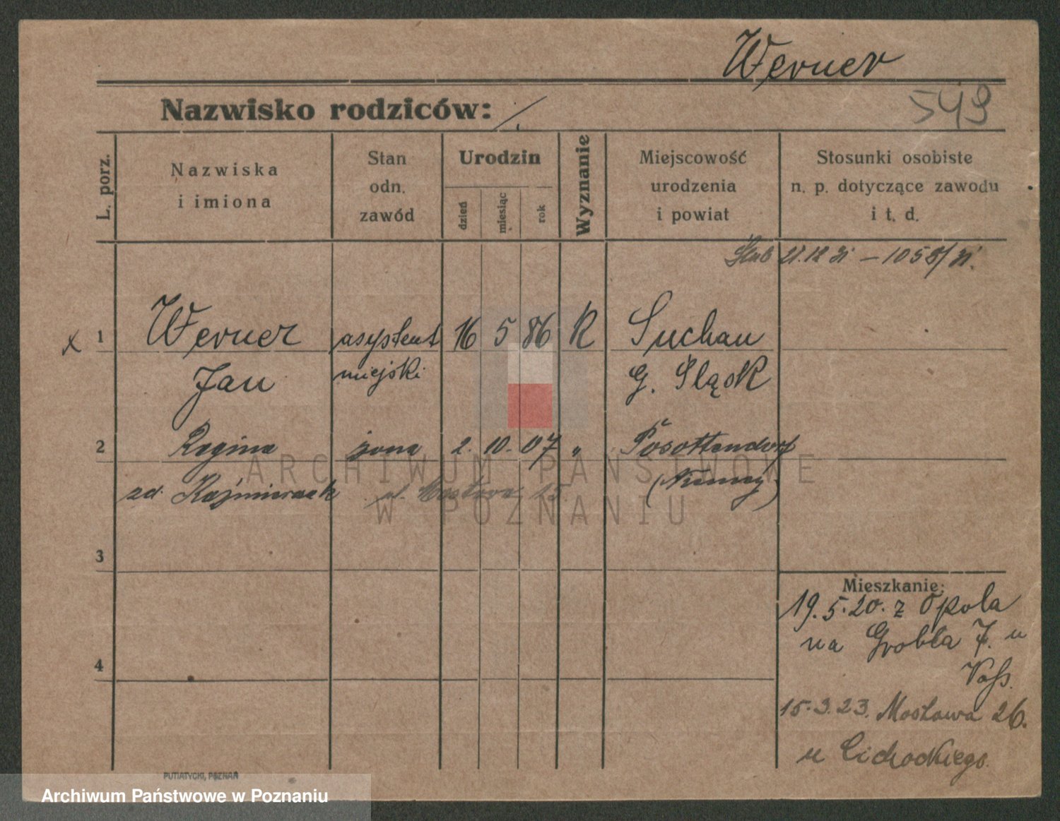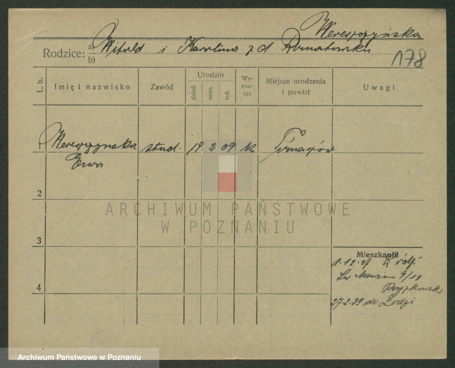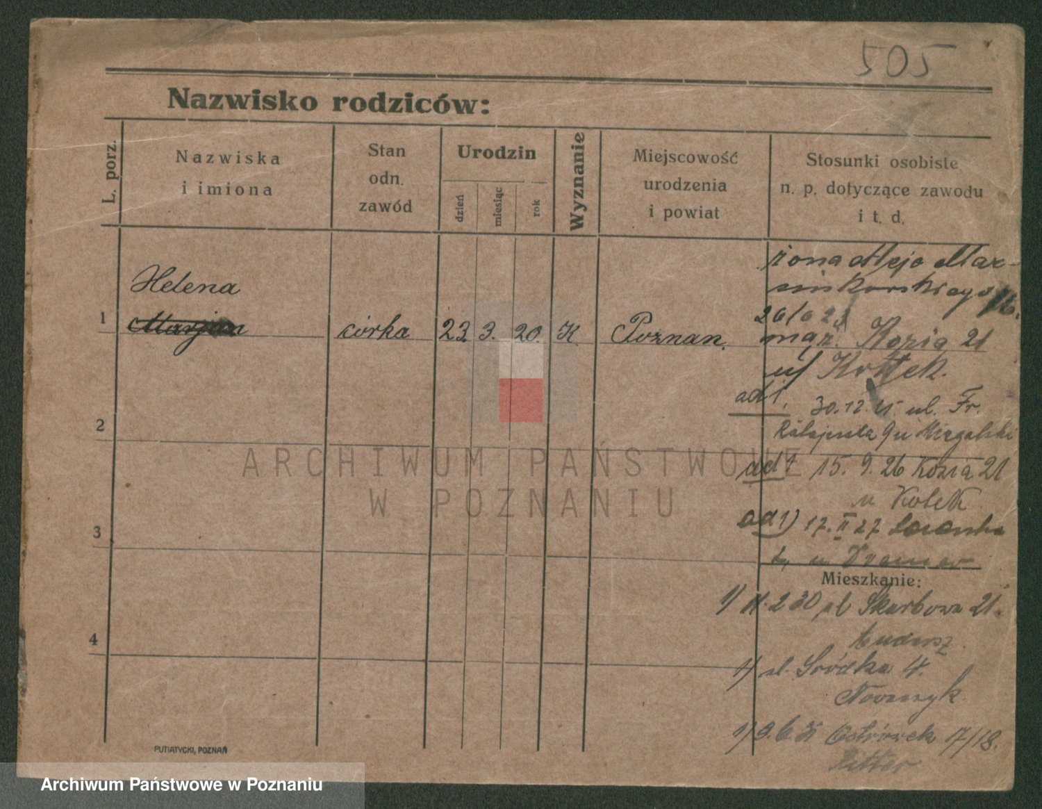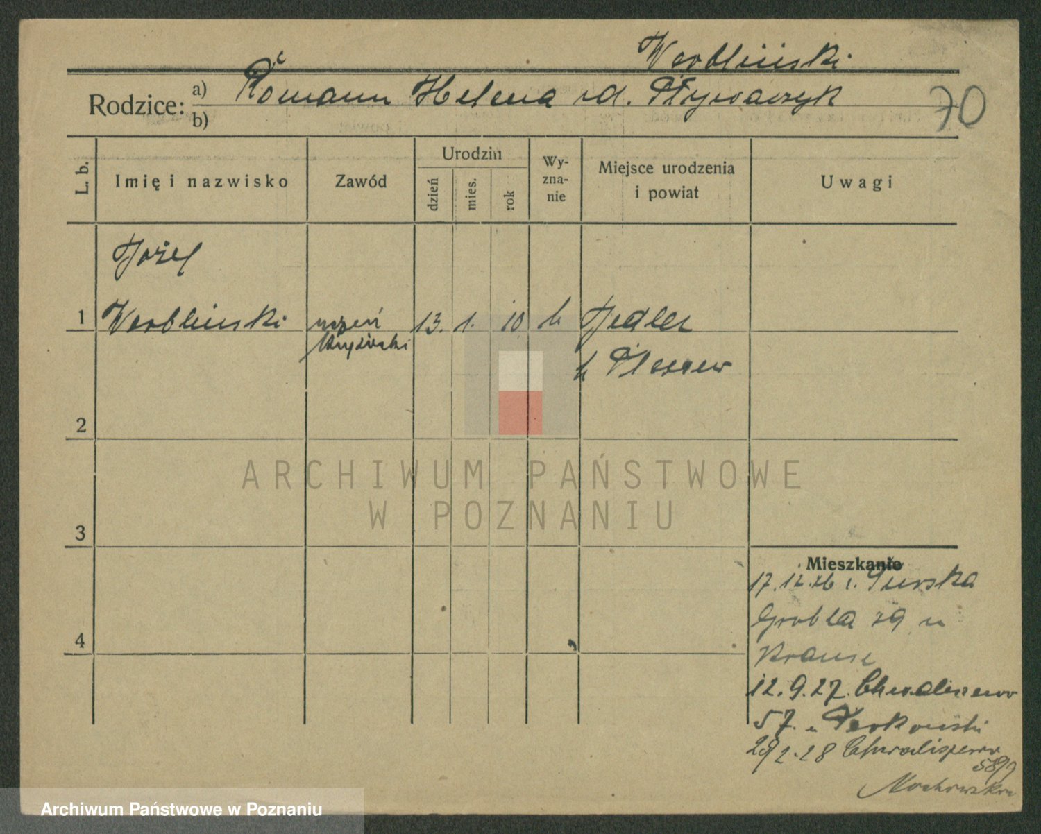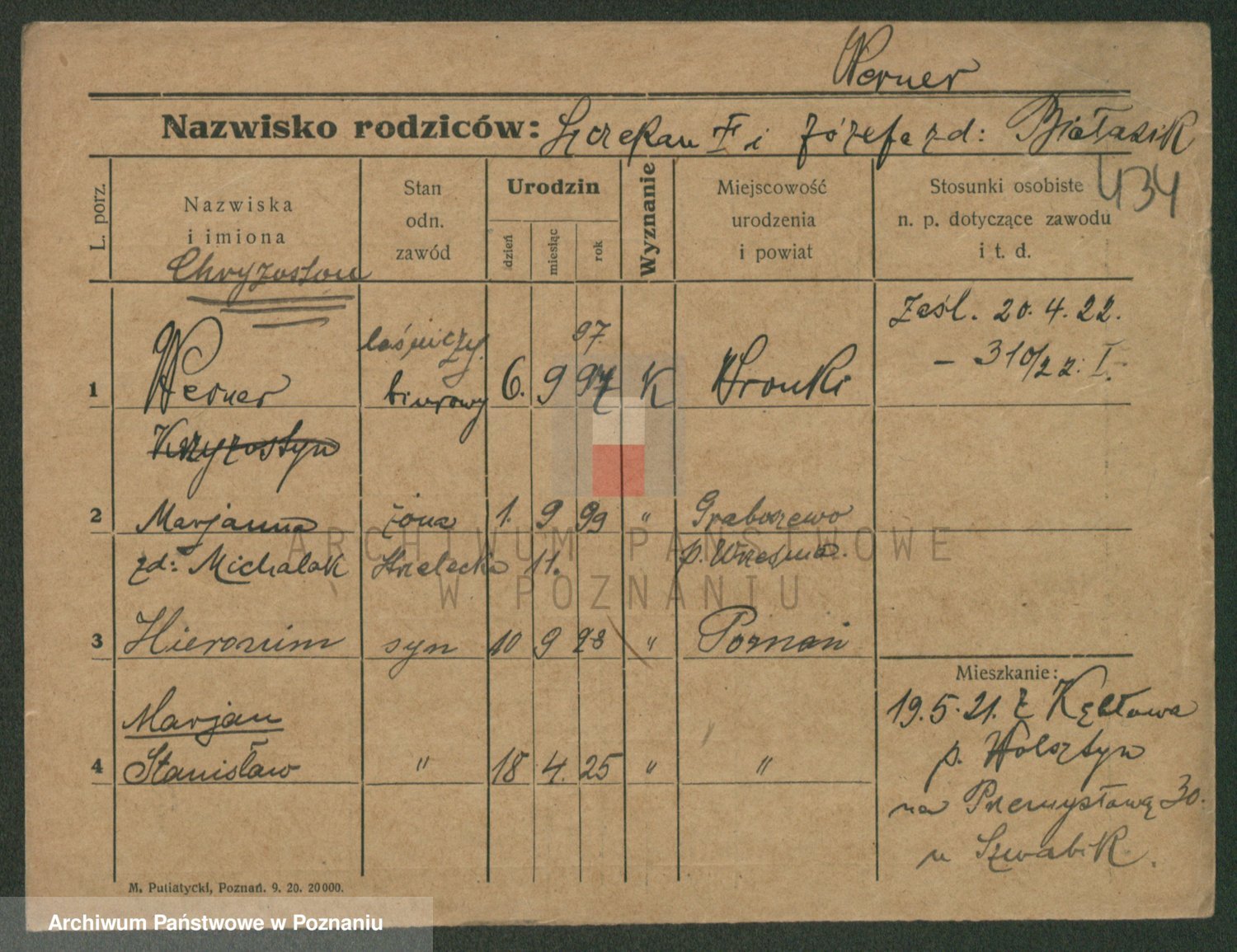 Podgląd karty osobowej dostępny jest po kliknięciu na nazwisko lub ikonkę karty. Można dokonywać powiększenia (ikony na górze) lub przechodzić między kolejnymi skanami (strzałki po bokach).