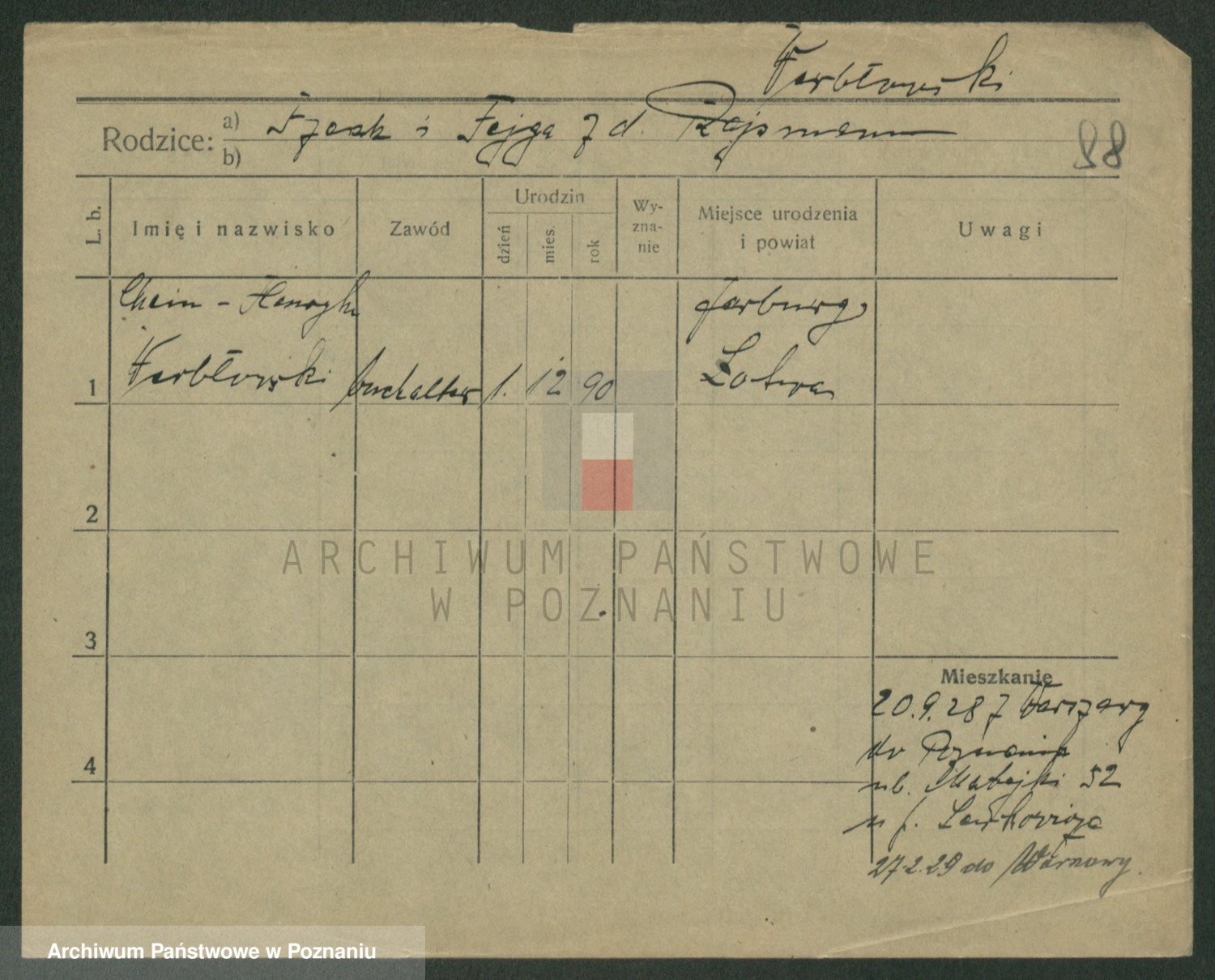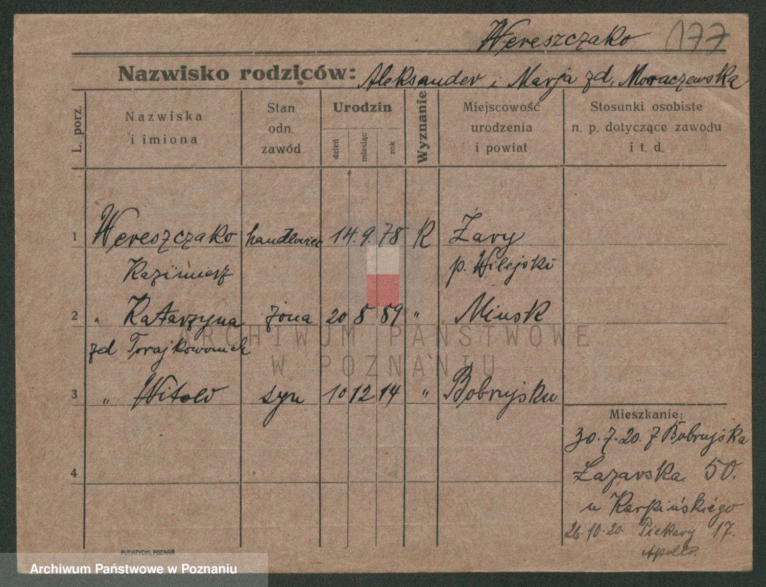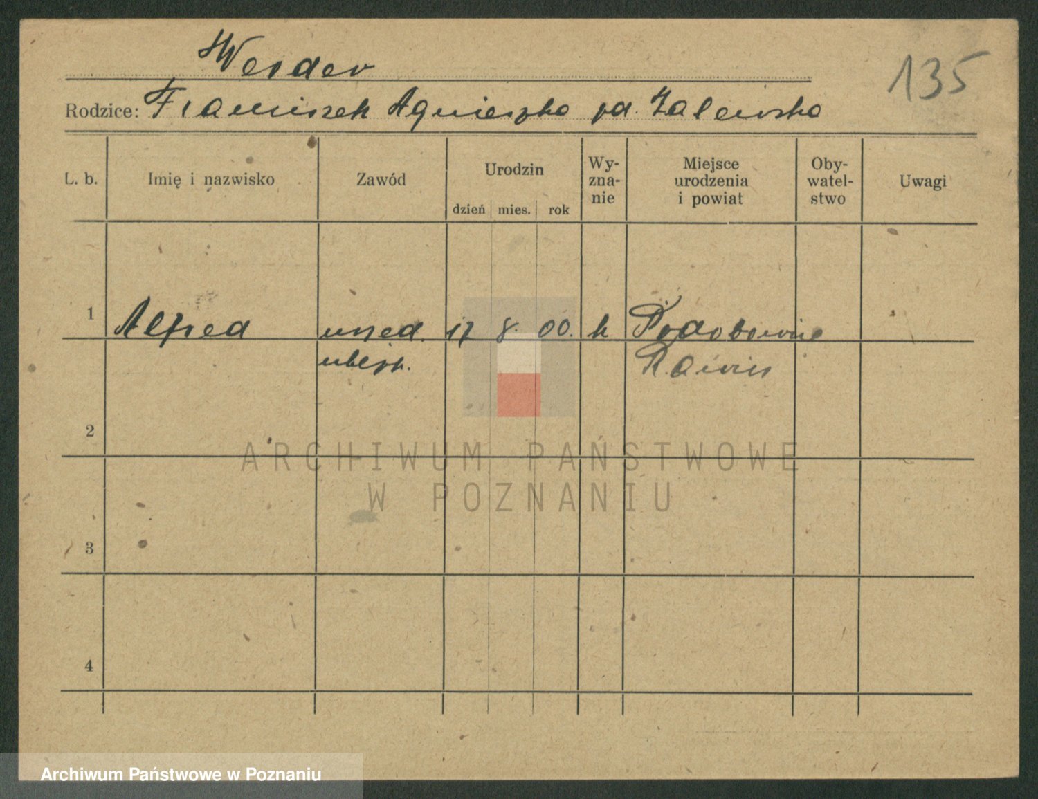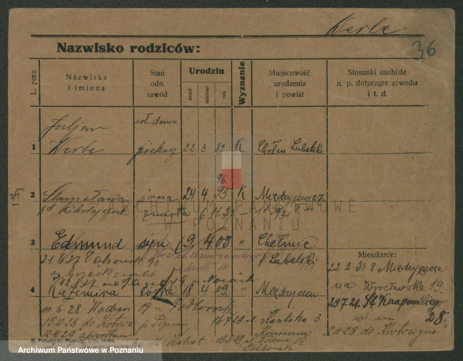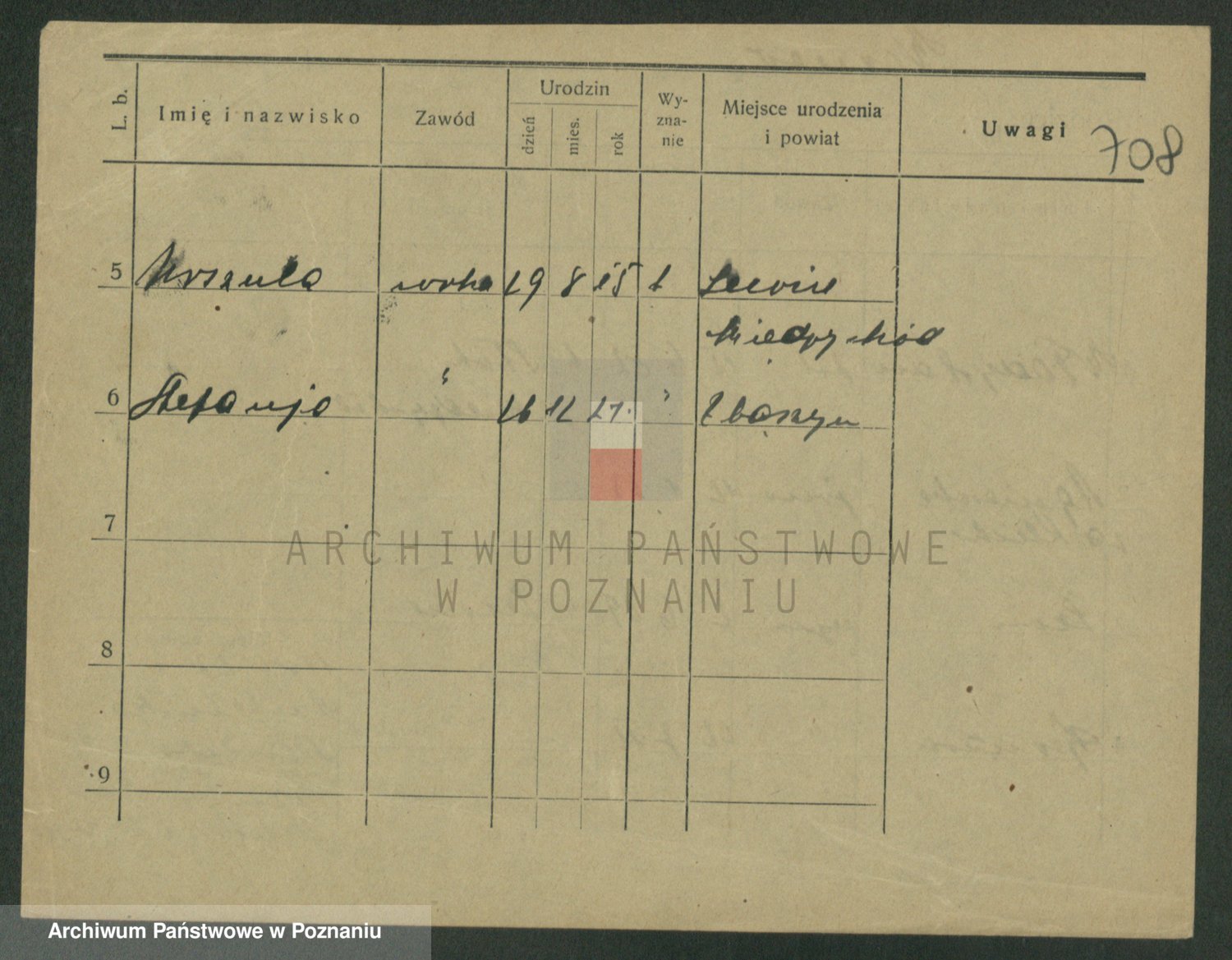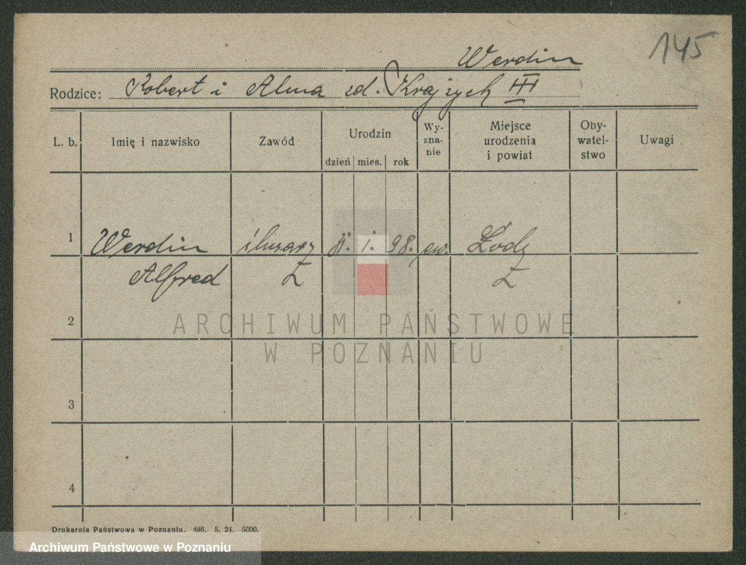 Podgląd karty osobowej dostępny jest po kliknięciu na nazwisko lub ikonkę karty. Można dokonywać powiększenia (ikony na górze) lub przechodzić między kolejnymi skanami (strzałki po bokach).