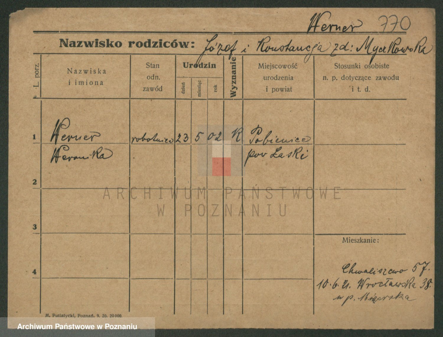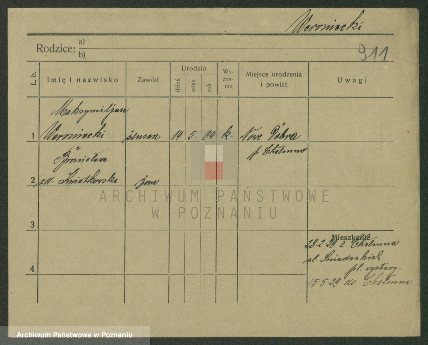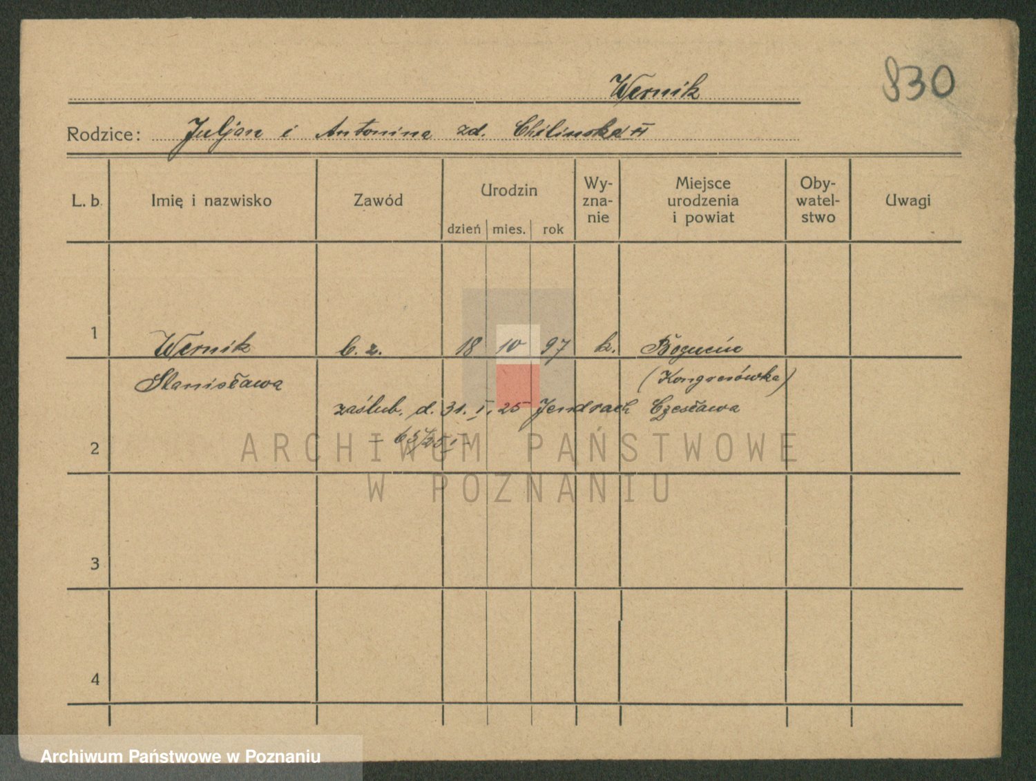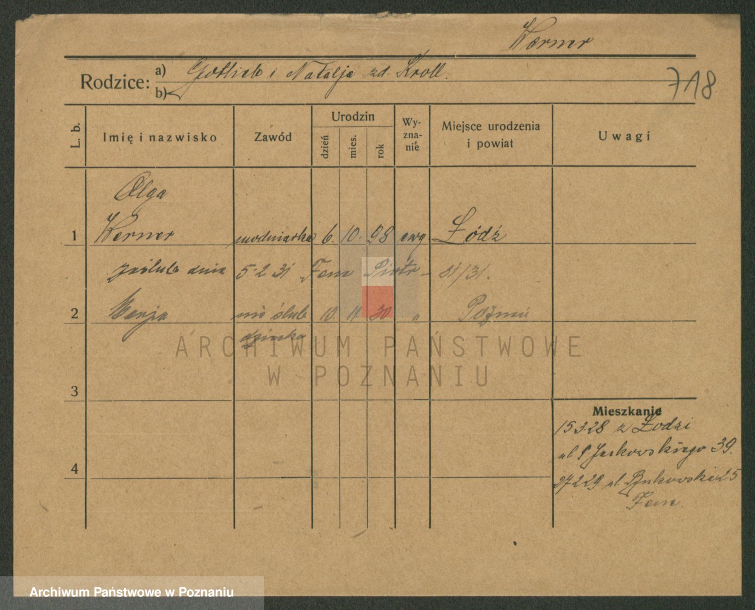 Podgląd karty osobowej dostępny jest po kliknięciu na nazwisko lub ikonkę karty. Można dokonywać powiększenia (ikony na górze) lub przechodzić między kolejnymi skanami (strzałki po bokach).
