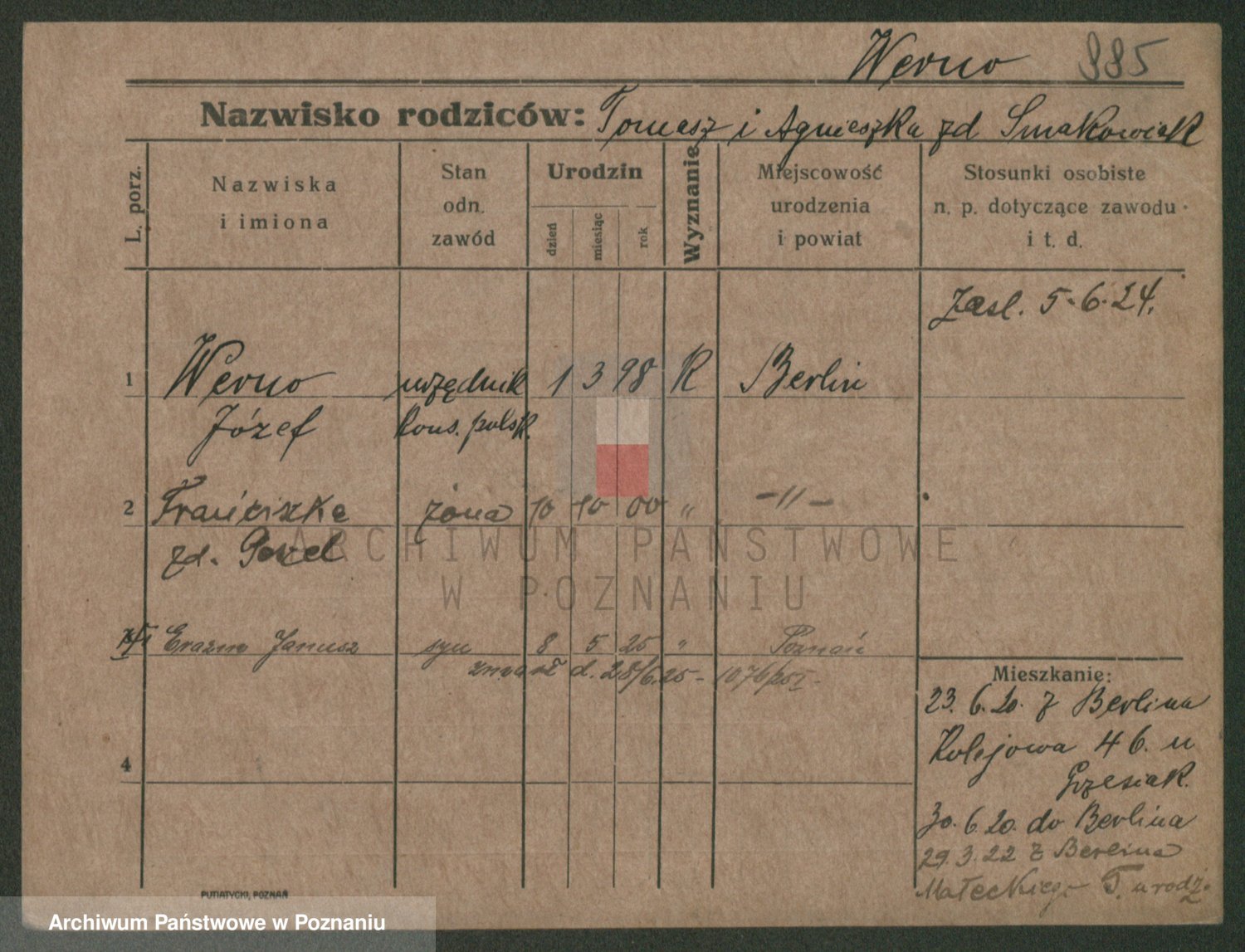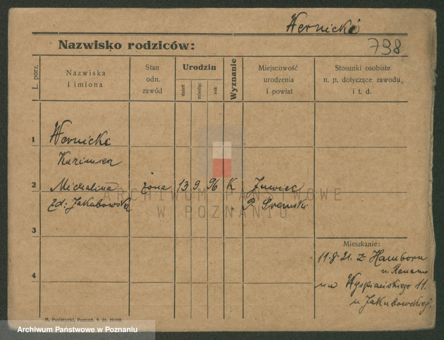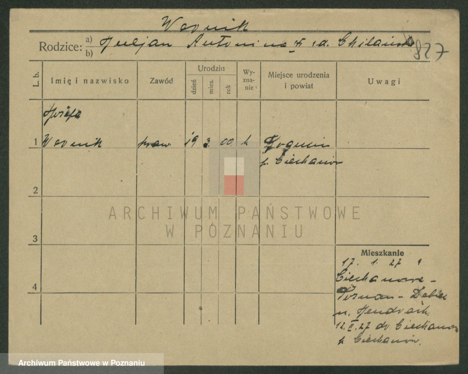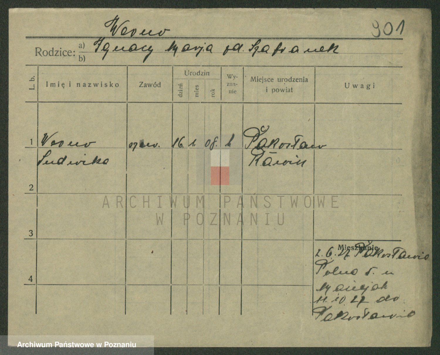 Podgląd karty osobowej dostępny jest po kliknięciu na nazwisko lub ikonkę karty. Można dokonywać powiększenia (ikony na górze) lub przechodzić między kolejnymi skanami (strzałki po bokach).
