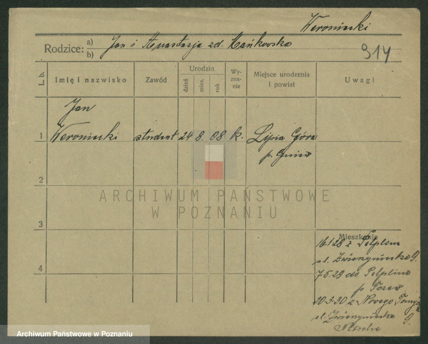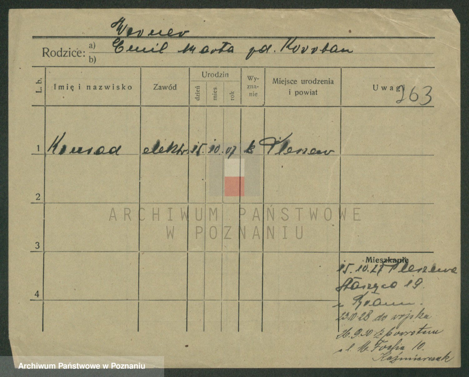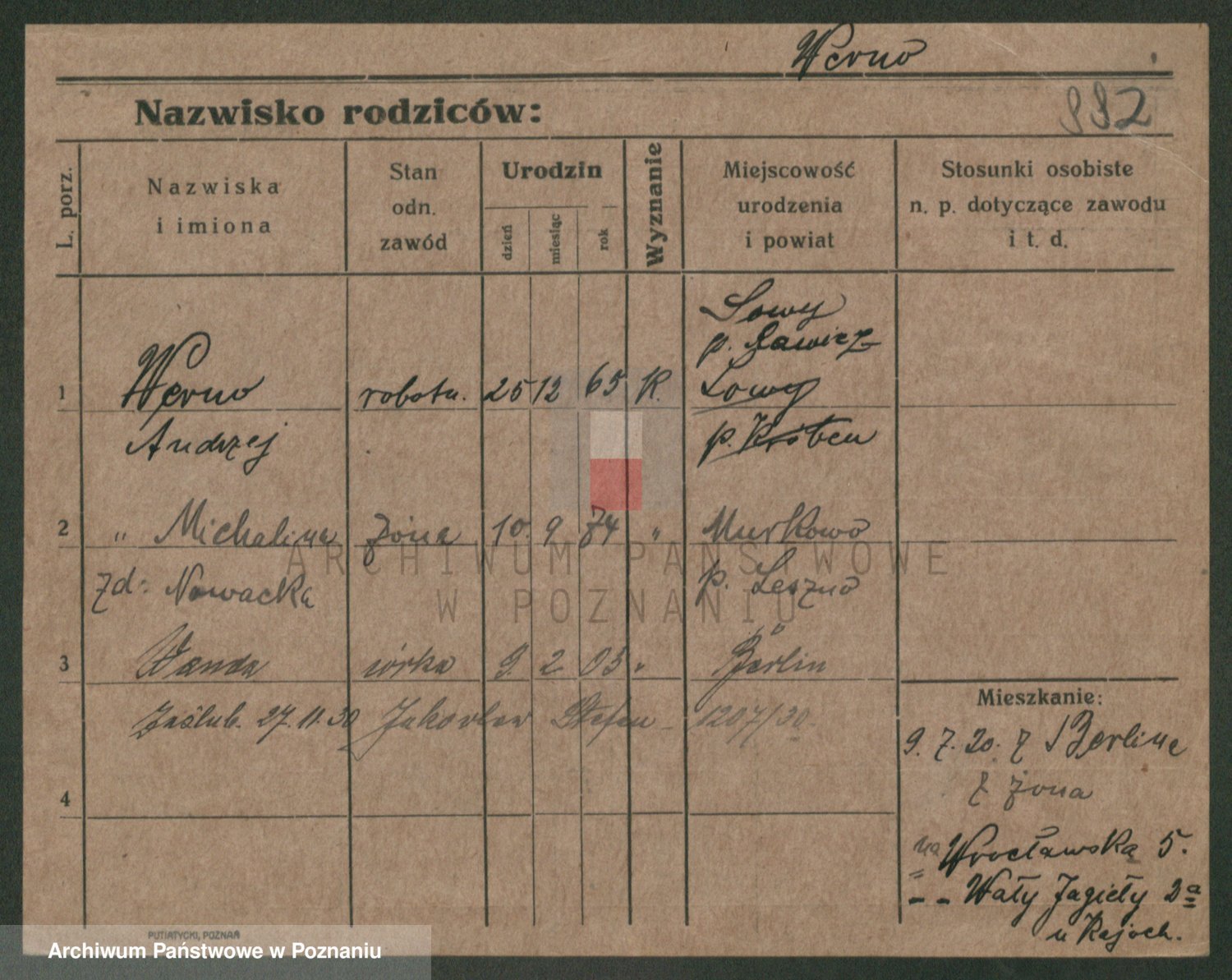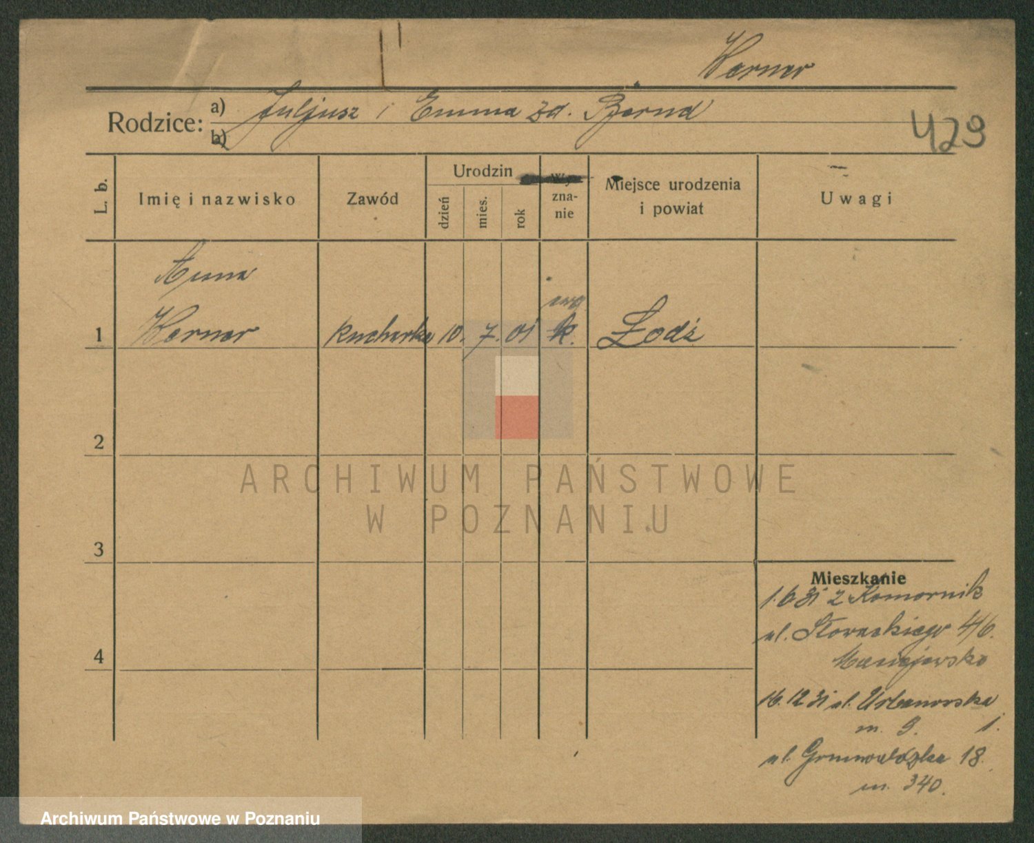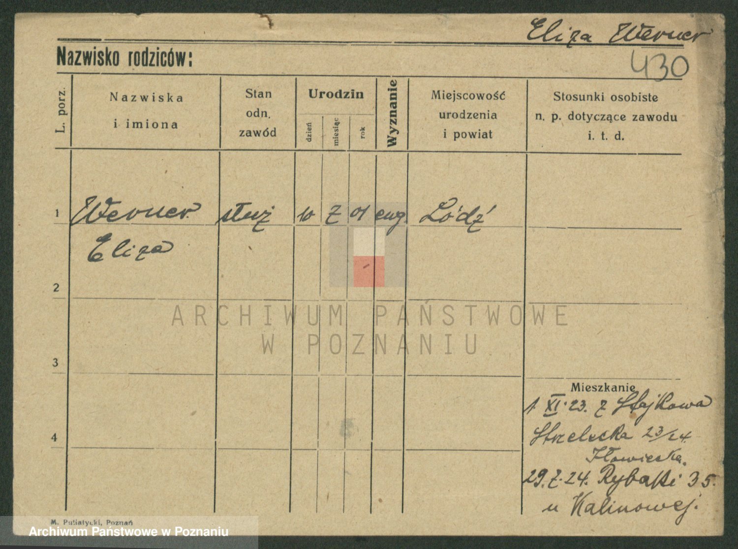 Podgląd karty osobowej dostępny jest po kliknięciu na nazwisko lub ikonkę karty. Można dokonywać powiększenia (ikony na górze) lub przechodzić między kolejnymi skanami (strzałki po bokach).