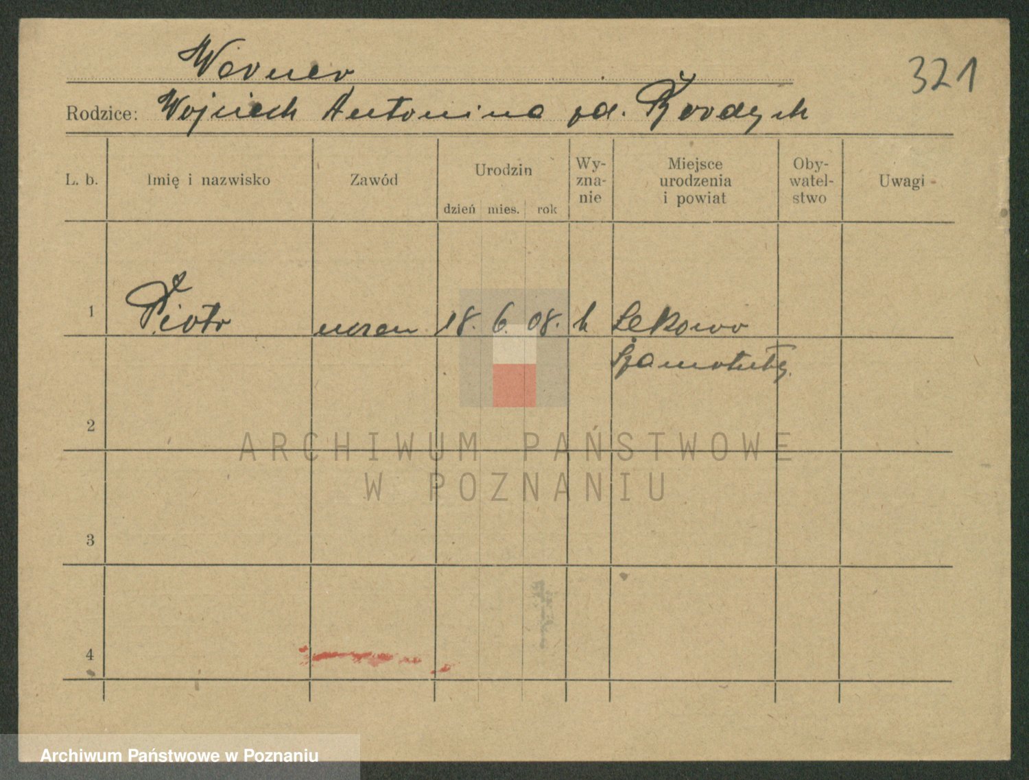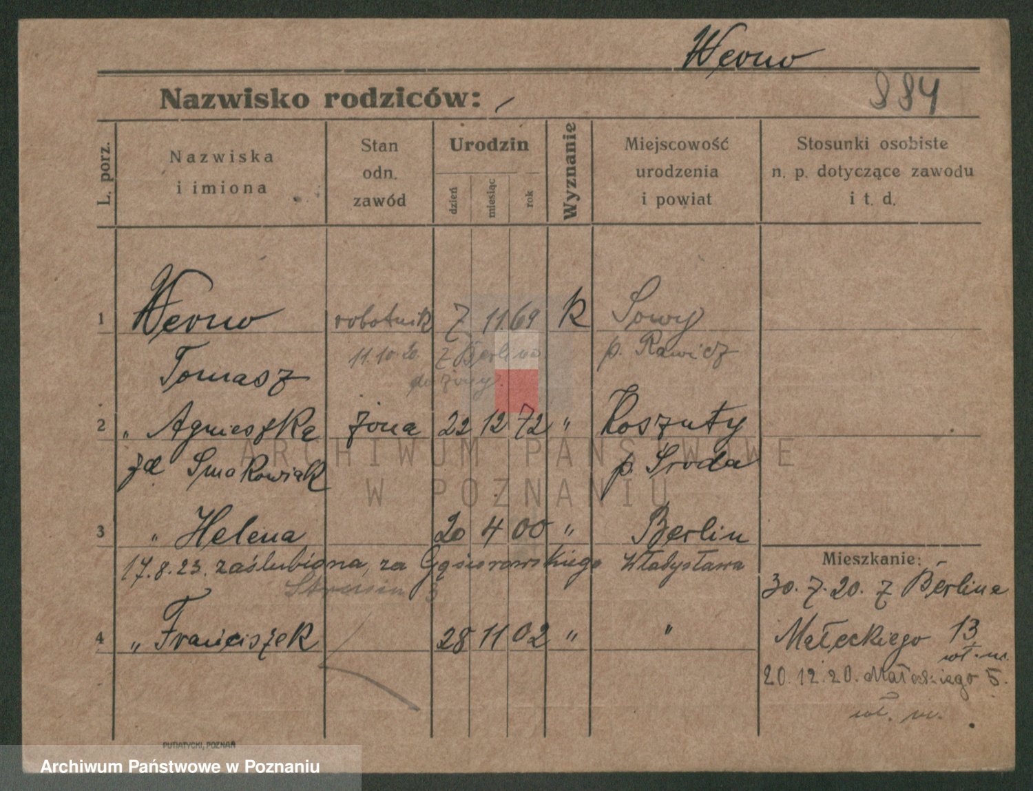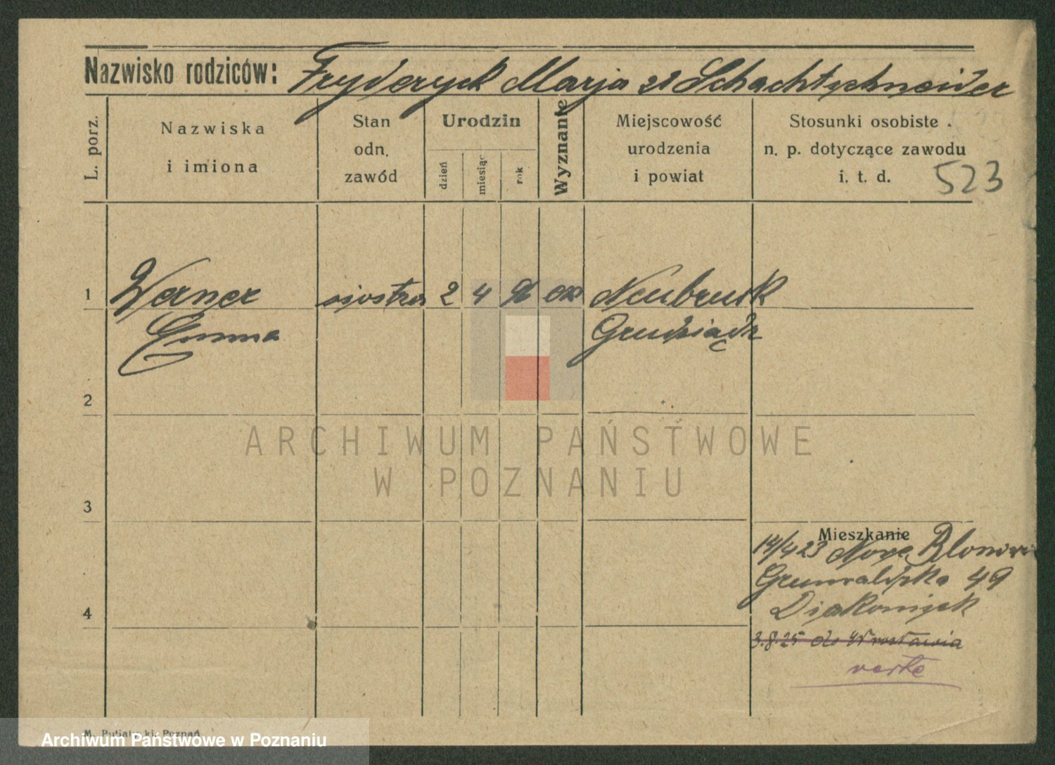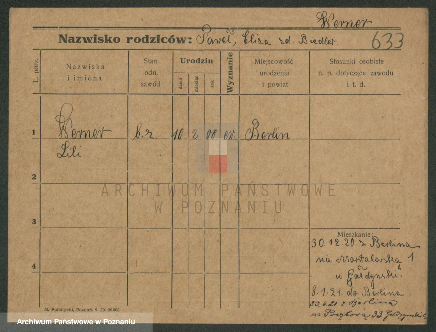 Podgląd karty osobowej dostępny jest po kliknięciu na nazwisko lub ikonkę karty. Można dokonywać powiększenia (ikony na górze) lub przechodzić między kolejnymi skanami (strzałki po bokach).