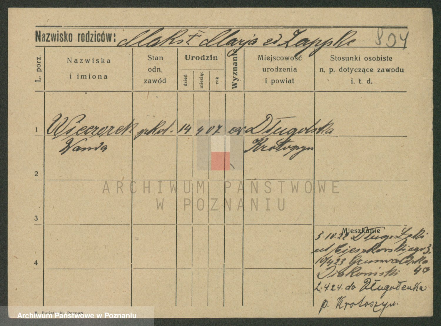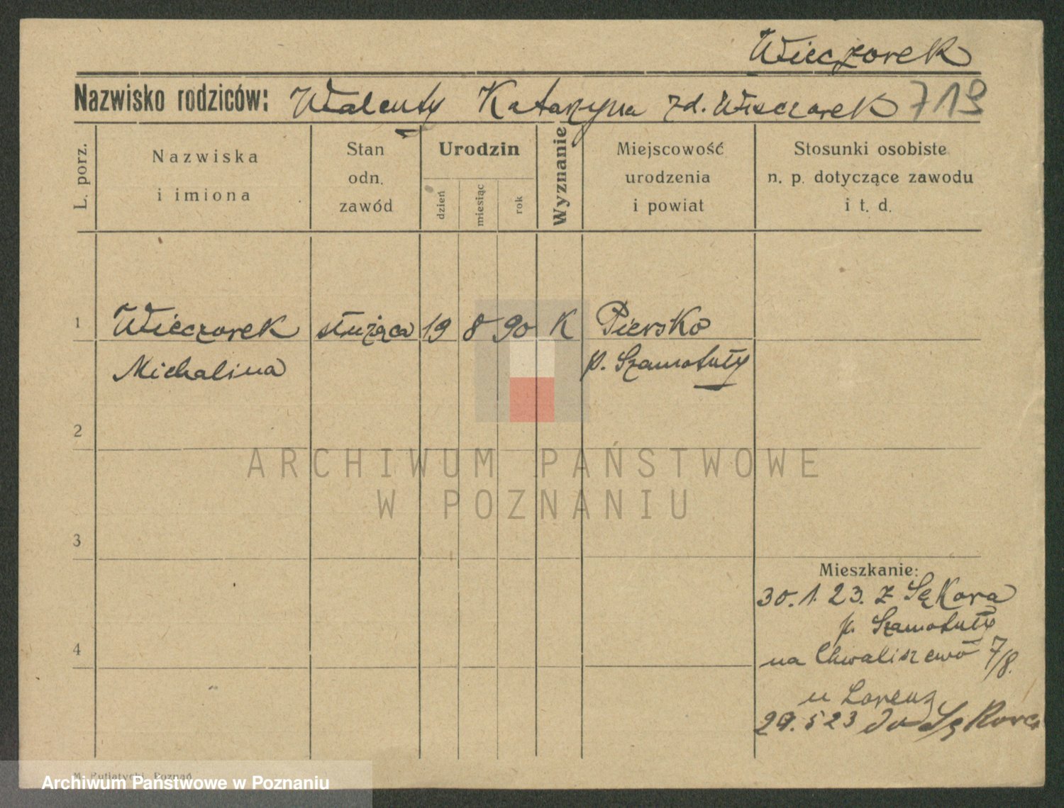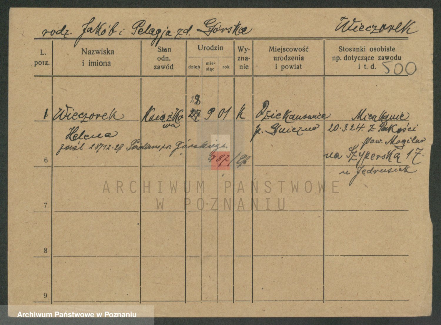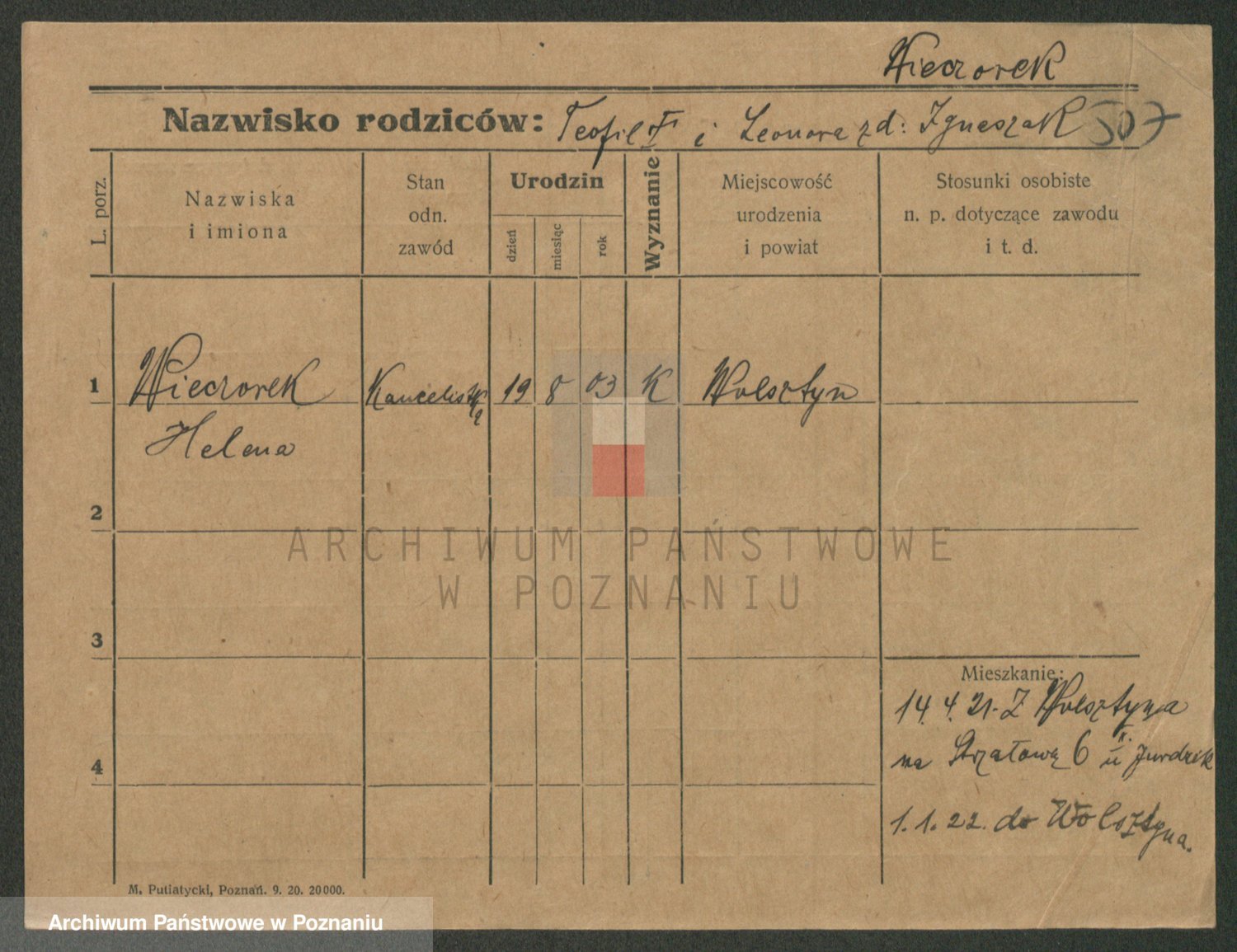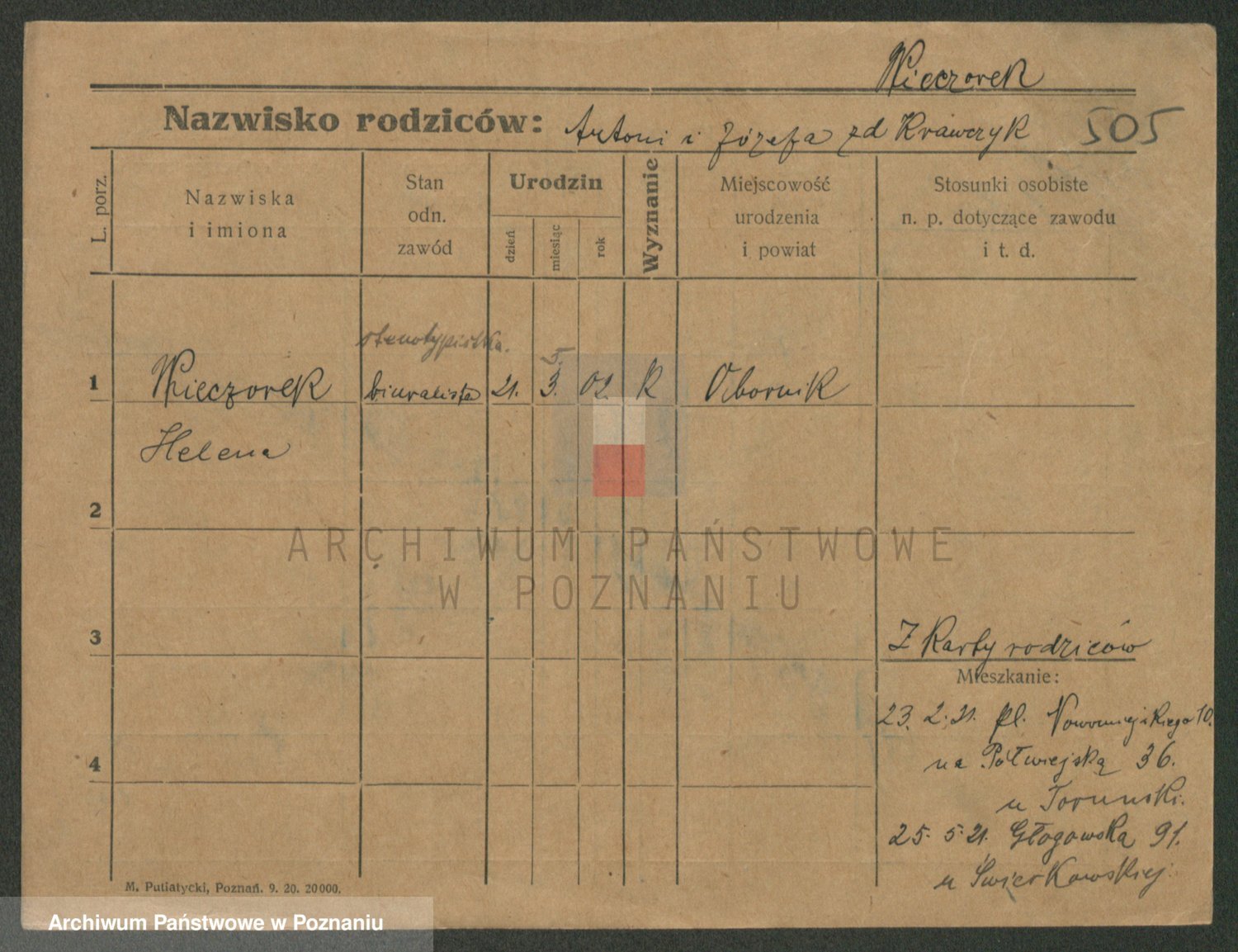 Podgląd karty osobowej dostępny jest po kliknięciu na nazwisko lub ikonkę karty. Można dokonywać powiększenia (ikony na górze) lub przechodzić między kolejnymi skanami (strzałki po bokach).