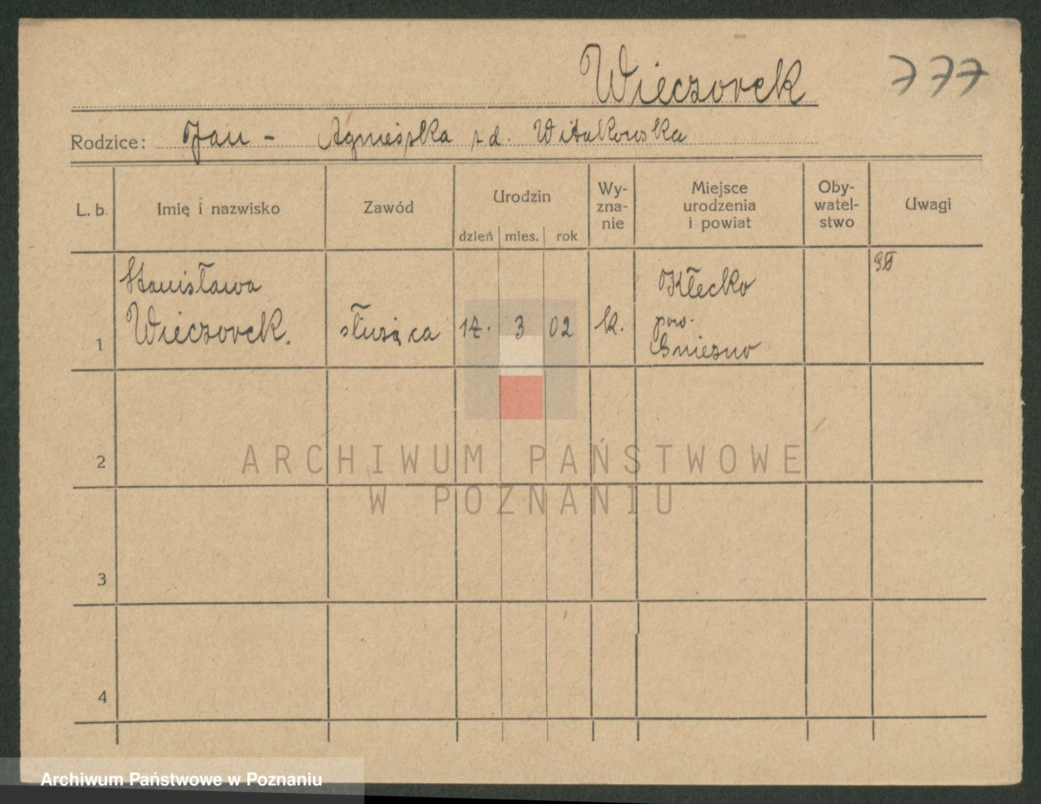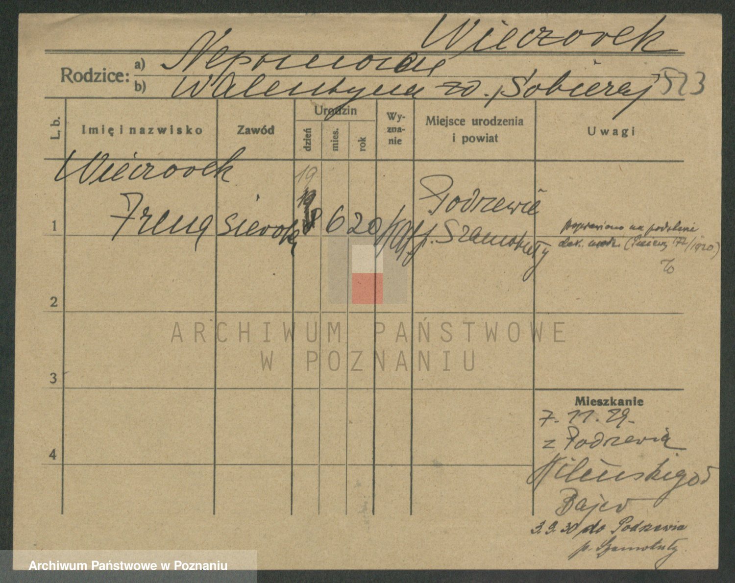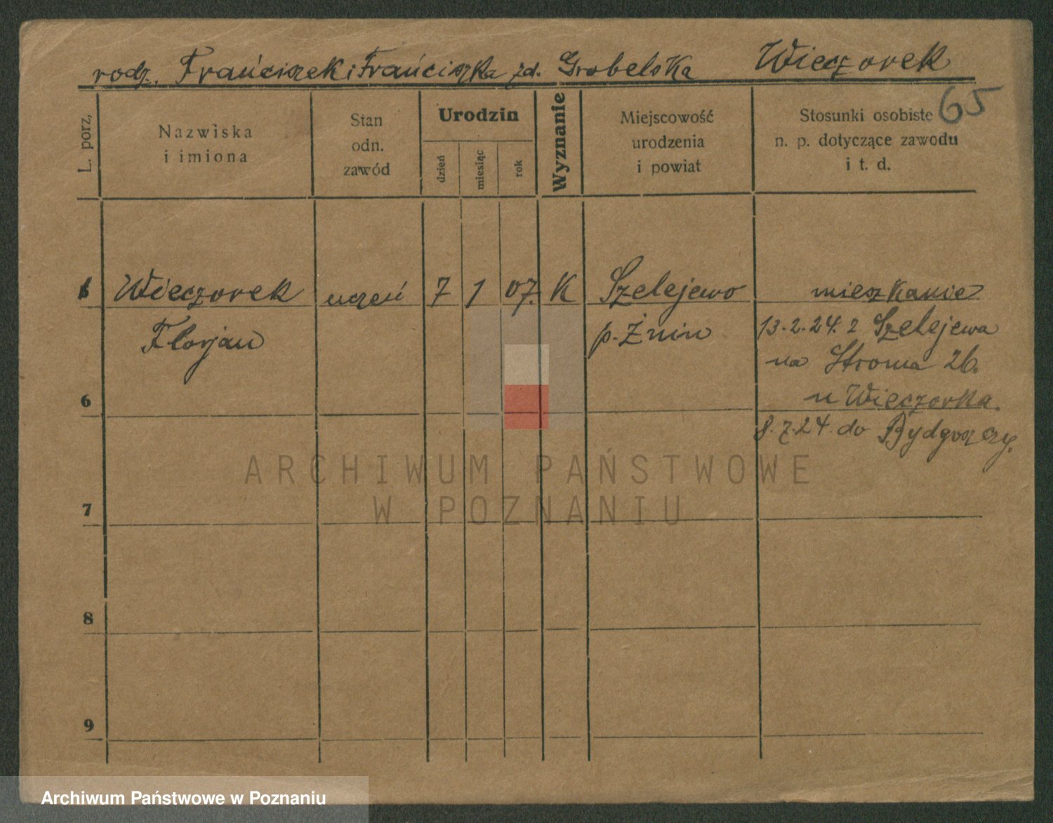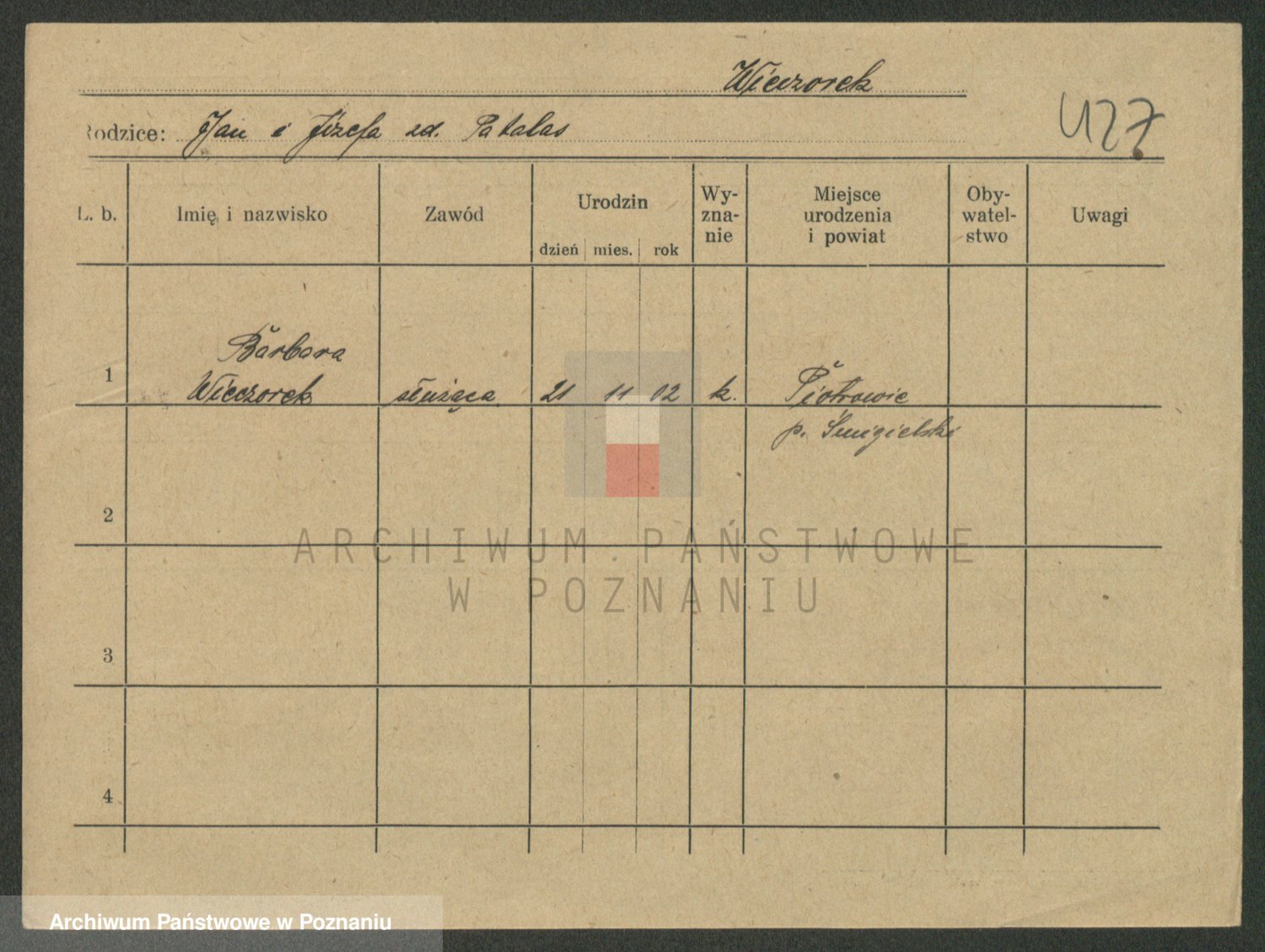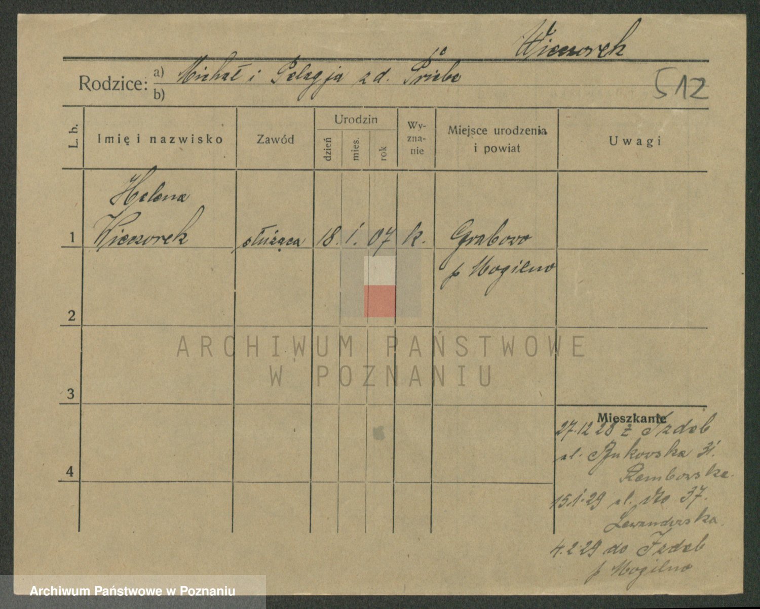 Podgląd karty osobowej dostępny jest po kliknięciu na nazwisko lub ikonkę karty. Można dokonywać powiększenia (ikony na górze) lub przechodzić między kolejnymi skanami (strzałki po bokach).