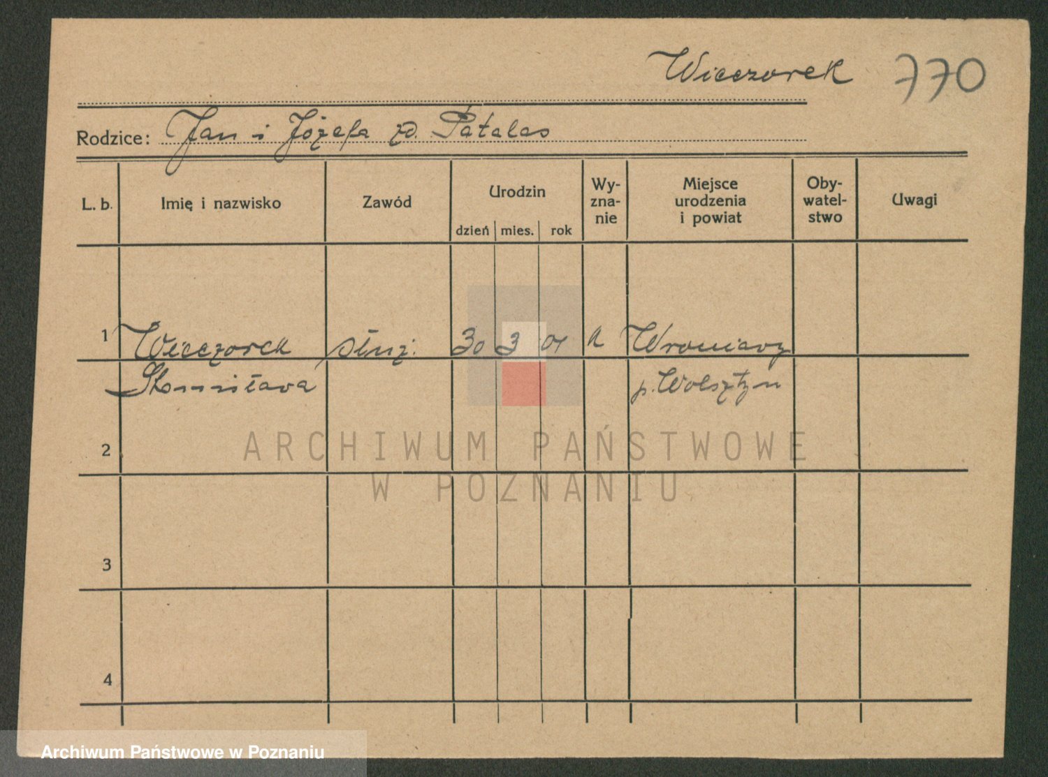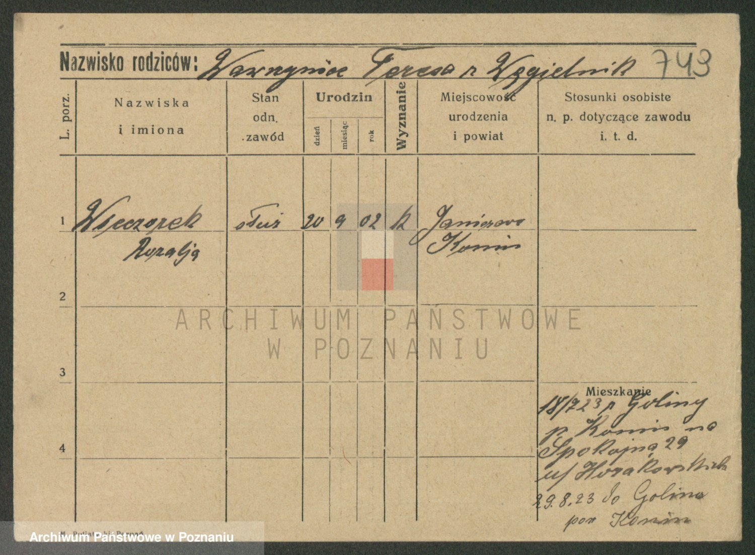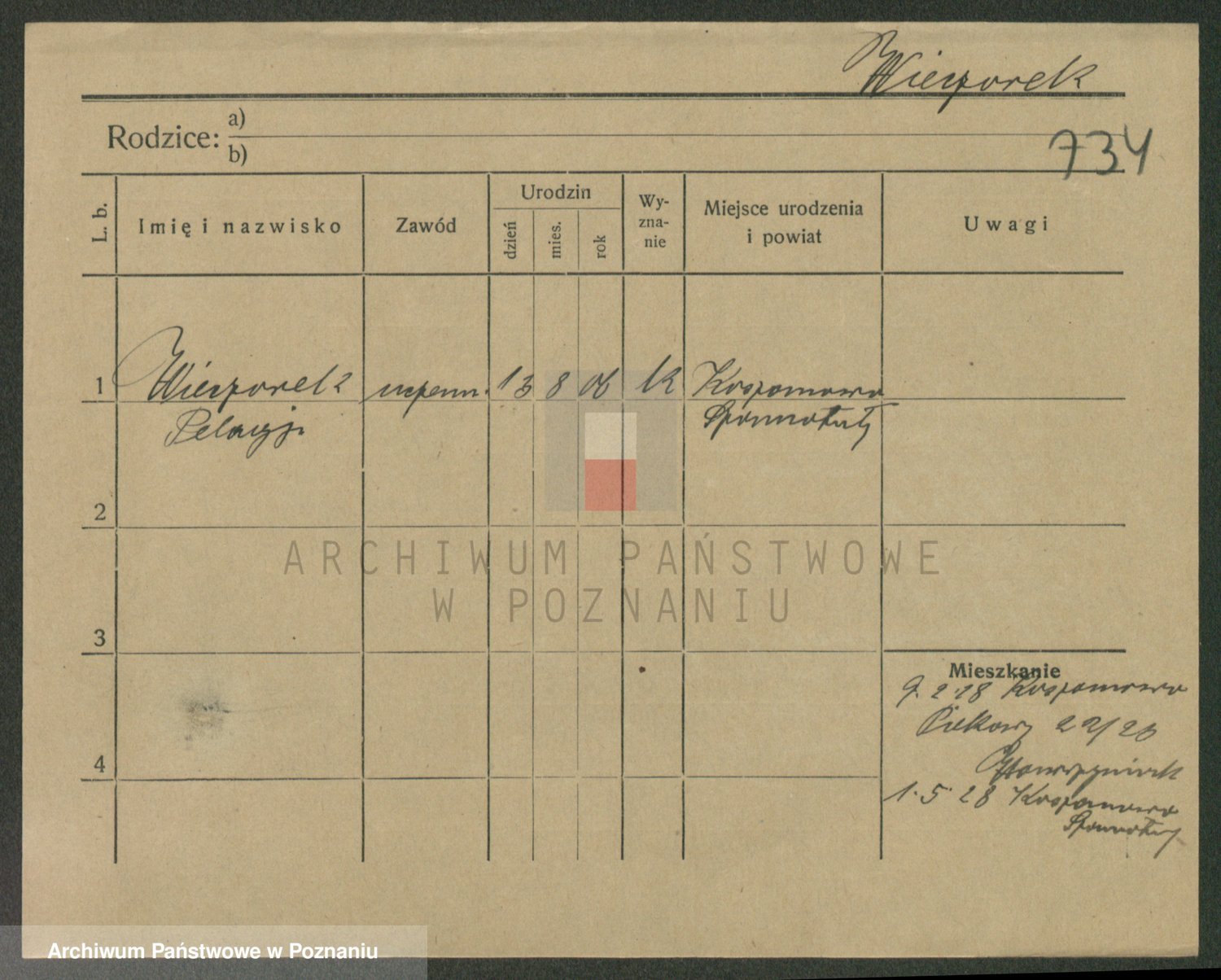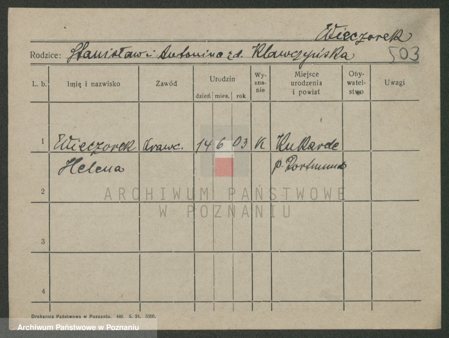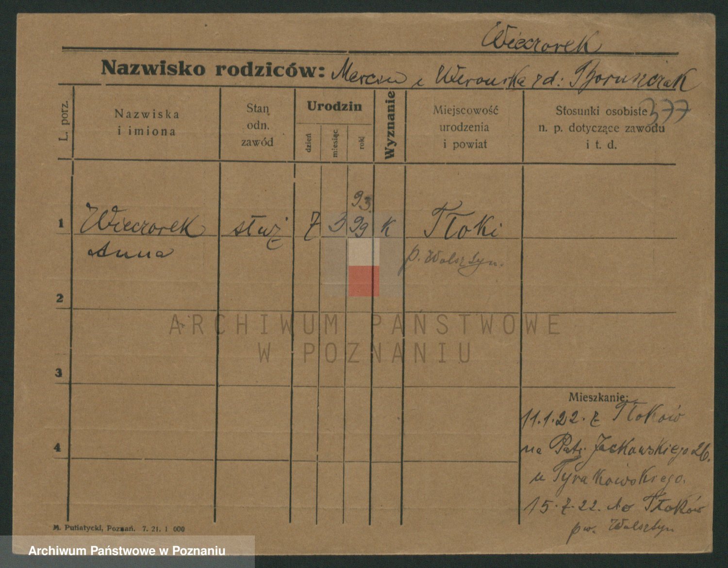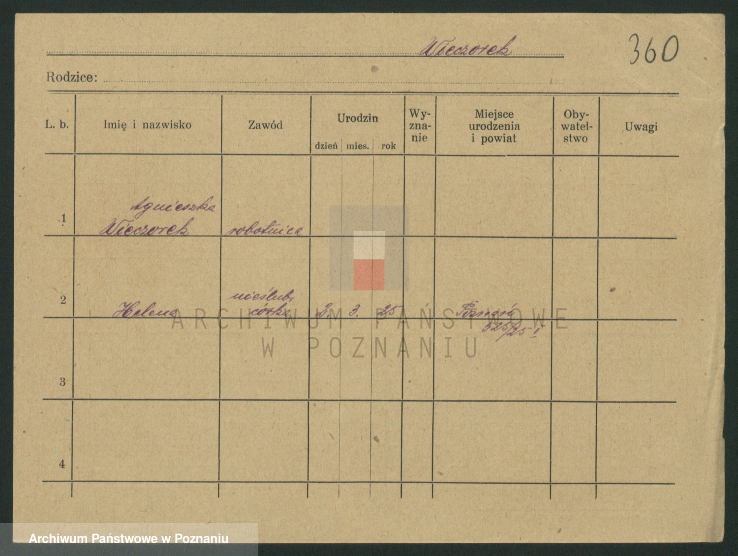 Podgląd karty osobowej dostępny jest po kliknięciu na nazwisko lub ikonkę karty. Można dokonywać powiększenia (ikony na górze) lub przechodzić między kolejnymi skanami (strzałki po bokach).