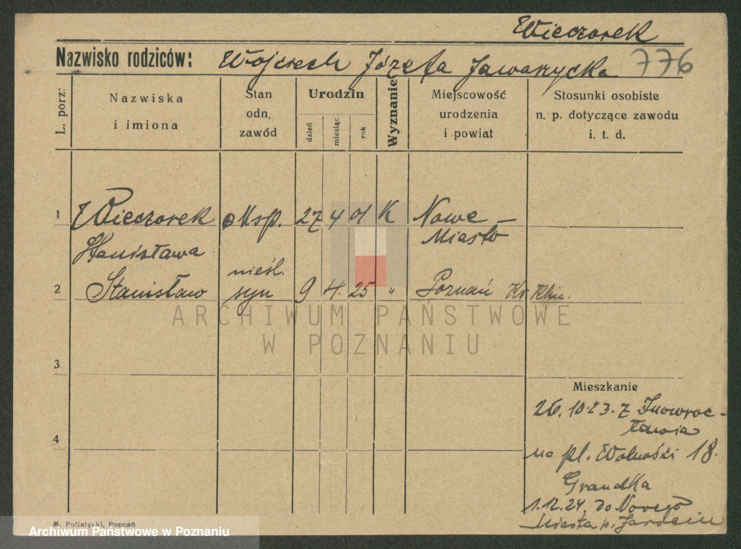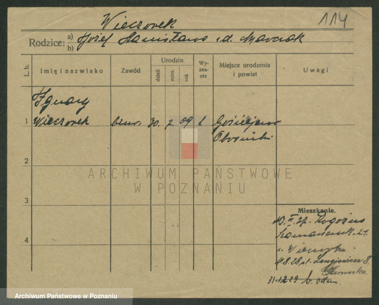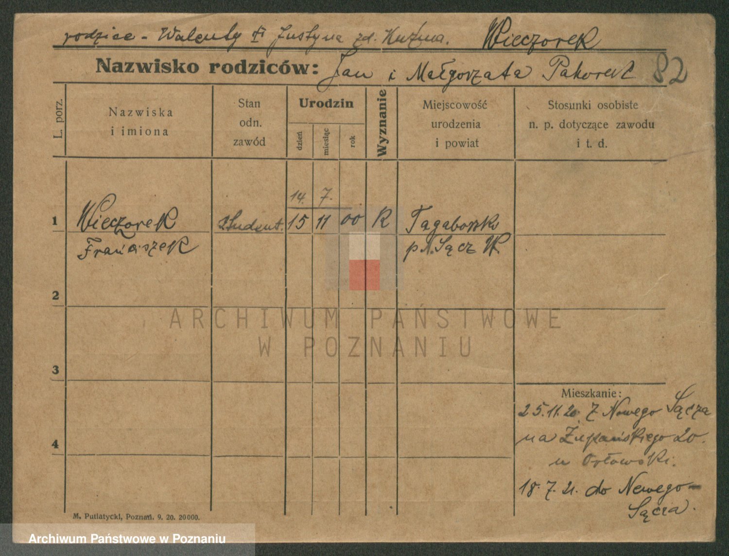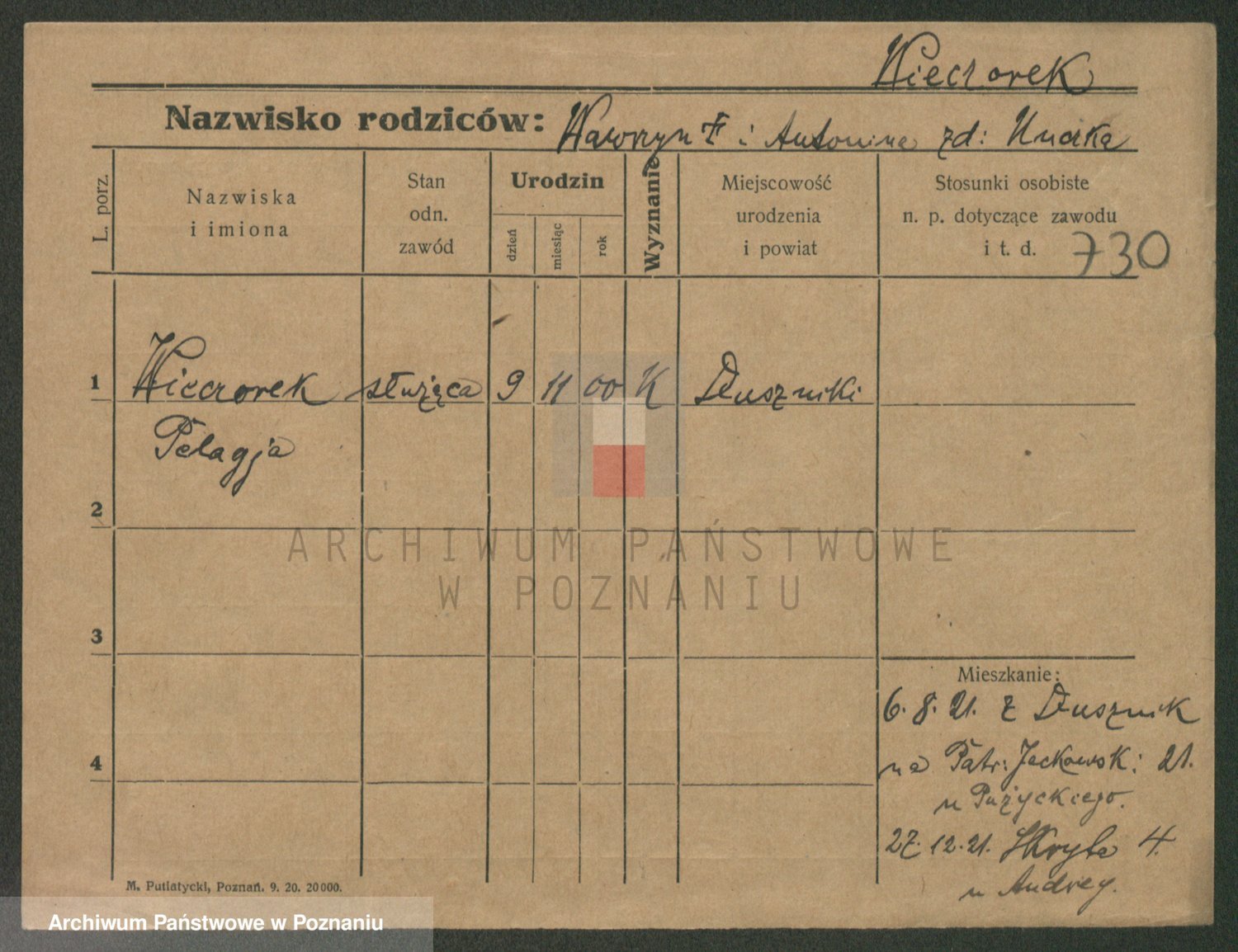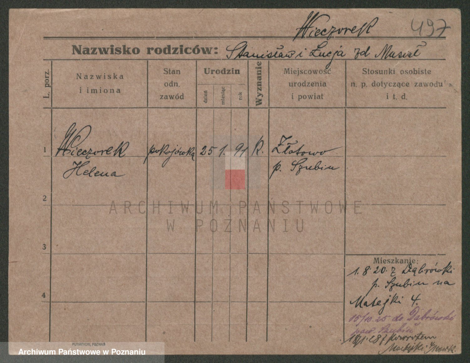 Podgląd karty osobowej dostępny jest po kliknięciu na nazwisko lub ikonkę karty. Można dokonywać powiększenia (ikony na górze) lub przechodzić między kolejnymi skanami (strzałki po bokach).
