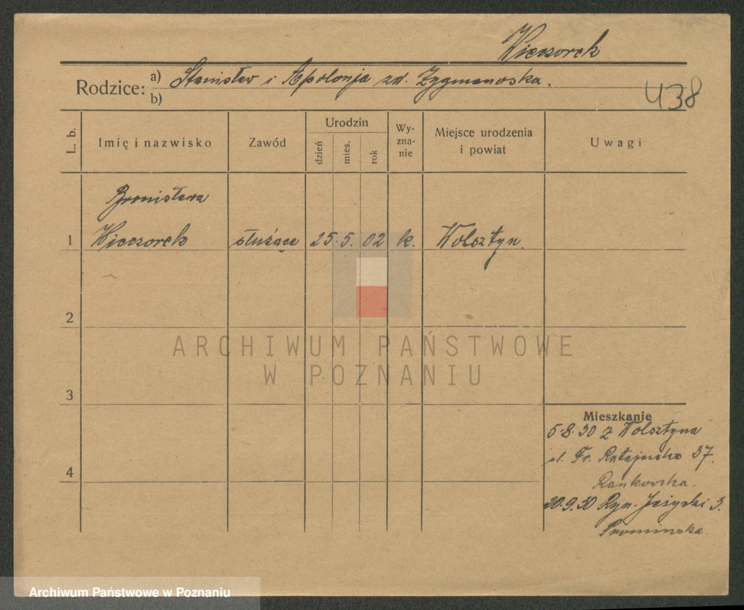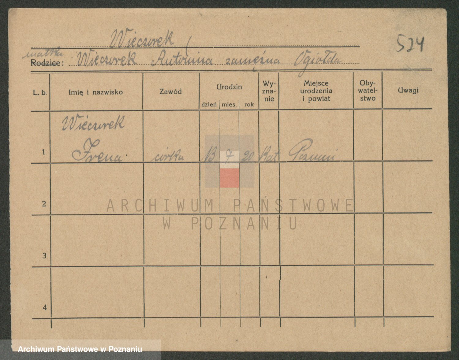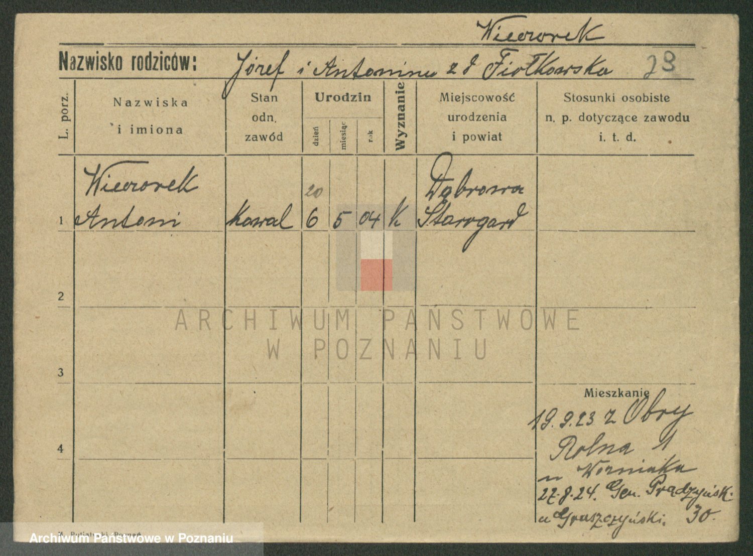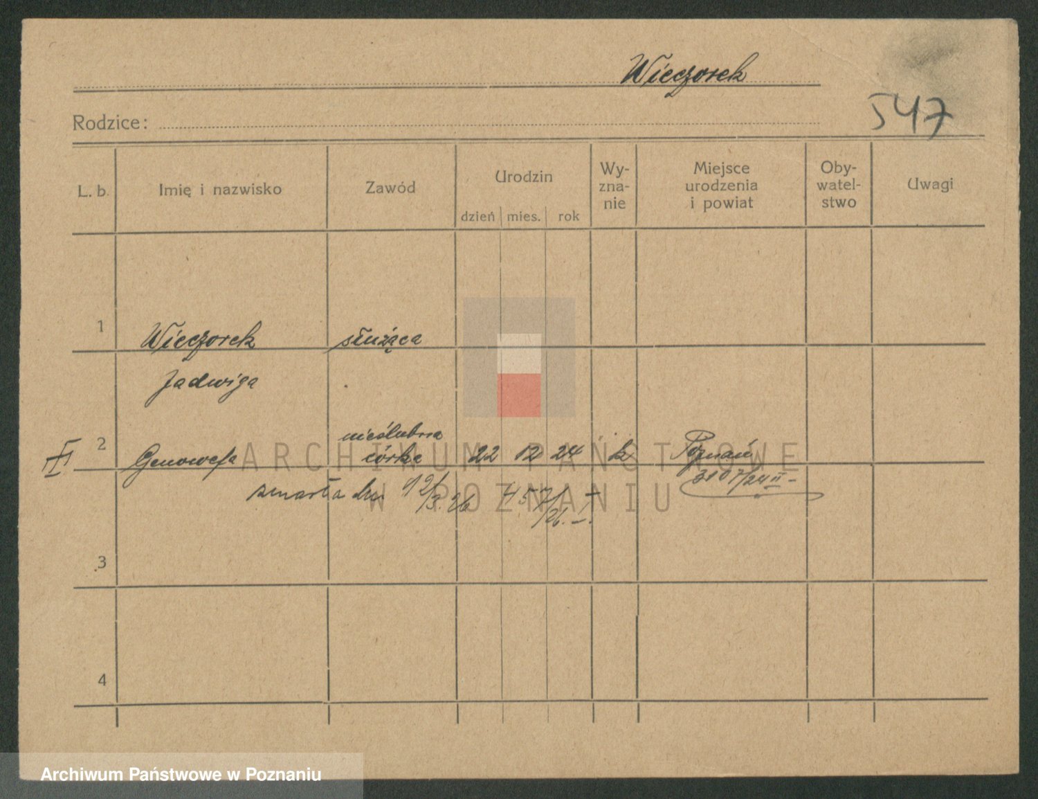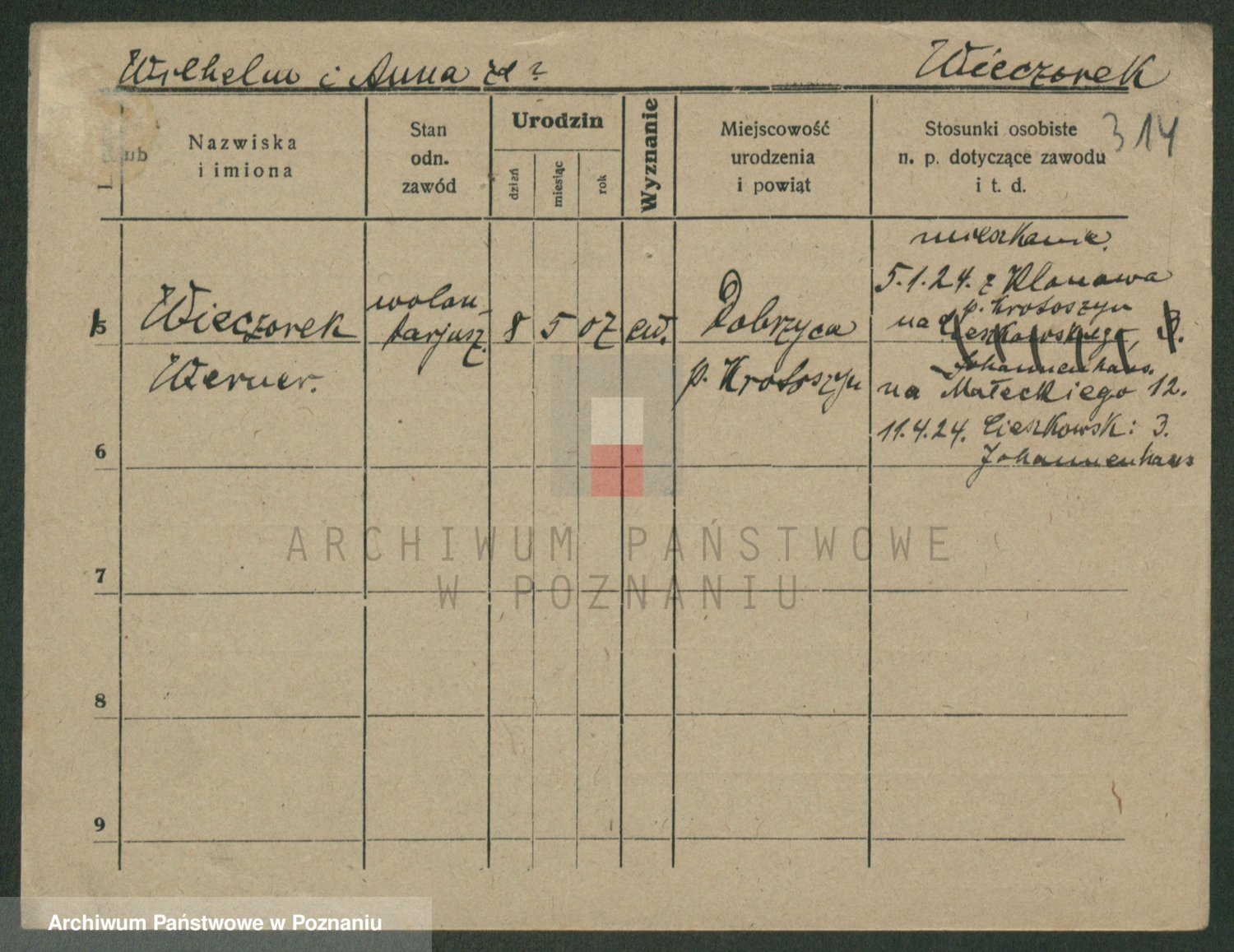 Podgląd karty osobowej dostępny jest po kliknięciu na nazwisko lub ikonkę karty. Można dokonywać powiększenia (ikony na górze) lub przechodzić między kolejnymi skanami (strzałki po bokach).