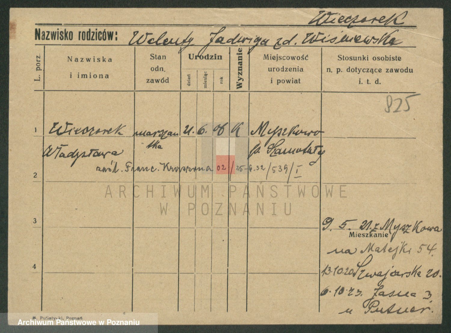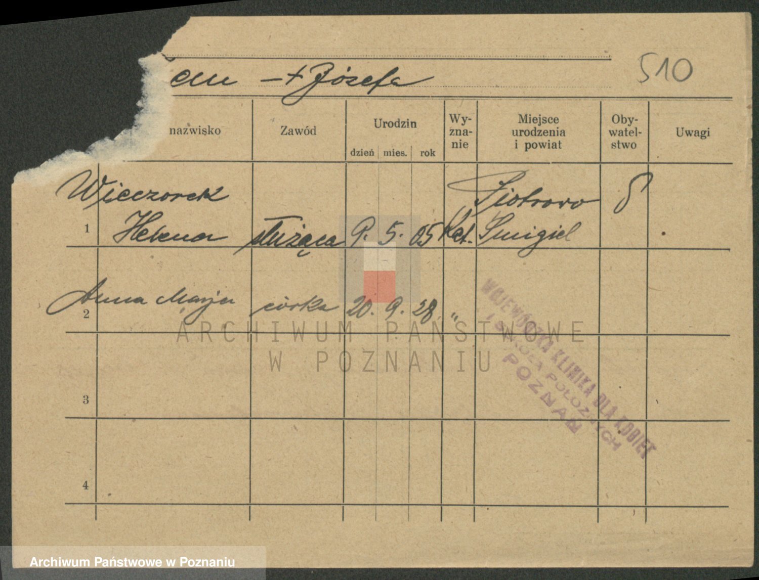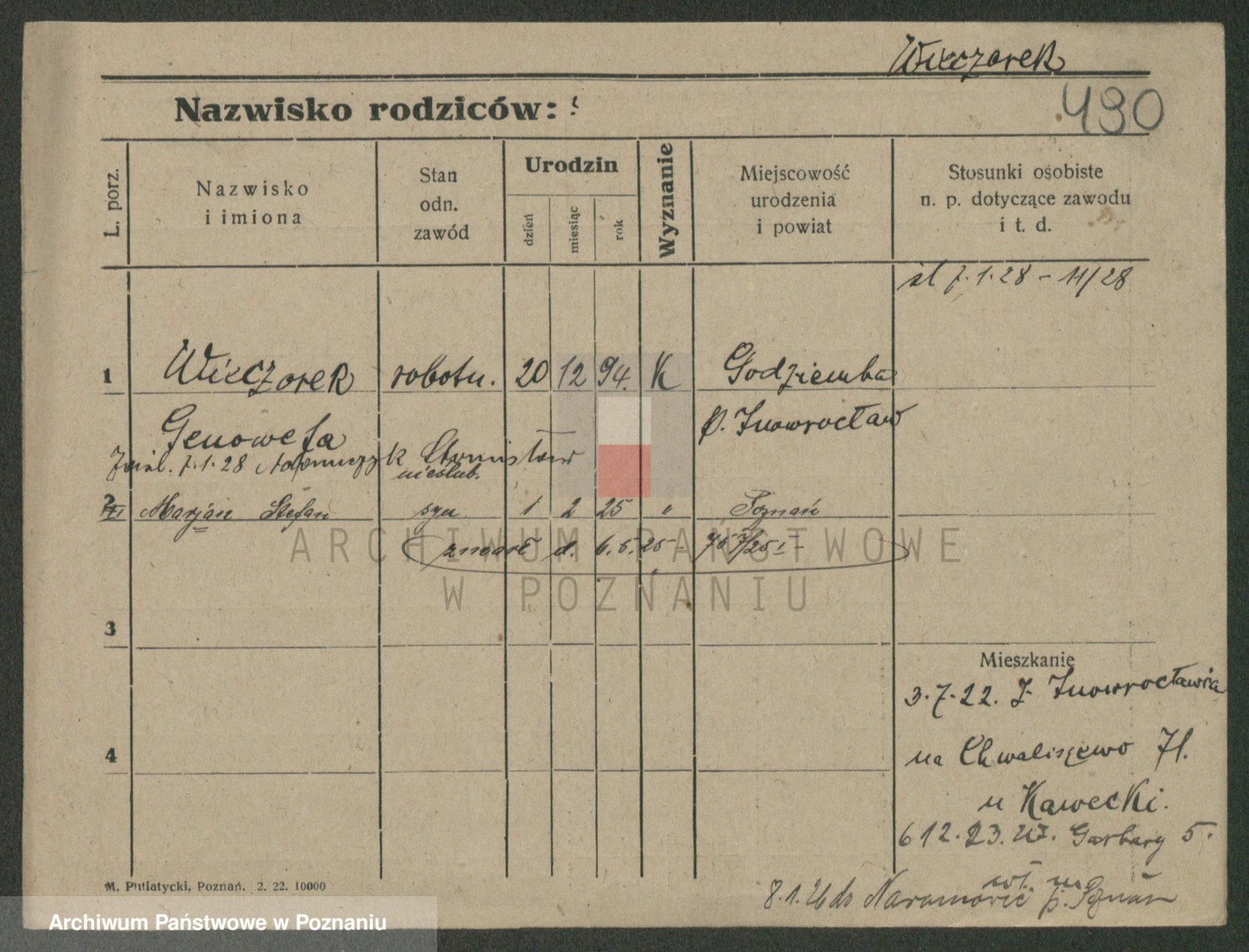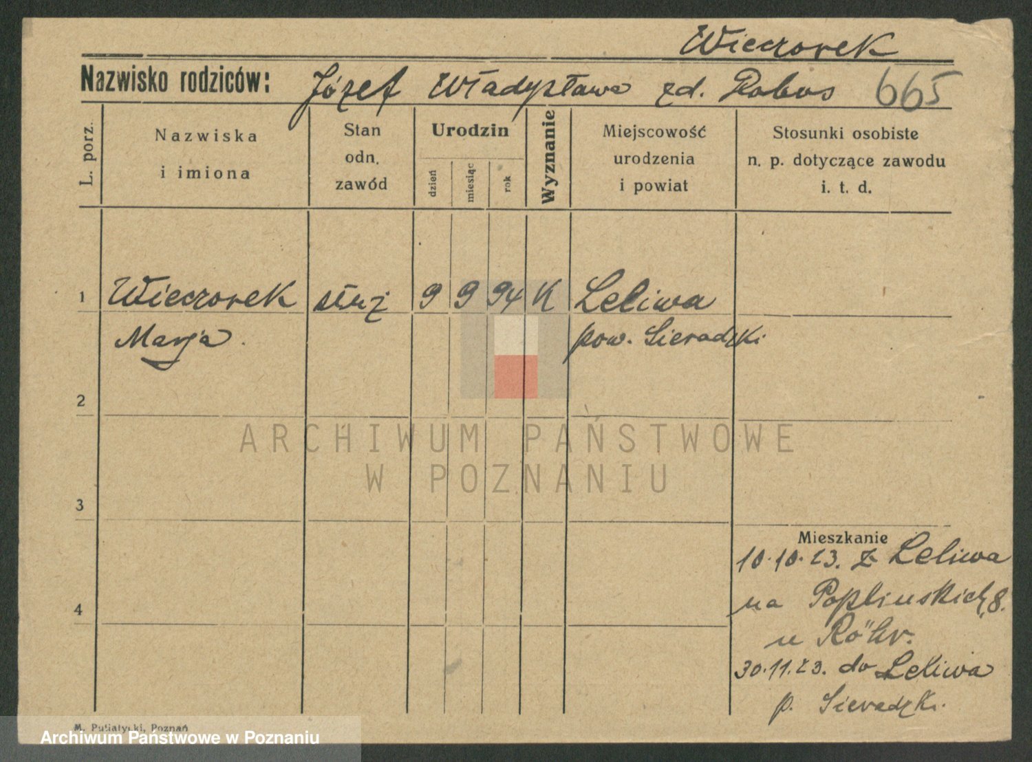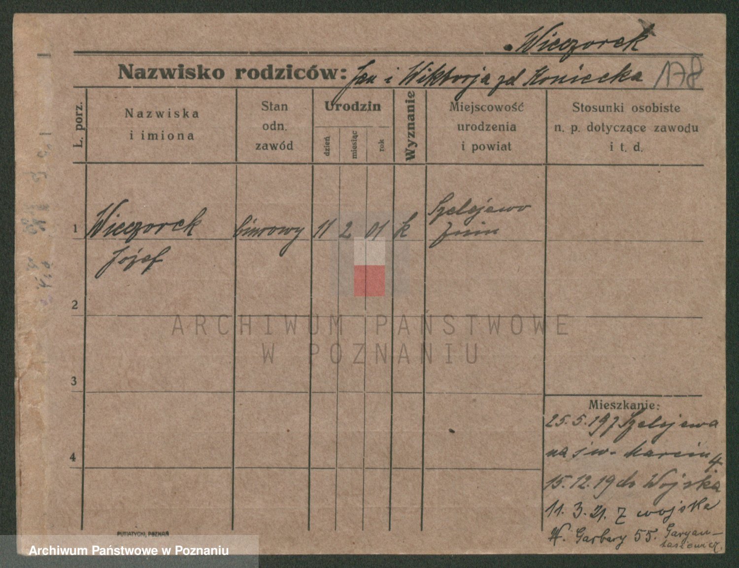 Podgląd karty osobowej dostępny jest po kliknięciu na nazwisko lub ikonkę karty. Można dokonywać powiększenia (ikony na górze) lub przechodzić między kolejnymi skanami (strzałki po bokach).