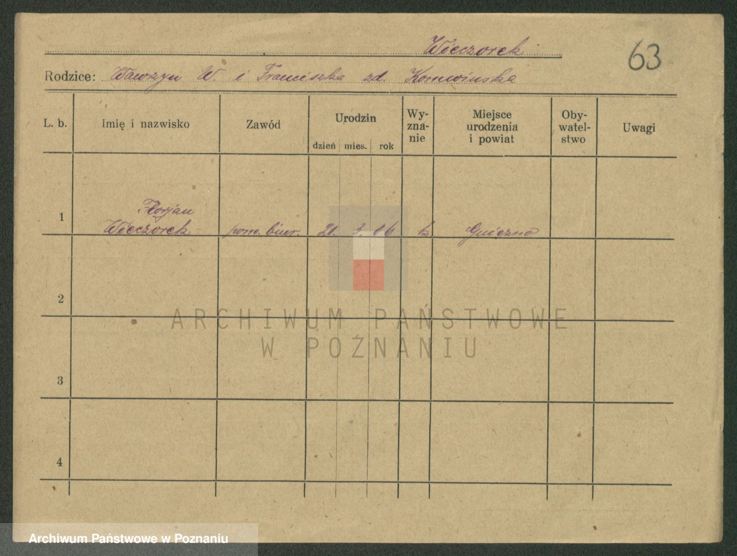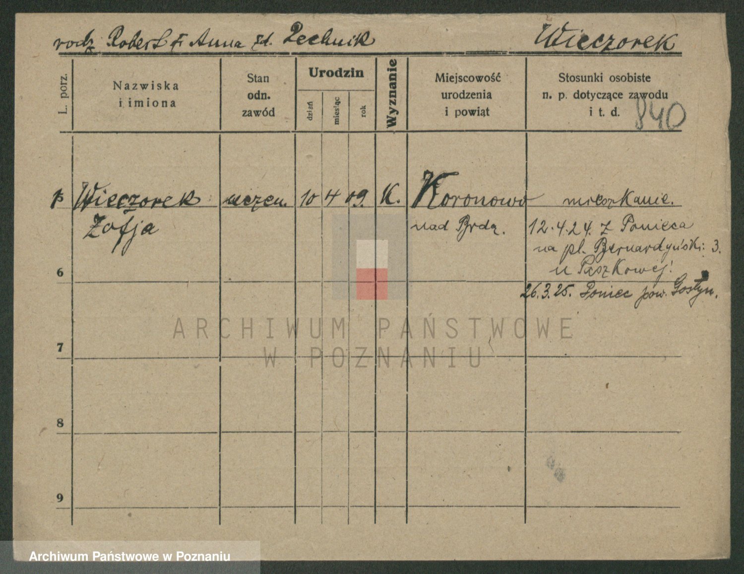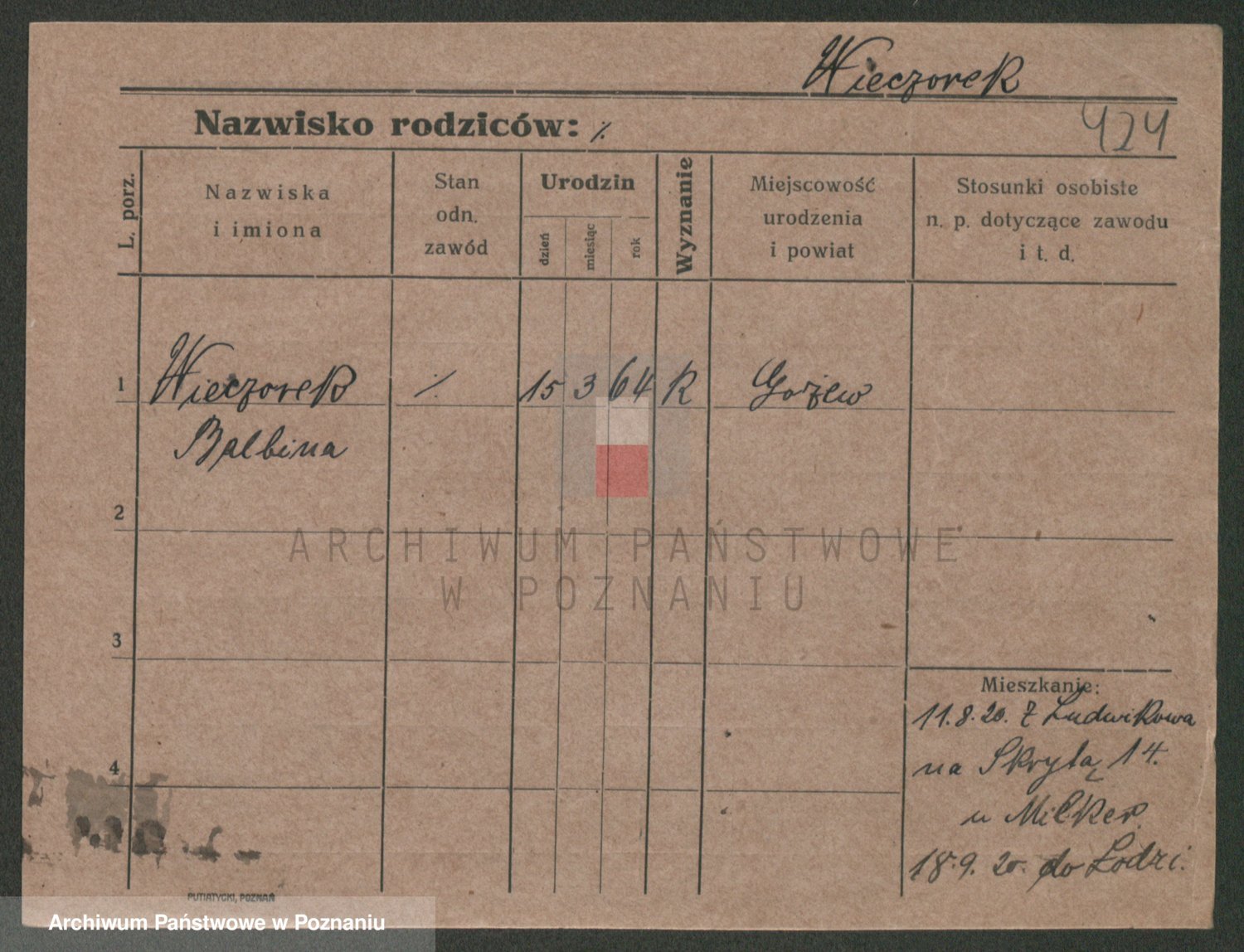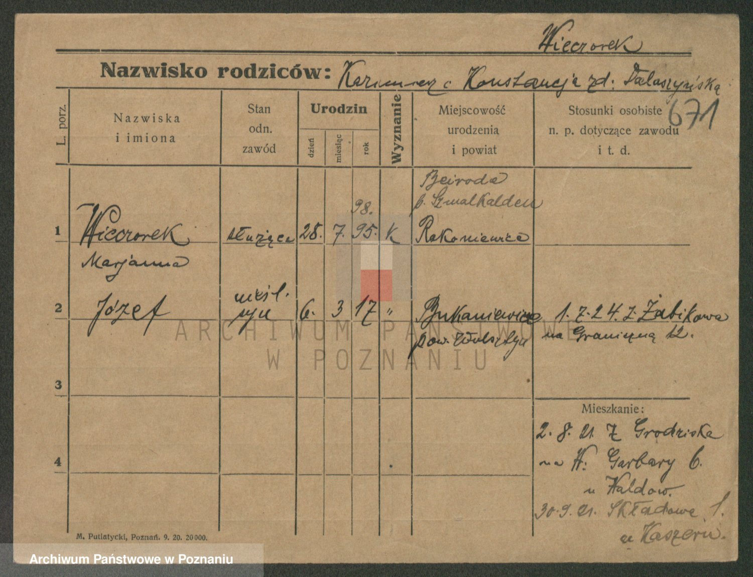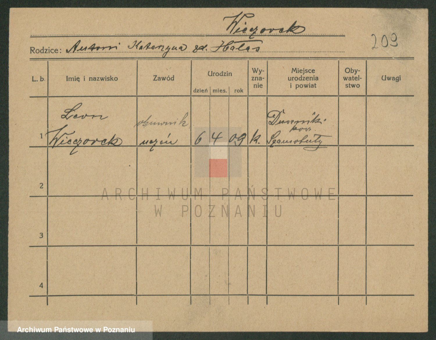Podgląd karty osobowej dostępny jest po kliknięciu na nazwisko lub ikonkę karty. Można dokonywać powiększenia (ikony na górze) lub przechodzić między kolejnymi skanami (strzałki po bokach).