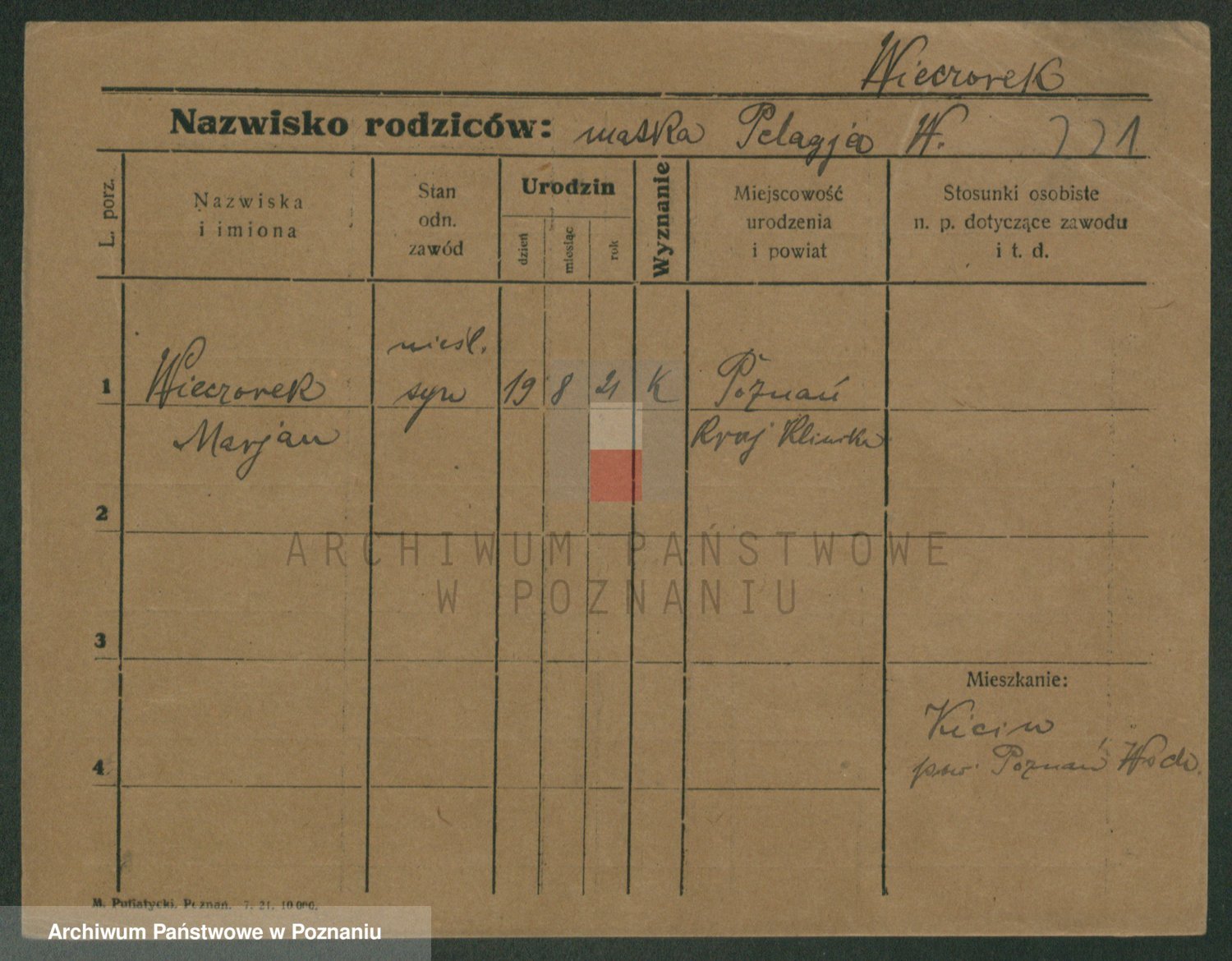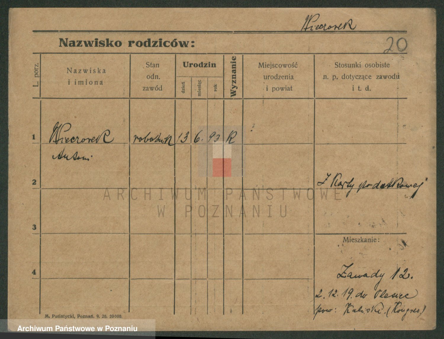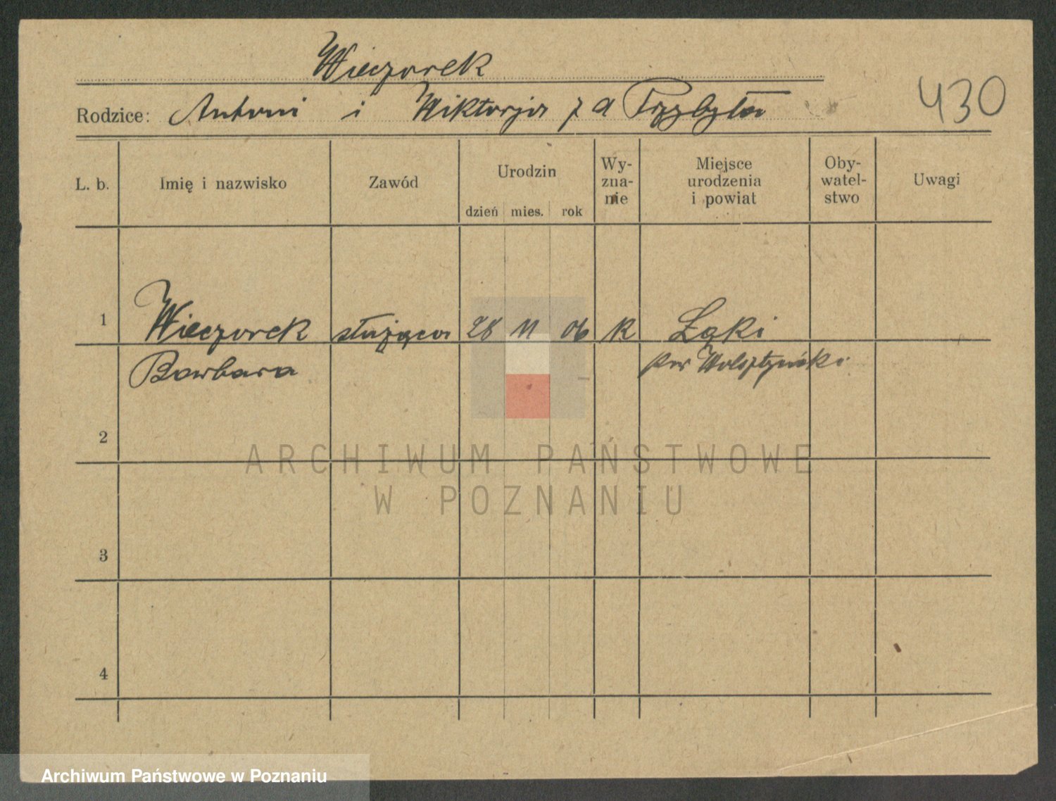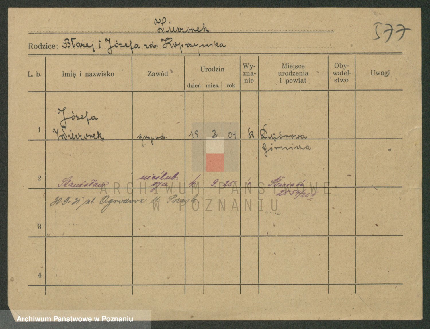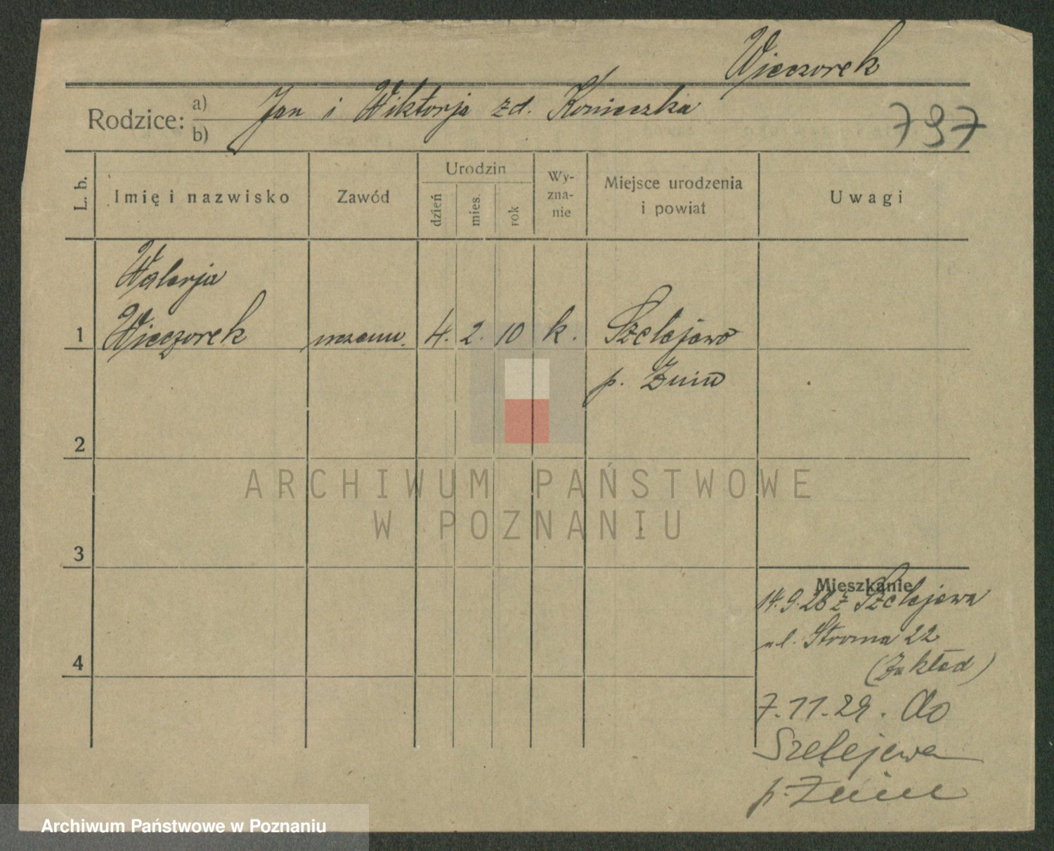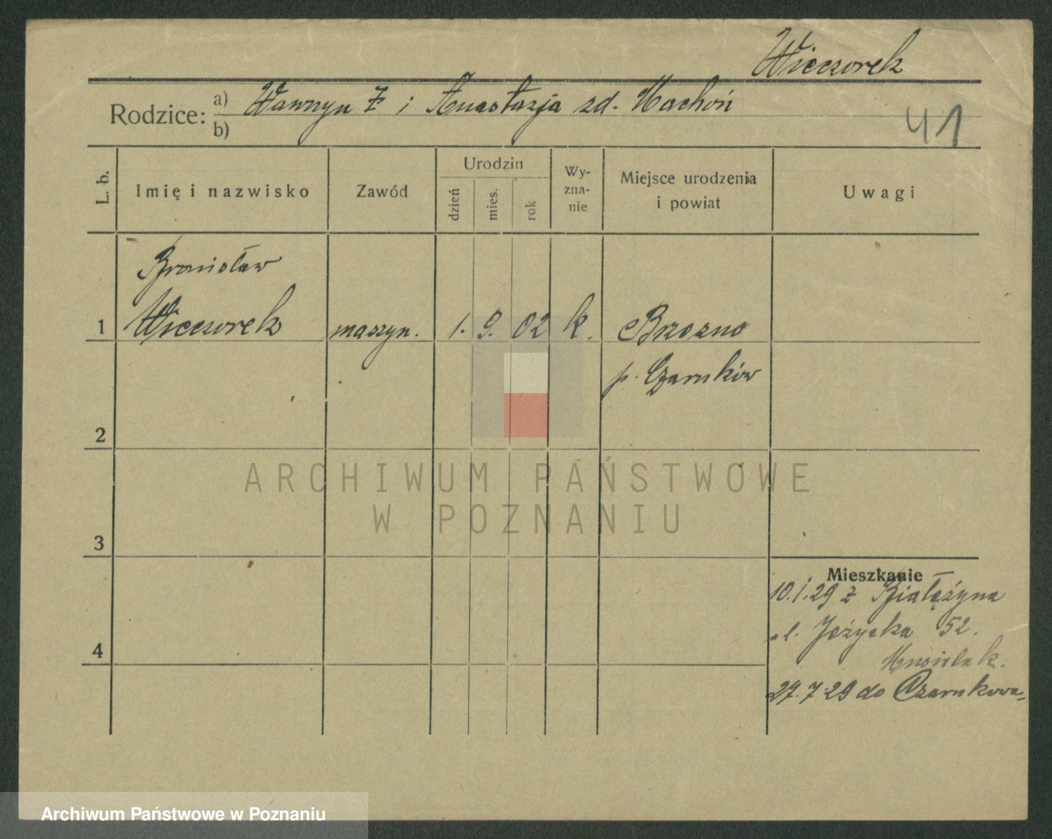 Podgląd karty osobowej dostępny jest po kliknięciu na nazwisko lub ikonkę karty. Można dokonywać powiększenia (ikony na górze) lub przechodzić między kolejnymi skanami (strzałki po bokach).