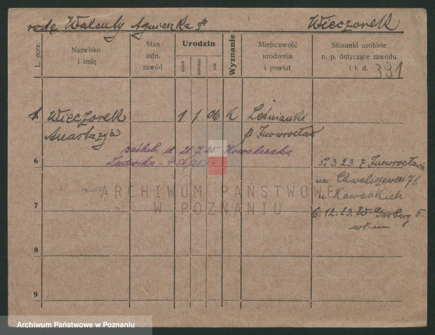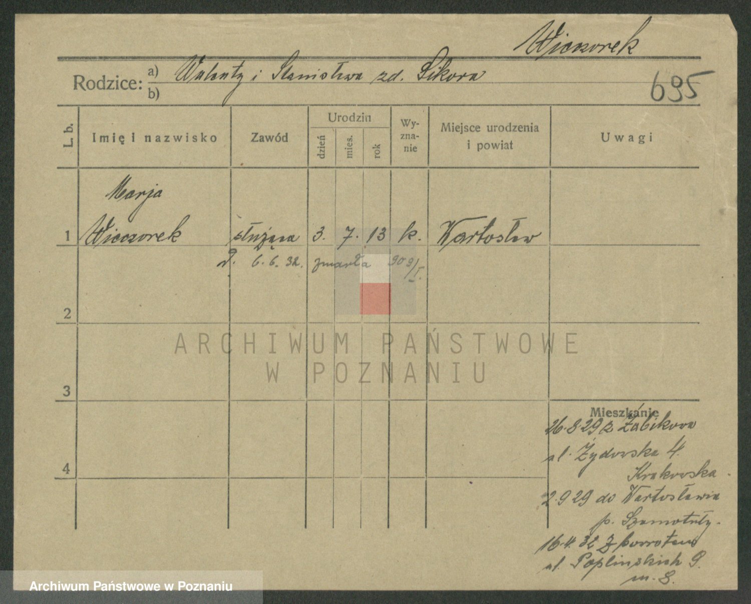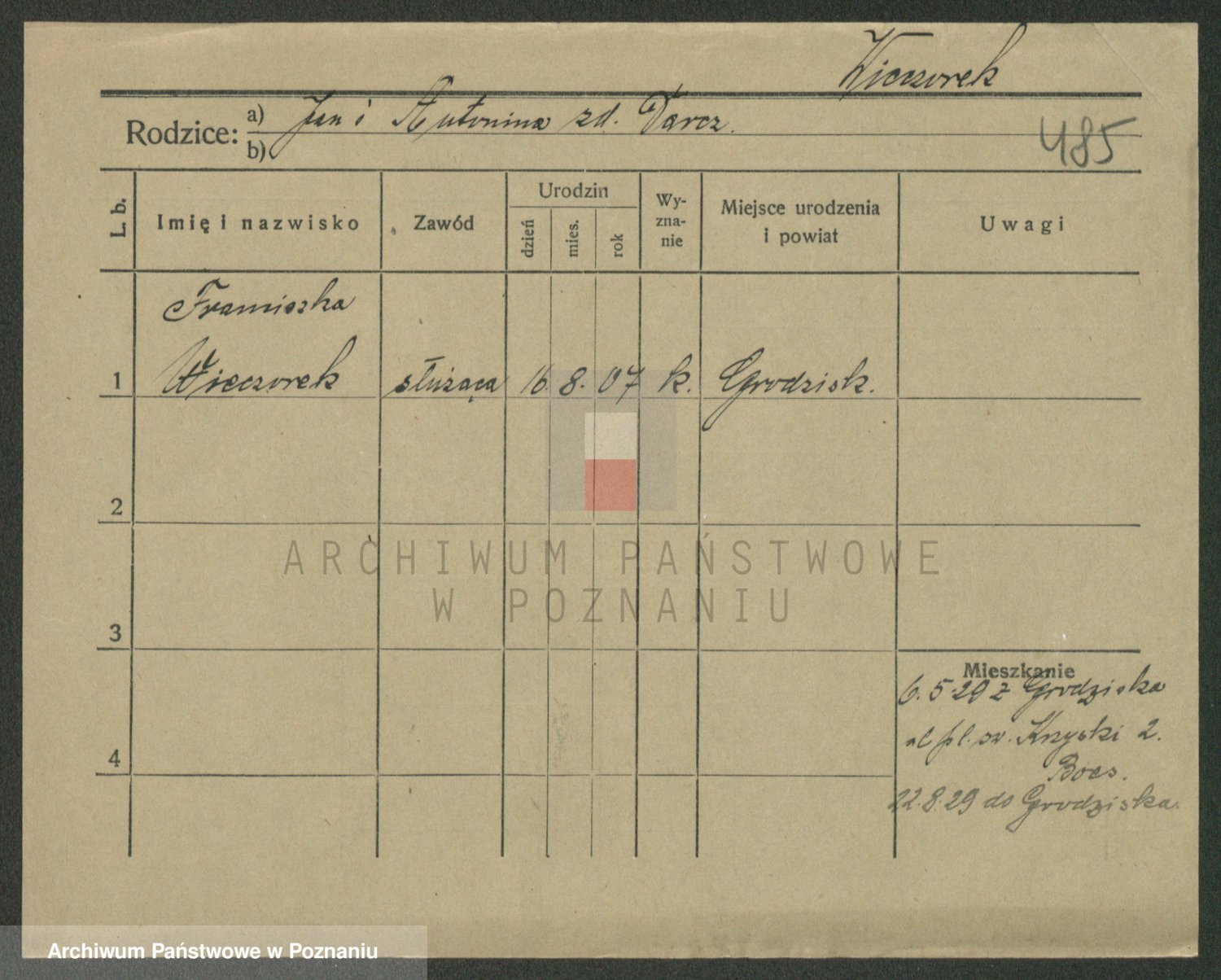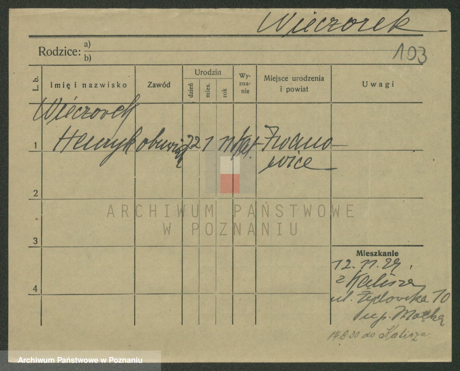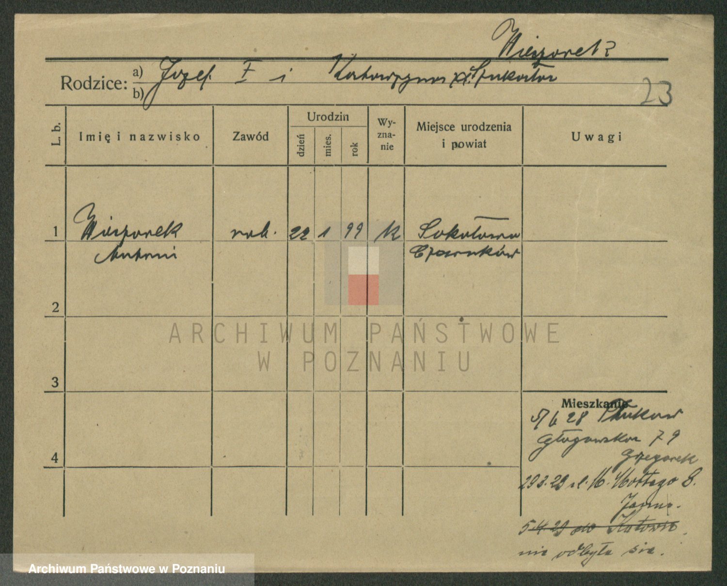 Podgląd karty osobowej dostępny jest po kliknięciu na nazwisko lub ikonkę karty. Można dokonywać powiększenia (ikony na górze) lub przechodzić między kolejnymi skanami (strzałki po bokach).