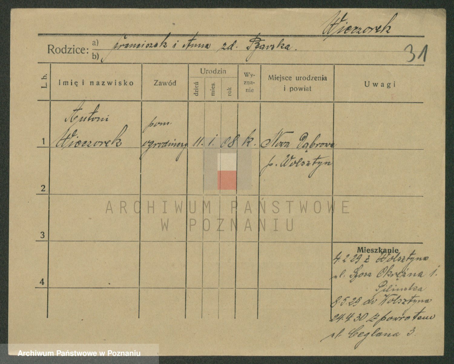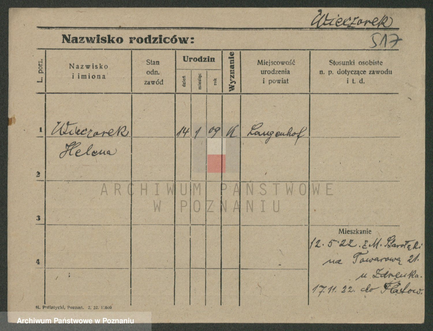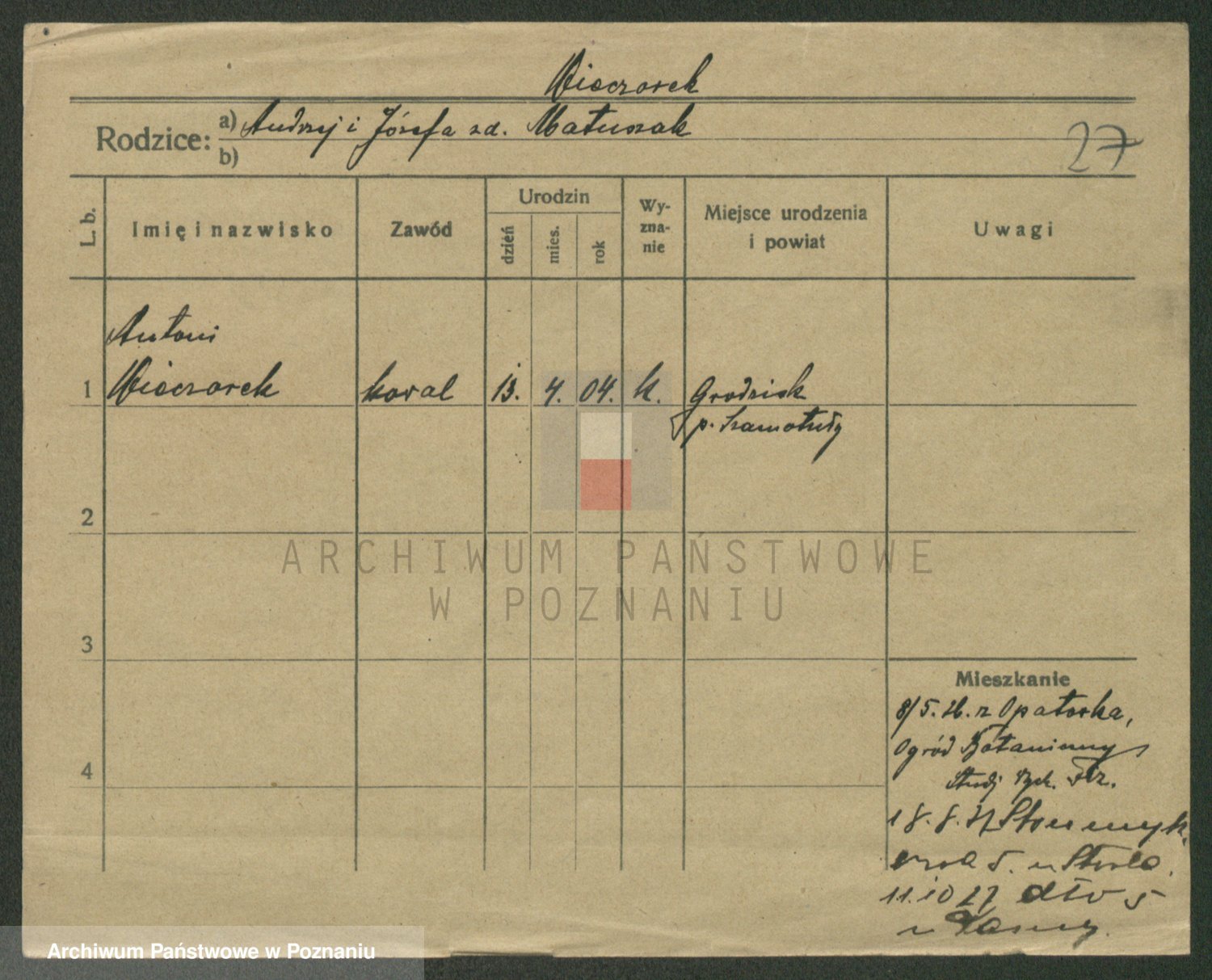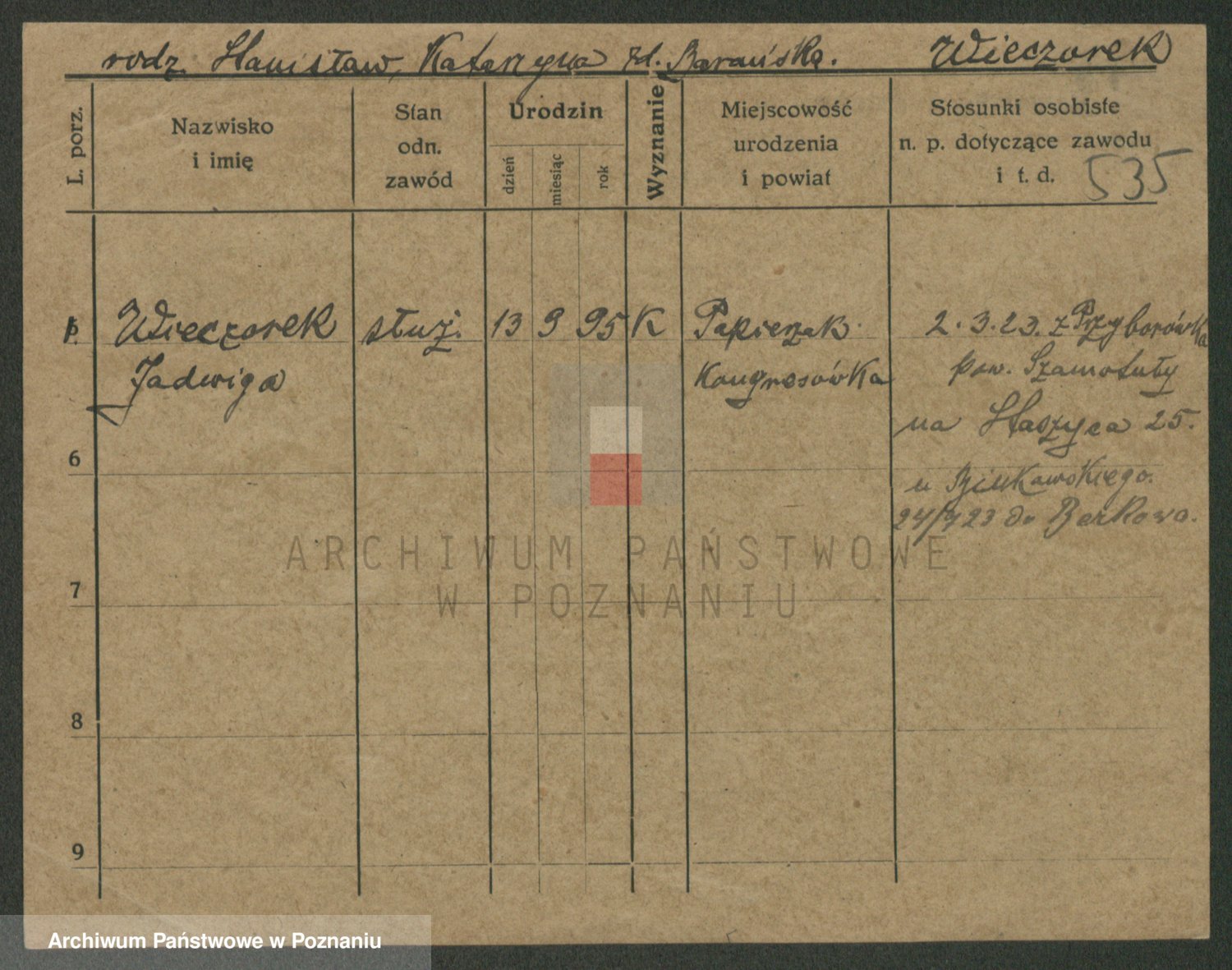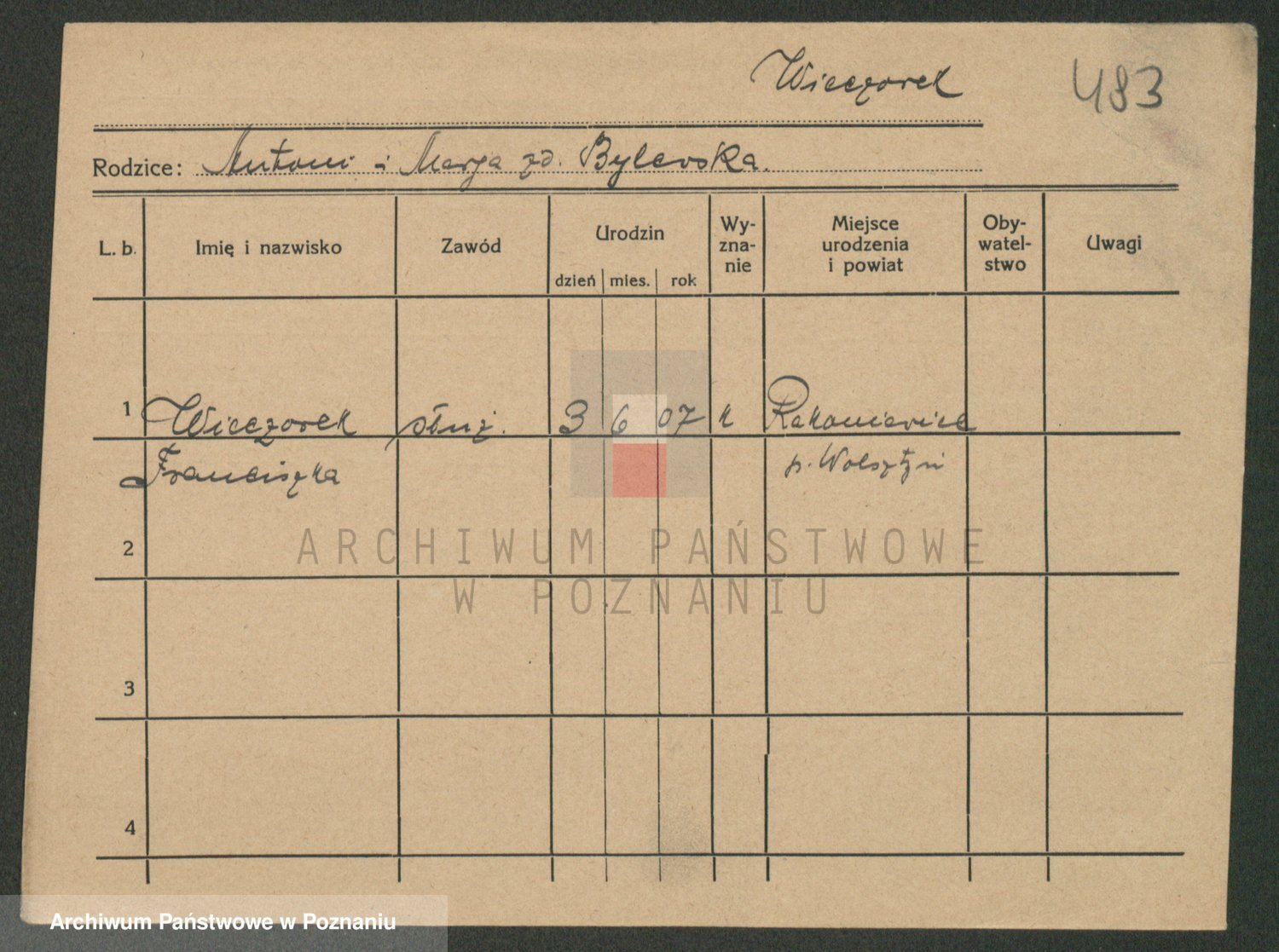 Podgląd karty osobowej dostępny jest po kliknięciu na nazwisko lub ikonkę karty. Można dokonywać powiększenia (ikony na górze) lub przechodzić między kolejnymi skanami (strzałki po bokach).