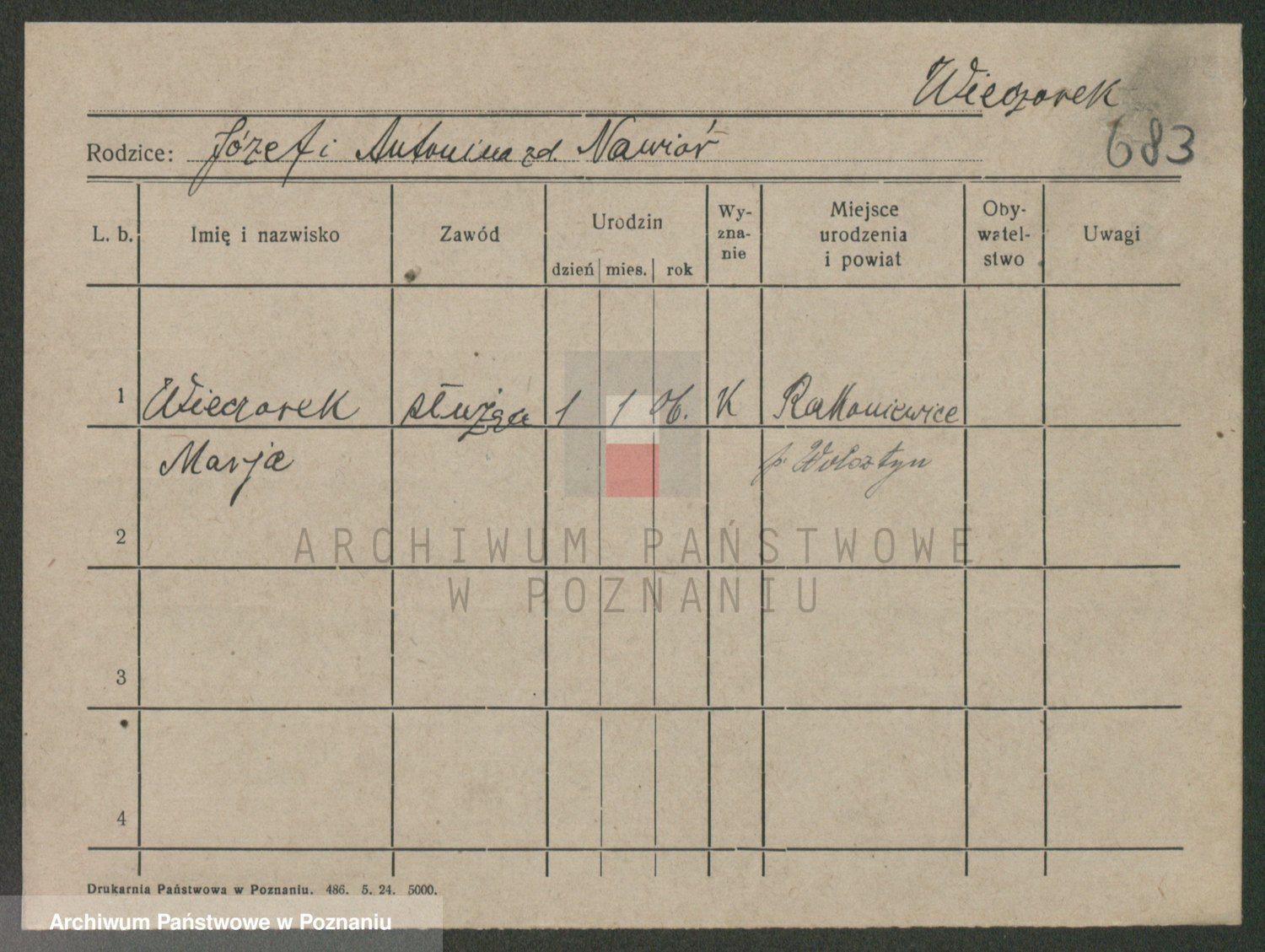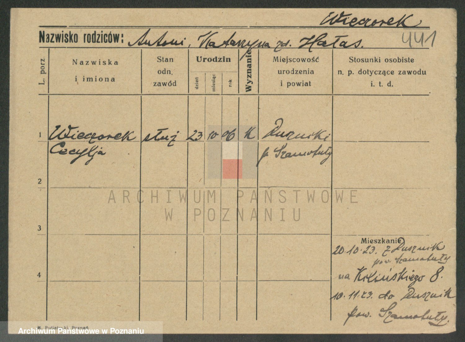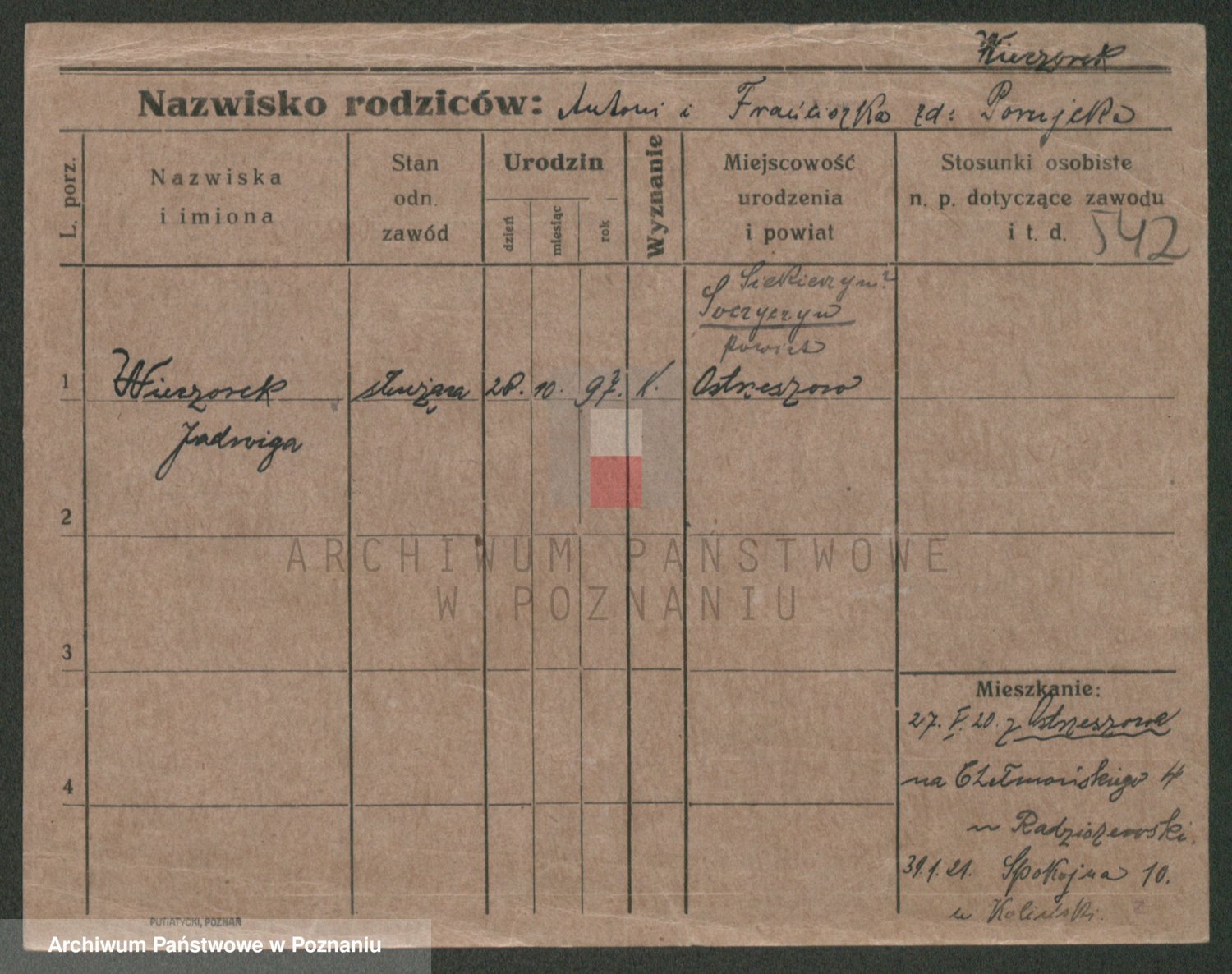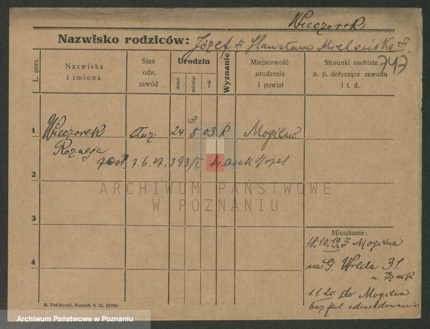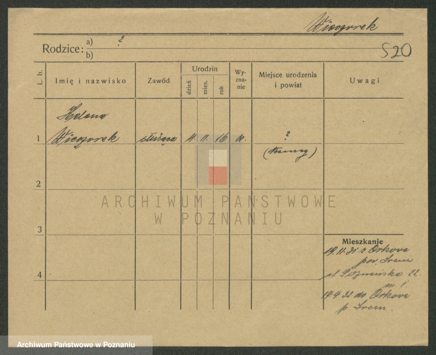 Podgląd karty osobowej dostępny jest po kliknięciu na nazwisko lub ikonkę karty. Można dokonywać powiększenia (ikony na górze) lub przechodzić między kolejnymi skanami (strzałki po bokach).