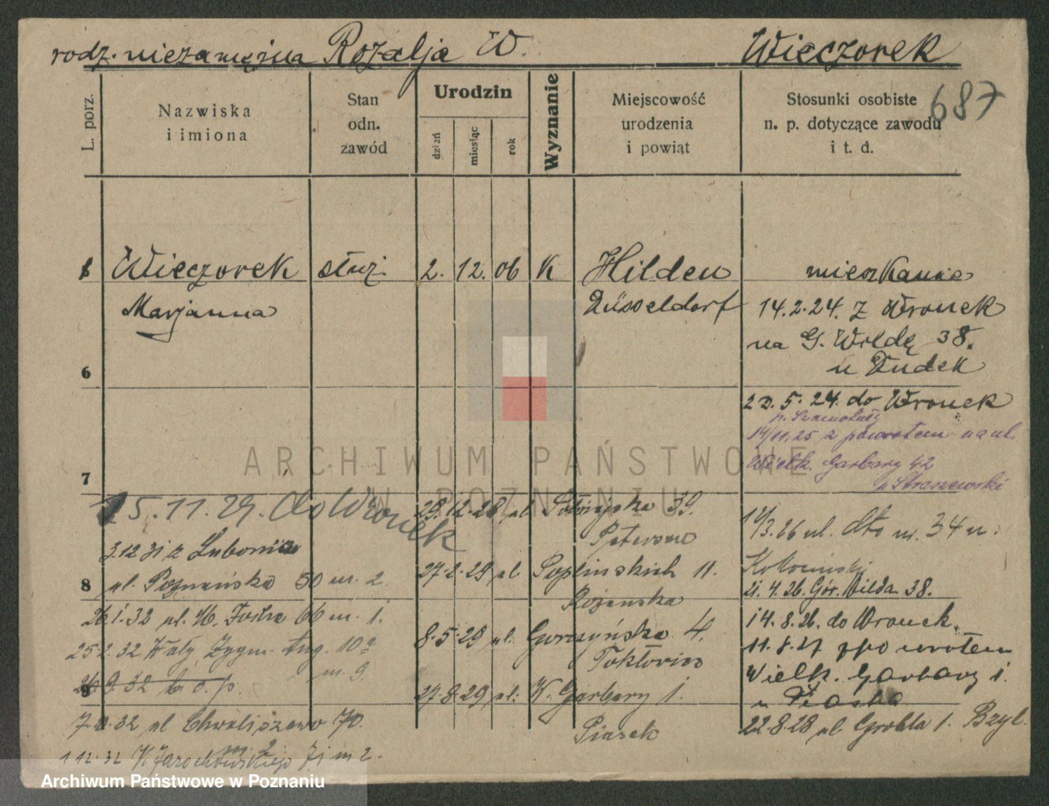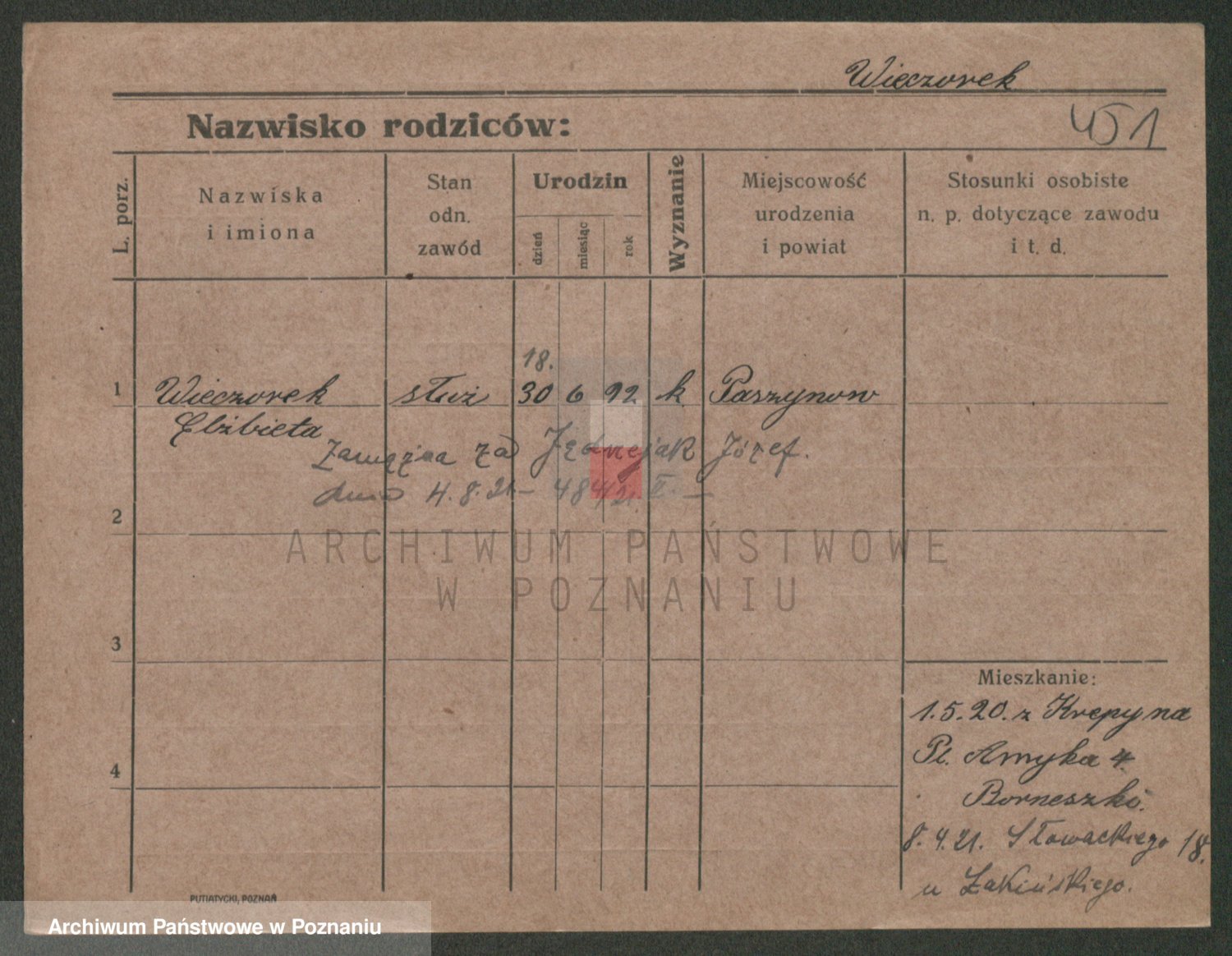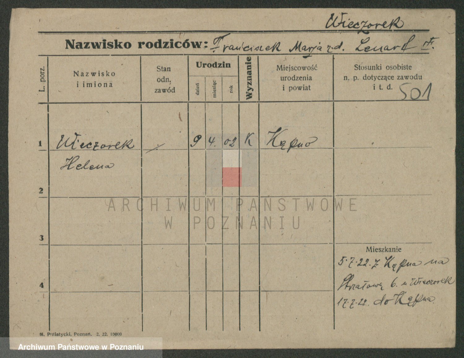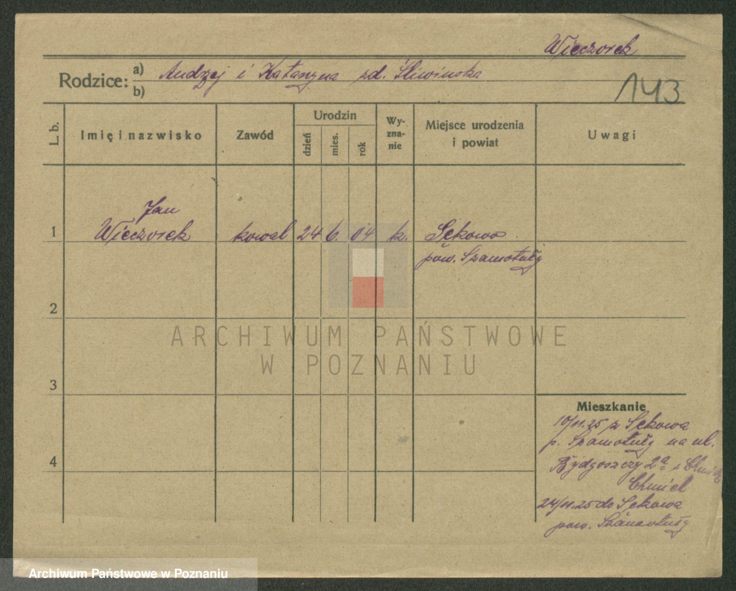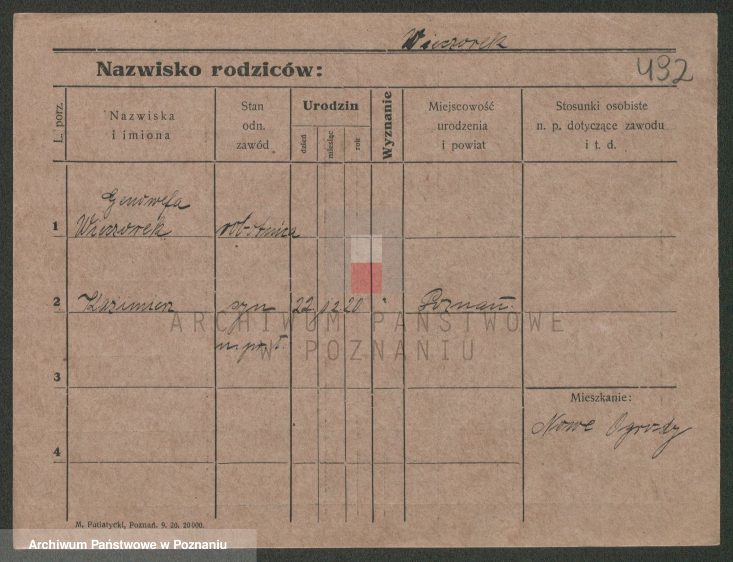 Podgląd karty osobowej dostępny jest po kliknięciu na nazwisko lub ikonkę karty. Można dokonywać powiększenia (ikony na górze) lub przechodzić między kolejnymi skanami (strzałki po bokach).