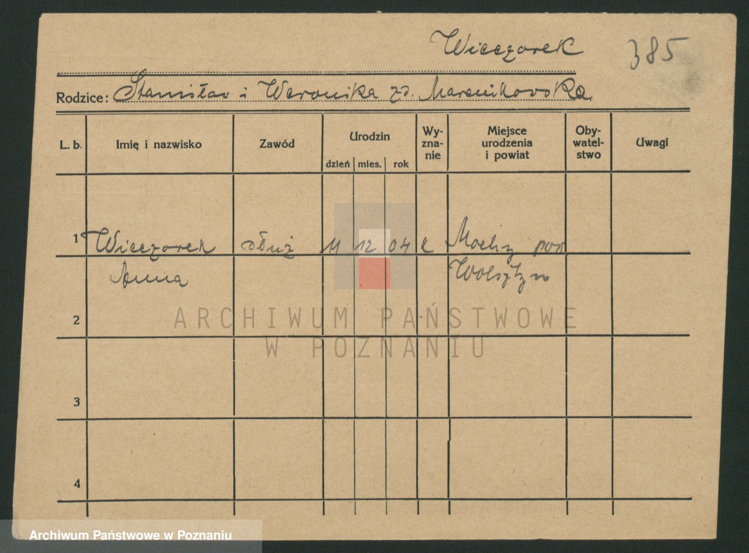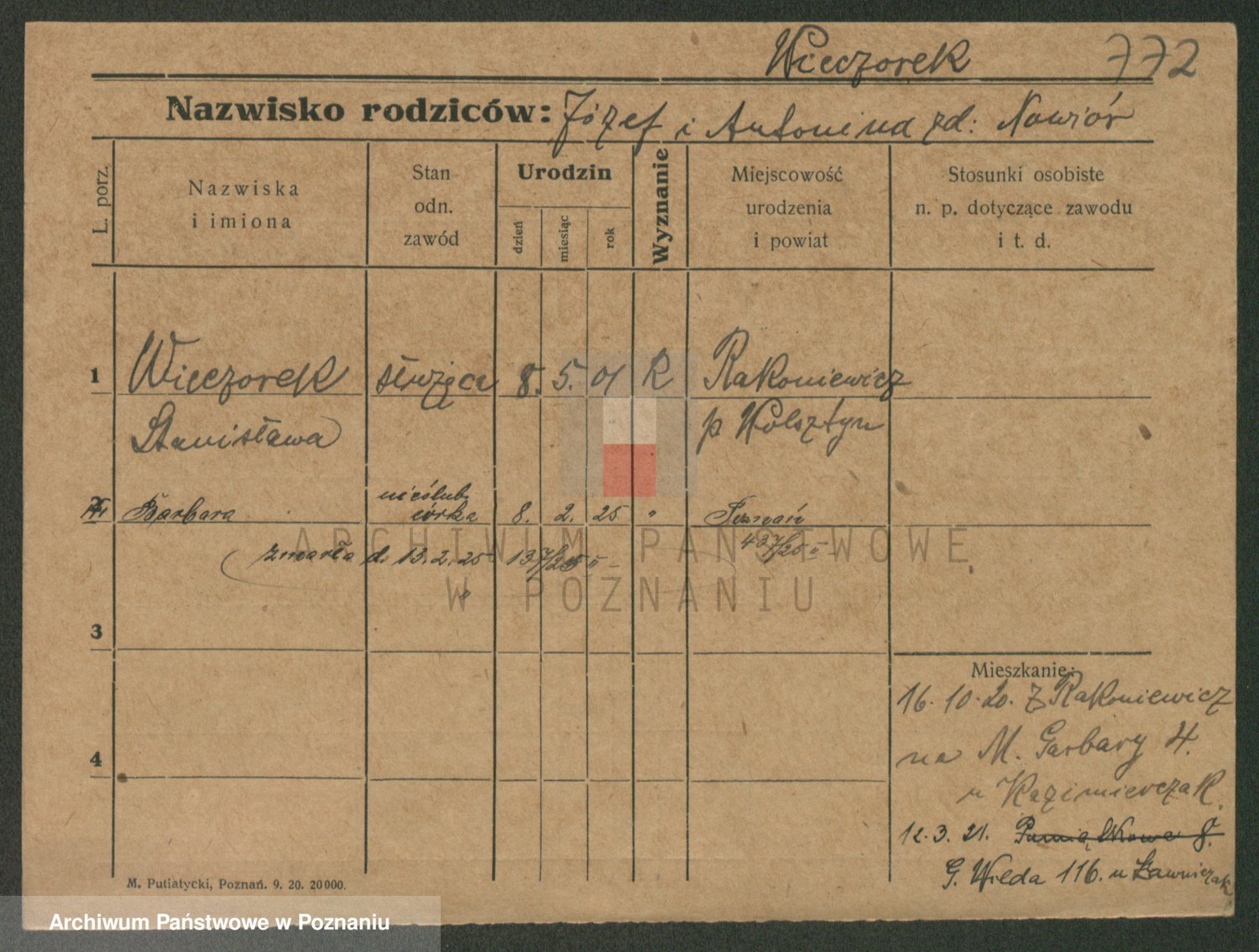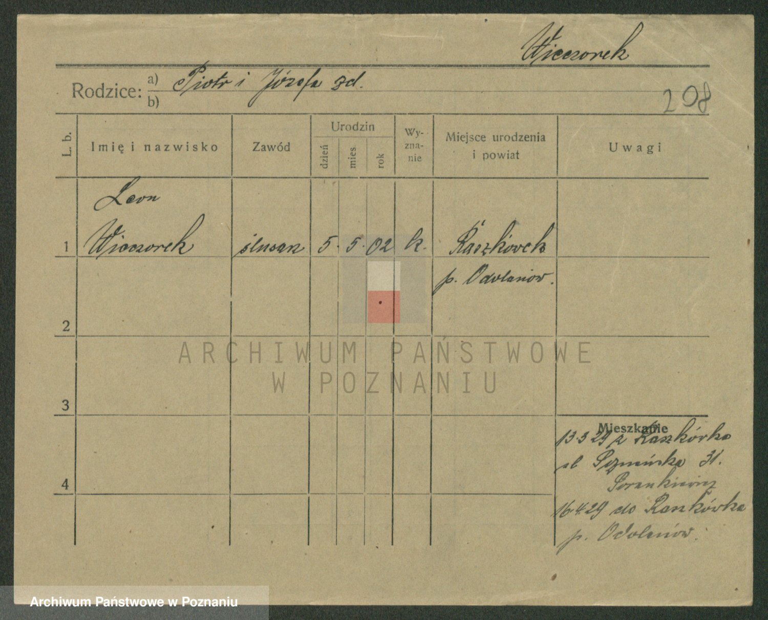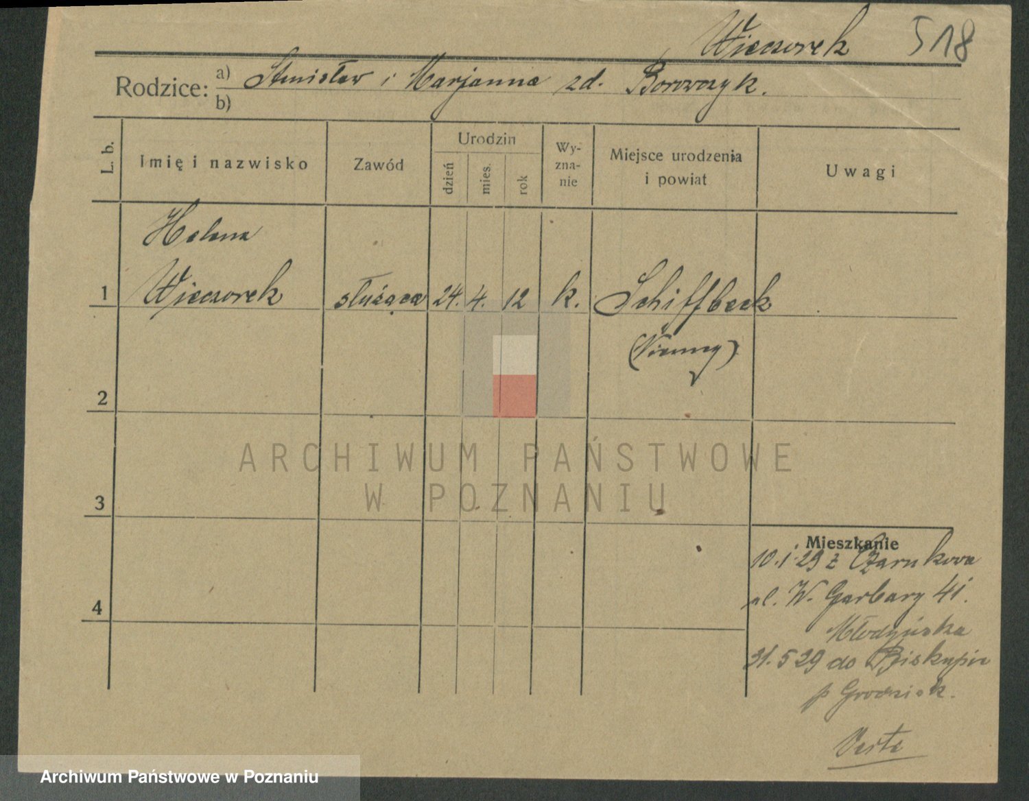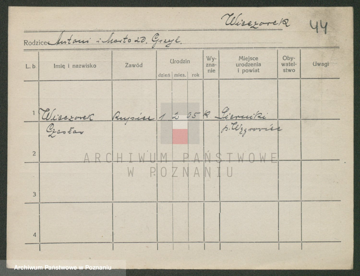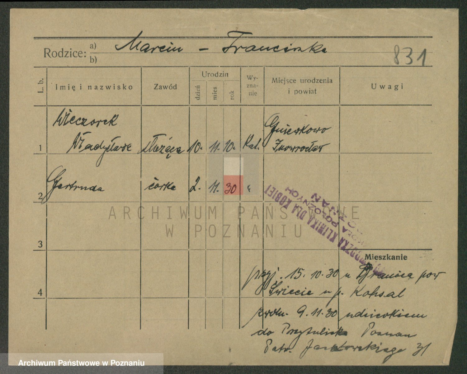 Podgląd karty osobowej dostępny jest po kliknięciu na nazwisko lub ikonkę karty. Można dokonywać powiększenia (ikony na górze) lub przechodzić między kolejnymi skanami (strzałki po bokach).