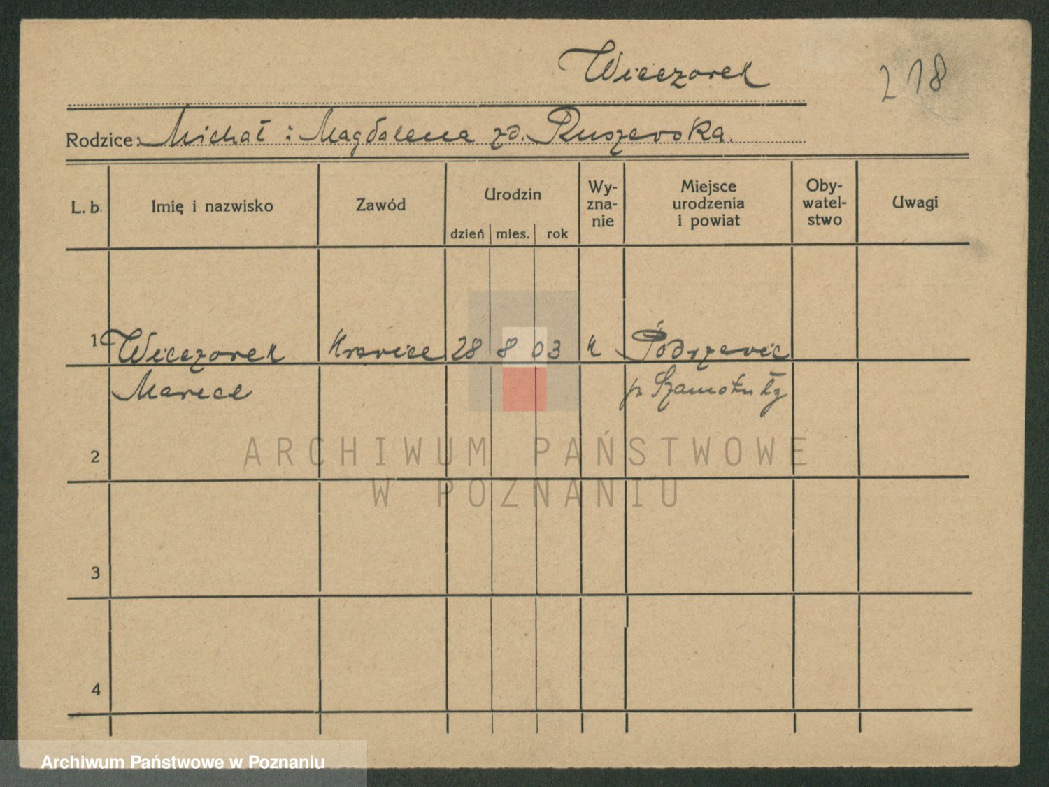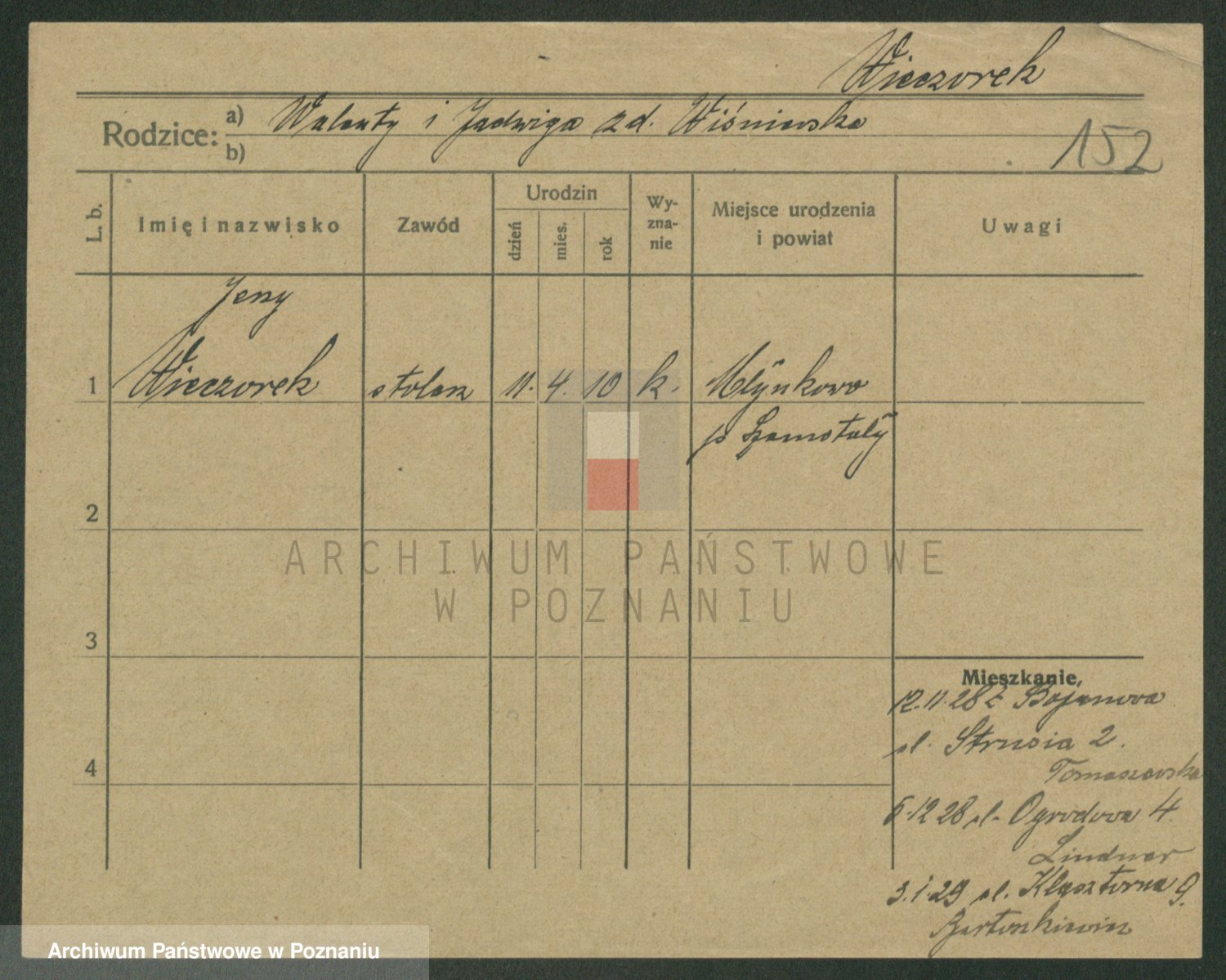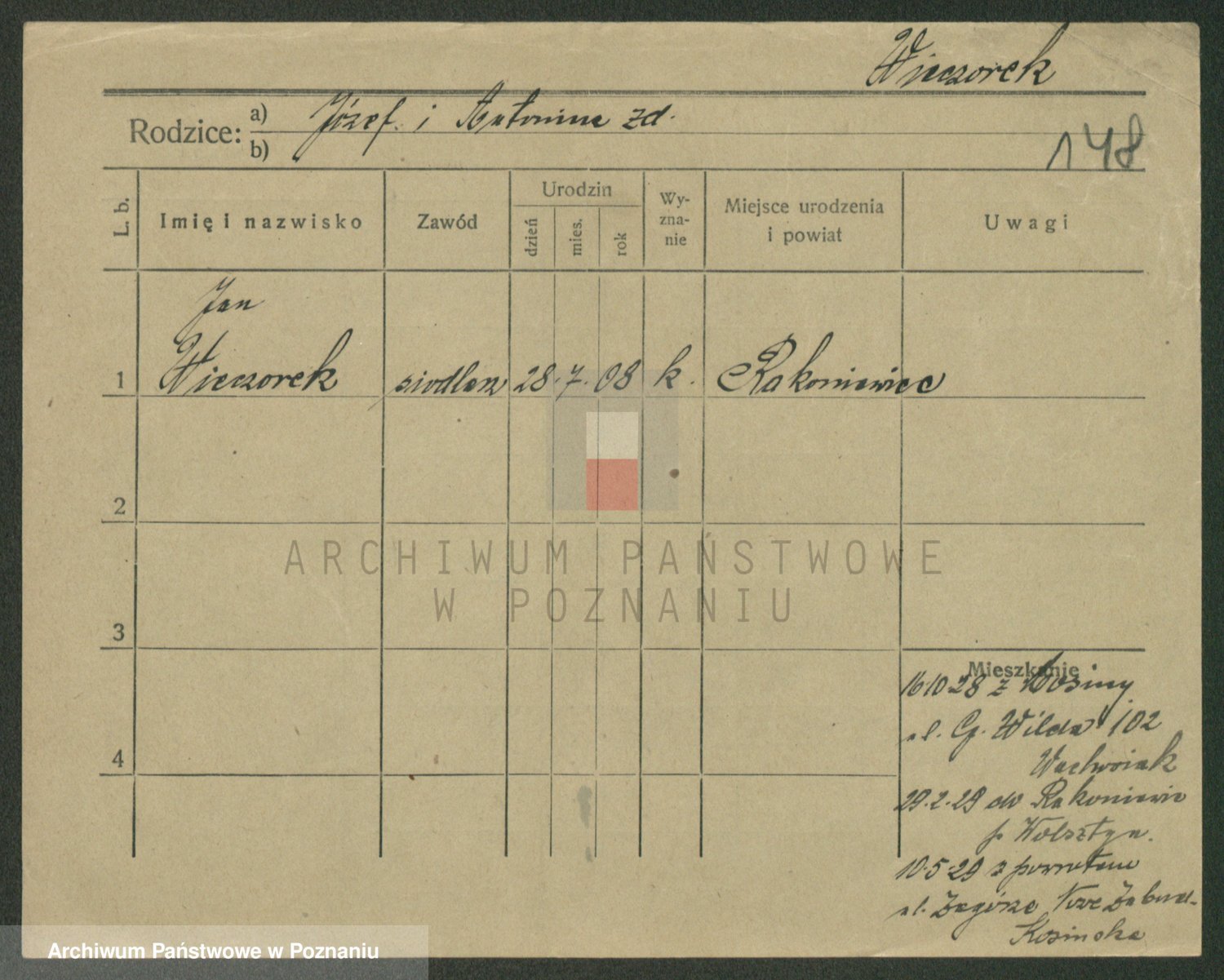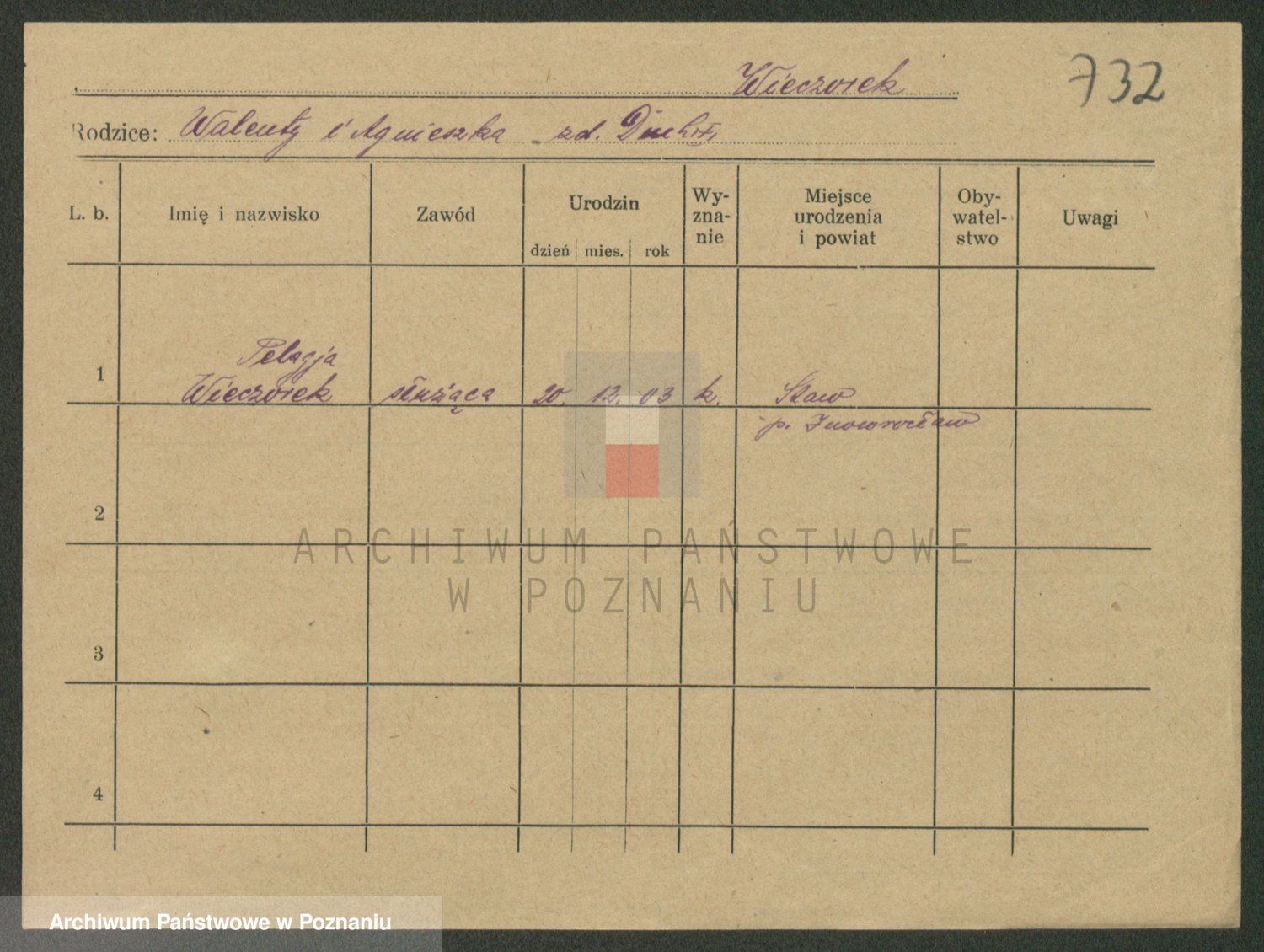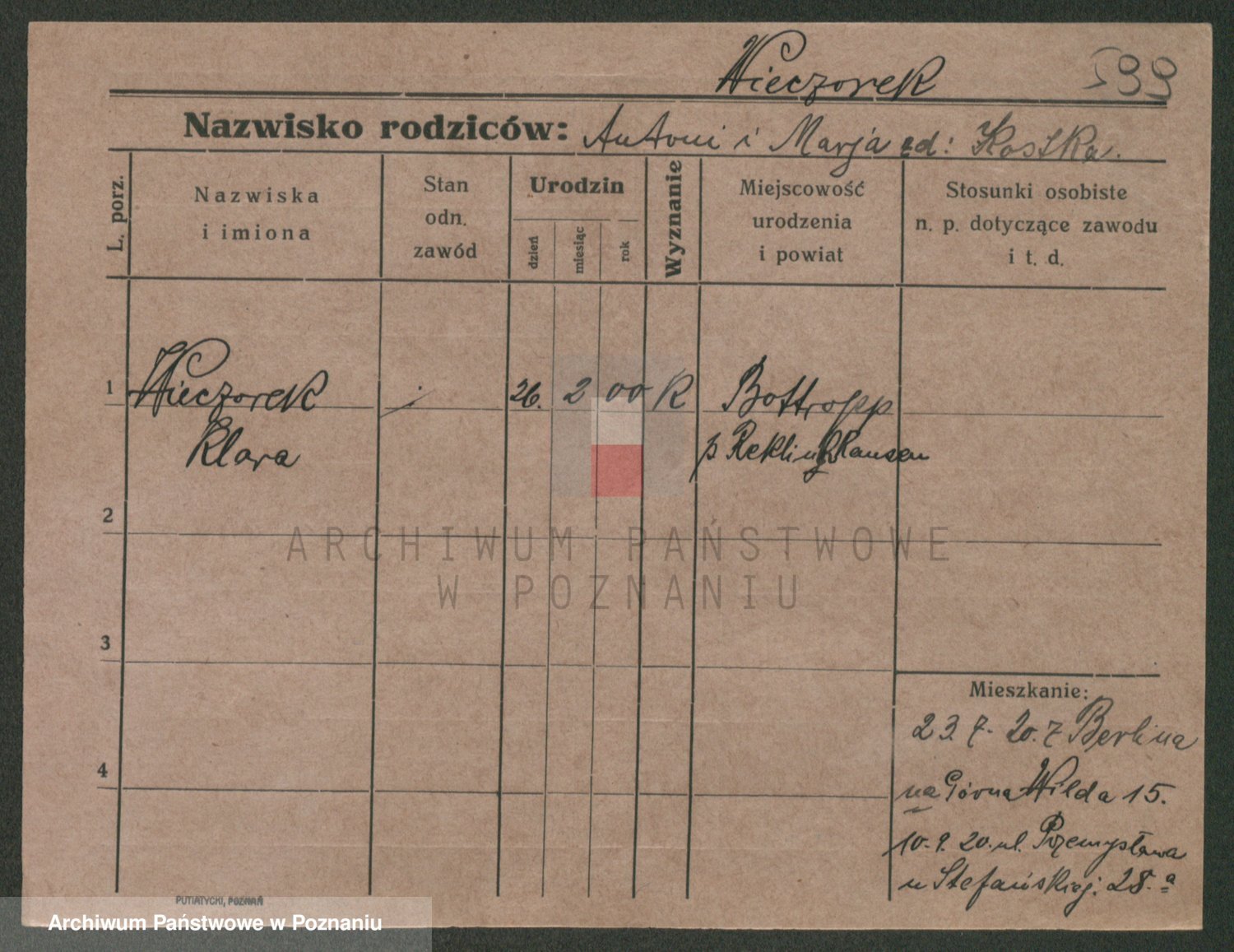 Podgląd karty osobowej dostępny jest po kliknięciu na nazwisko lub ikonkę karty. Można dokonywać powiększenia (ikony na górze) lub przechodzić między kolejnymi skanami (strzałki po bokach).