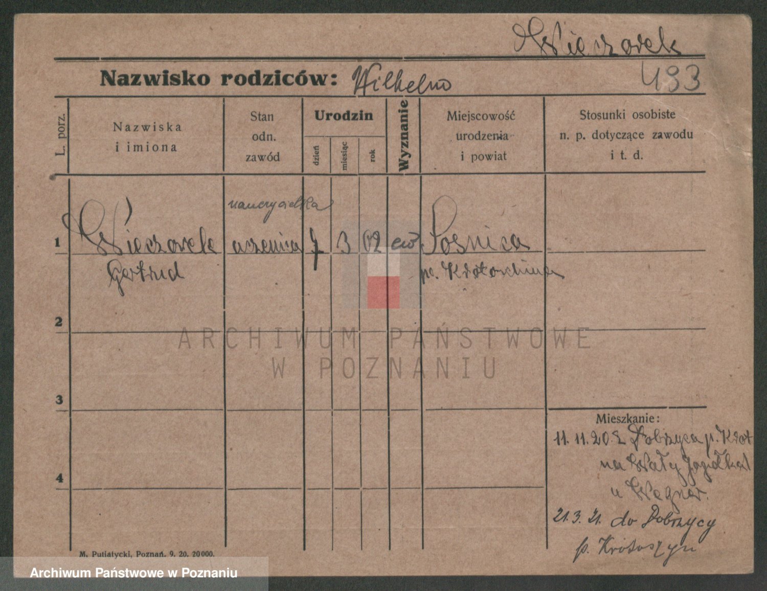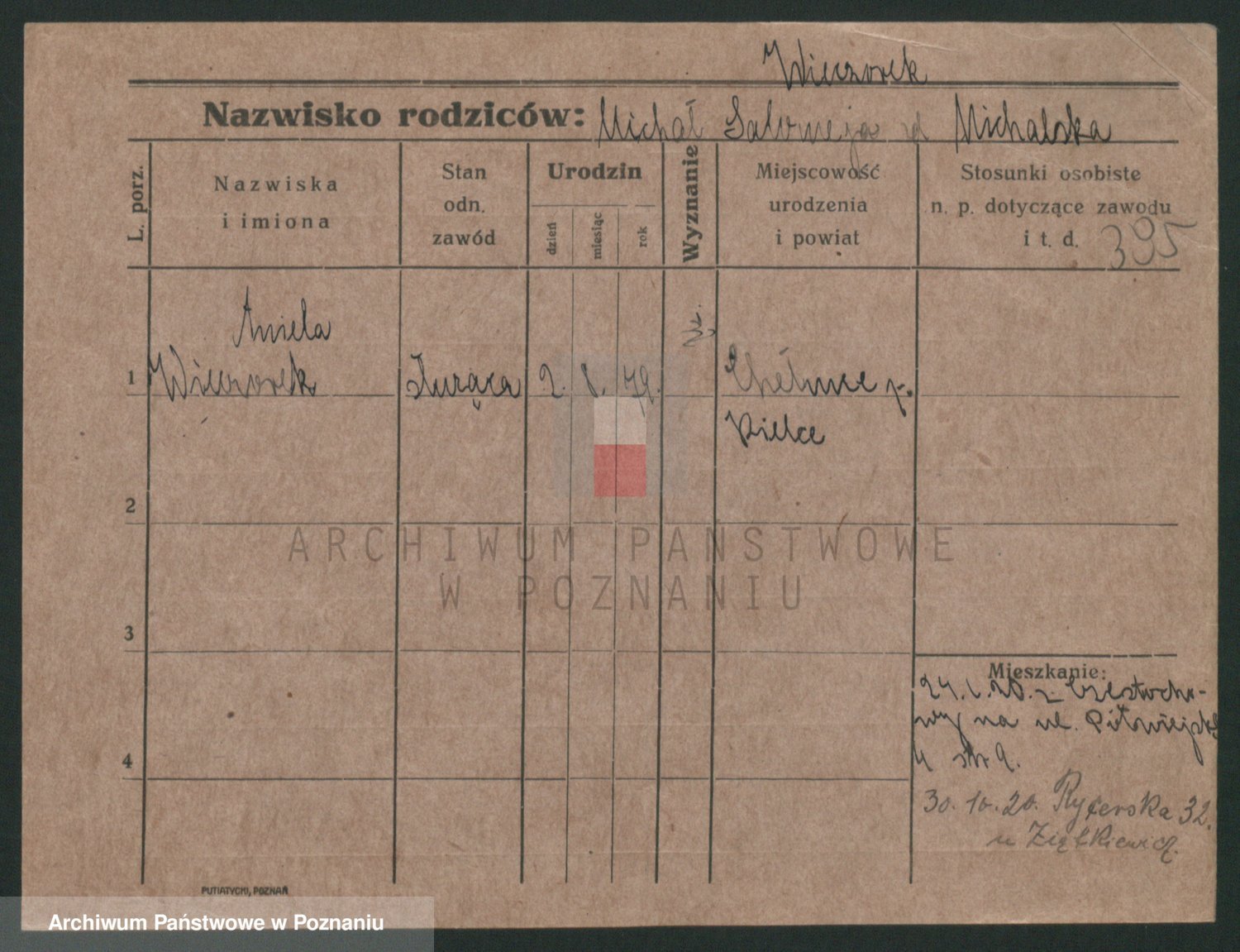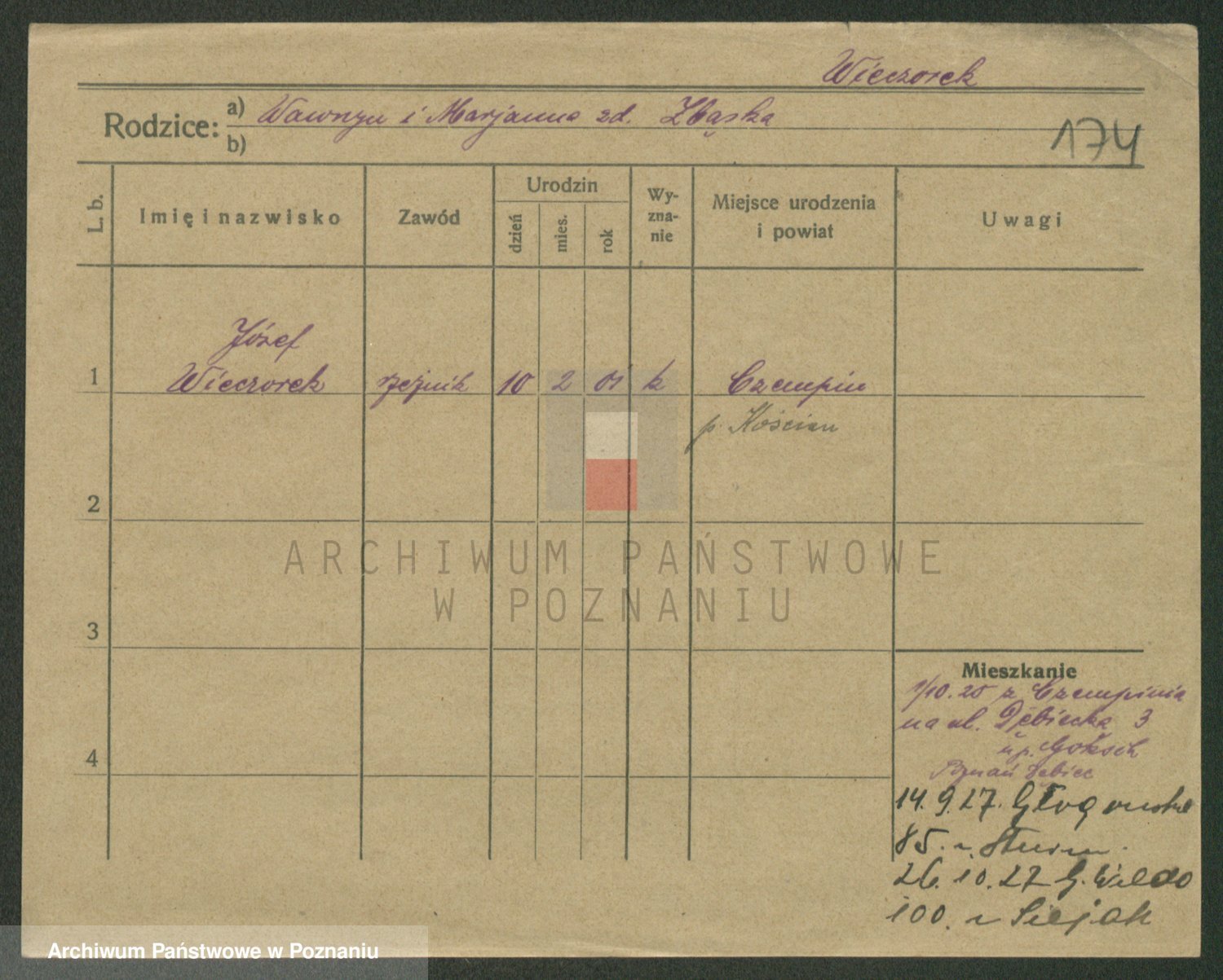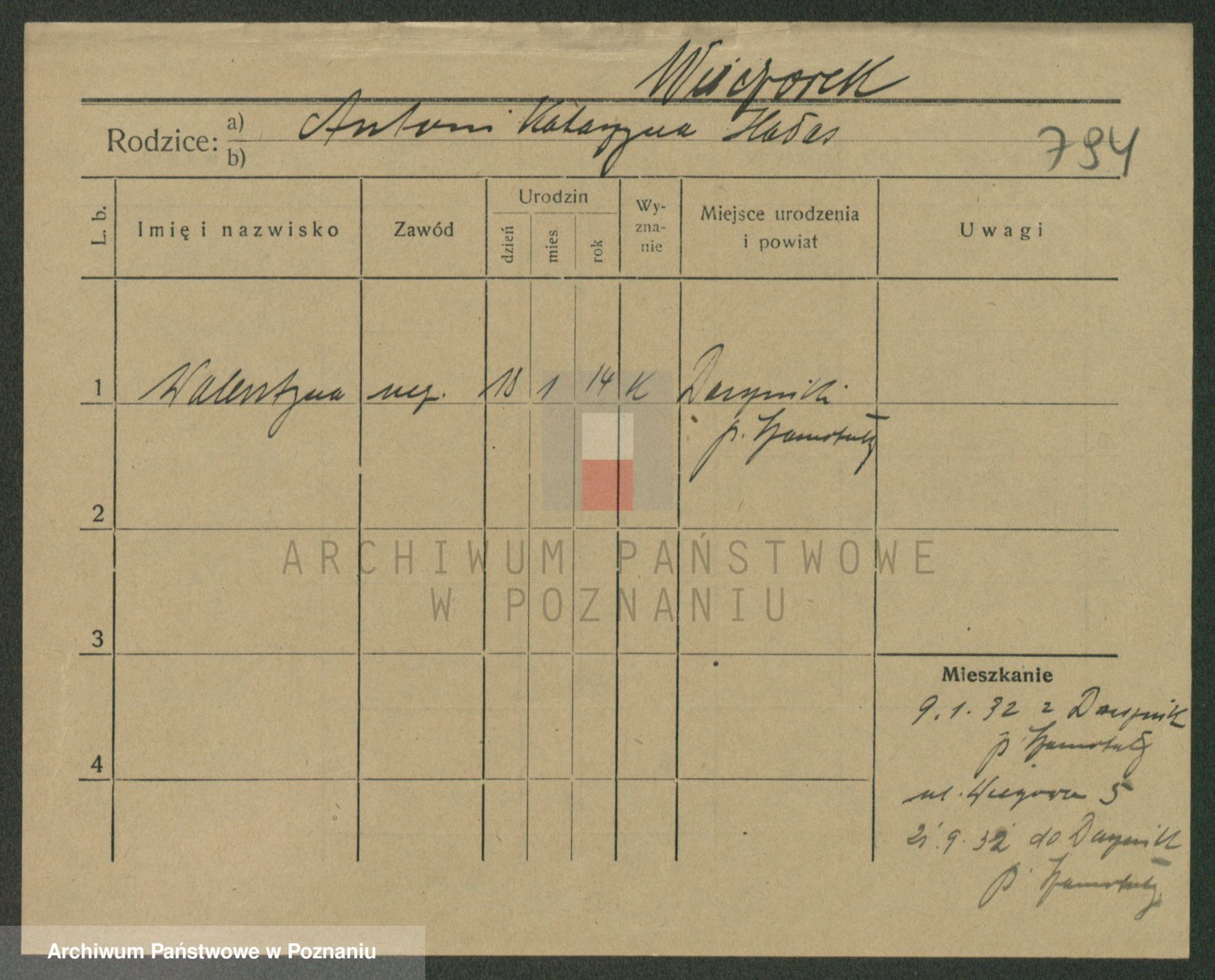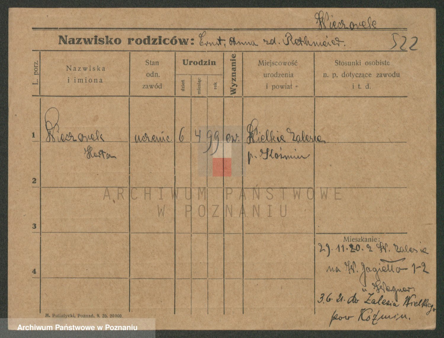 Podgląd karty osobowej dostępny jest po kliknięciu na nazwisko lub ikonkę karty. Można dokonywać powiększenia (ikony na górze) lub przechodzić między kolejnymi skanami (strzałki po bokach).
