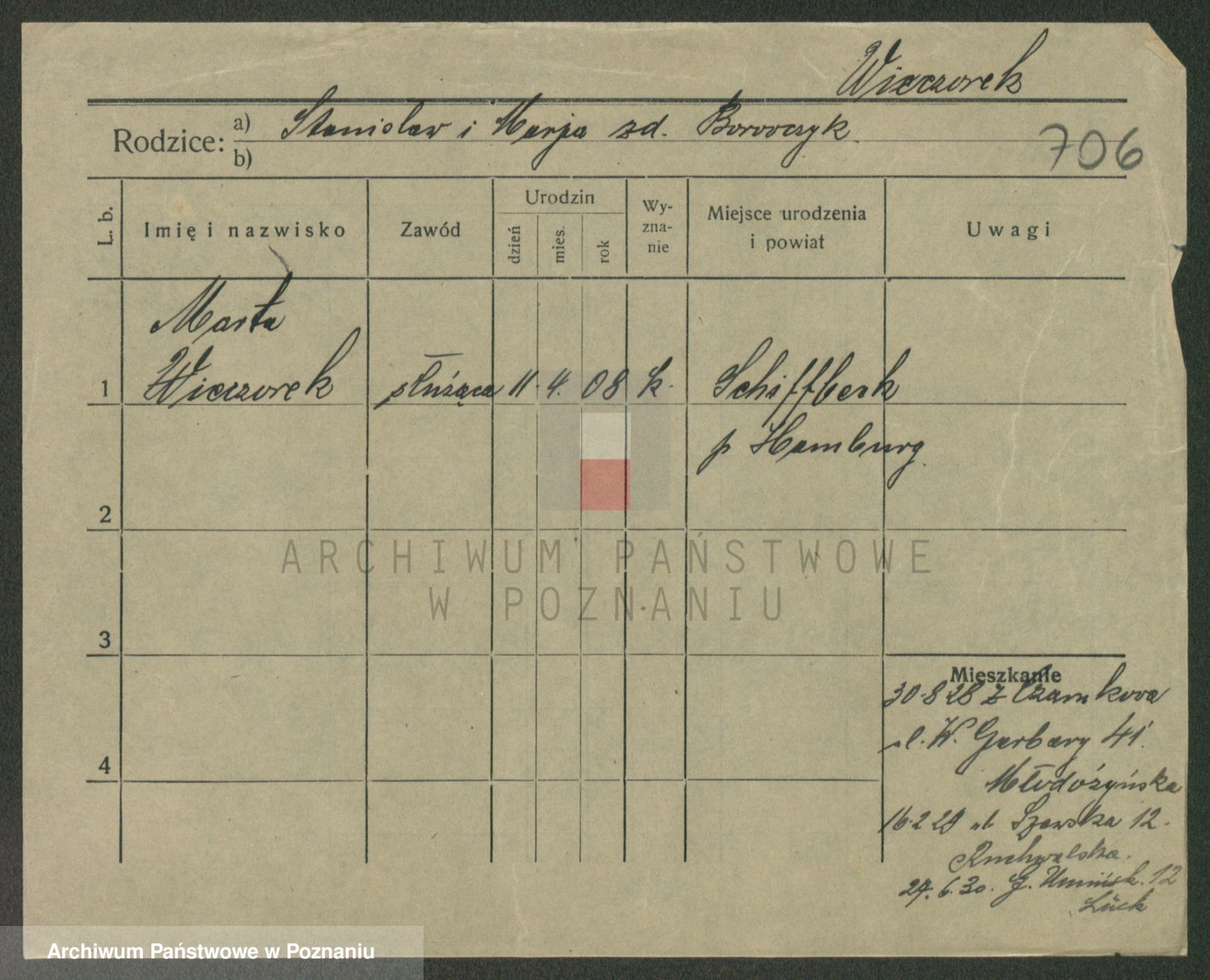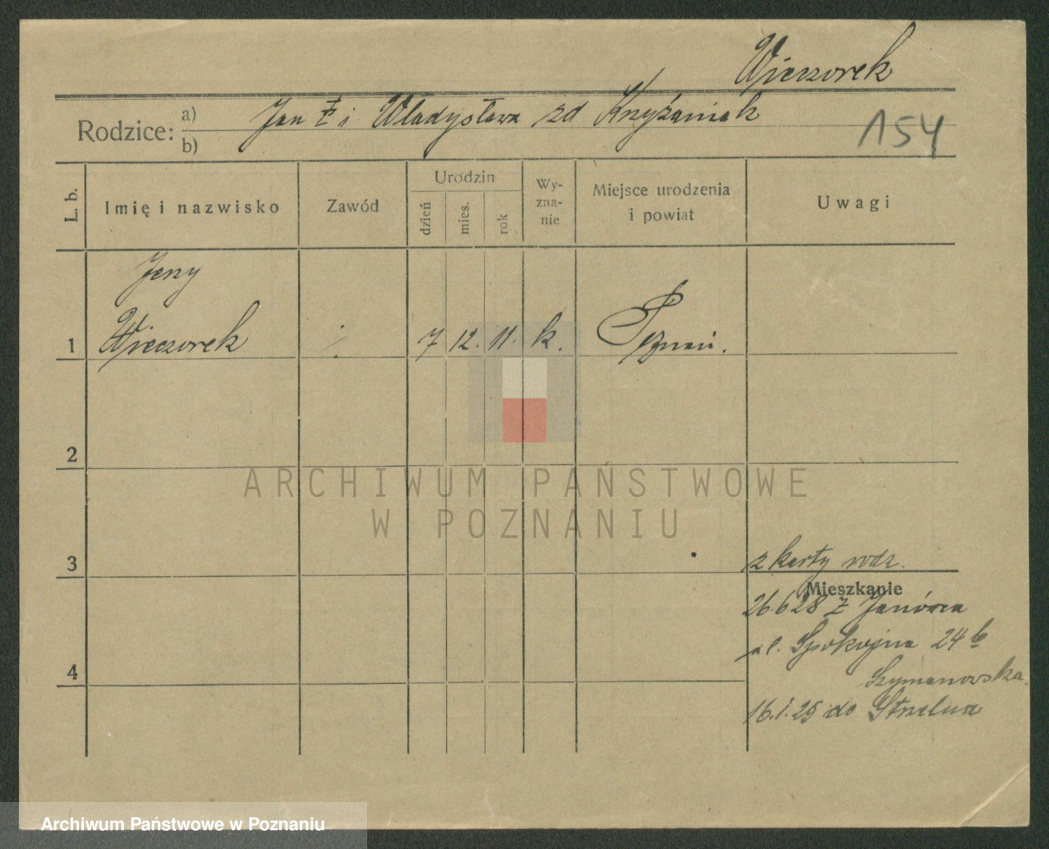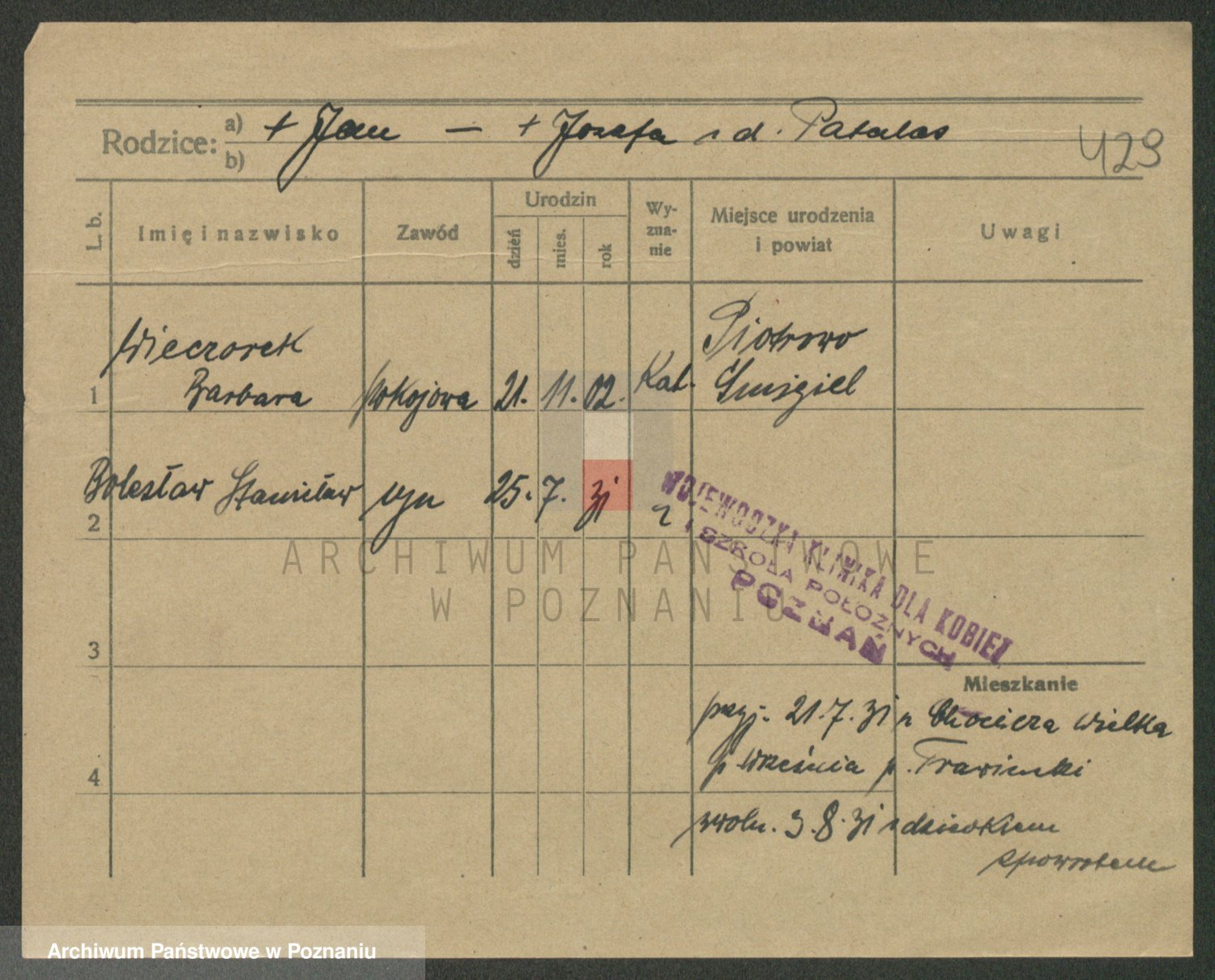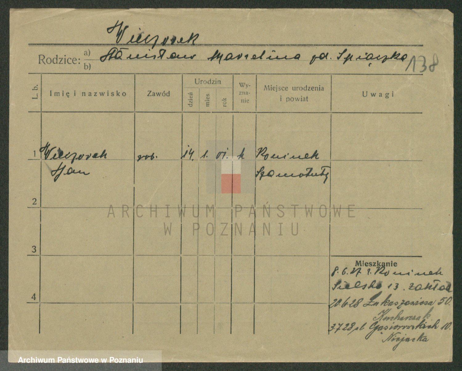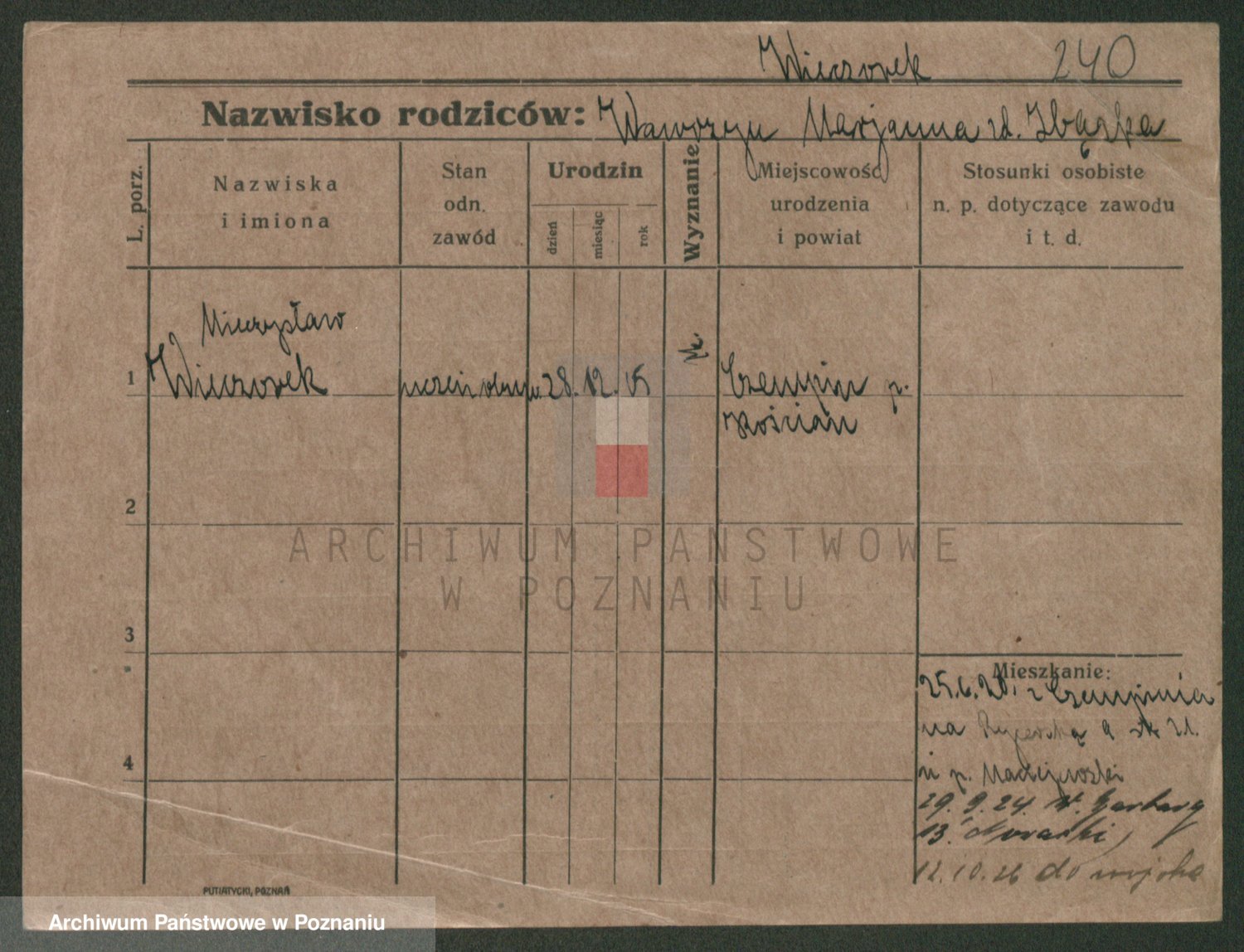 Podgląd karty osobowej dostępny jest po kliknięciu na nazwisko lub ikonkę karty. Można dokonywać powiększenia (ikony na górze) lub przechodzić między kolejnymi skanami (strzałki po bokach).
