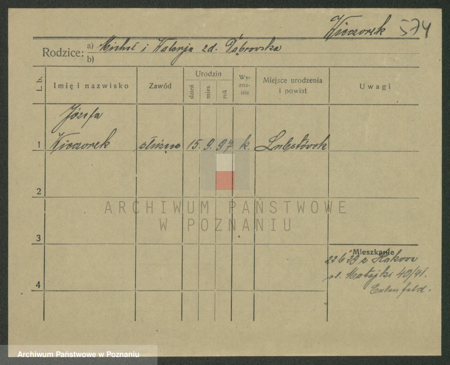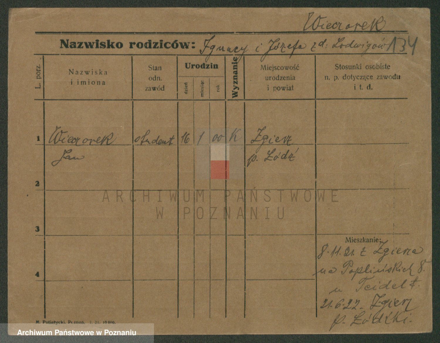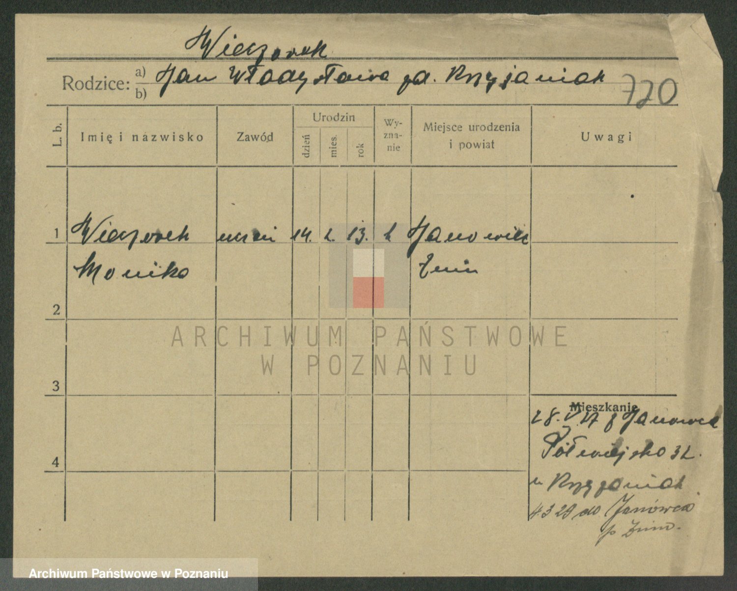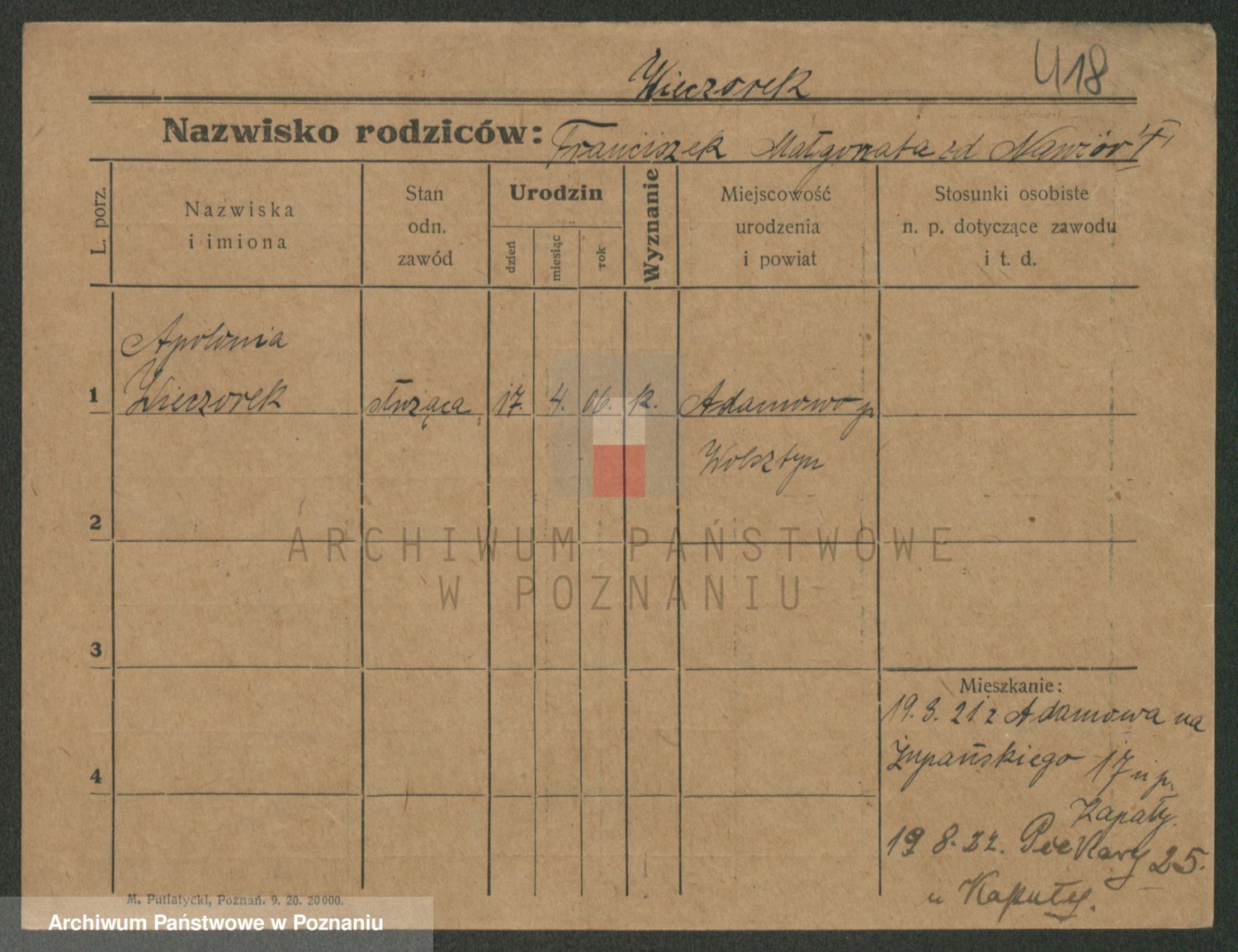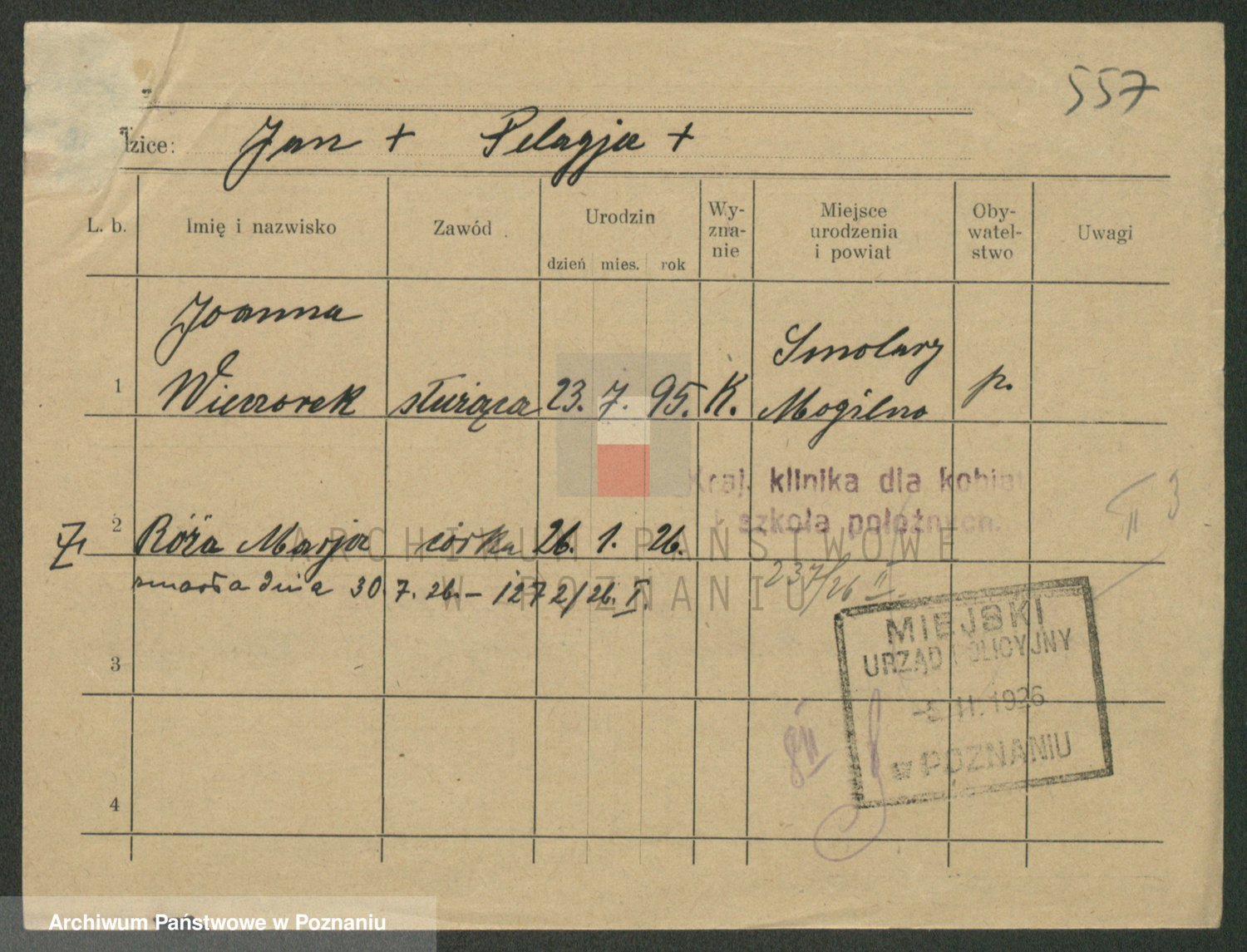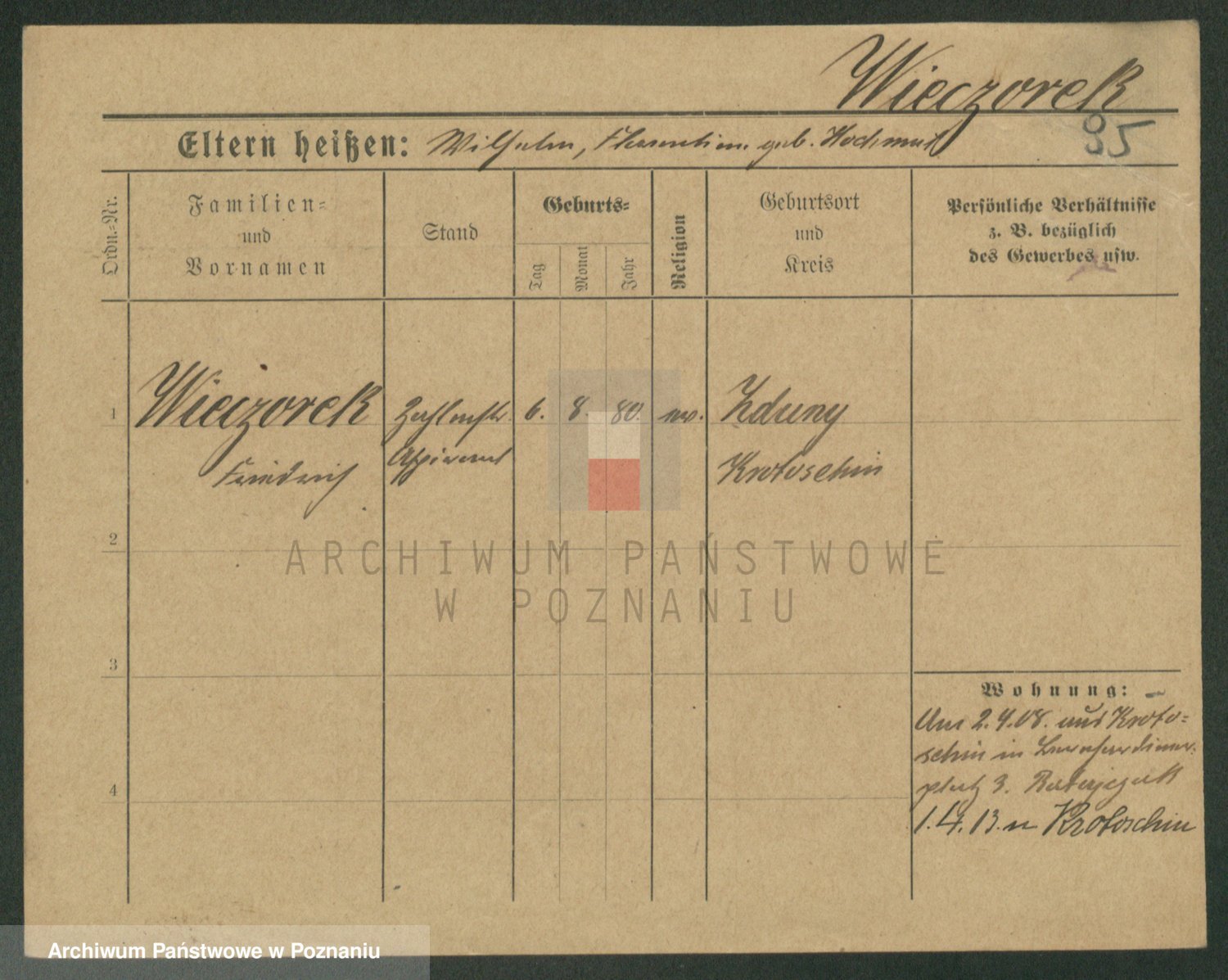 Podgląd karty osobowej dostępny jest po kliknięciu na nazwisko lub ikonkę karty. Można dokonywać powiększenia (ikony na górze) lub przechodzić między kolejnymi skanami (strzałki po bokach).